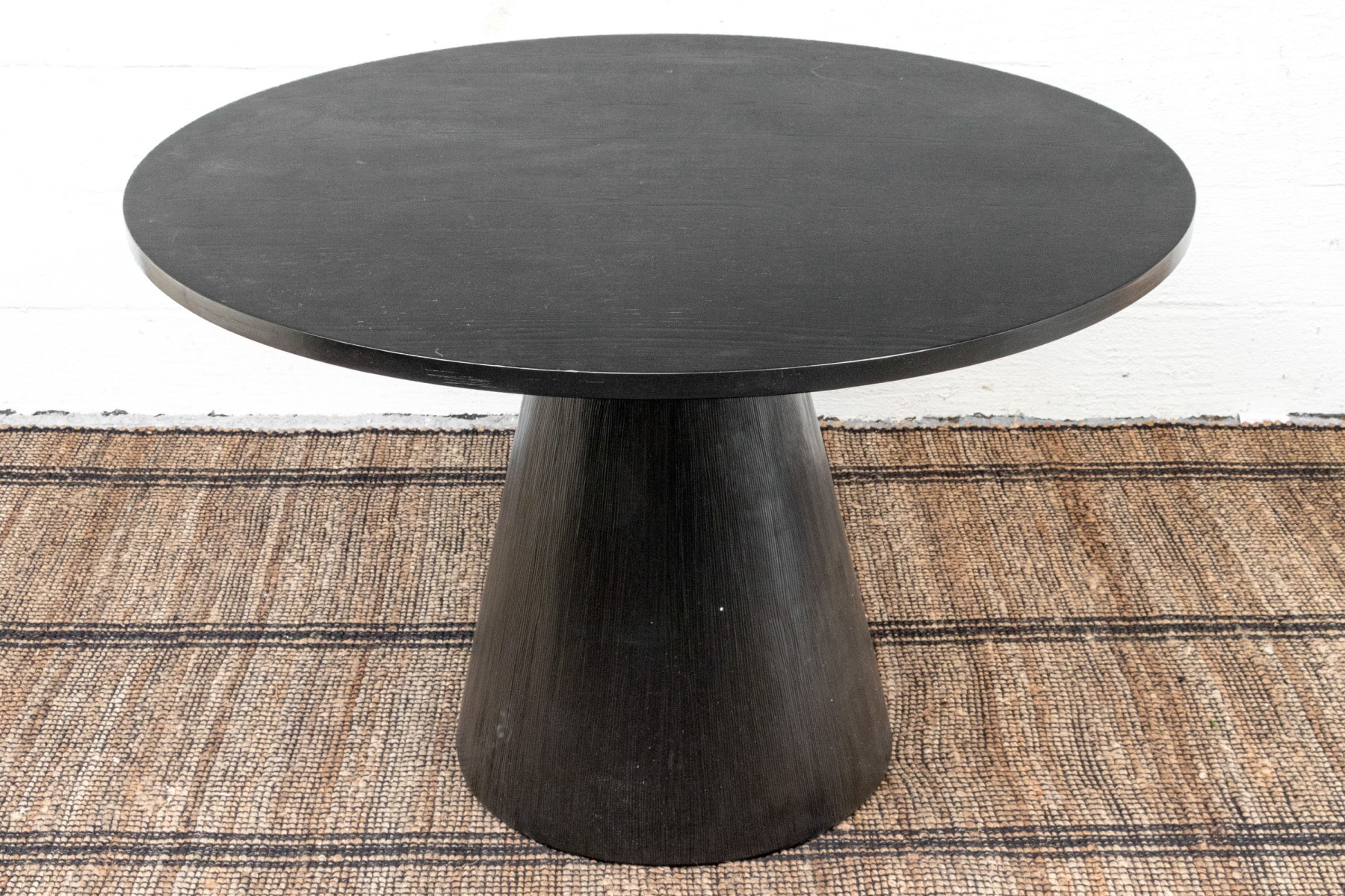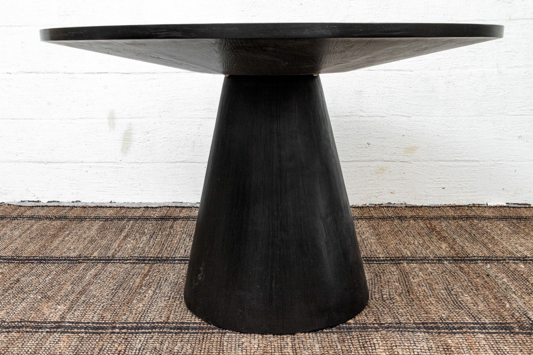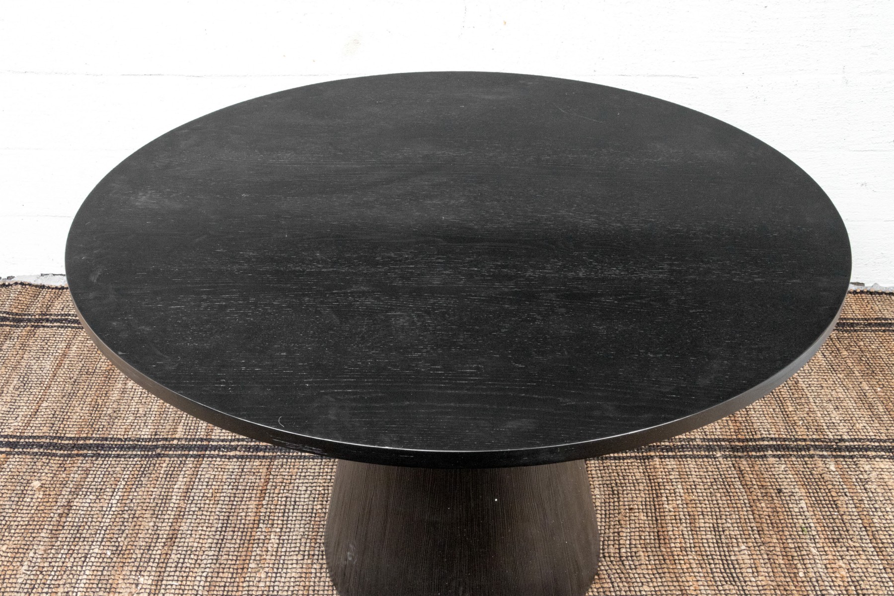A substantial pedestal table constructed of sturdy oak in stylish ebonized finish that elevates the modern flare of the piece. Features a circular top over a conical base.