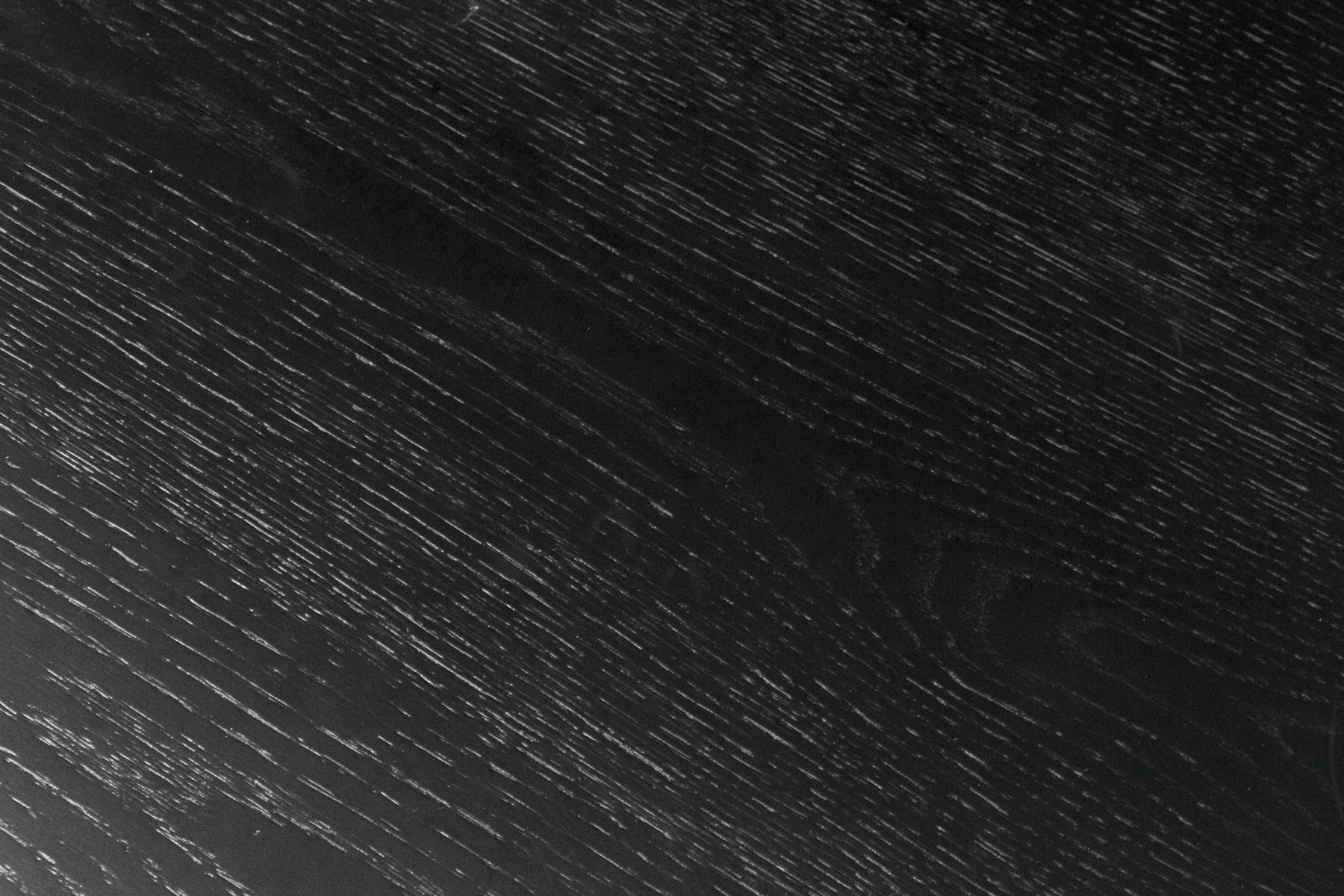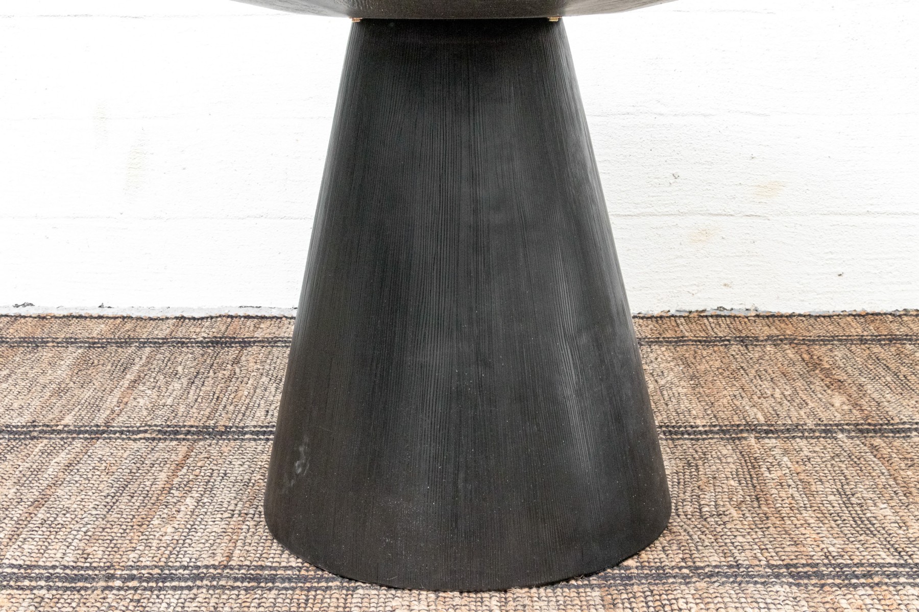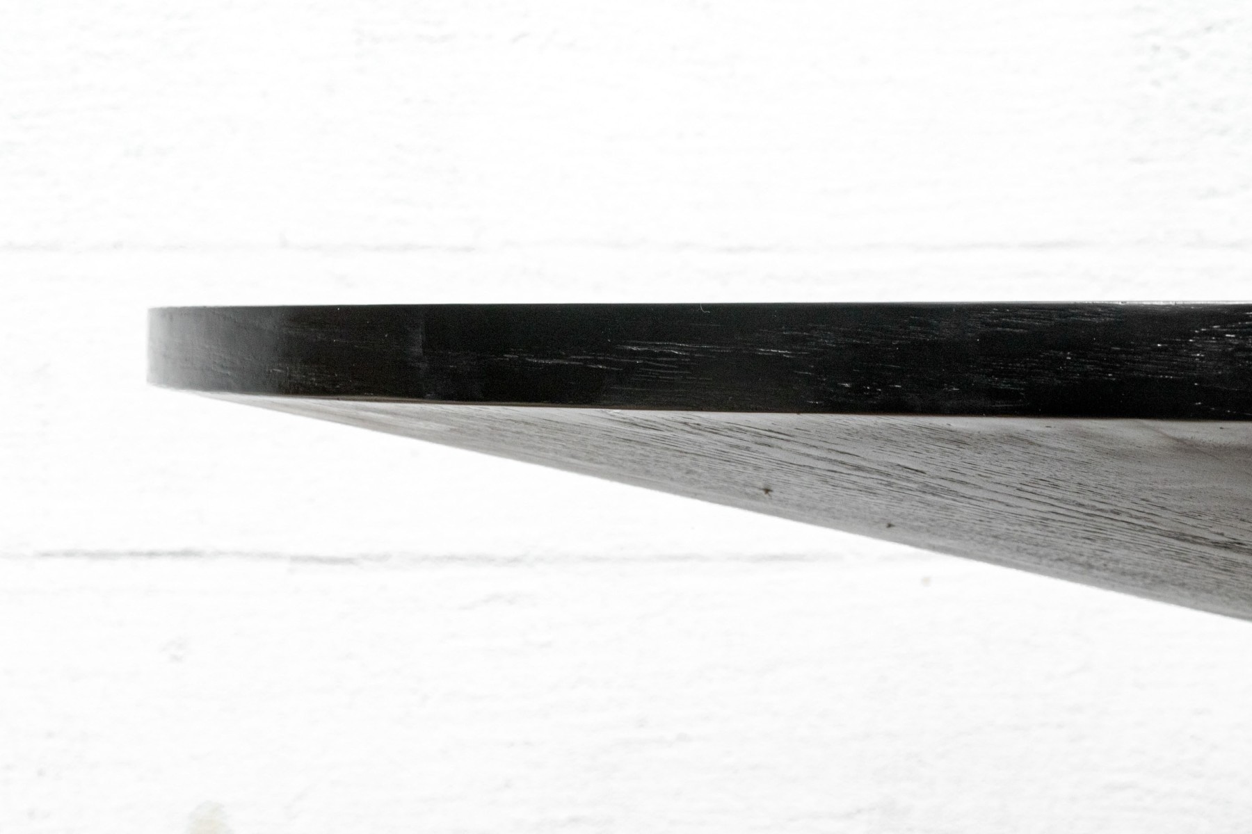 A substantial pedestal table constructed of sturdy oak in stylish ebonized finish that elevates the modern flare of the piece. Features a circular top over a conical base.