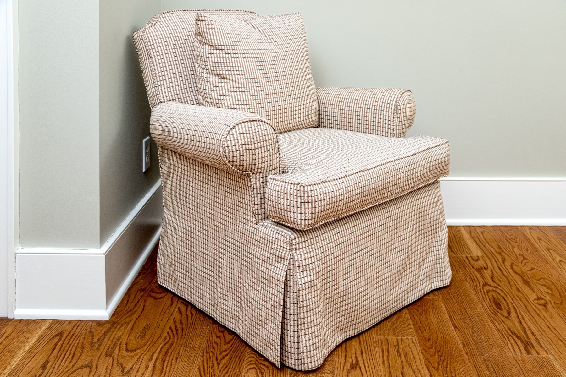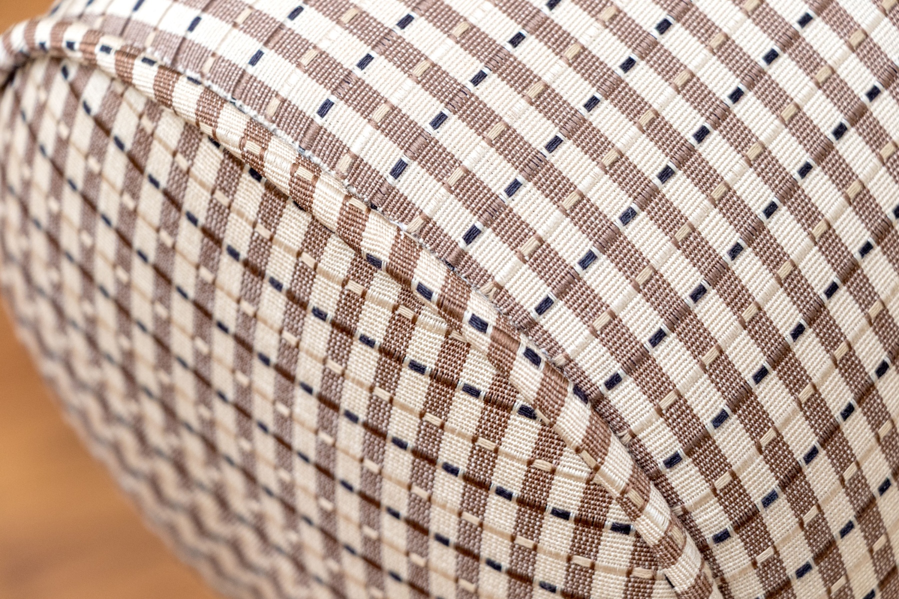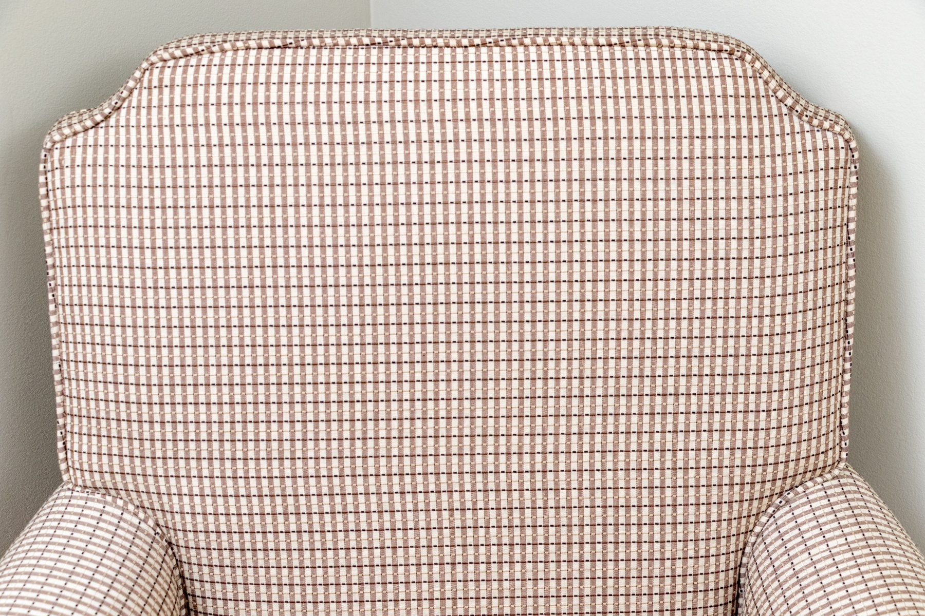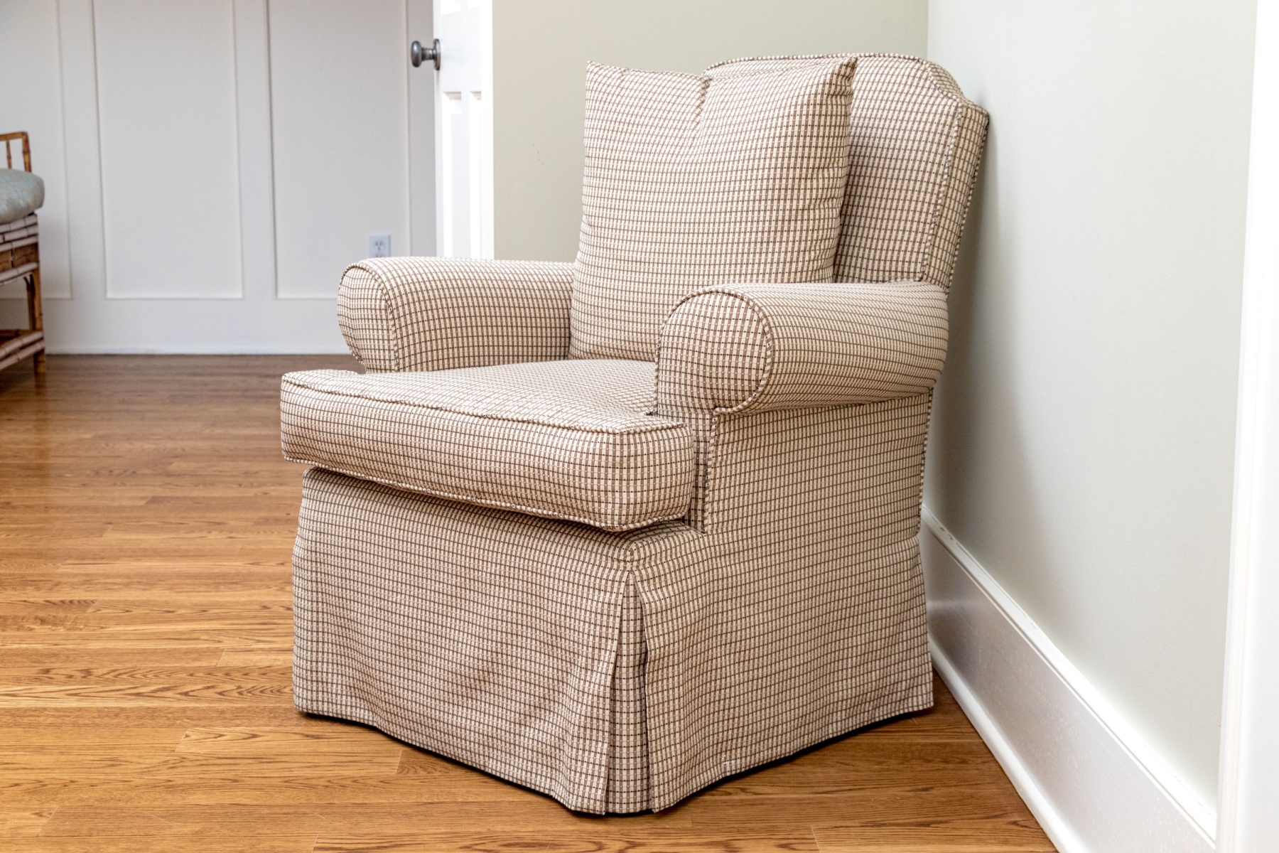 A stylish accent armchair upholstered in handsome brown and cream gridded upholstery with great decorative flair. The chair features curved ears along the back, rolled arms, and a loose seat cushion with a matching accent pillow. Finished with a skirted apron concealing the legs beneath.