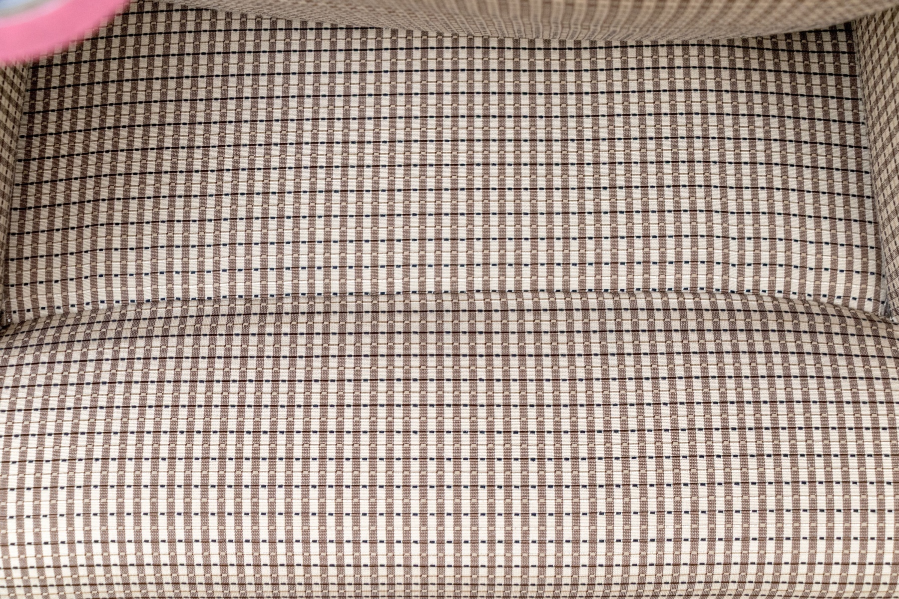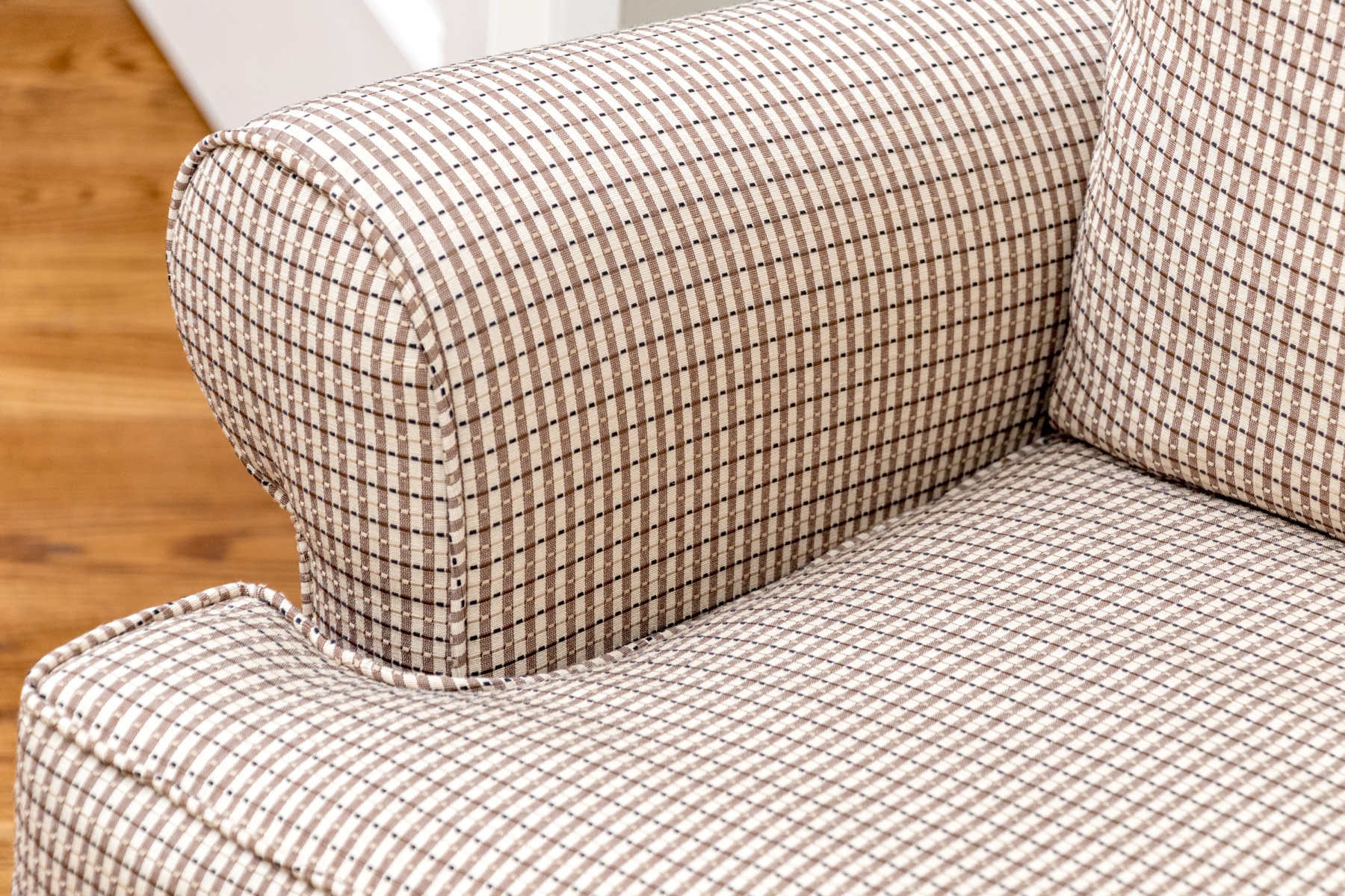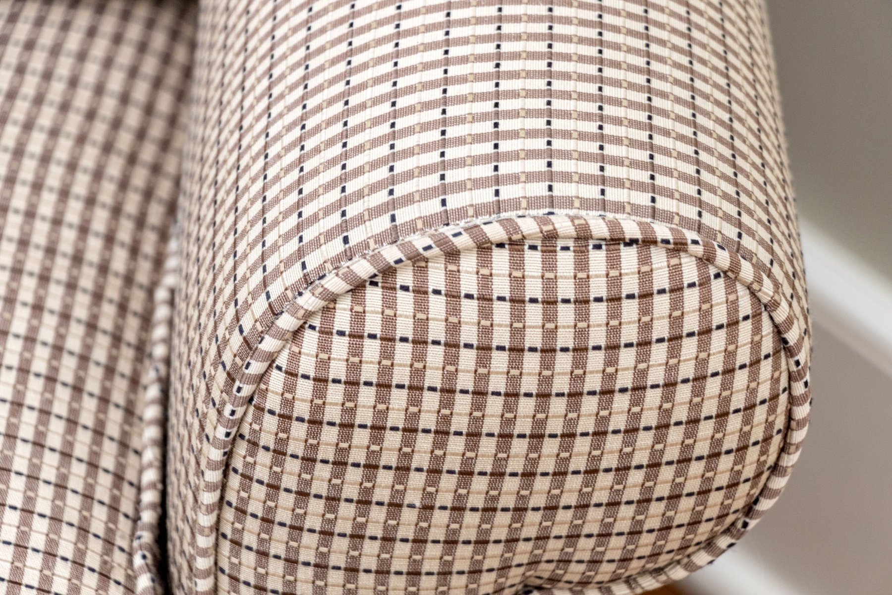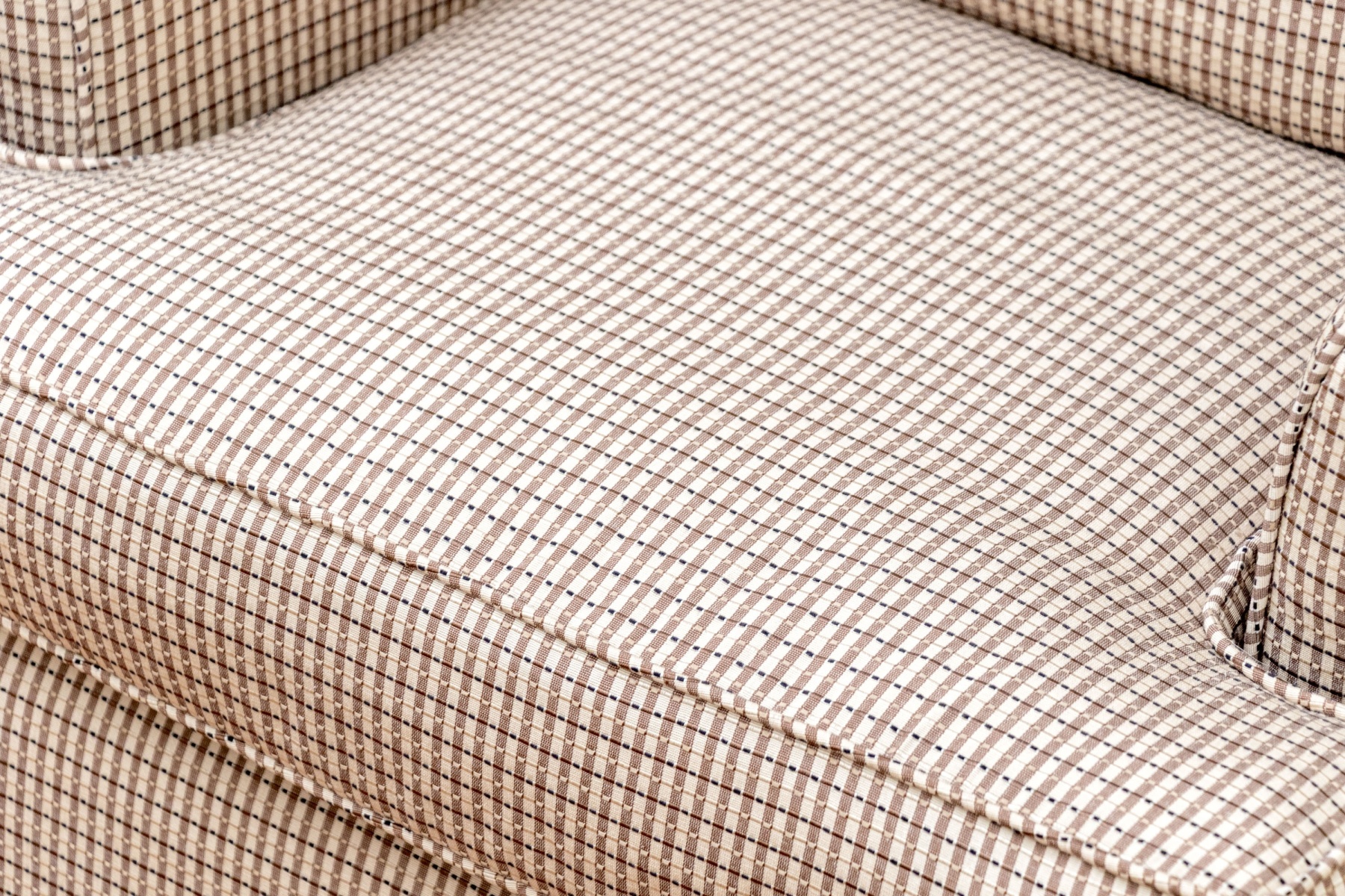 A stylish accent armchair upholstered in handsome brown and cream gridded upholstery with great decorative flair. The chair features curved ears along the back, rolled arms, and a loose seat cushion with a matching accent pillow. Finished with a skirted apron concealing the legs beneath.