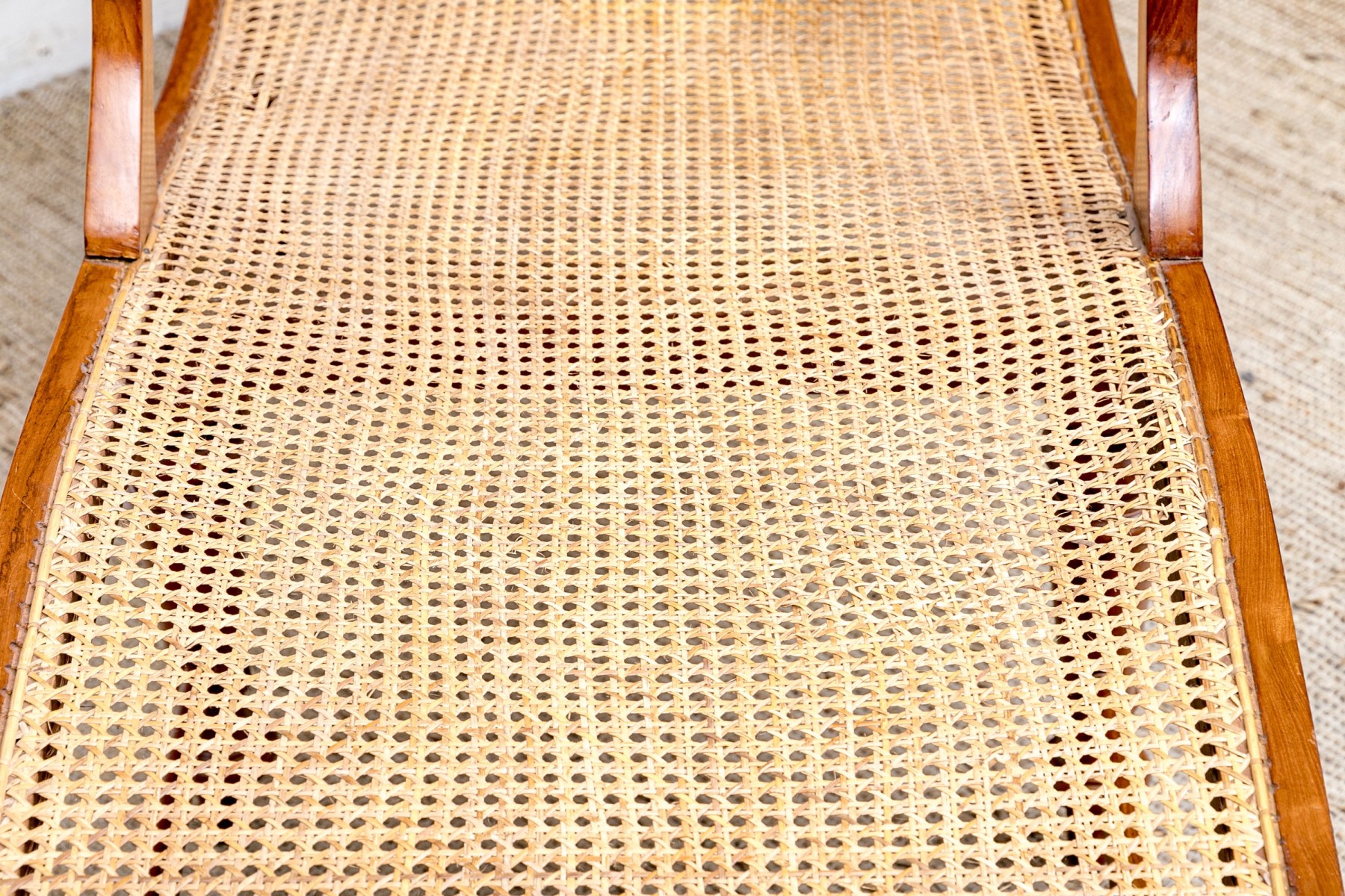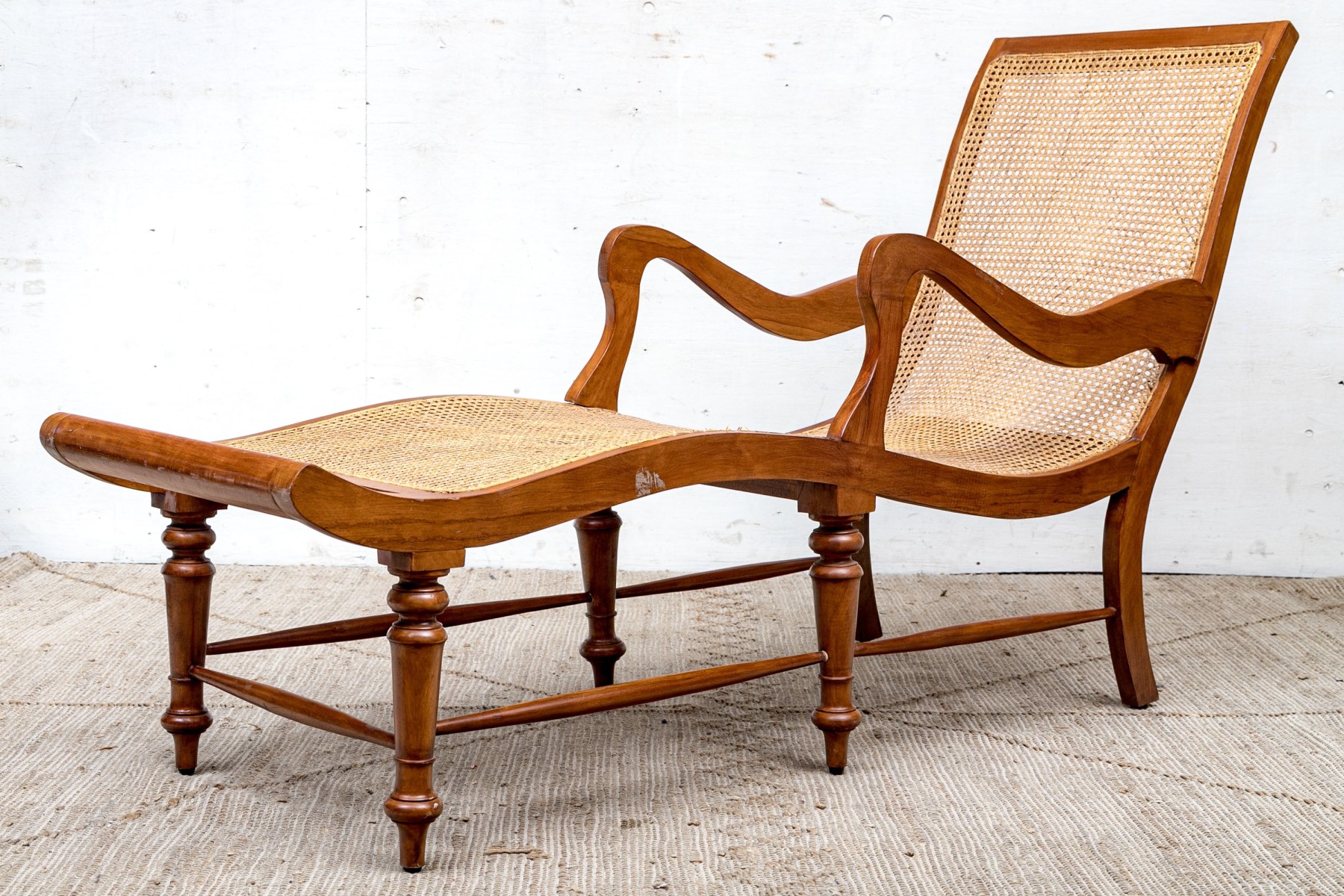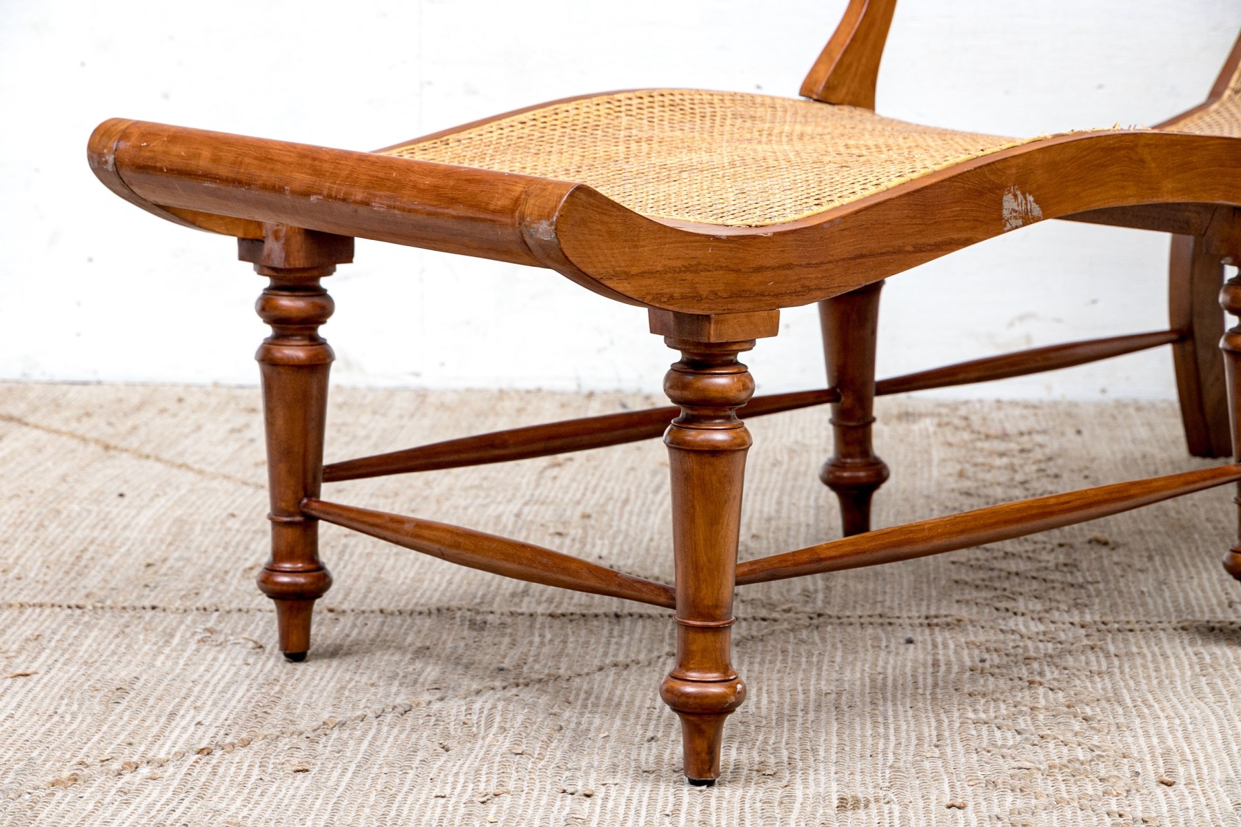 Highly chic and stylish, the wood framed chaise lounge has cane back and serpentine formed seat on its serpentine form frame. The chaise is supported on six turned legs with stretcher supports. The chaise has a foot rest rail at the end and presents fantastically overall.