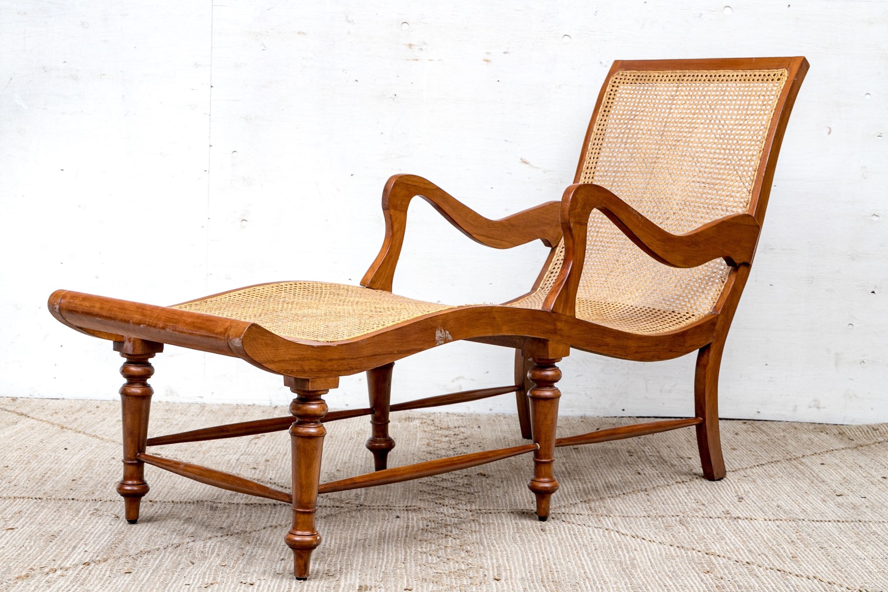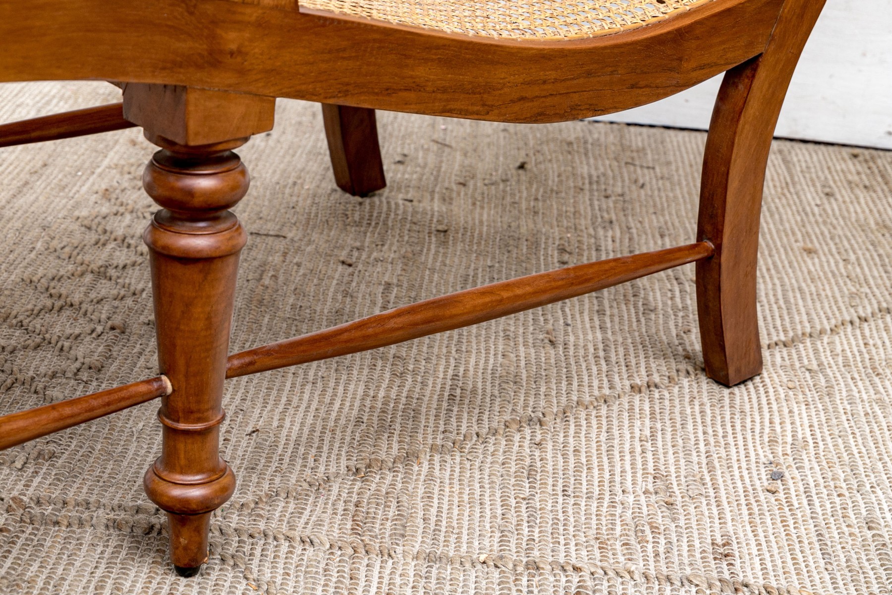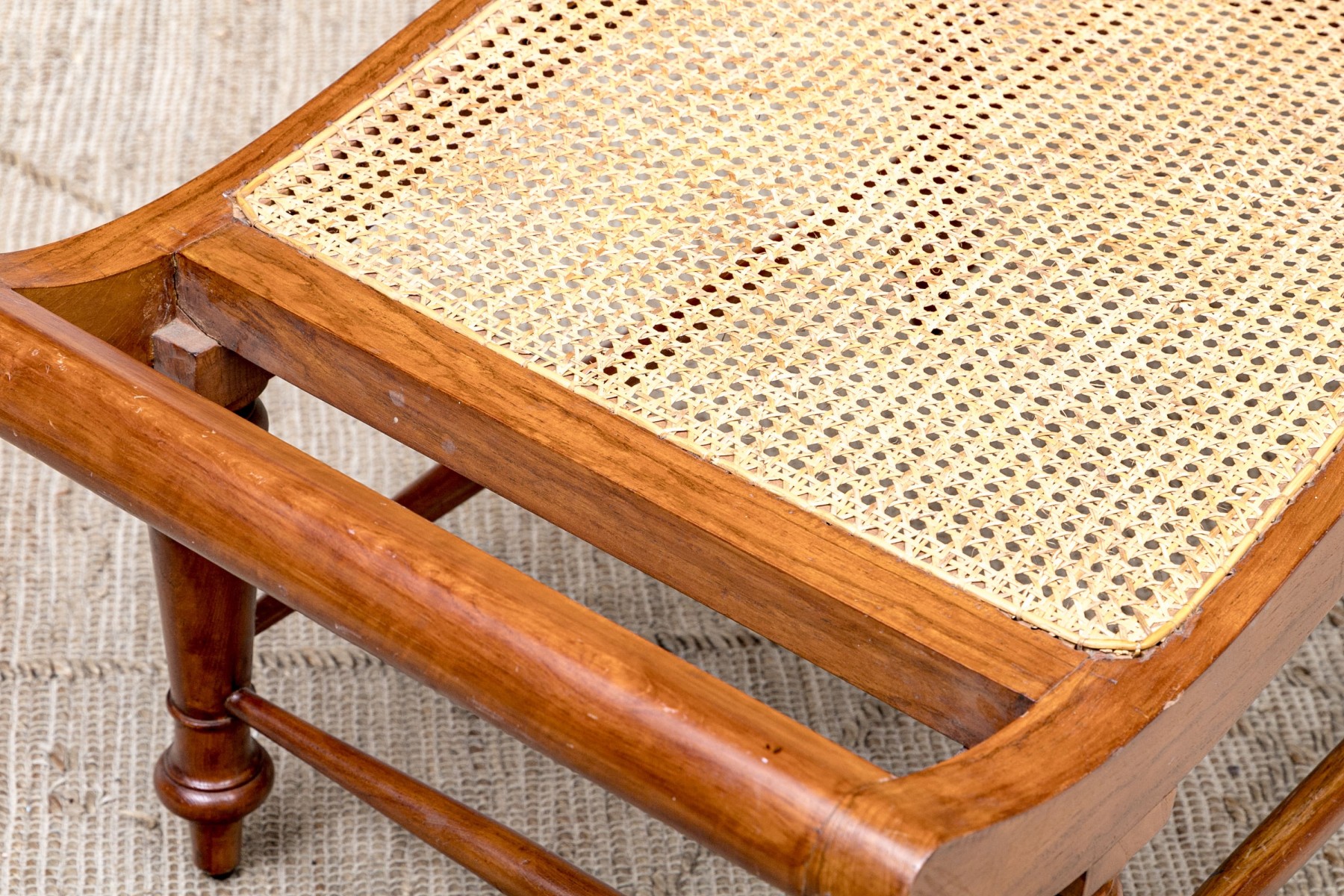Highly chic and stylish, the wood framed chaise lounge has cane back and serpentine formed seat on its serpentine form frame. The chaise is supported on six turned legs with stretcher supports. The chaise has a foot rest rail at the end and presents fantastically overall.