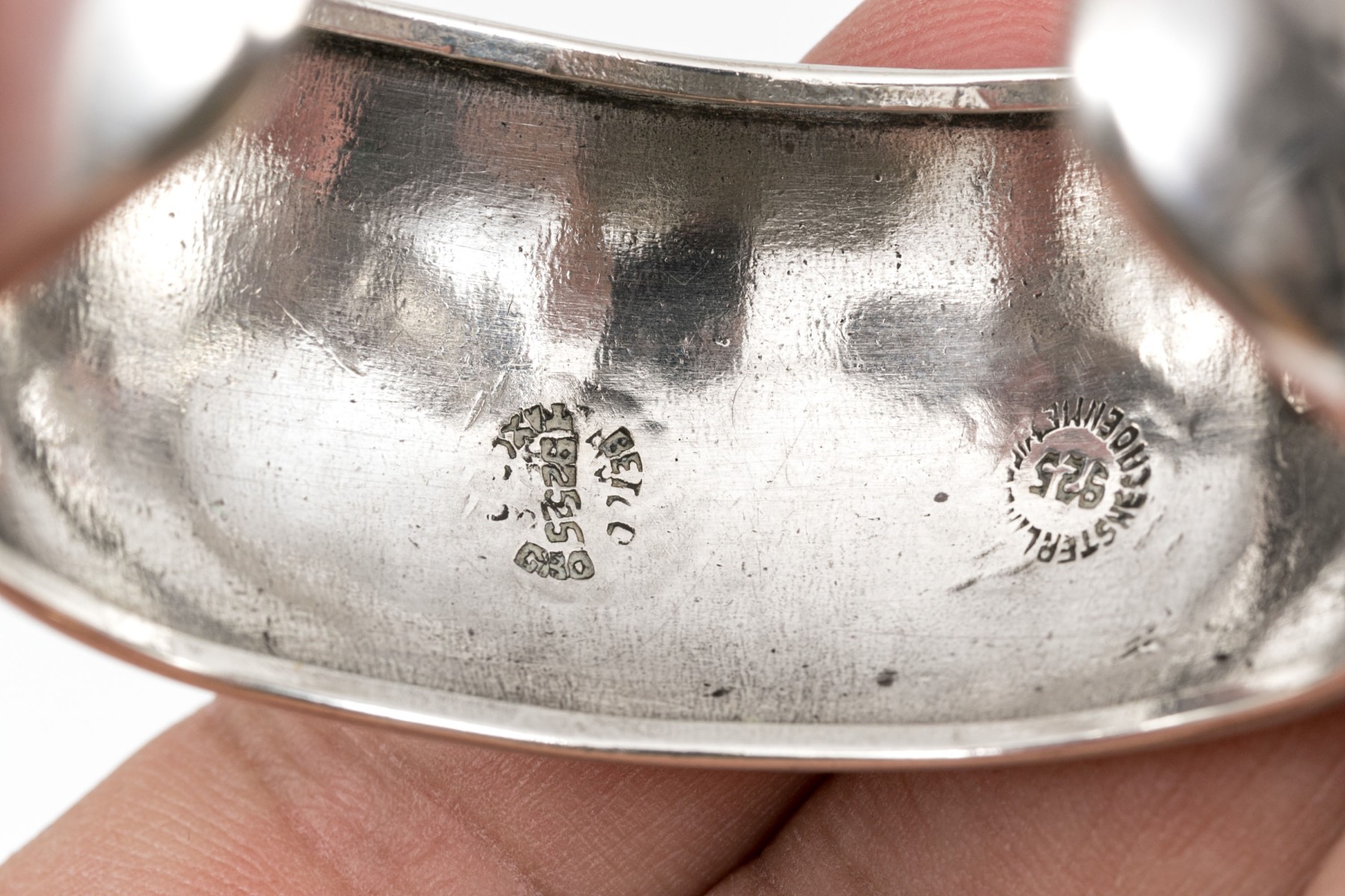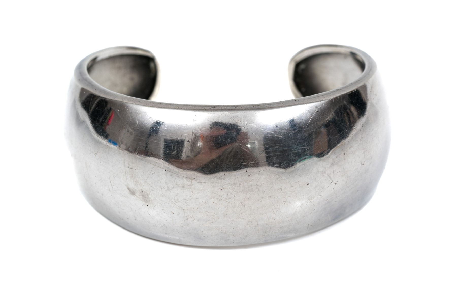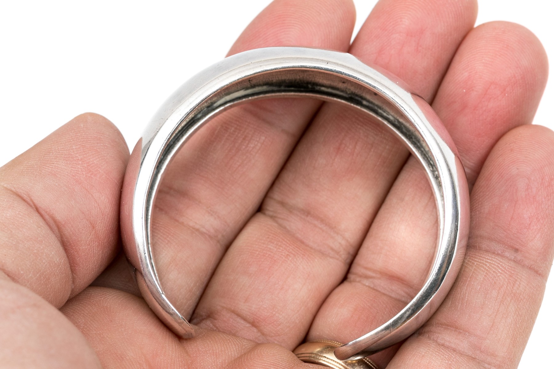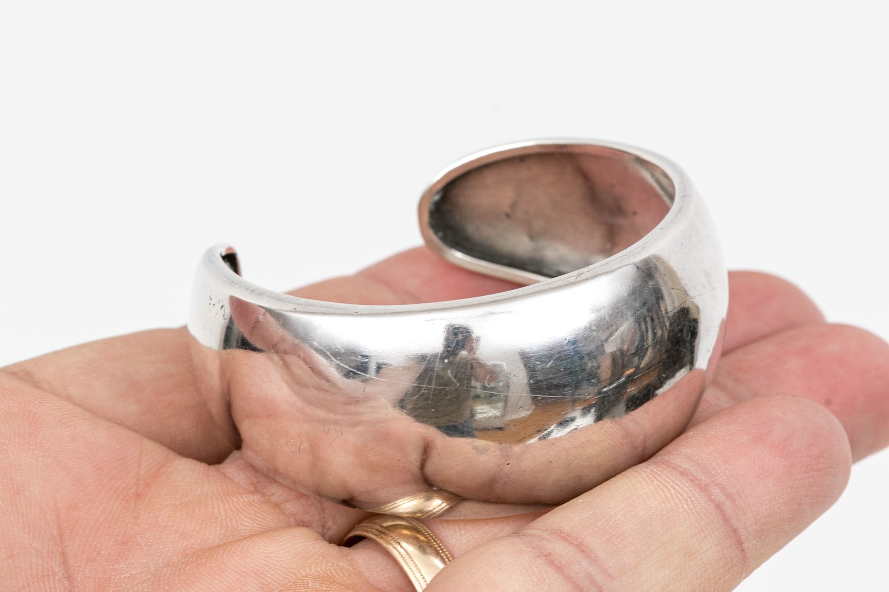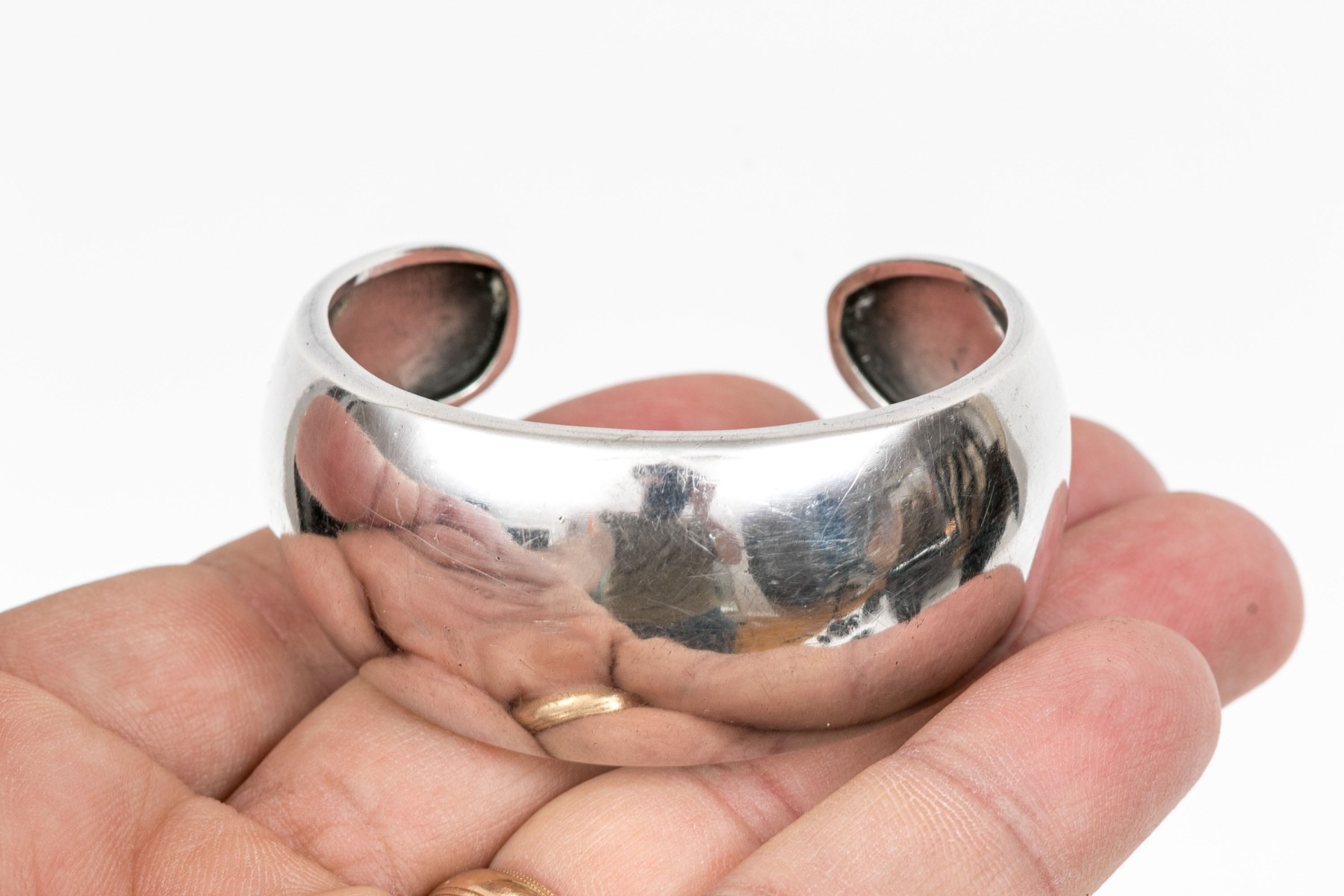 Wide sterling silver cuff bracelet with a domed design and a bright polished finish.
