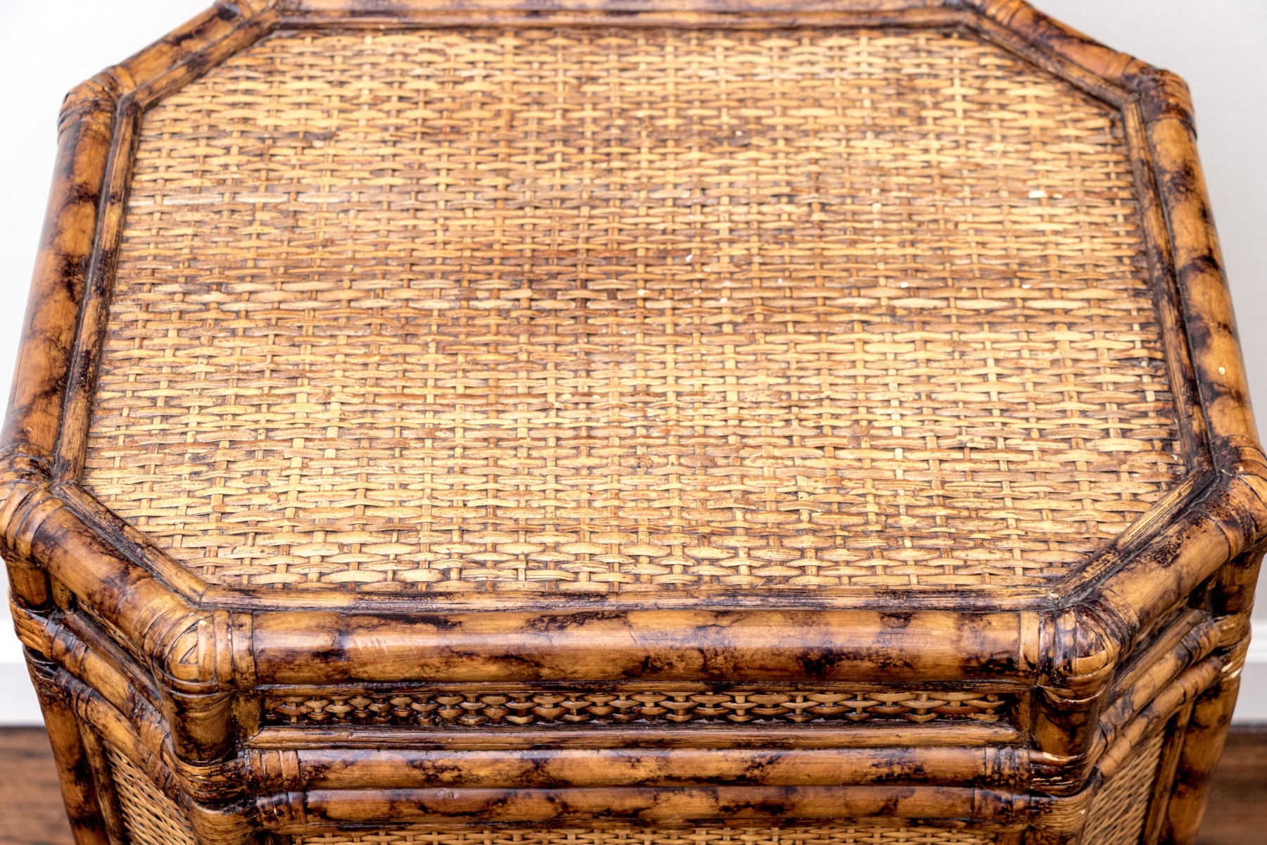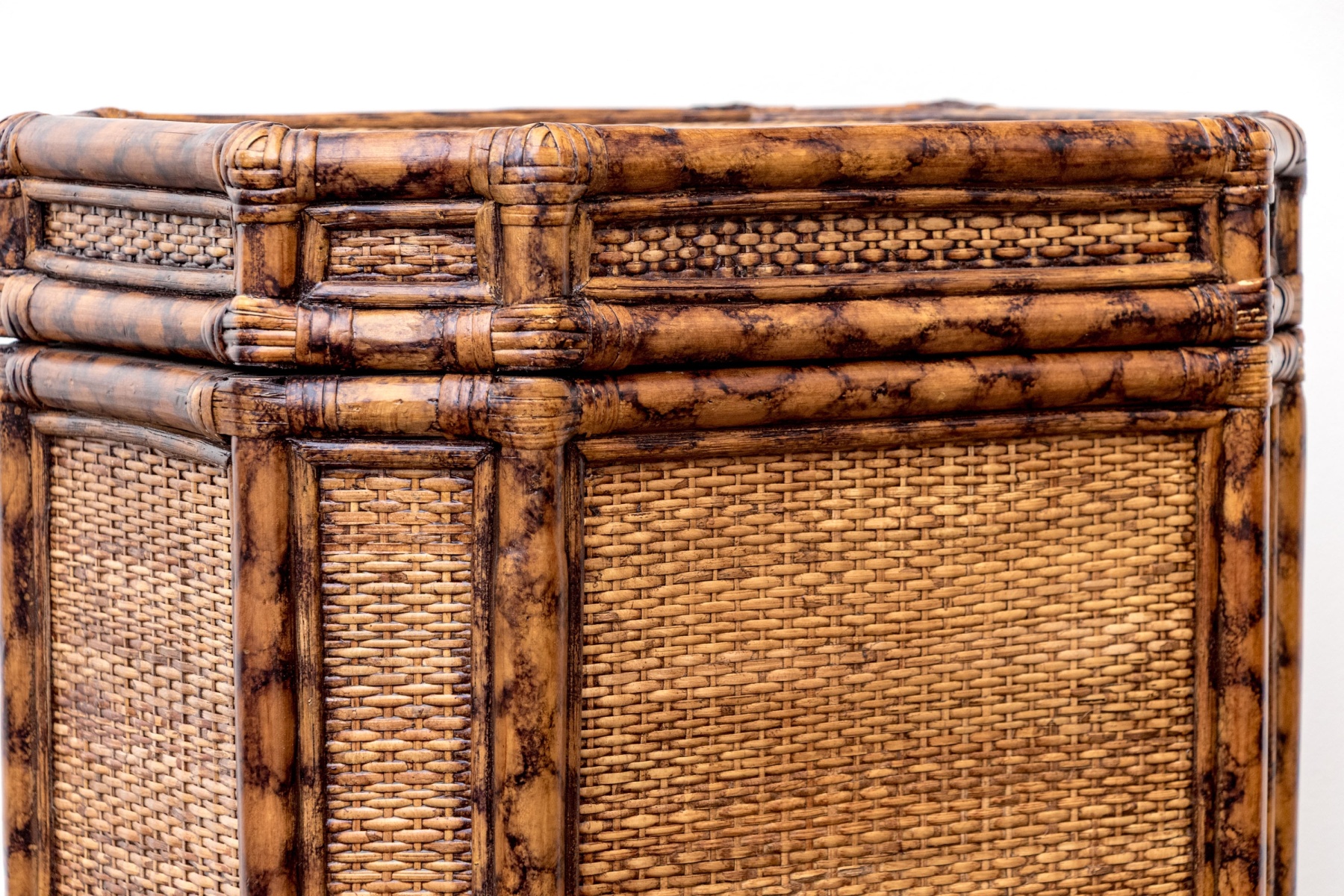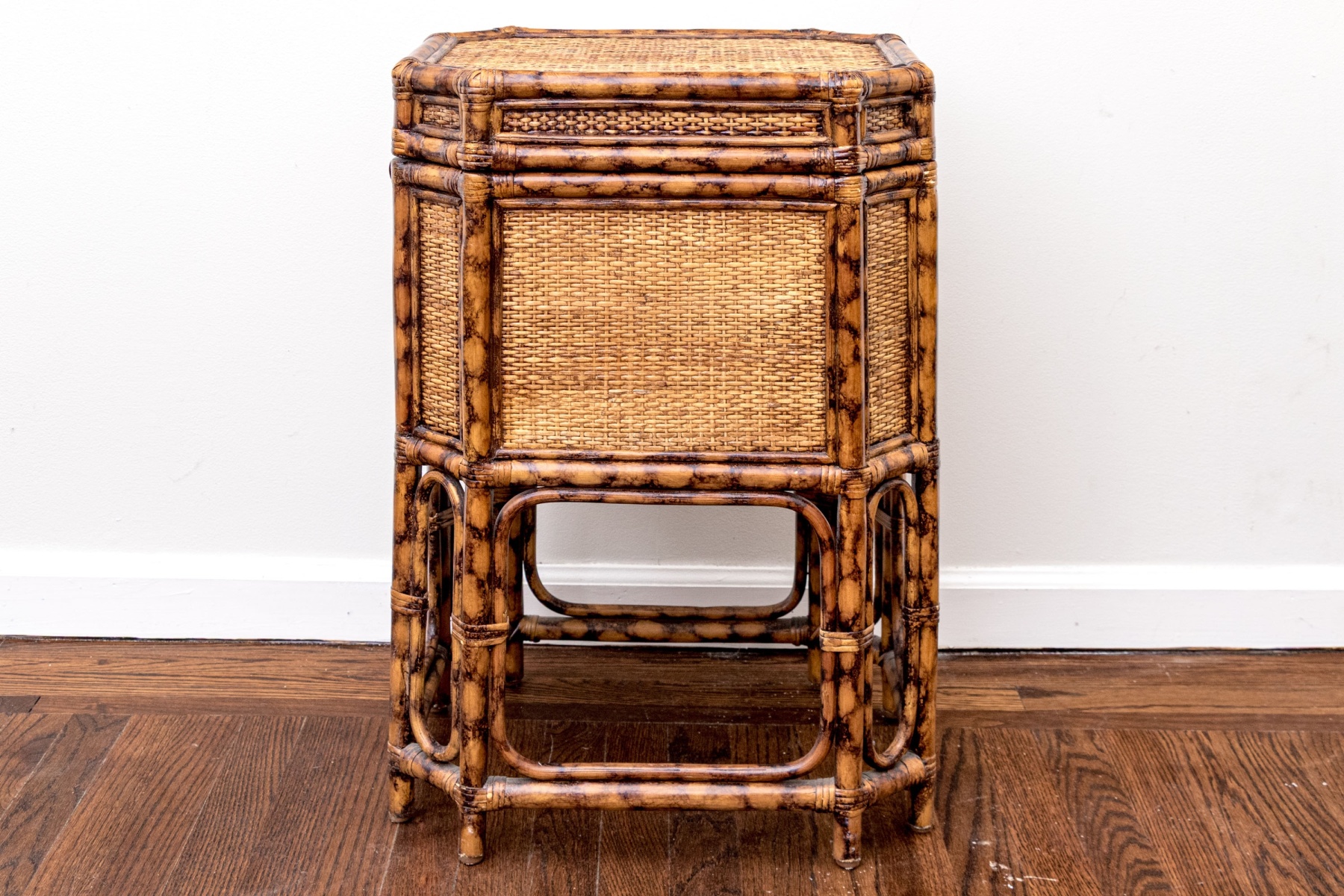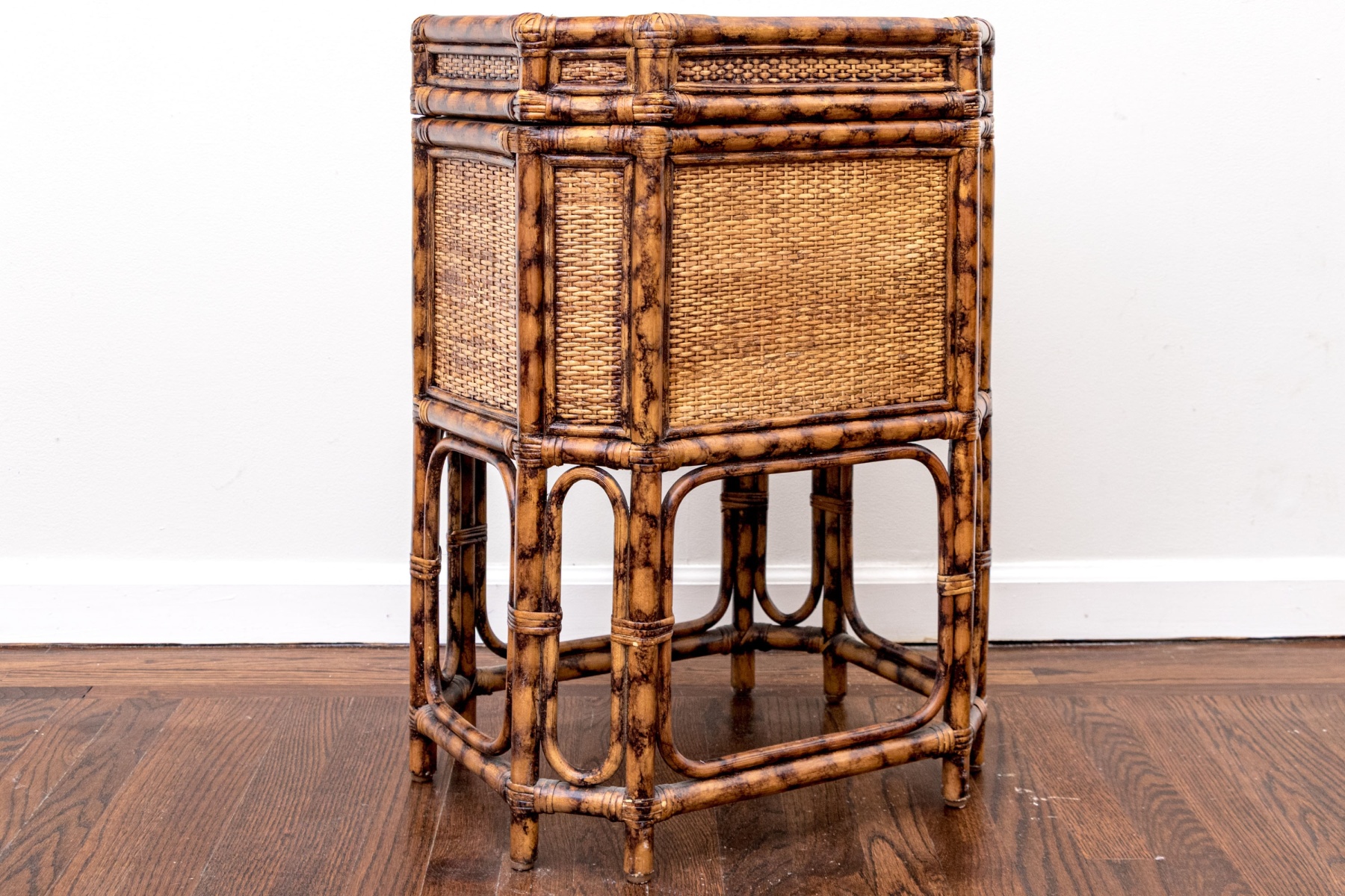 A stylish end table or accent storage chest with great natural appeal, showcasing a bamboo style frame with rattan wicker panels around a cut-corner rectangular profile. The hinged lid opens to a black finished interior with spacious storage, raised on six legs with bentwood supports and a box stretcher.