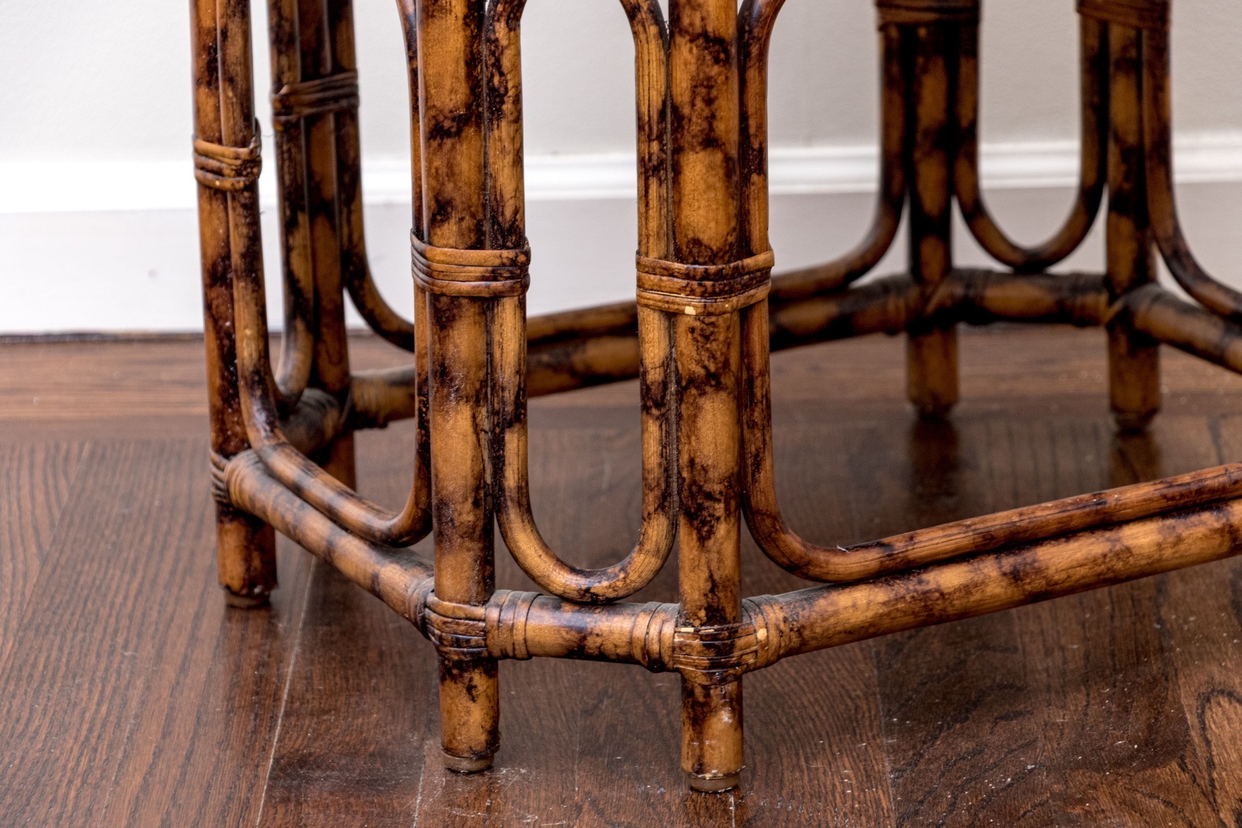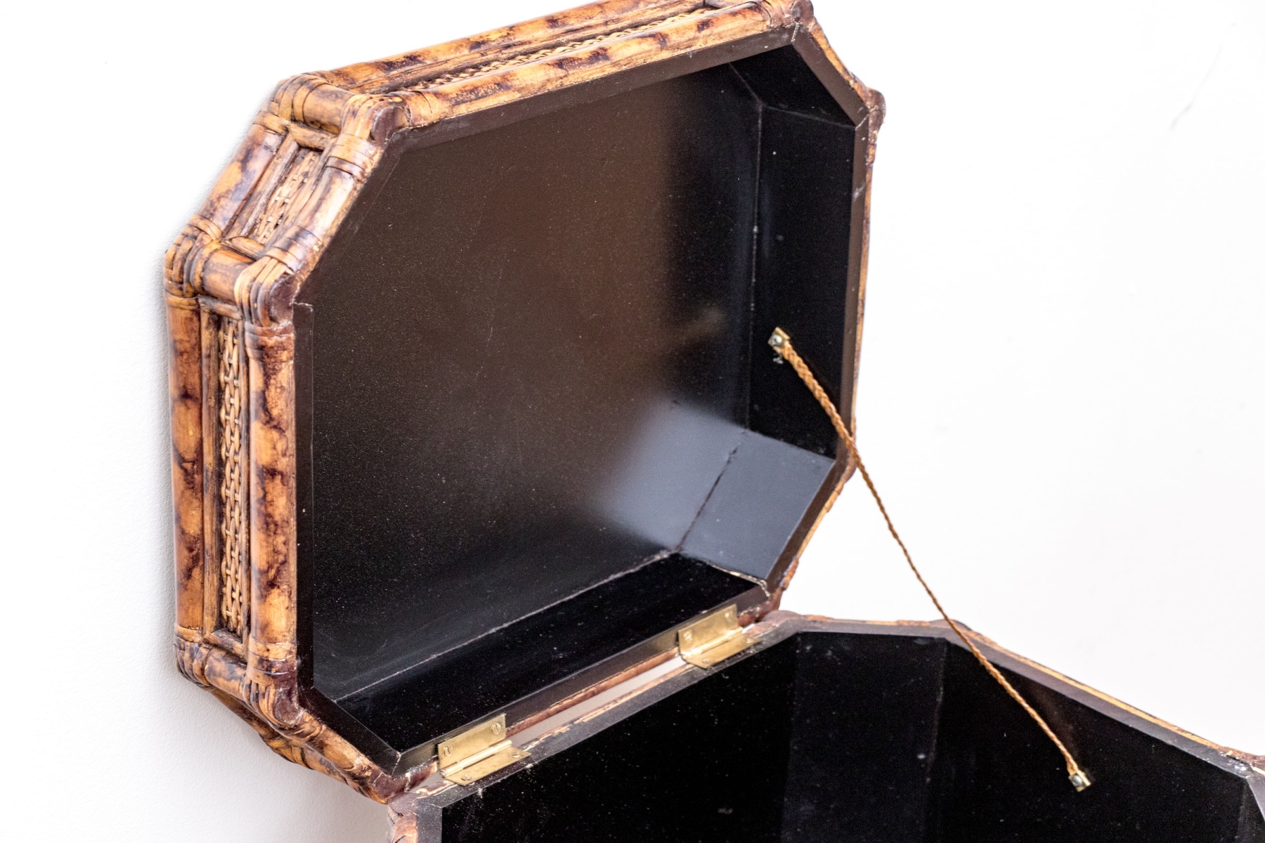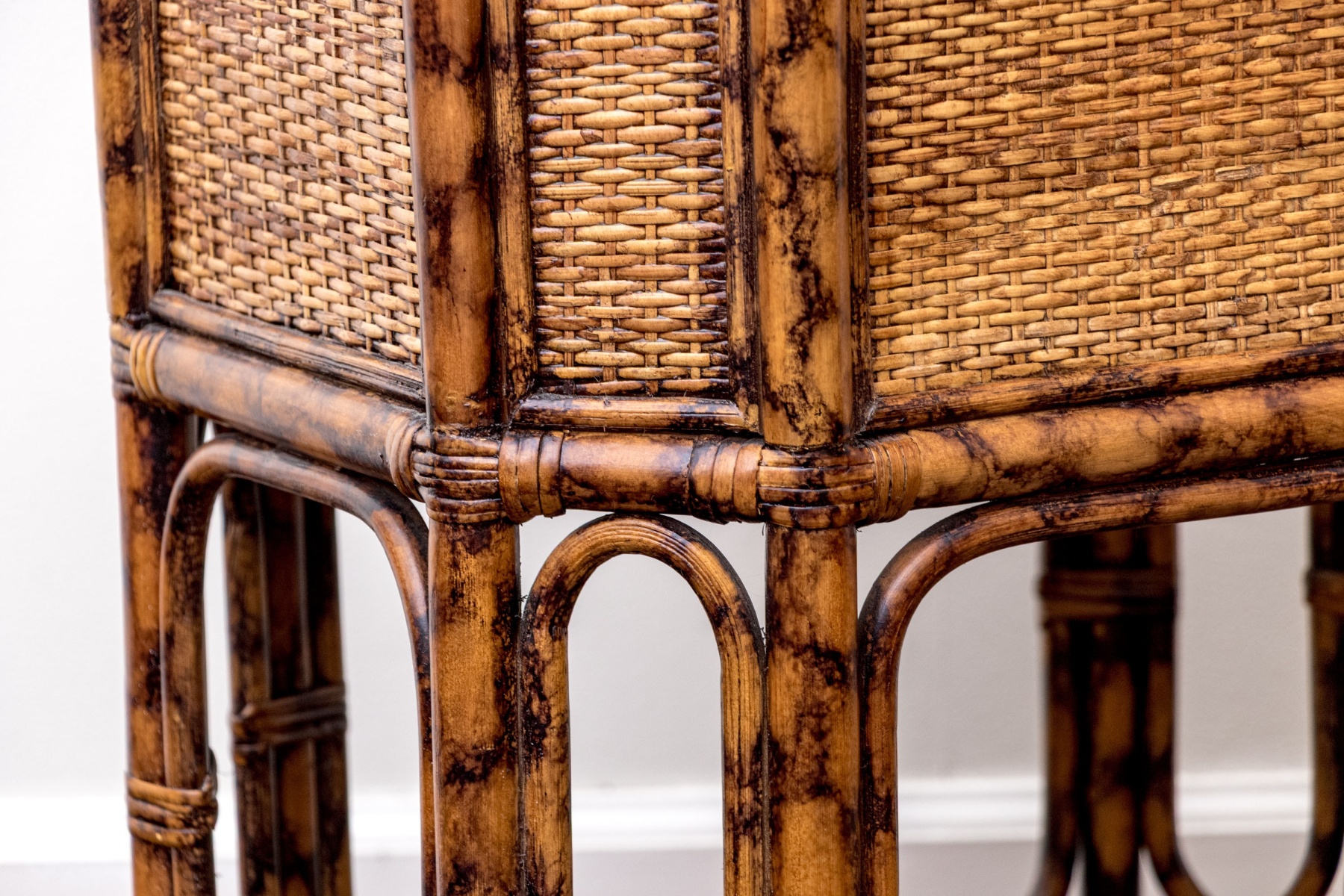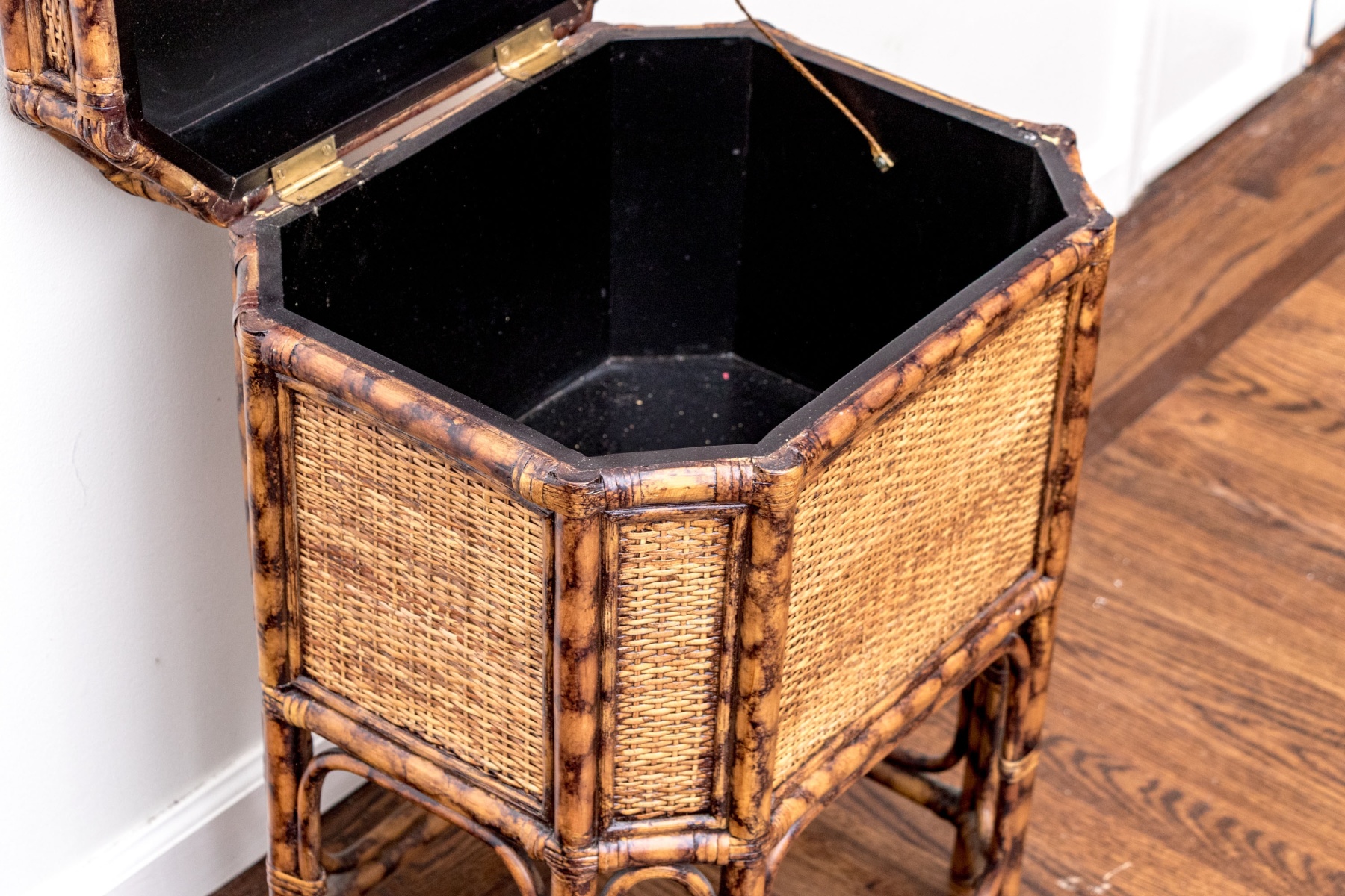 A stylish end table or accent storage chest with great natural appeal, showcasing a bamboo style frame with rattan wicker panels around a cut-corner rectangular profile. The hinged lid opens to a black finished interior with spacious storage, raised on six legs with bentwood supports and a box stretcher.