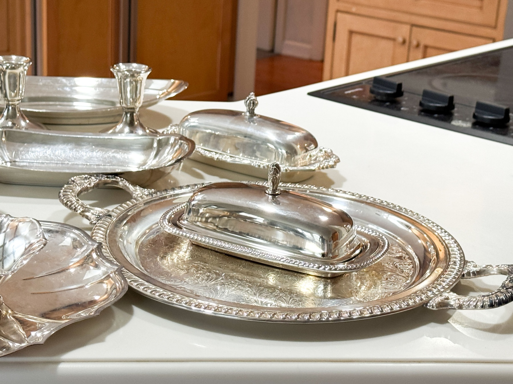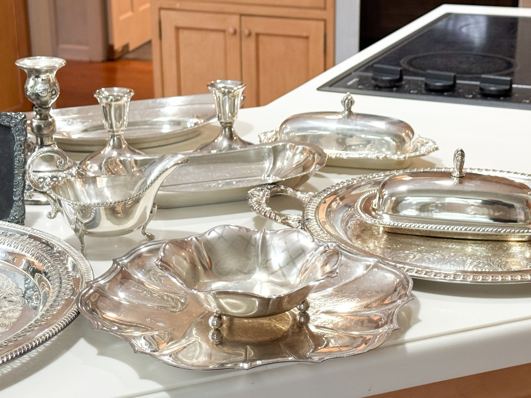 A substantial collection of quality silver plate including salver trays, pitchers, a tea set including a teapot and lidded sugar, candlesticks, sauce boats, flatware, picture frames, serving pieces, and more.