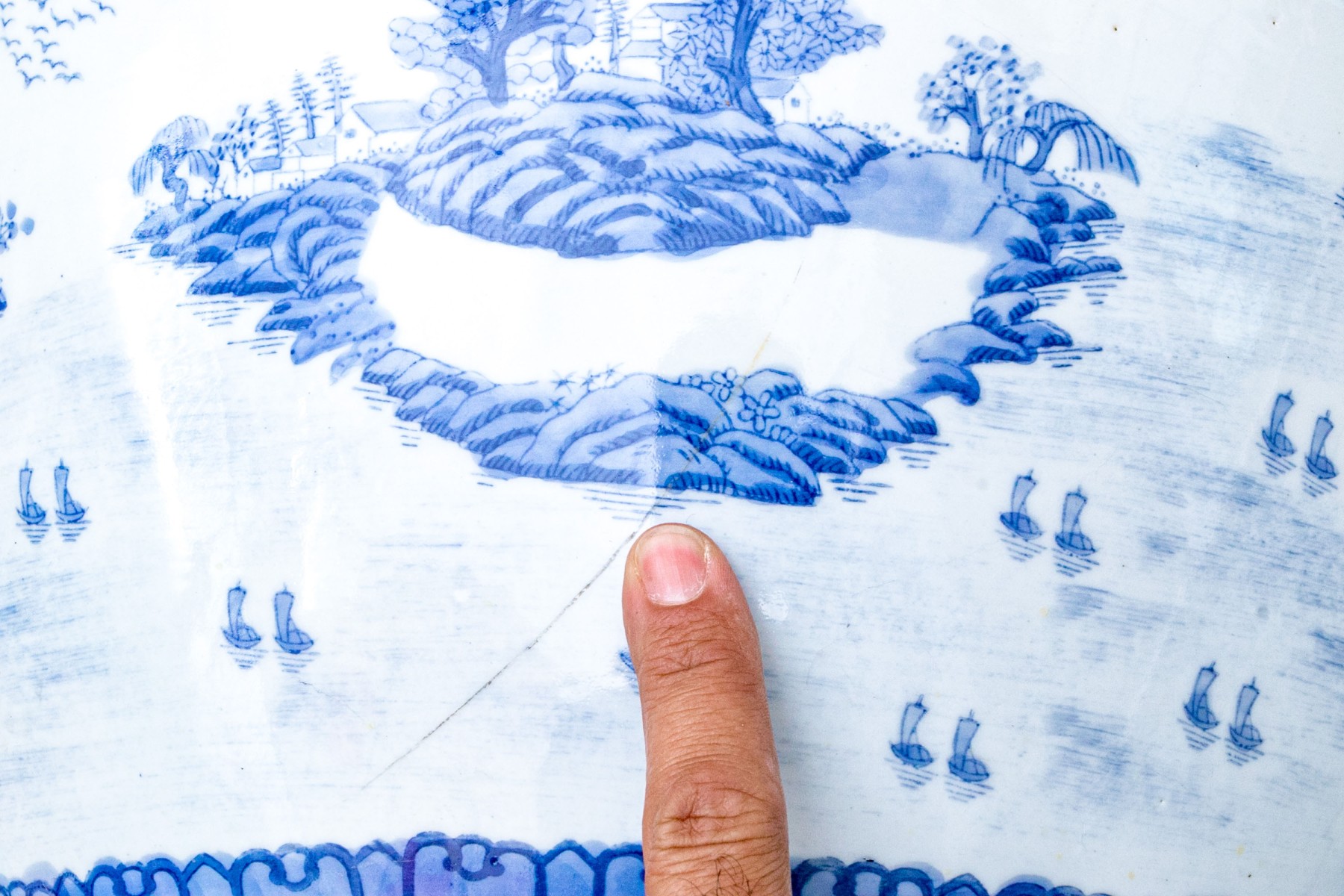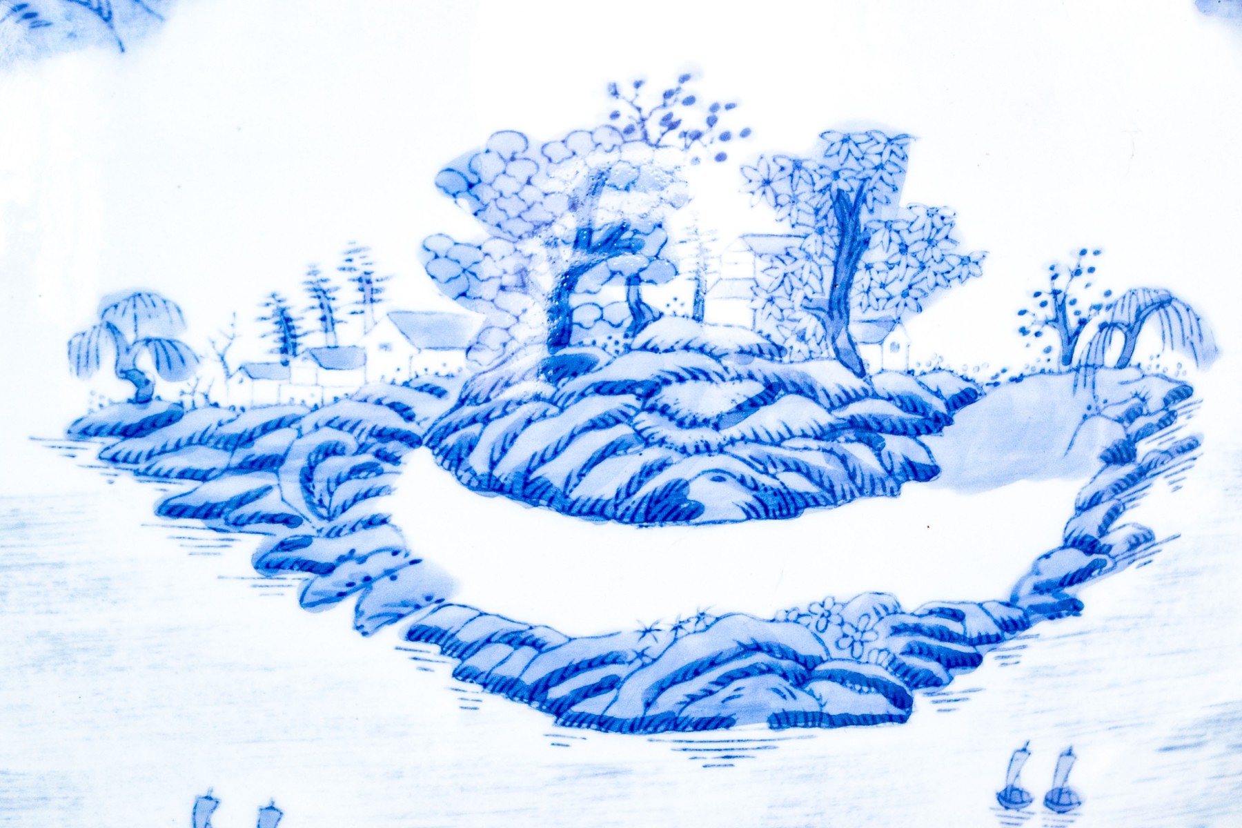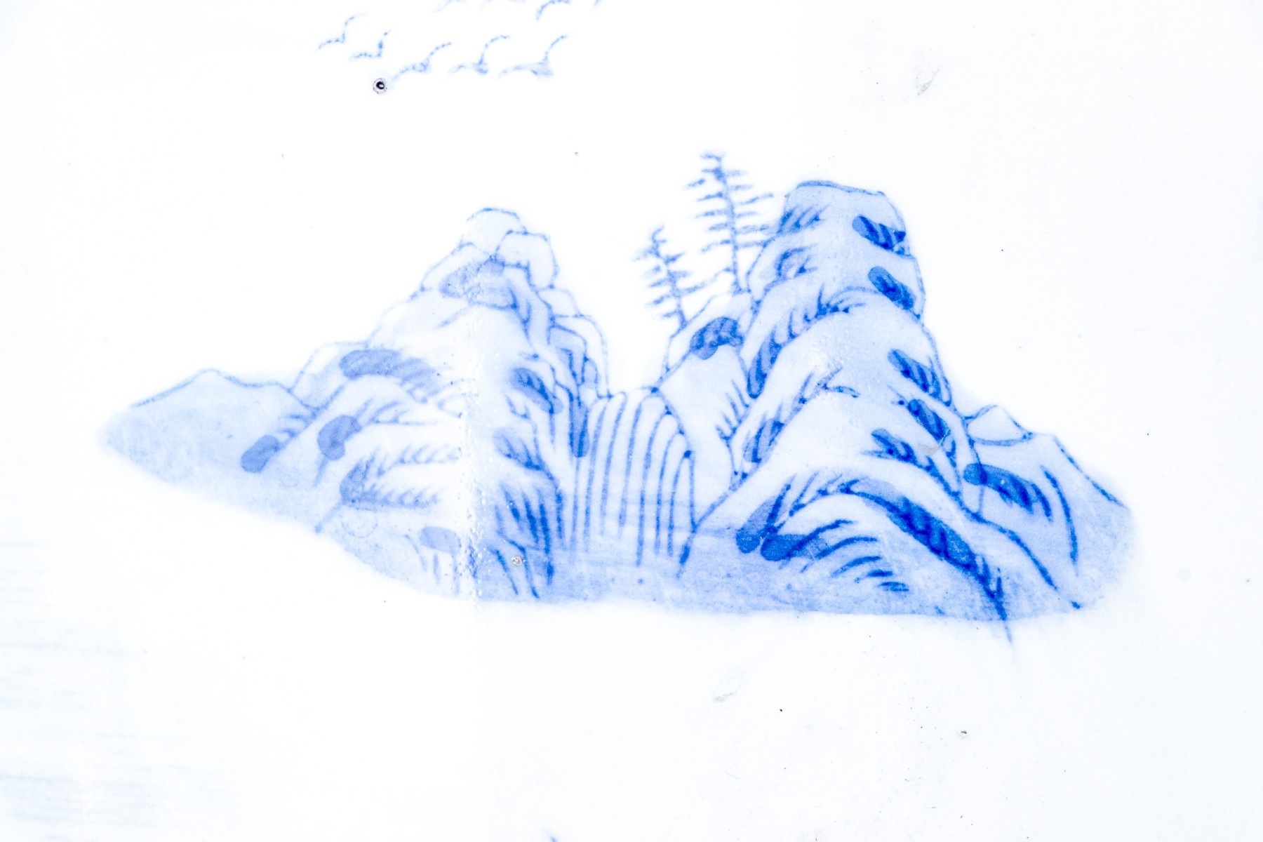 Decoration depicting a traditional waterside village motif with keyfret decoration to the mouth trim.