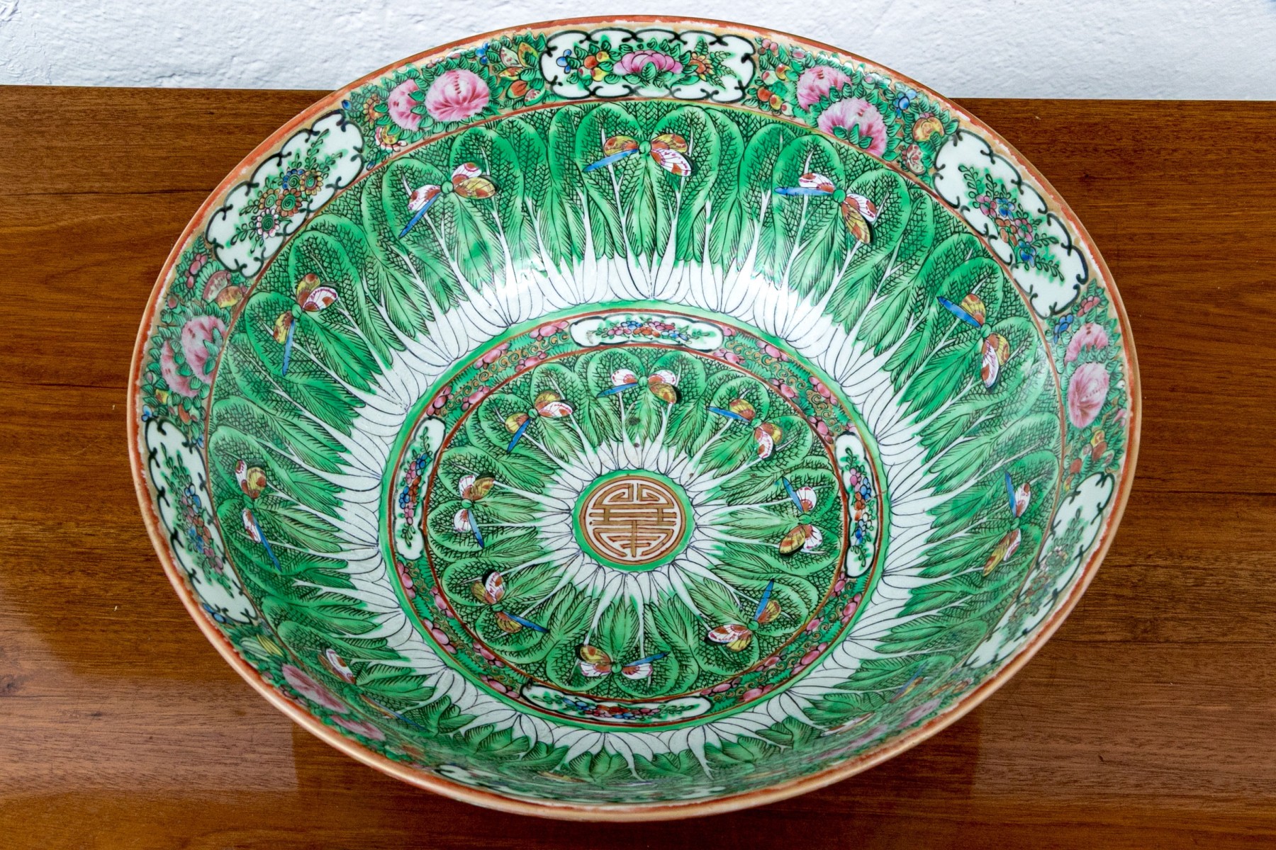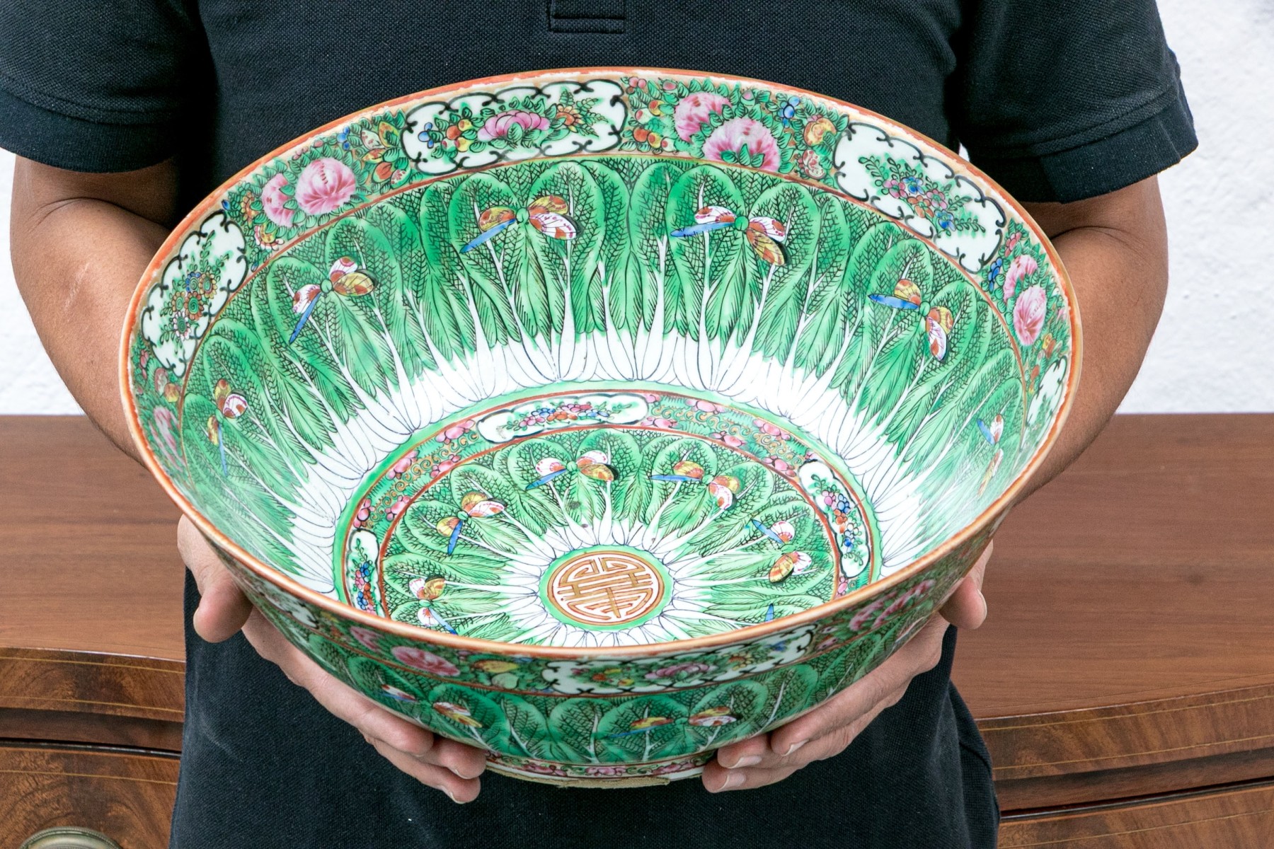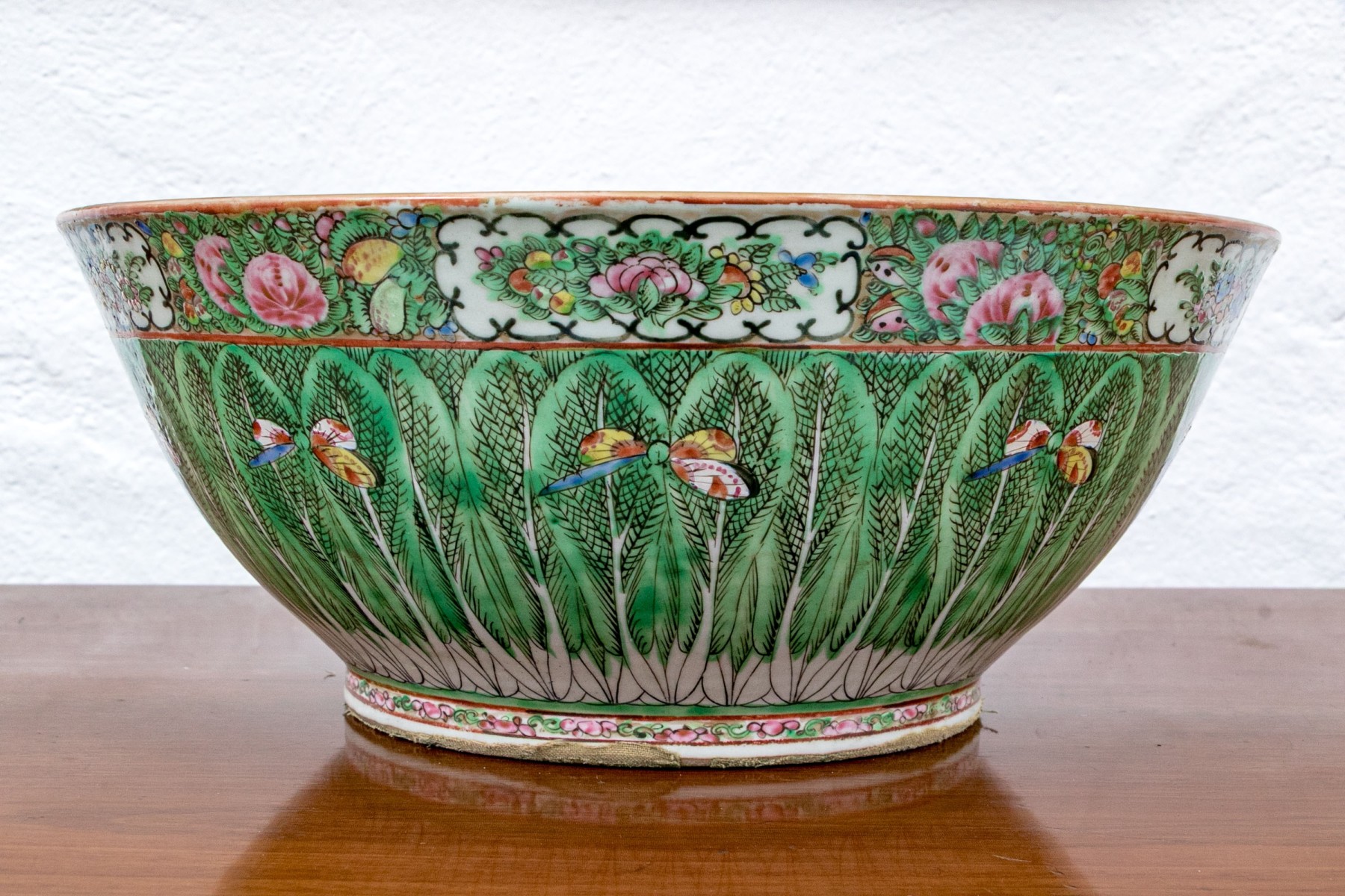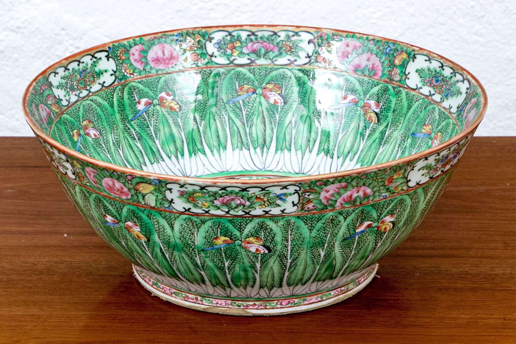 An impressive and large Chinese porcelain centerpiece or punch bowl ornately designed with tessellated bok choy leaves overlaid with colorful moths. The rim of the bowl sports a wide border of floral scenes in famille rose pink, blue, yellow, and green. The bottom edge of the foot is wrapped in fabric to protect table surfaces.