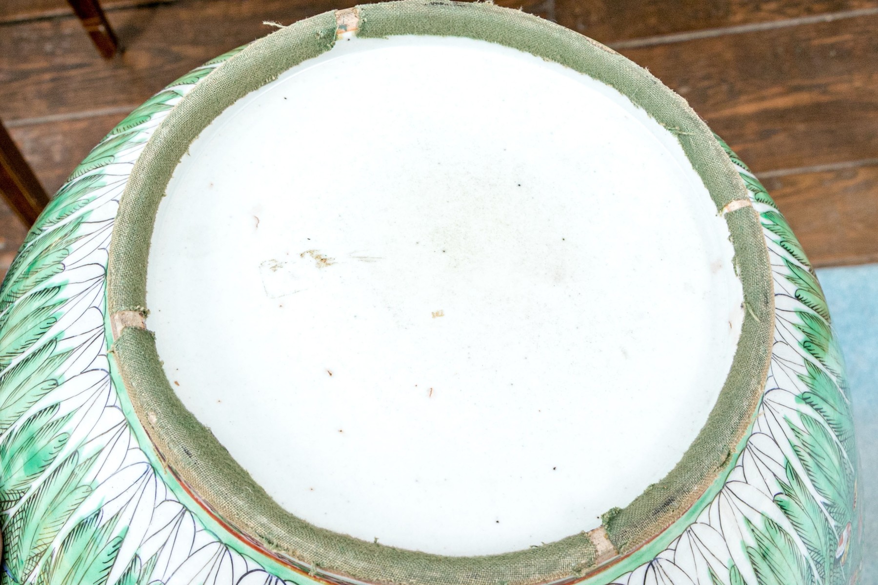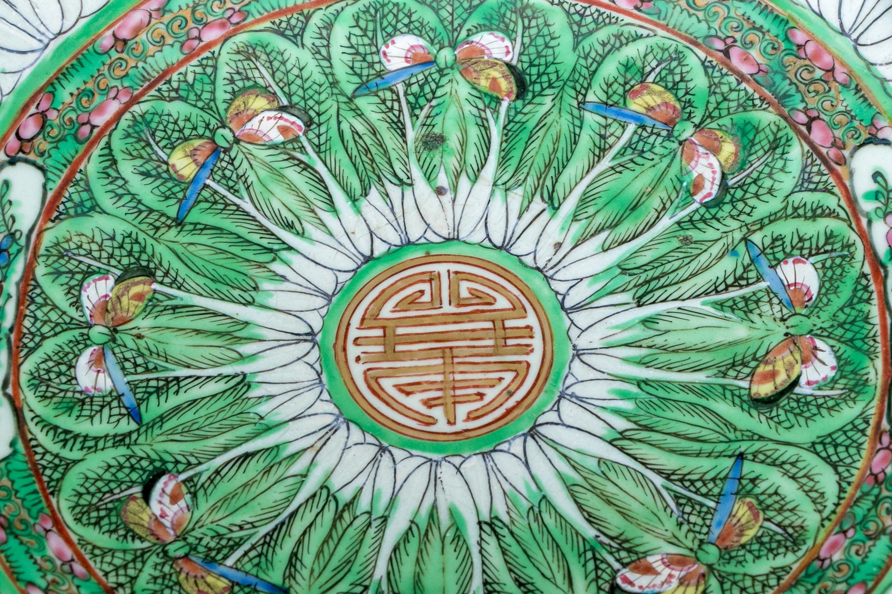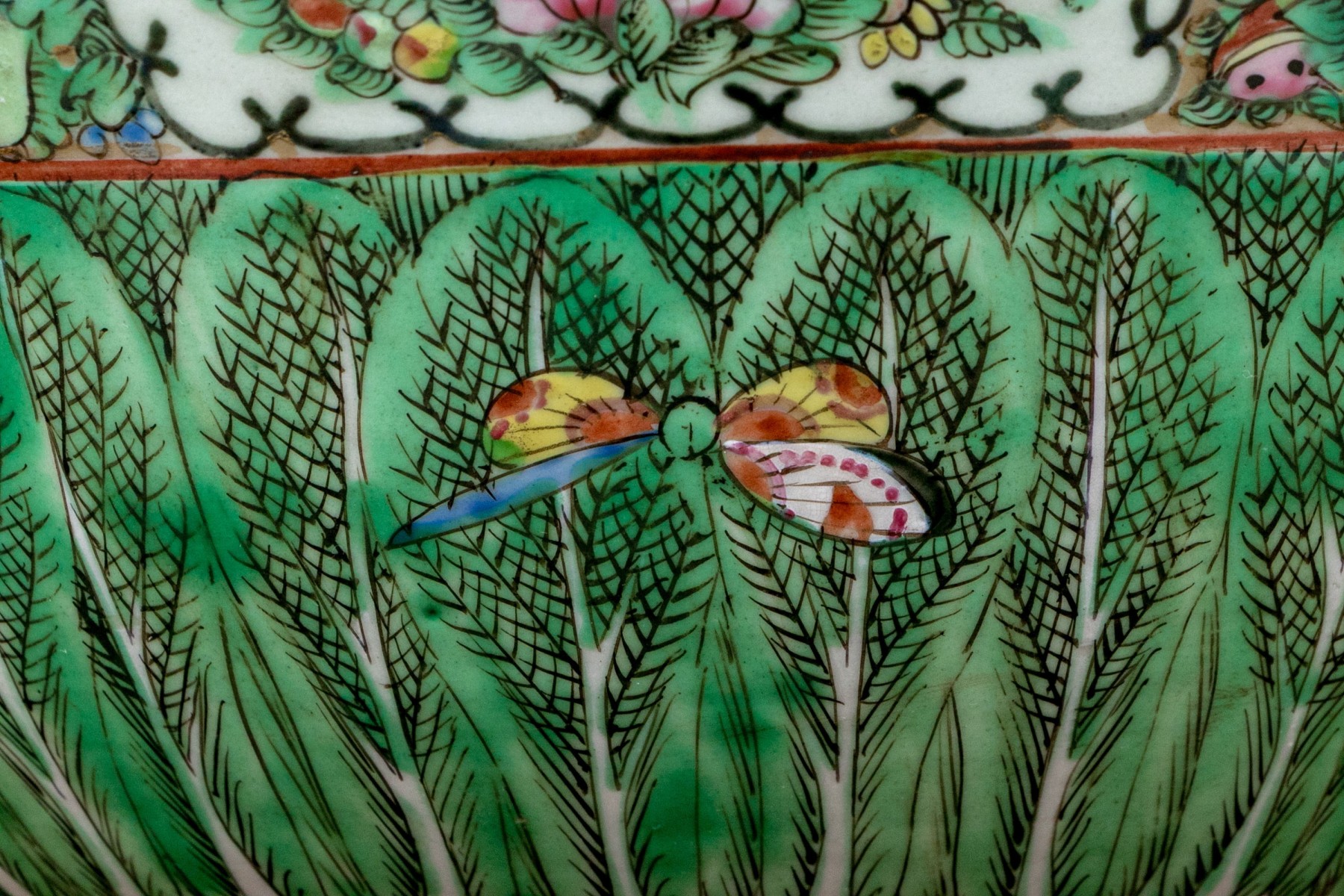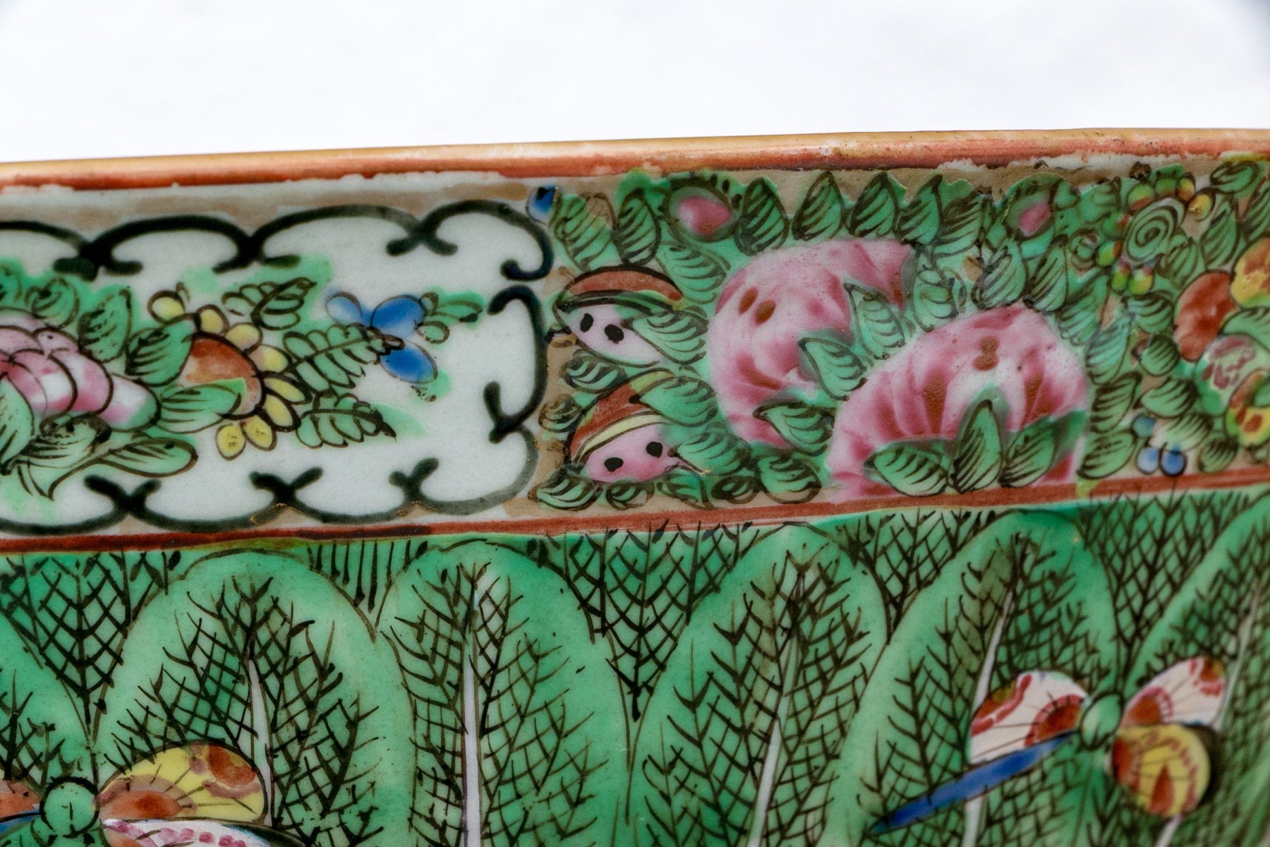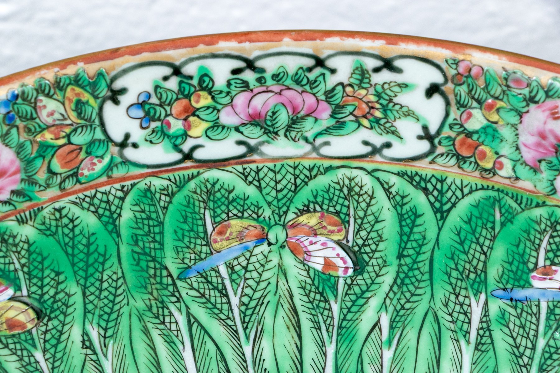 An impressive and large Chinese porcelain centerpiece or punch bowl ornately designed with tessellated bok choy leaves overlaid with colorful moths. The rim of the bowl sports a wide border of floral scenes in famille rose pink, blue, yellow, and green. The bottom edge of the foot is wrapped in fabric to protect table surfaces.