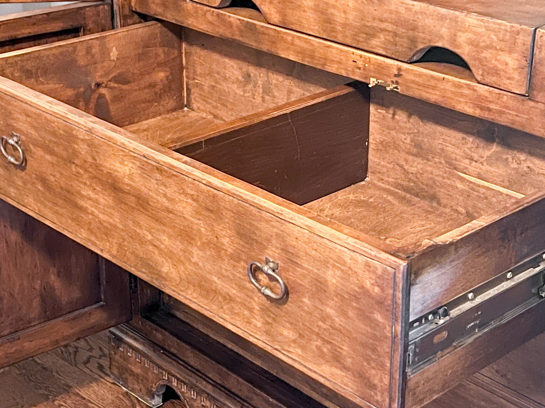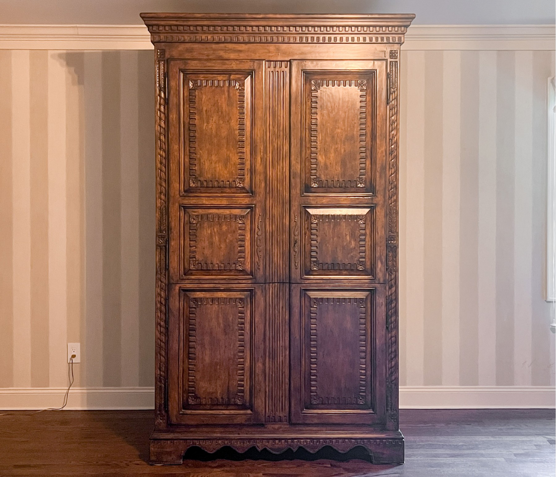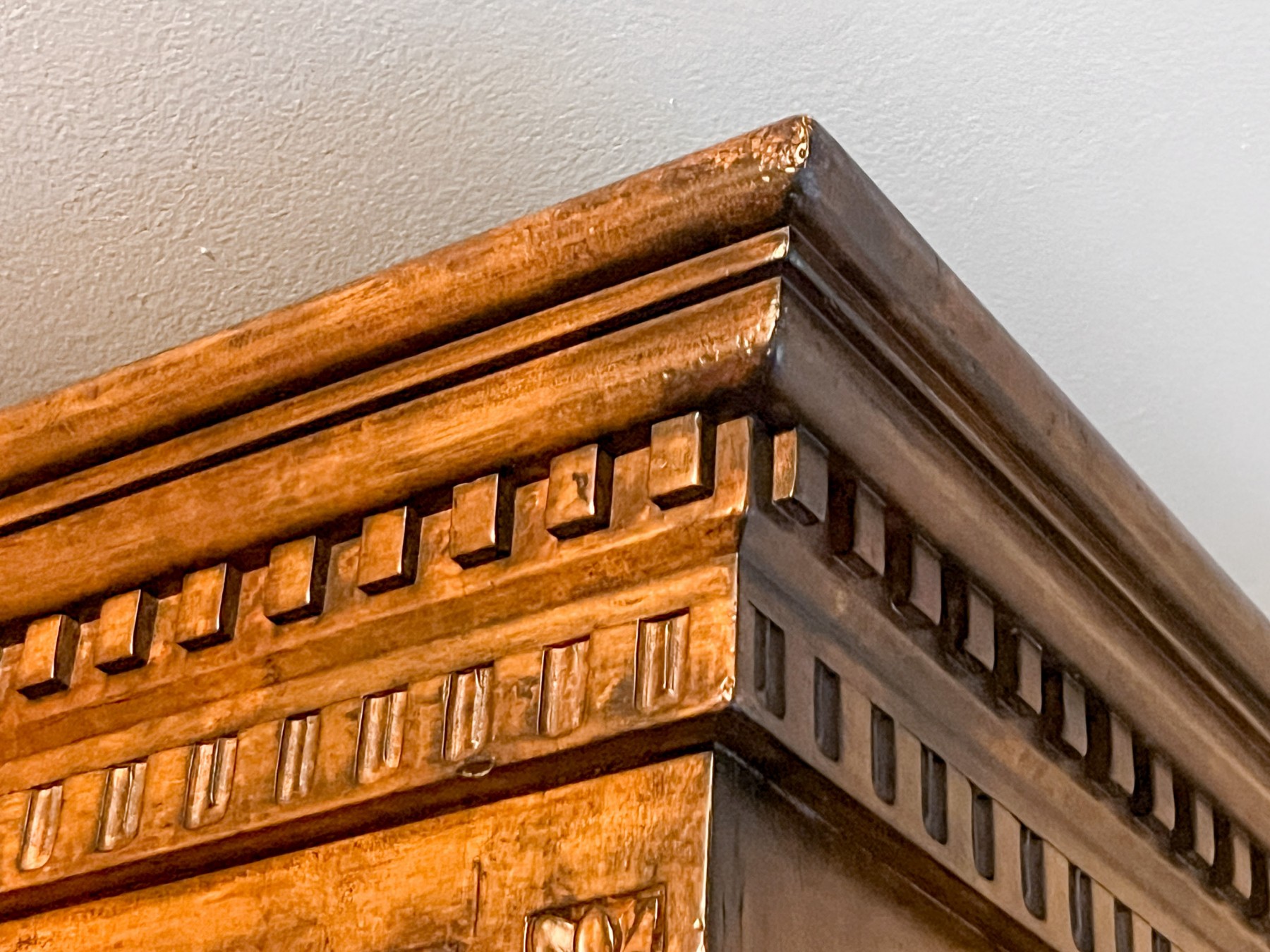 The armoire showcases a beautiful rich patina and features a triple dental molded cornice, adding a touch of elegance to its design. The carved raised panel double doors open to reveal a fitted interior, providing ample storage space for your belongings.