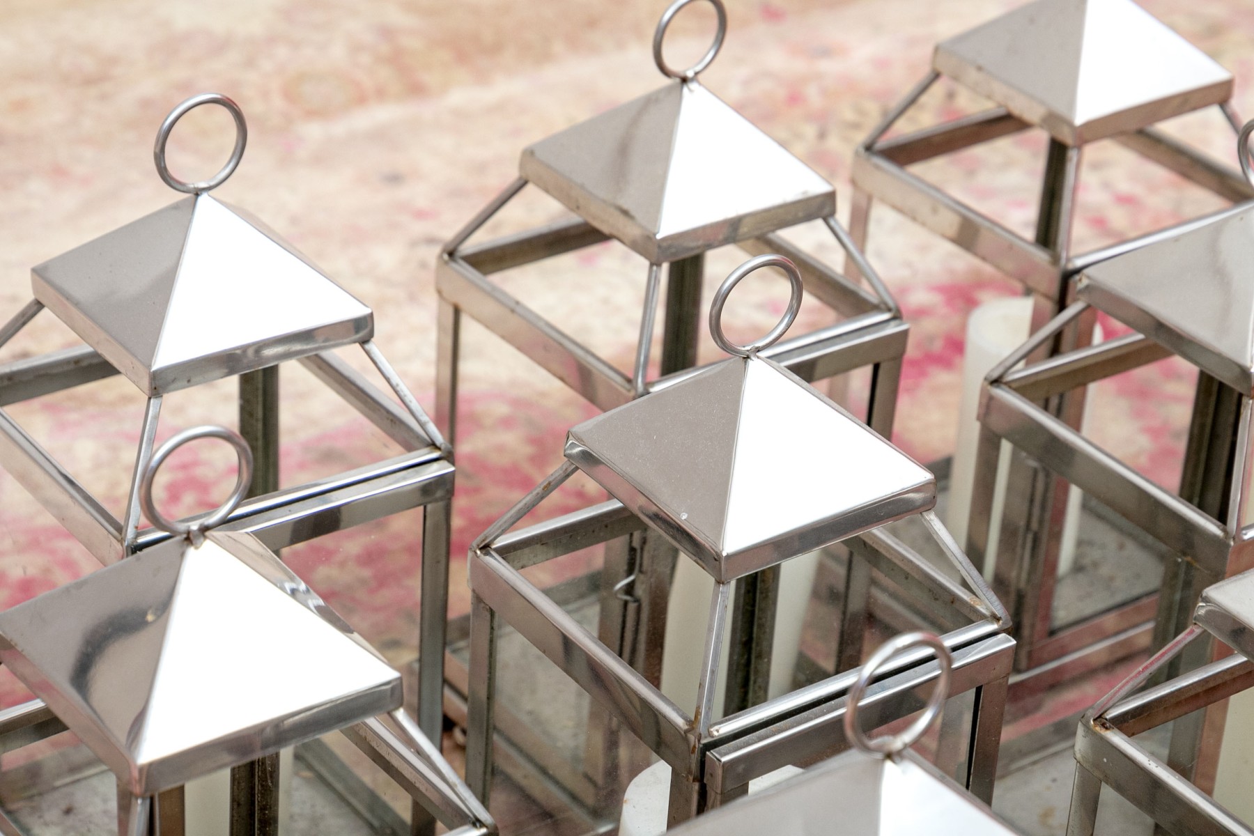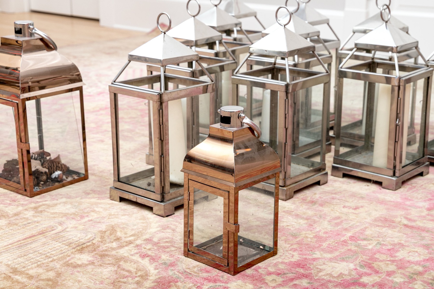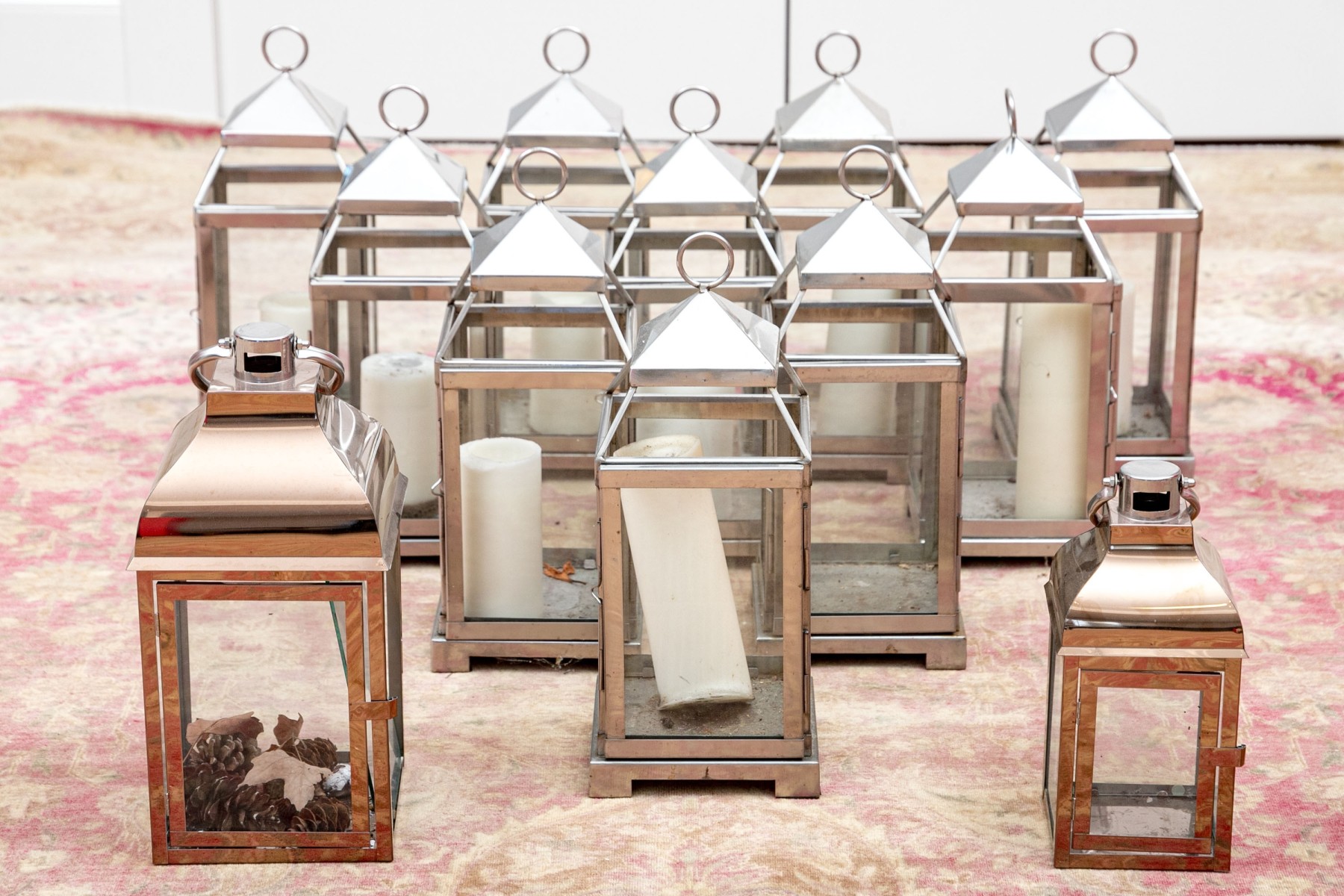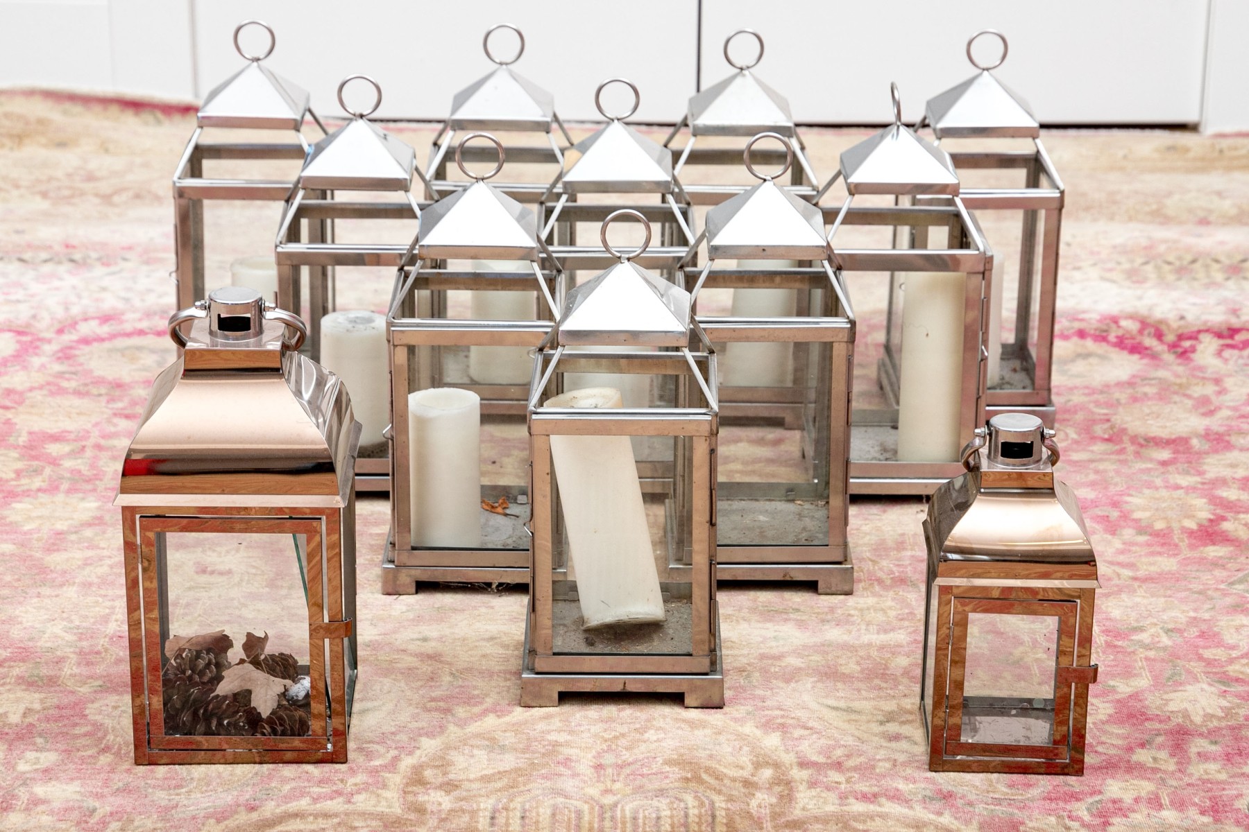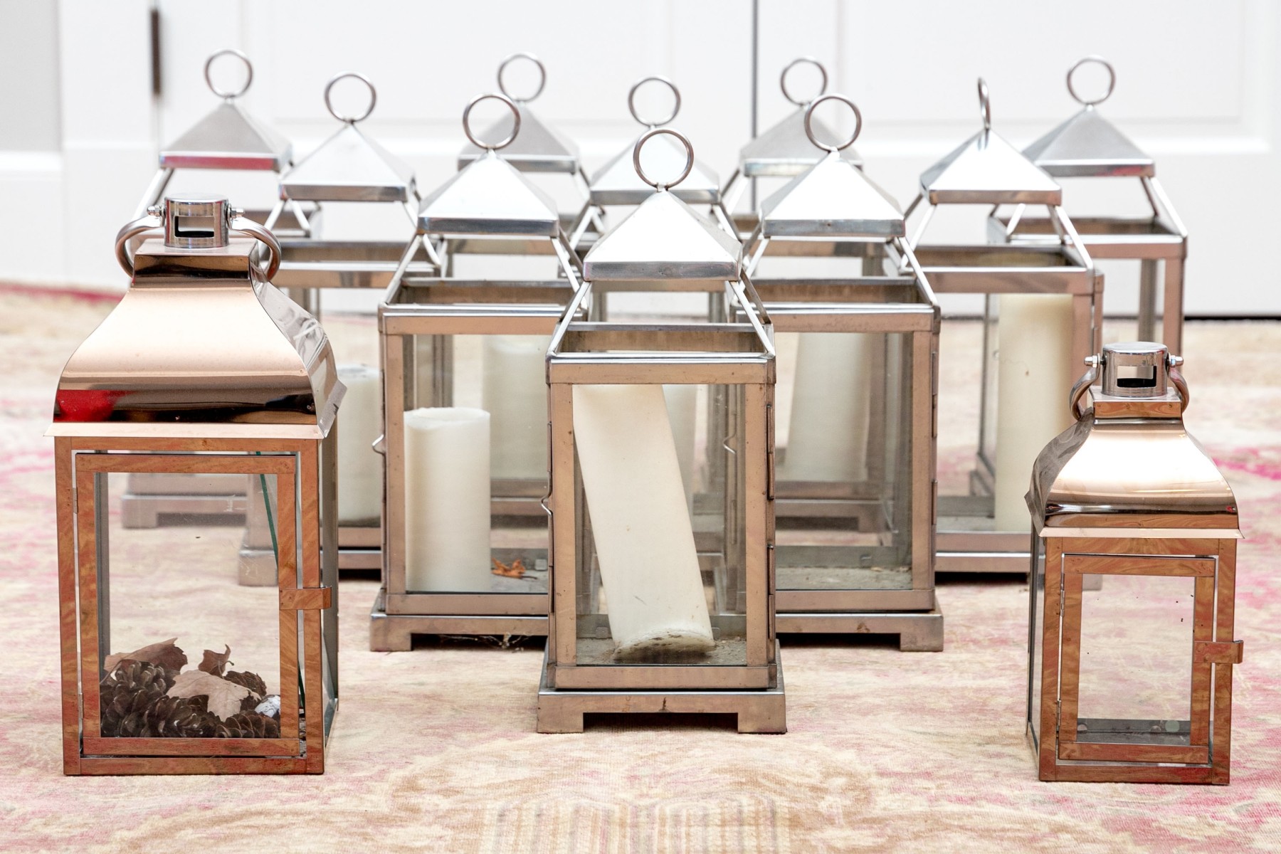 An excellent group of decorative lanterns, perfect for indoor and outdoor use. Includes ten medium Pottery Barn "Malta" lanterns in polished nickel (retail $59 each) along with a medium and small duo of lanterns in a copper finish, all with glass paned doors.