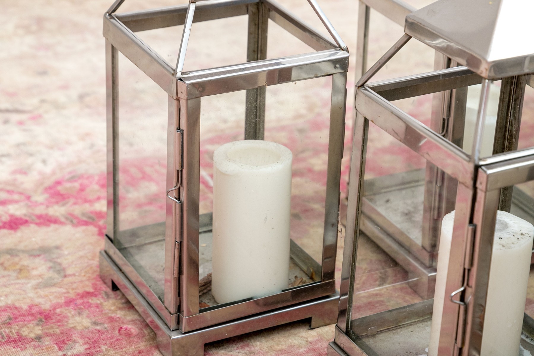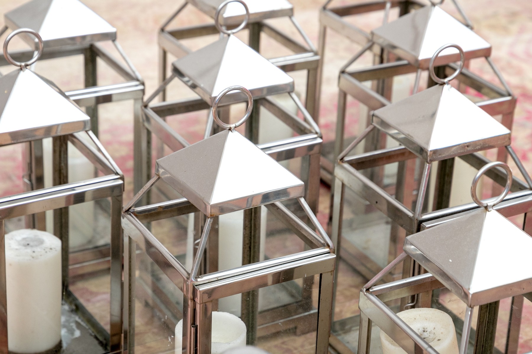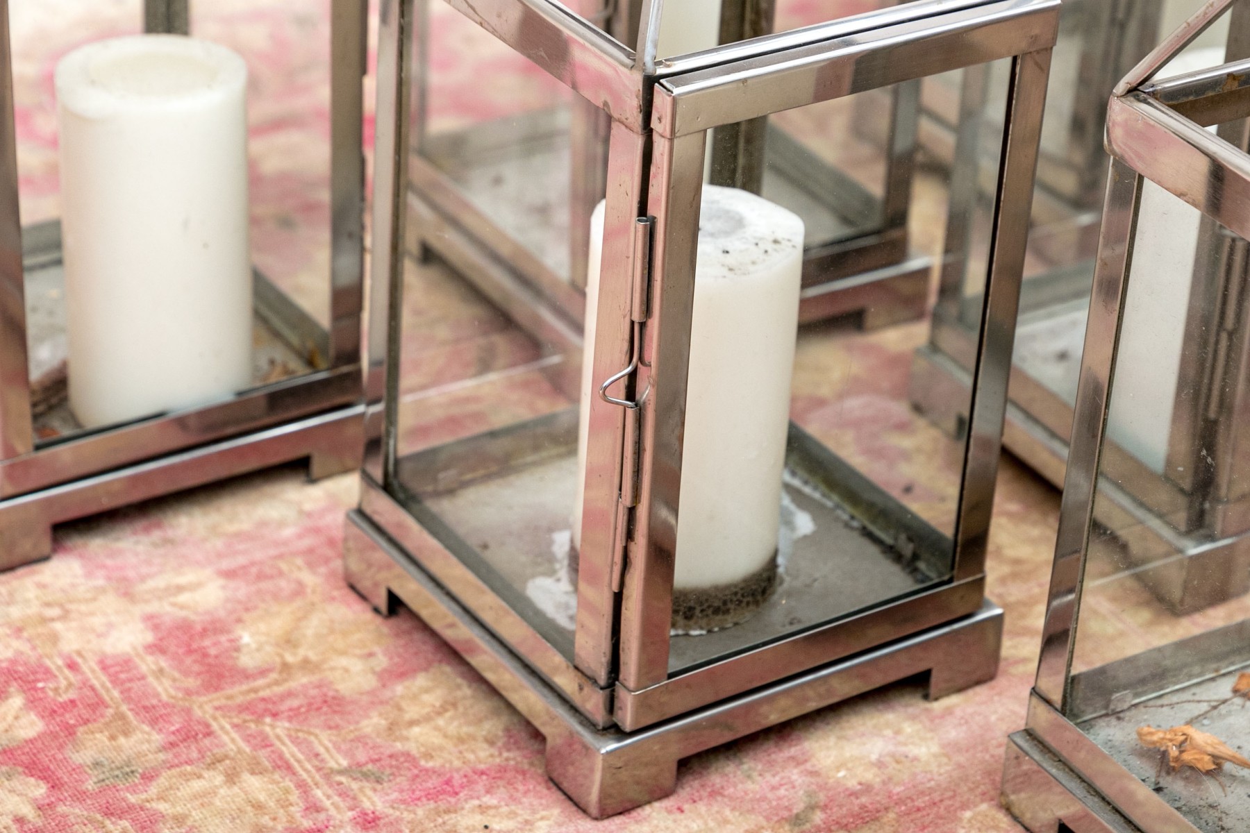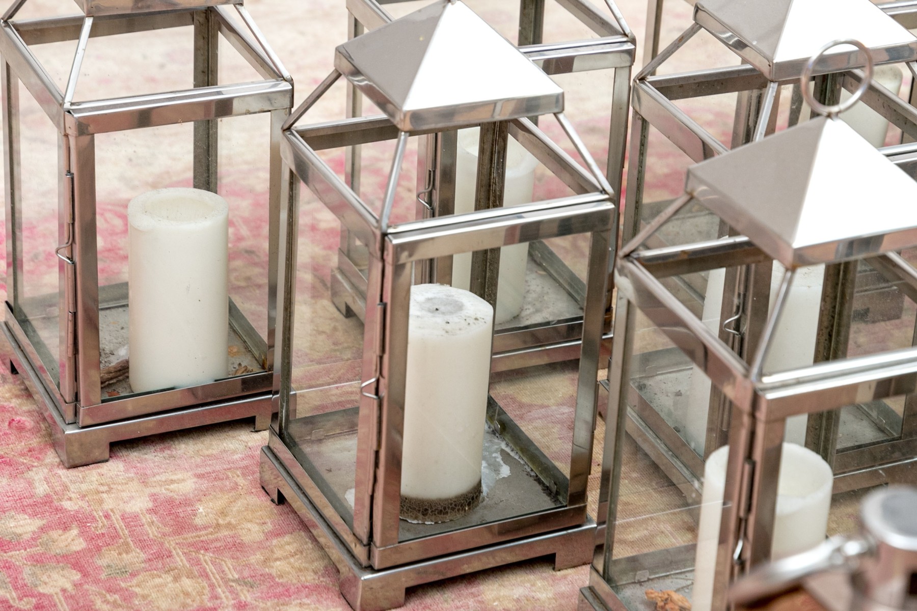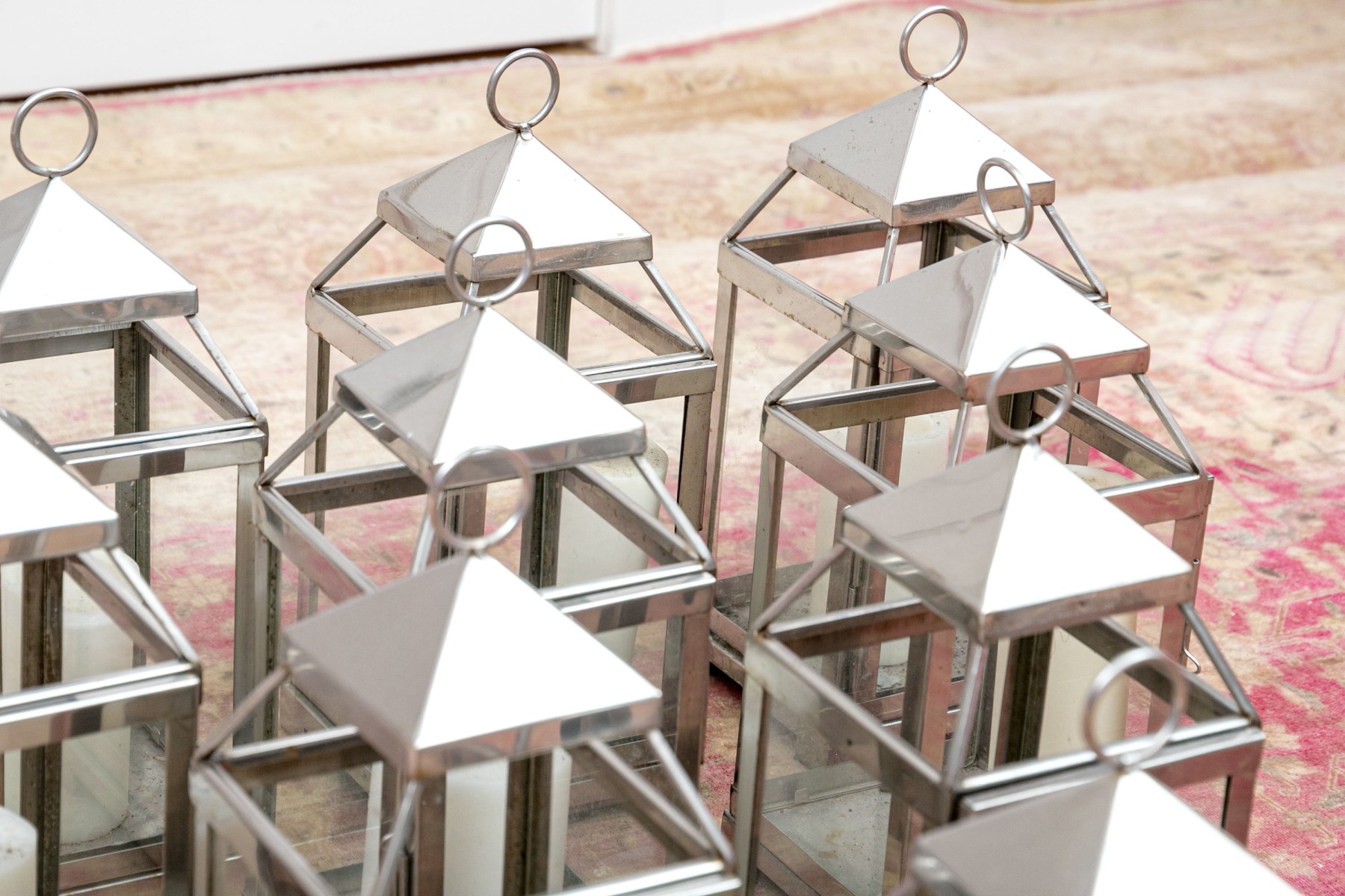 An excellent group of decorative lanterns, perfect for indoor and outdoor use. Includes ten medium Pottery Barn "Malta" lanterns in polished nickel (retail $59 each) along with a medium and small duo of lanterns in a copper finish, all with glass paned doors.