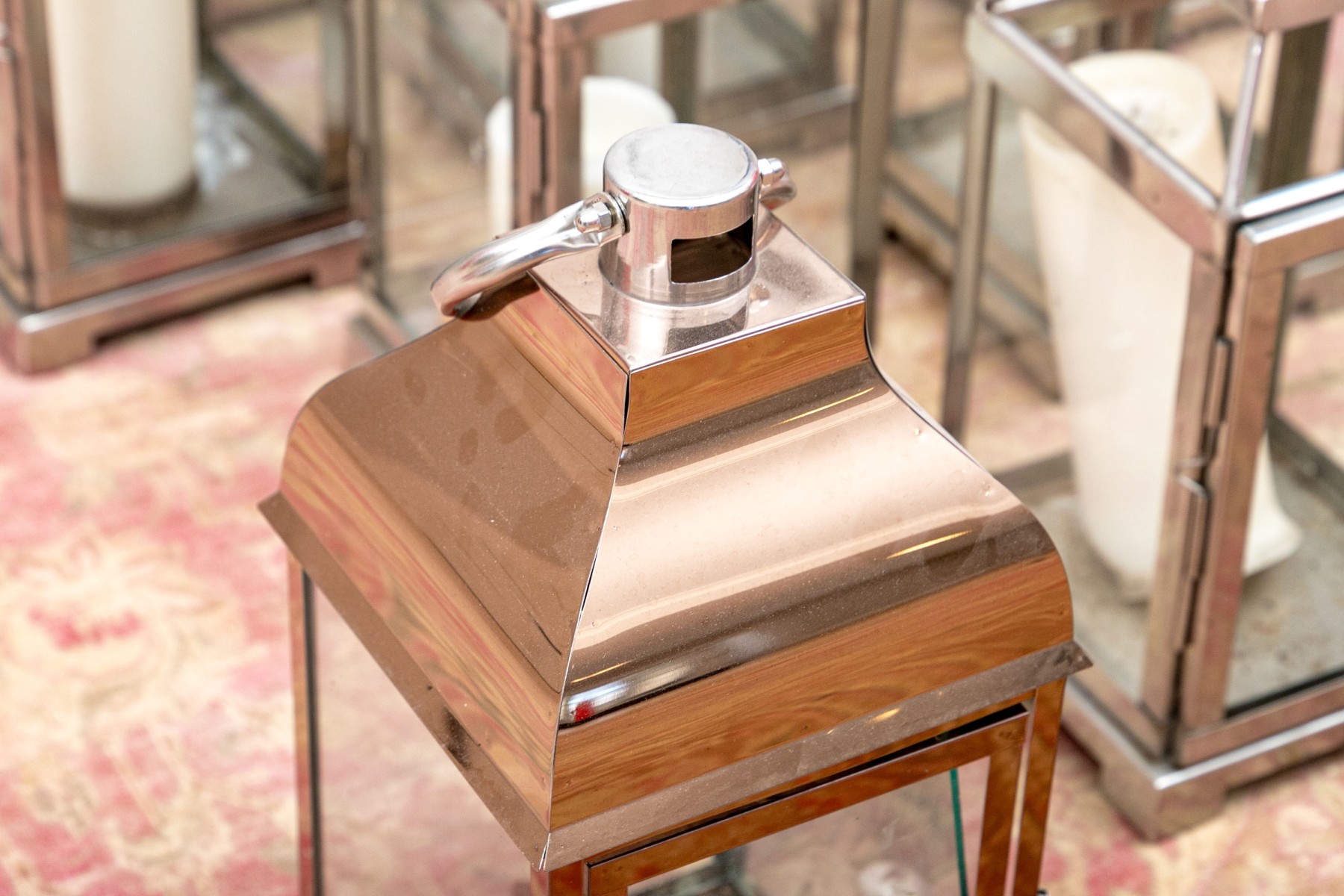 Presents well overall with wear commensurate with display. The medium copper finished lantern has a loose glass pane.