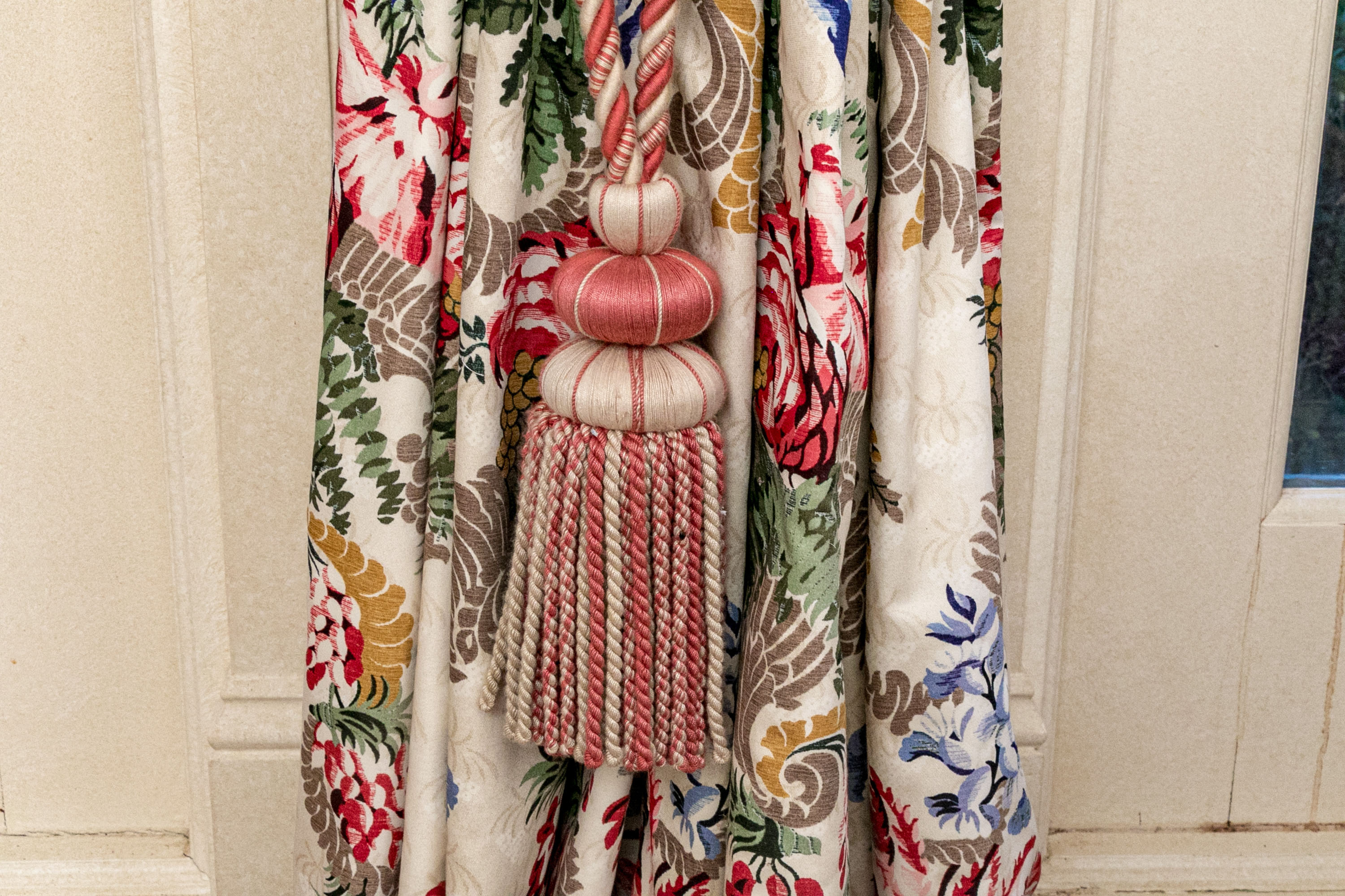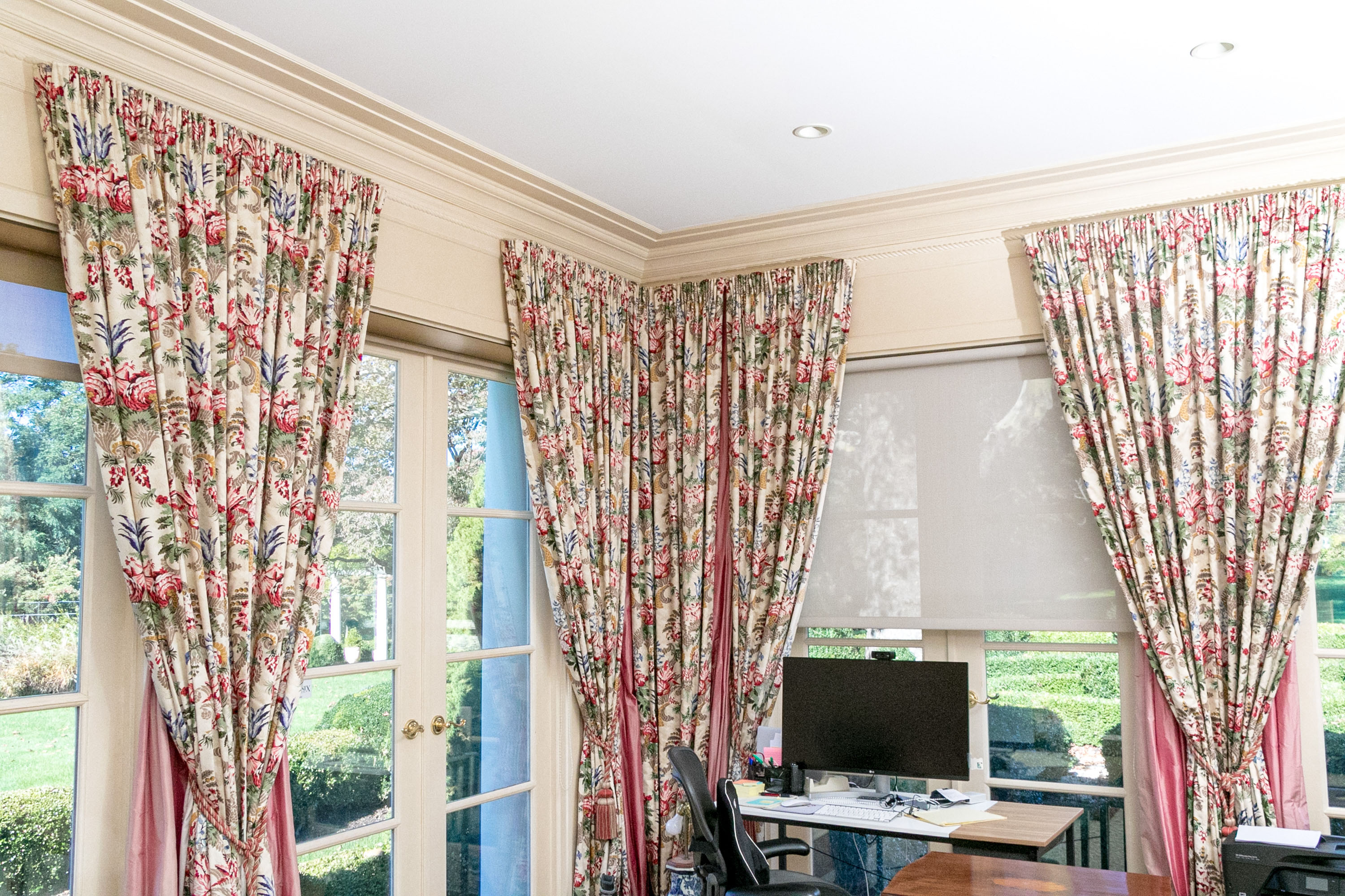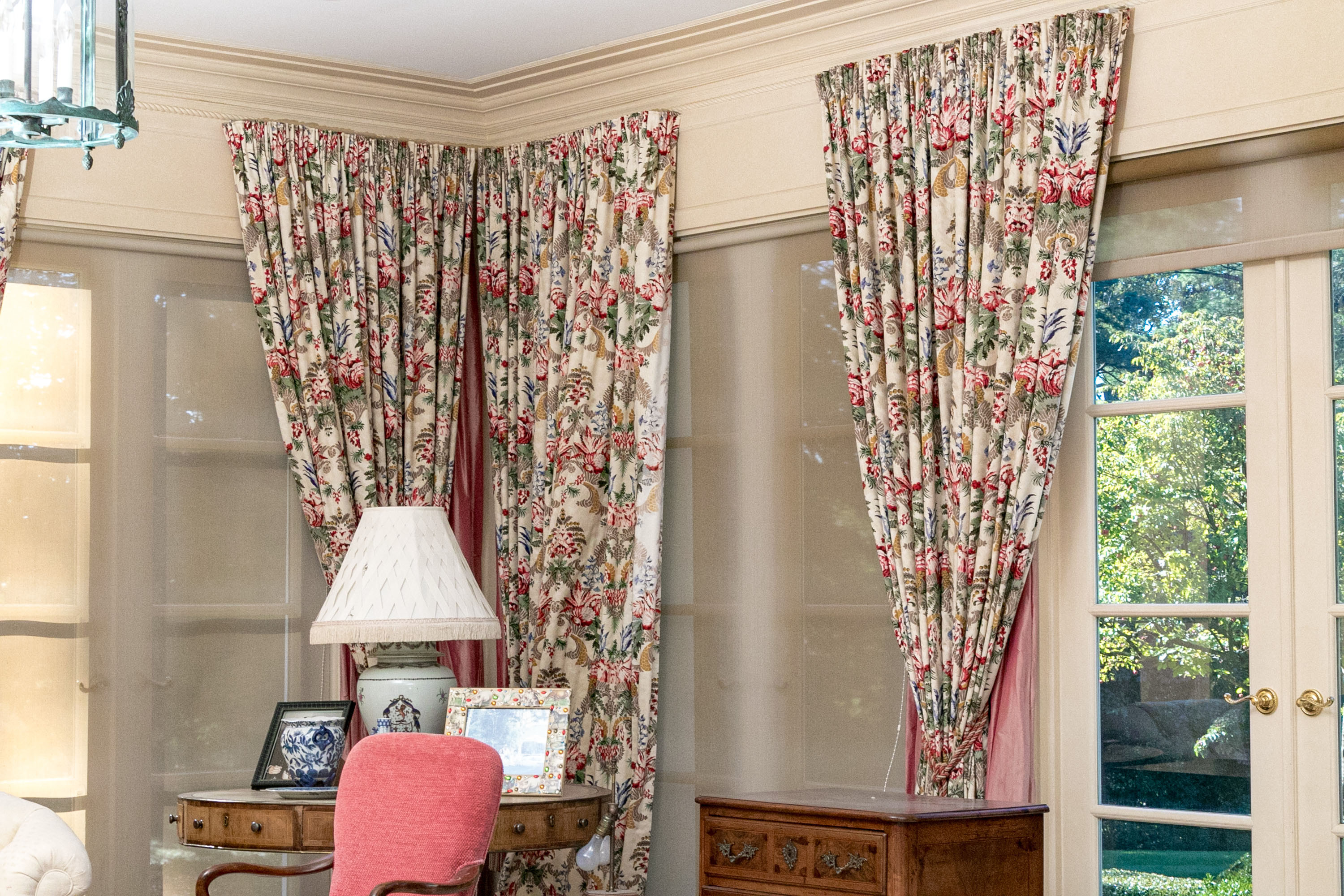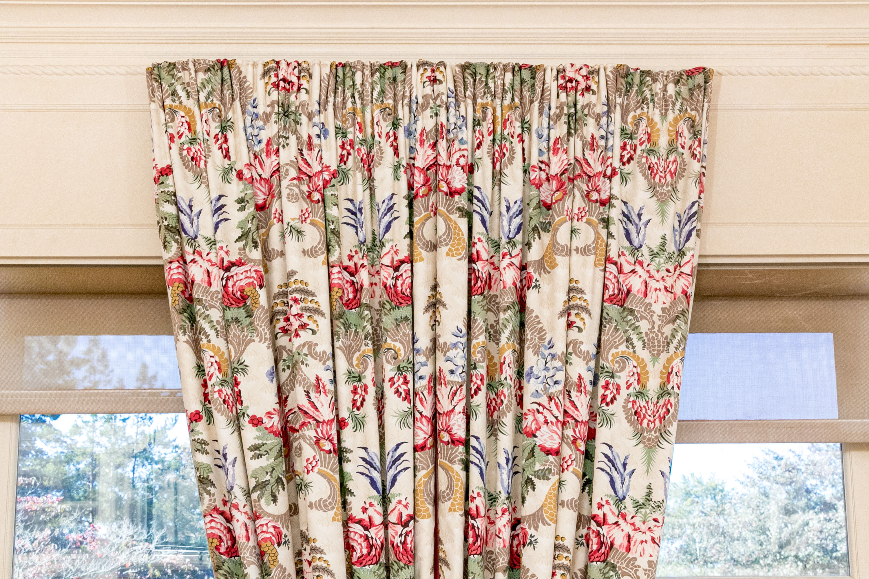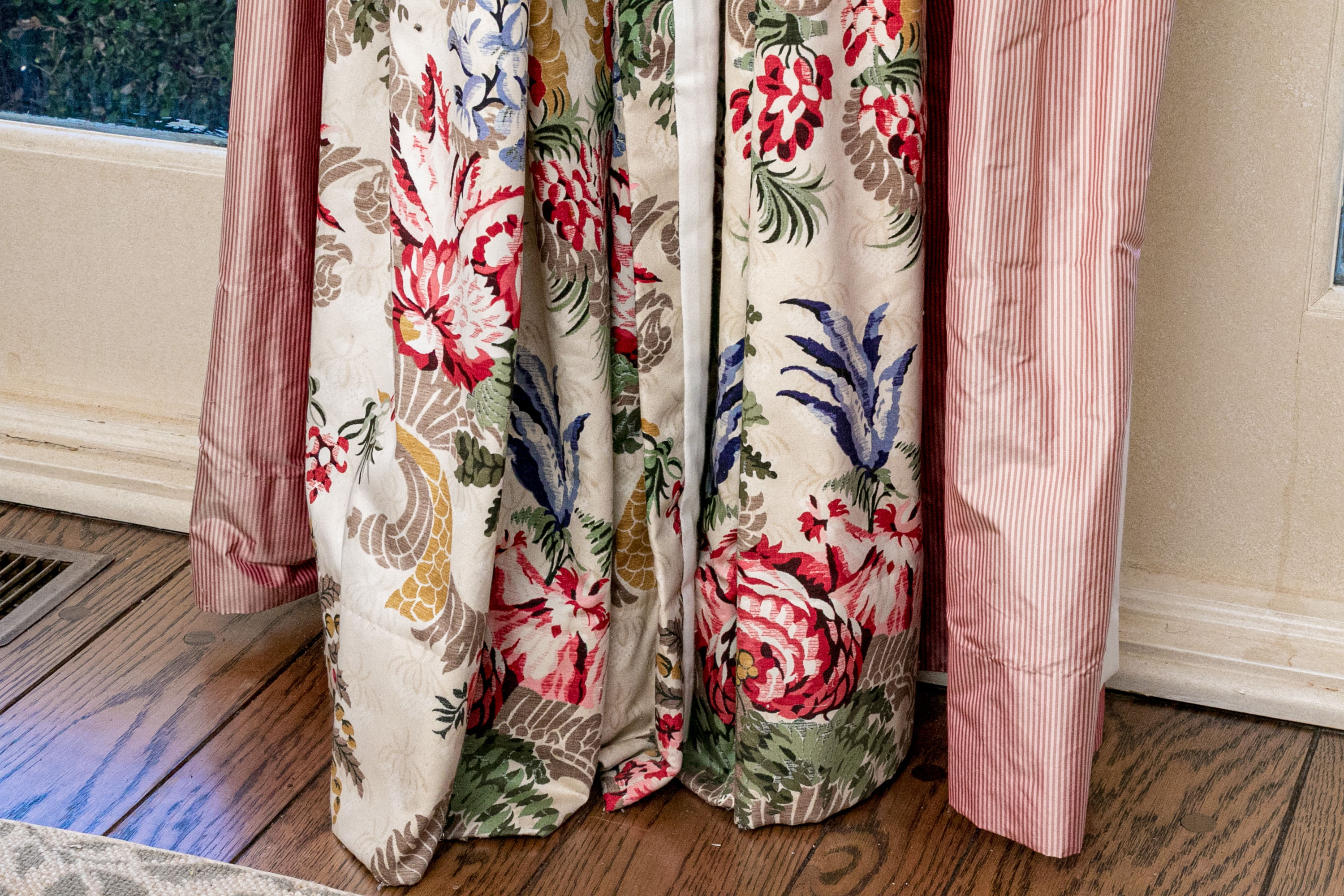 A fantastic collection of luxurious custom curtains and liners in gorgeous chintzy fabric decorated by large floral sprays in red, blue, and yellow with lush green foliage against cream and yellow striped backgrounds. Each with white and green lattice liners n the reverse.