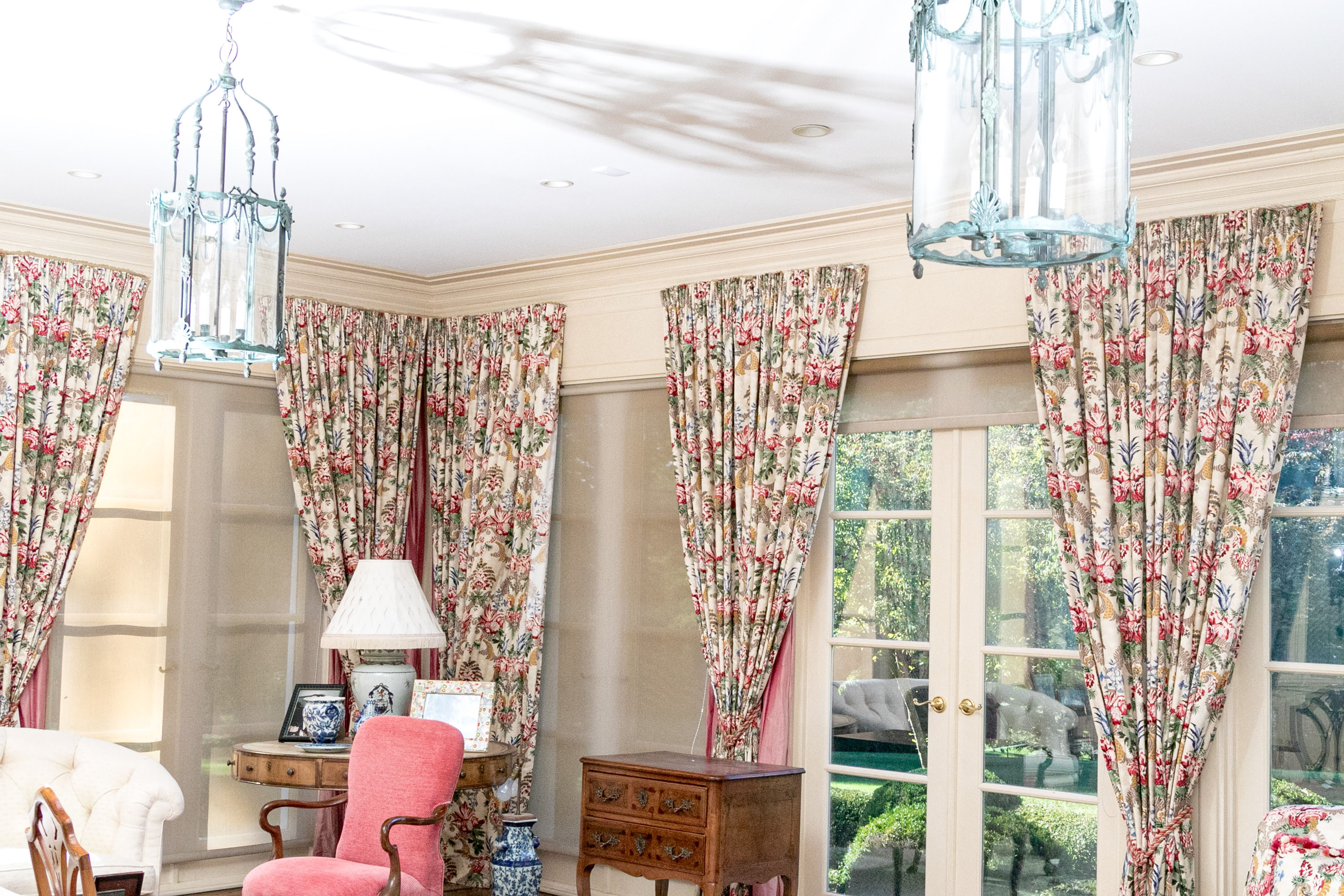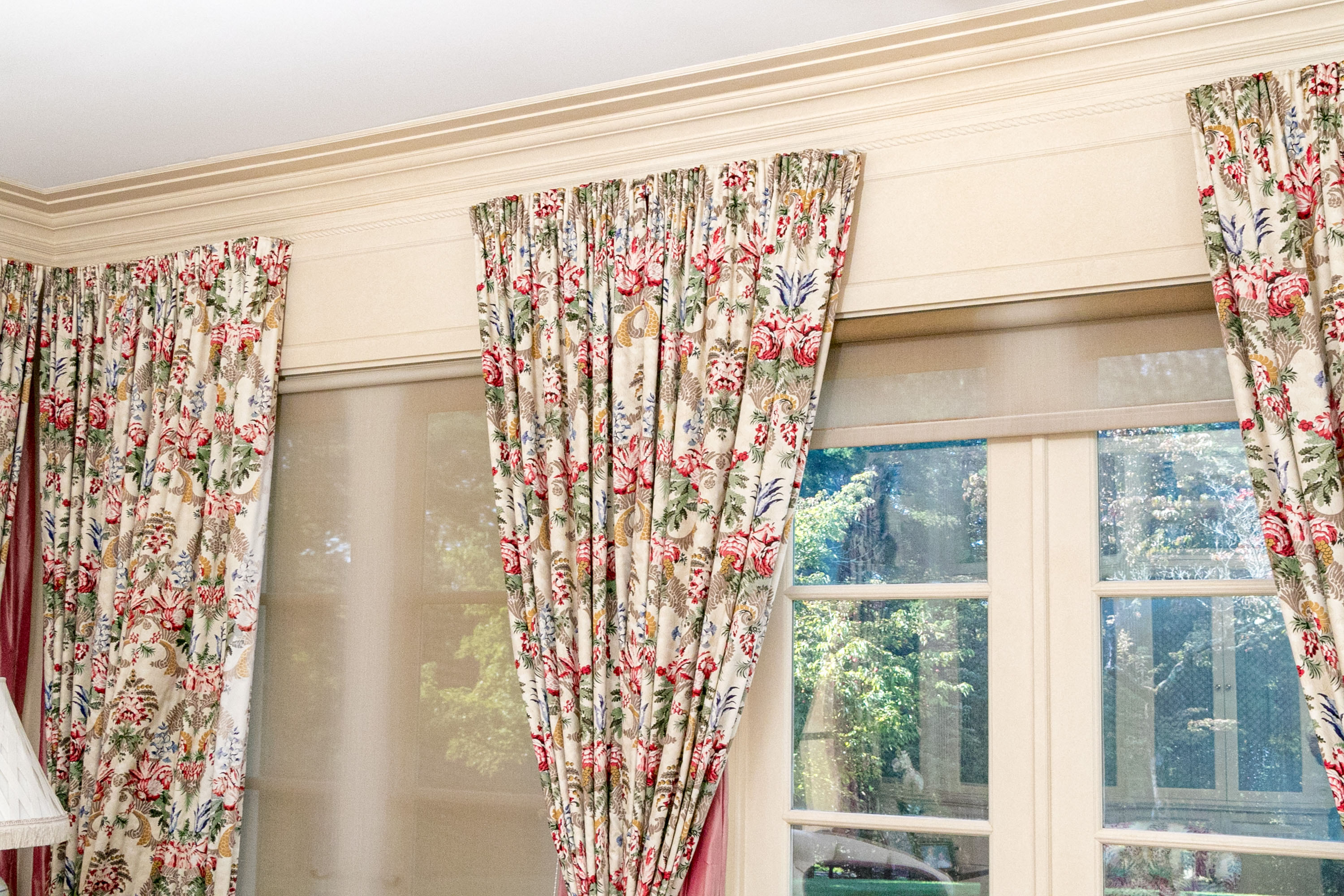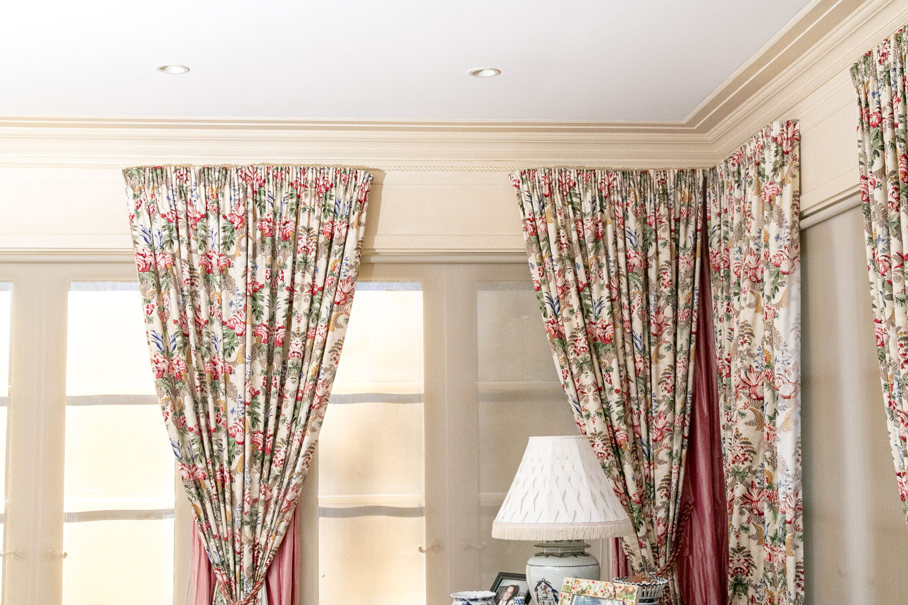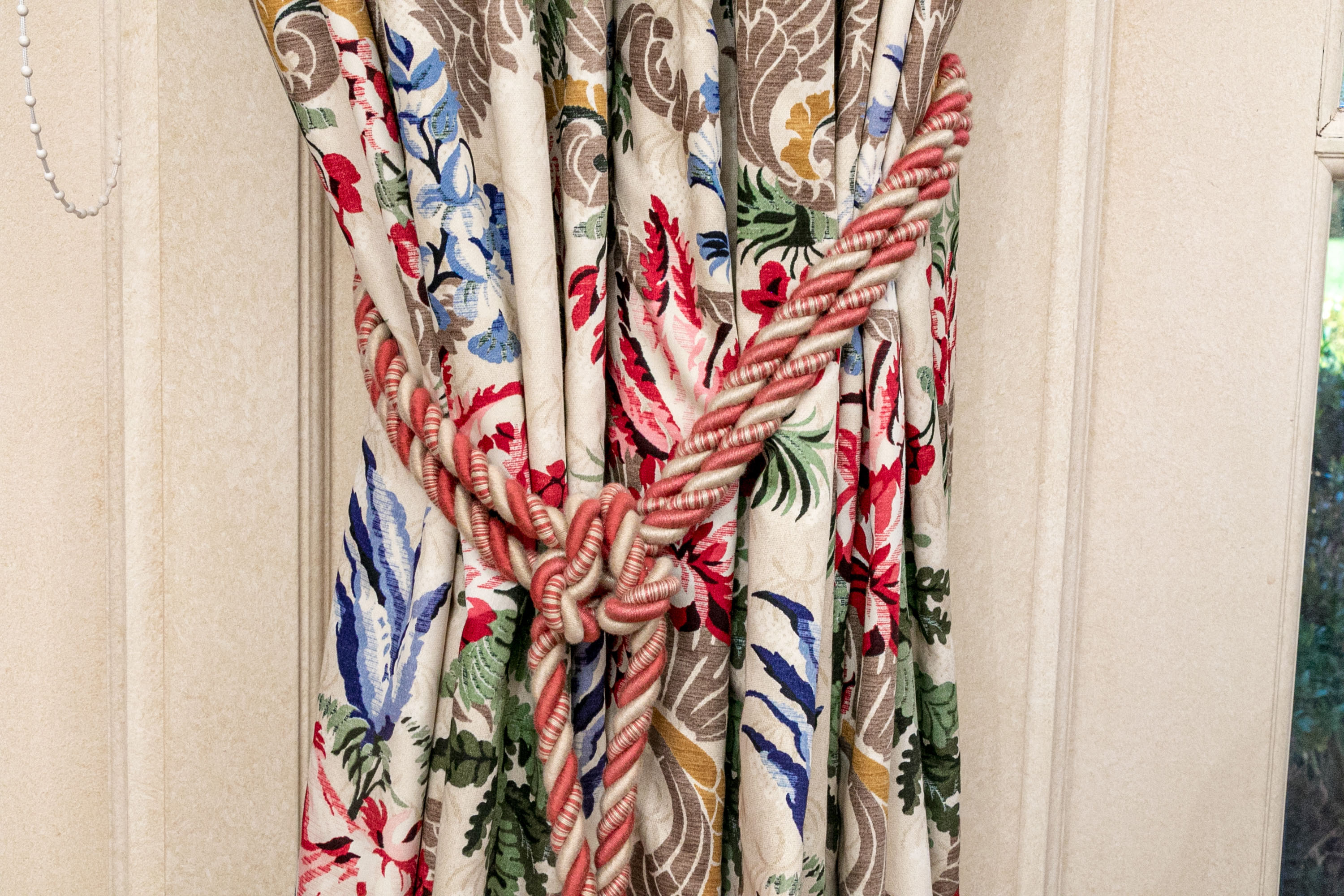 A fantastic collection of luxurious custom curtains and liners in gorgeous chintzy fabric decorated by large floral sprays in red, blue, and yellow with lush green foliage against cream and yellow striped backgrounds. Each with white and green lattice liners n the reverse.