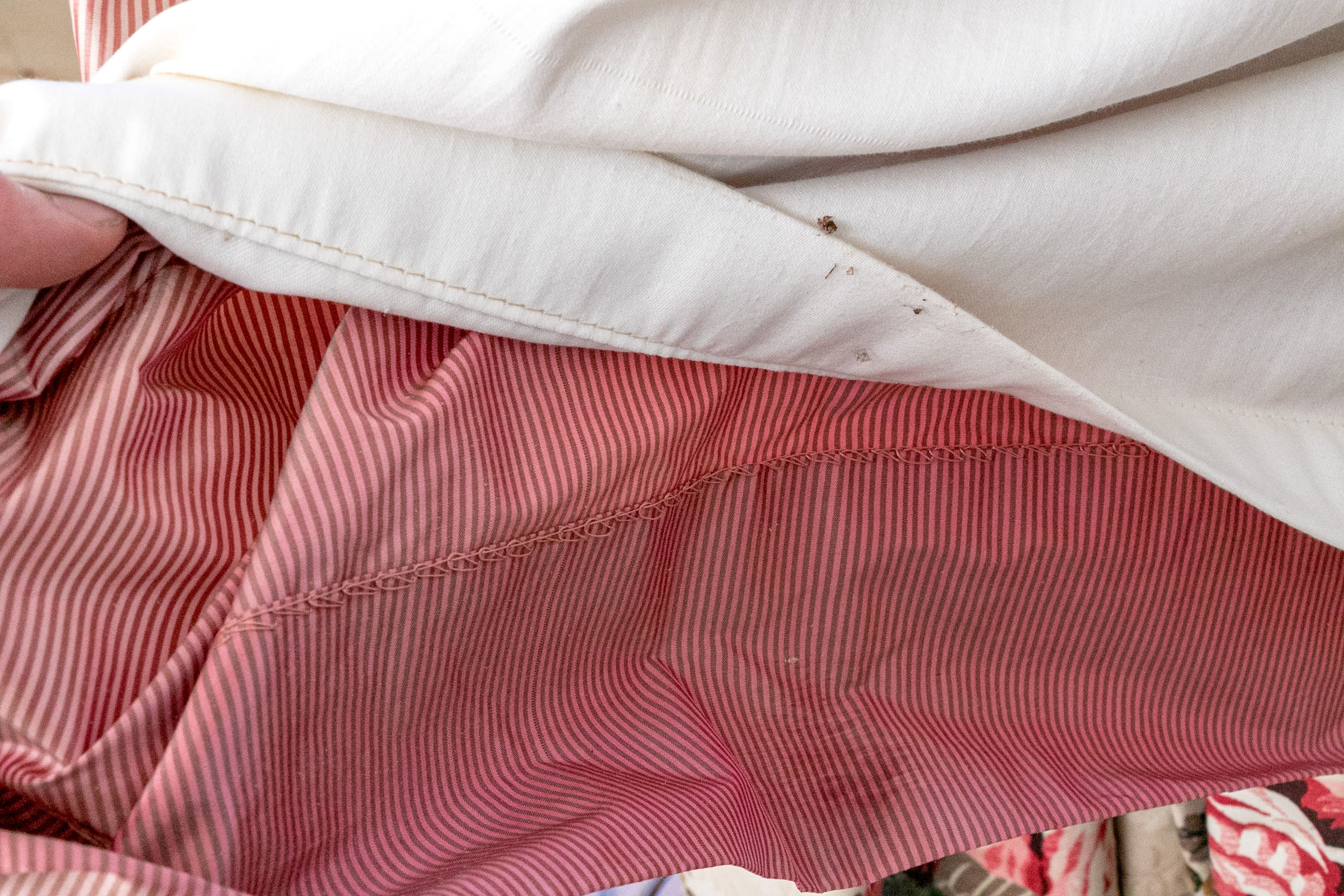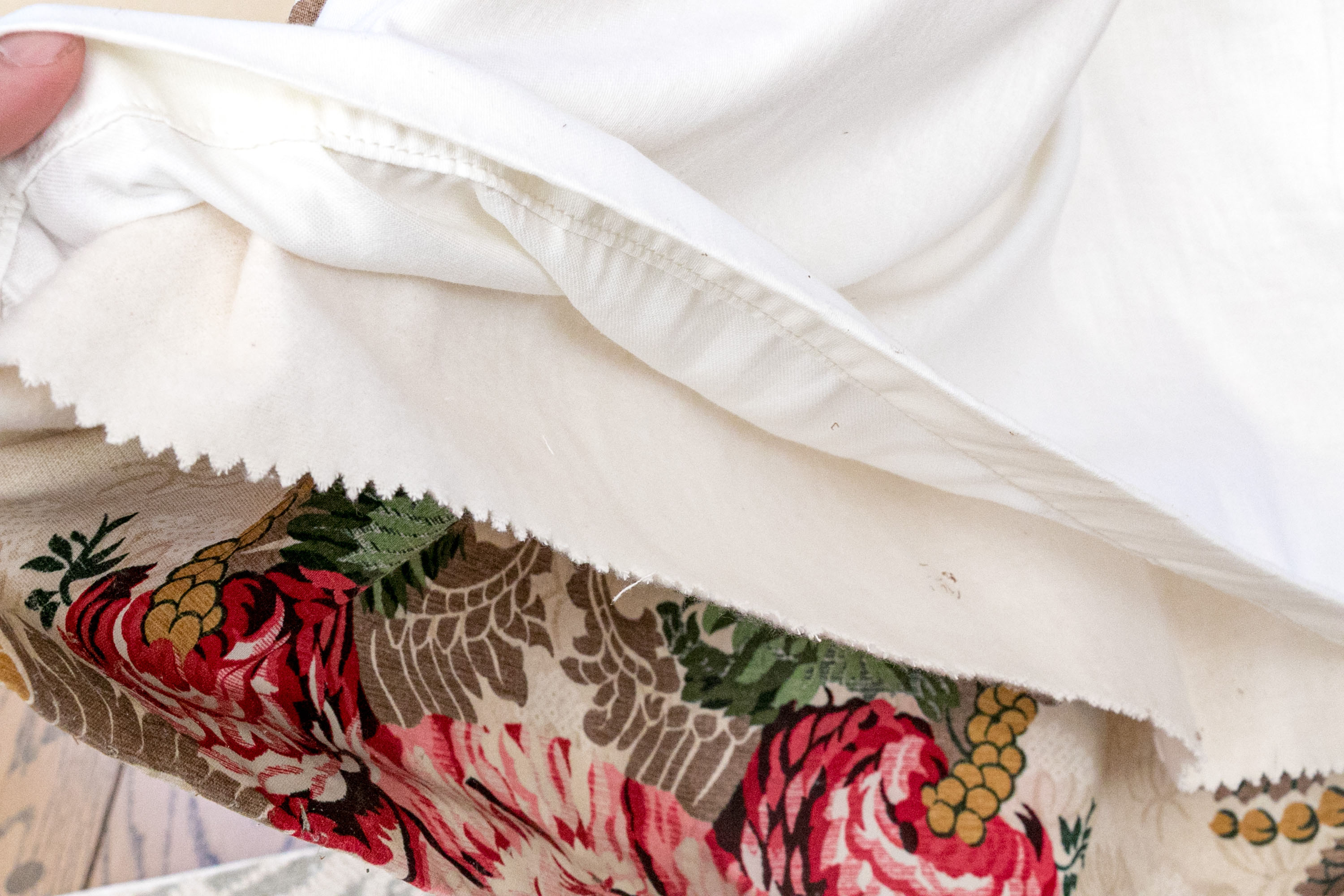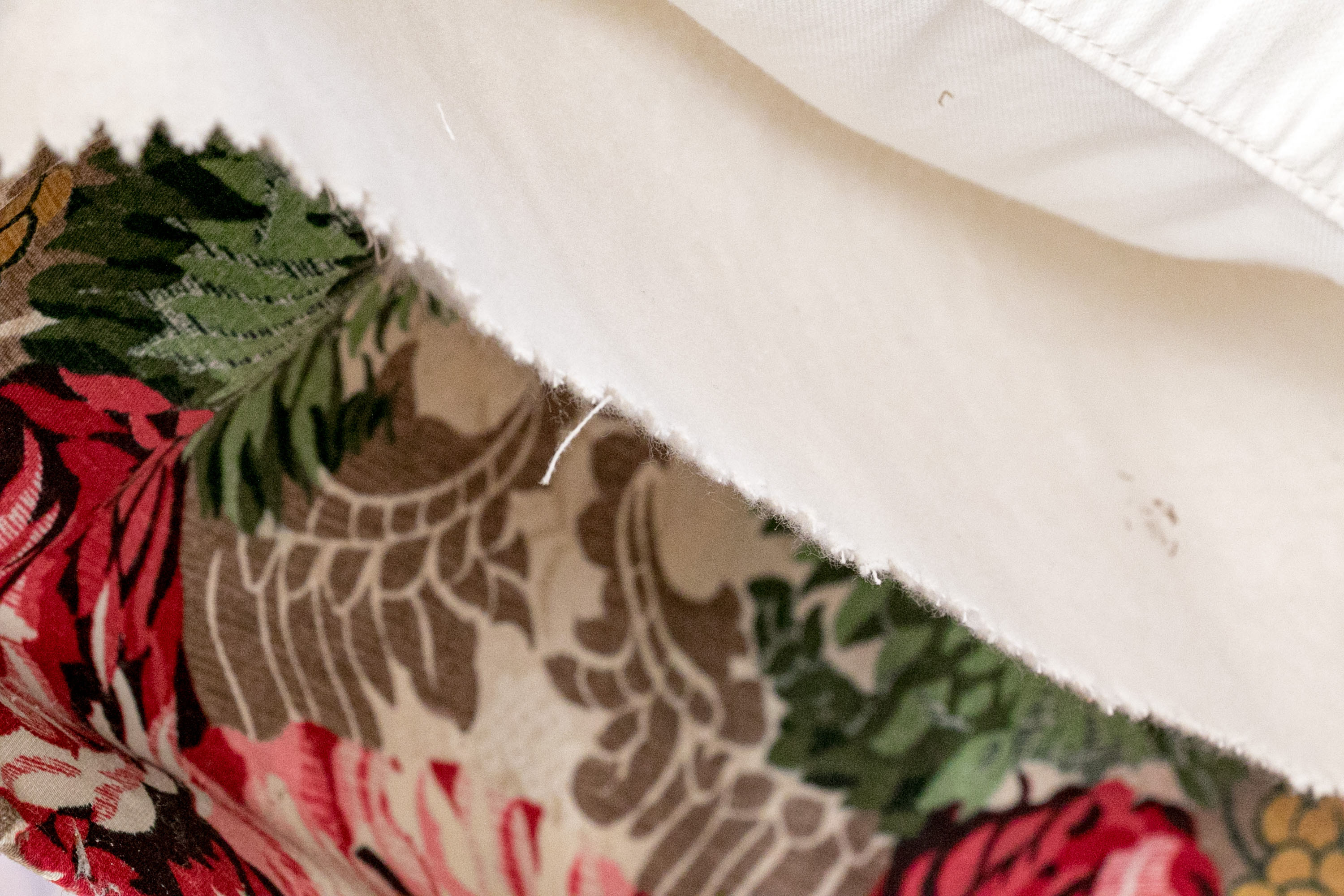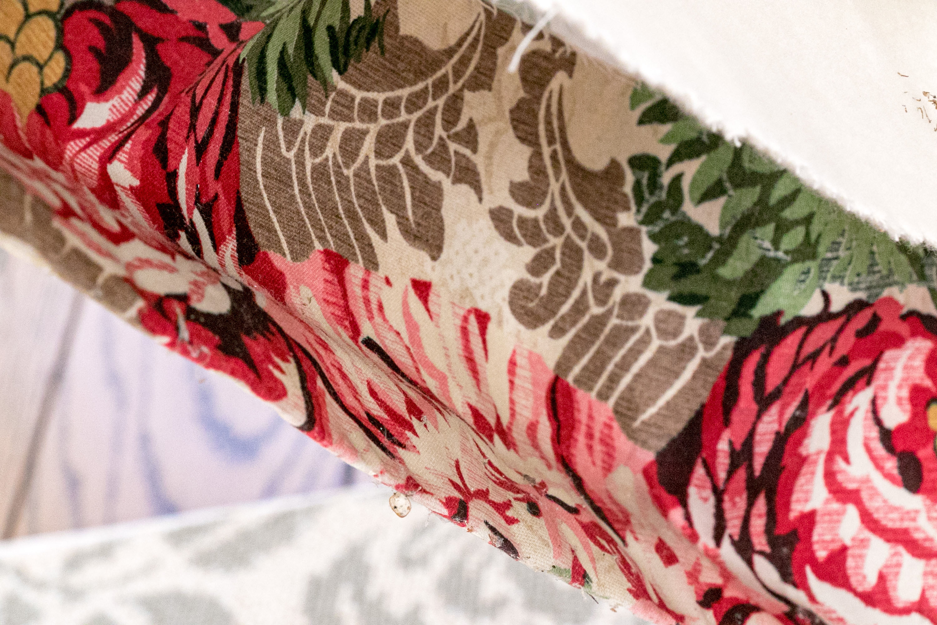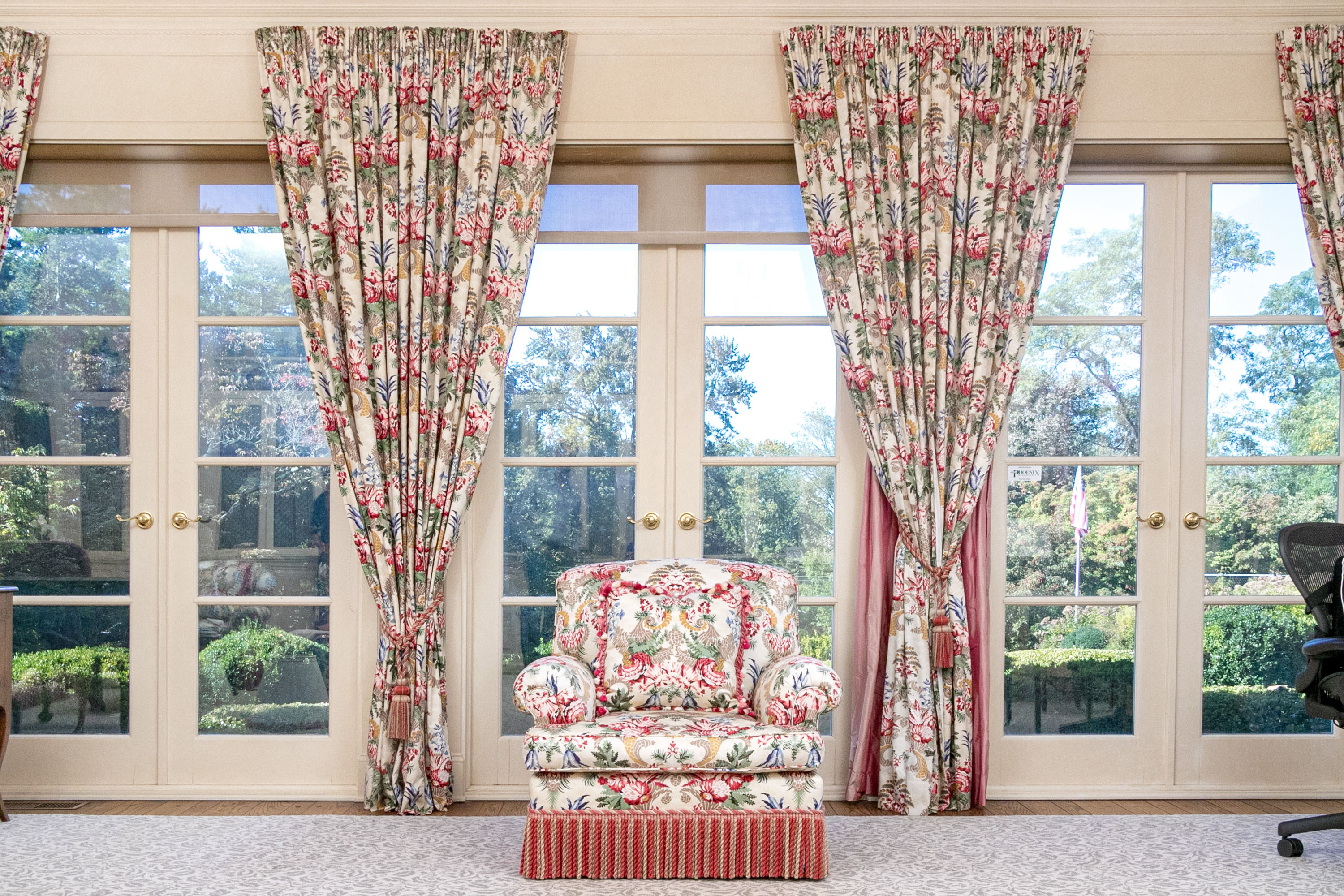 A fantastic collection of luxurious custom curtains and liners in gorgeous chintzy fabric decorated by large floral sprays in red, blue, and yellow with lush green foliage against cream and yellow striped backgrounds. Each with white and green lattice liners n the reverse.