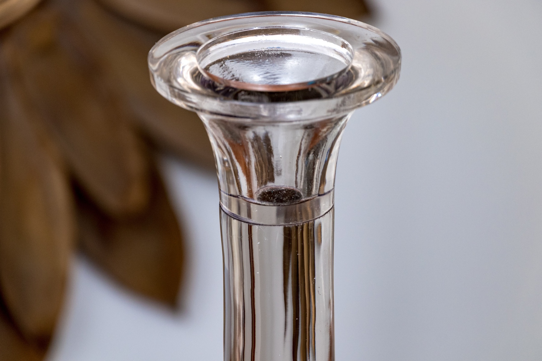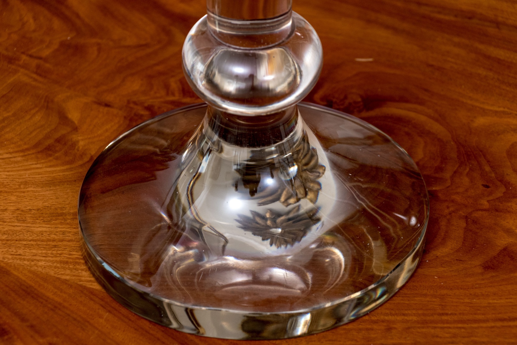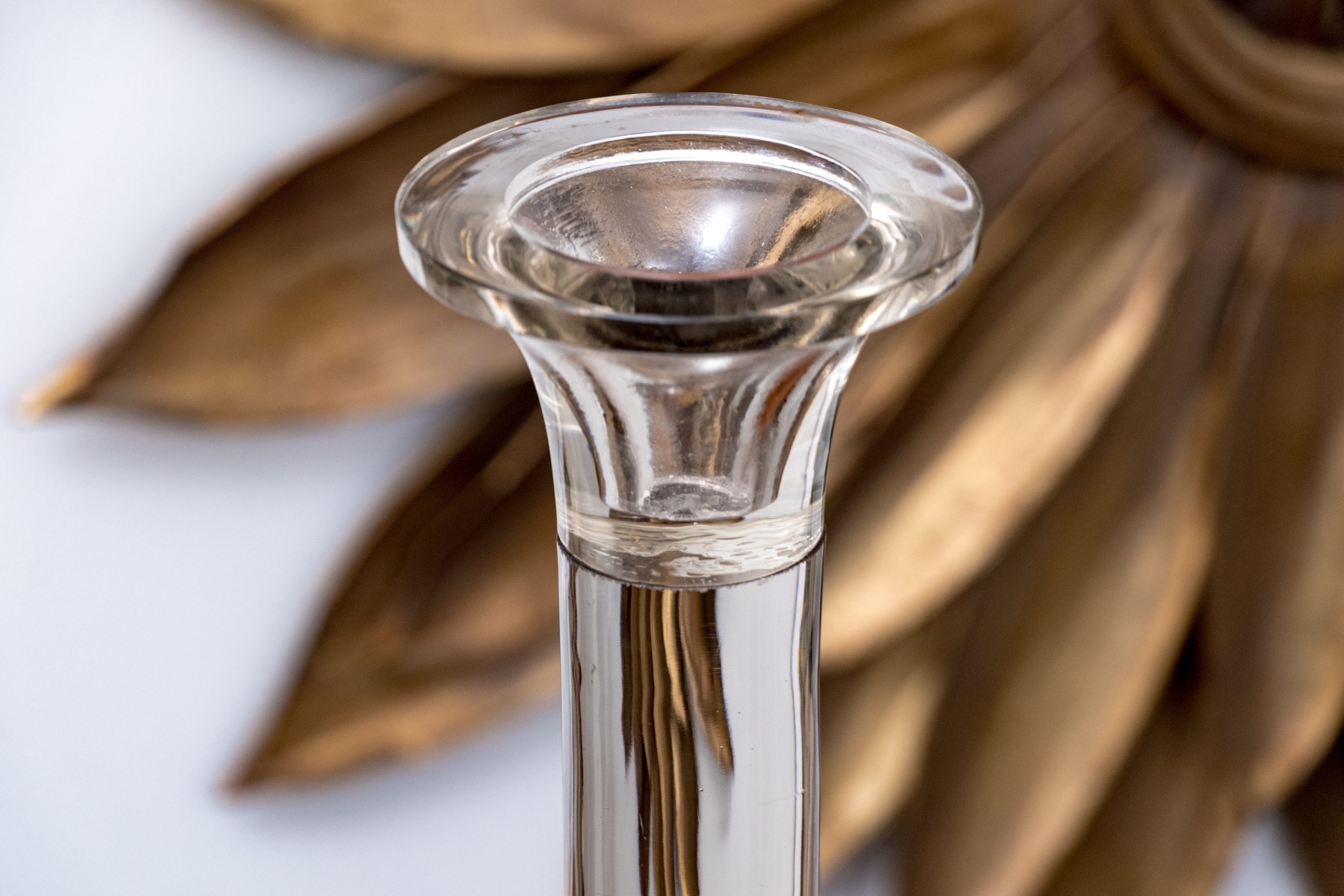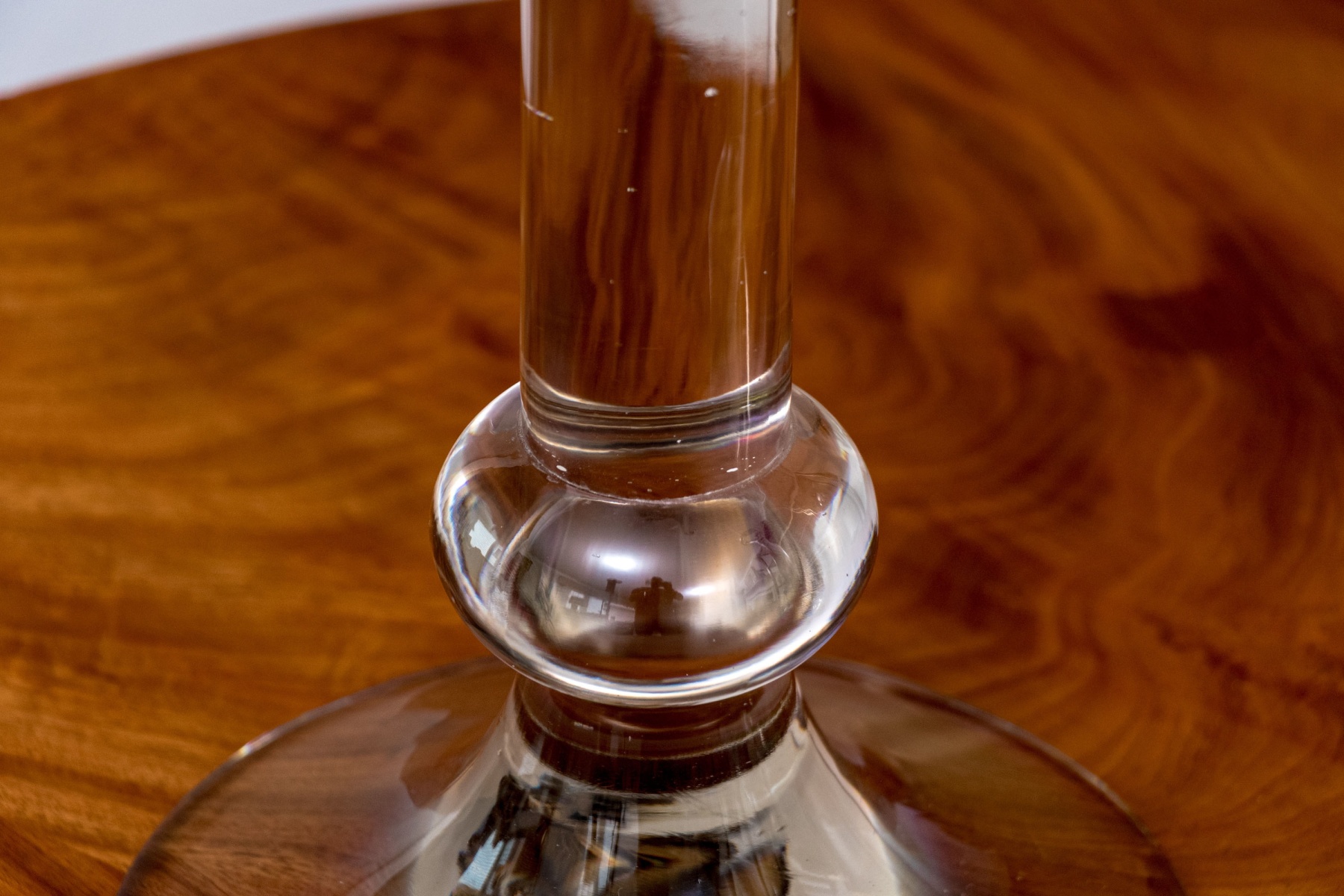 A large and impactful pair of glass candlesticks showcasing sleek, gently flared rims and concial sconces leading down straight shafts to bun knops over tapering hips finishing with circular feet that catch the light beautifully.