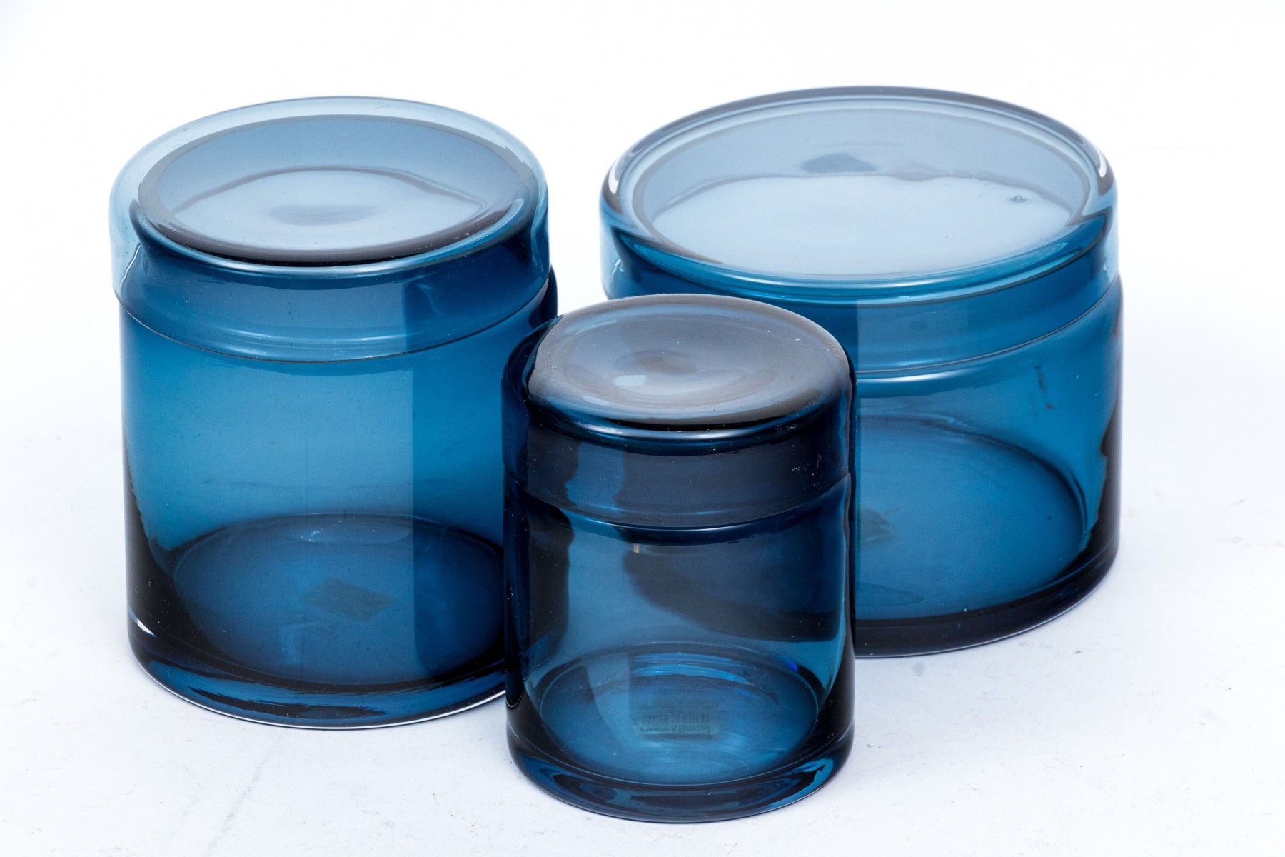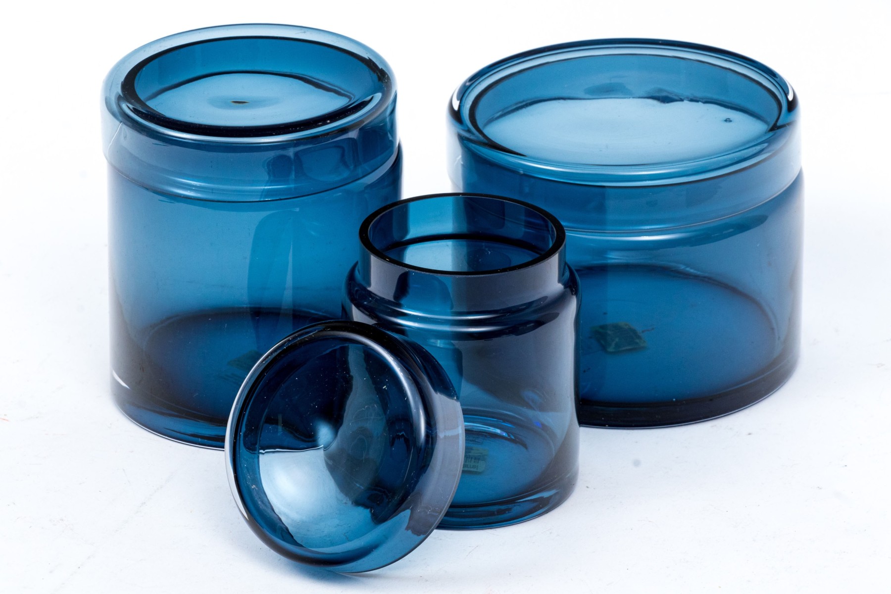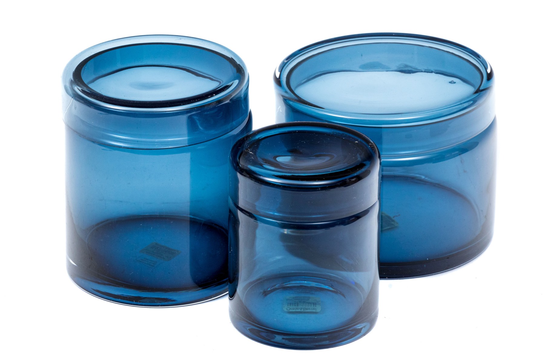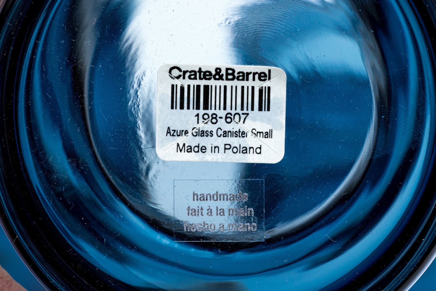 A gorgeous trio of Crate & Barrel Azure glass lidded canisters with sleek cylindrical forms, gently rounded on the edges and adding a vibrant pop of sophisticated blue color.