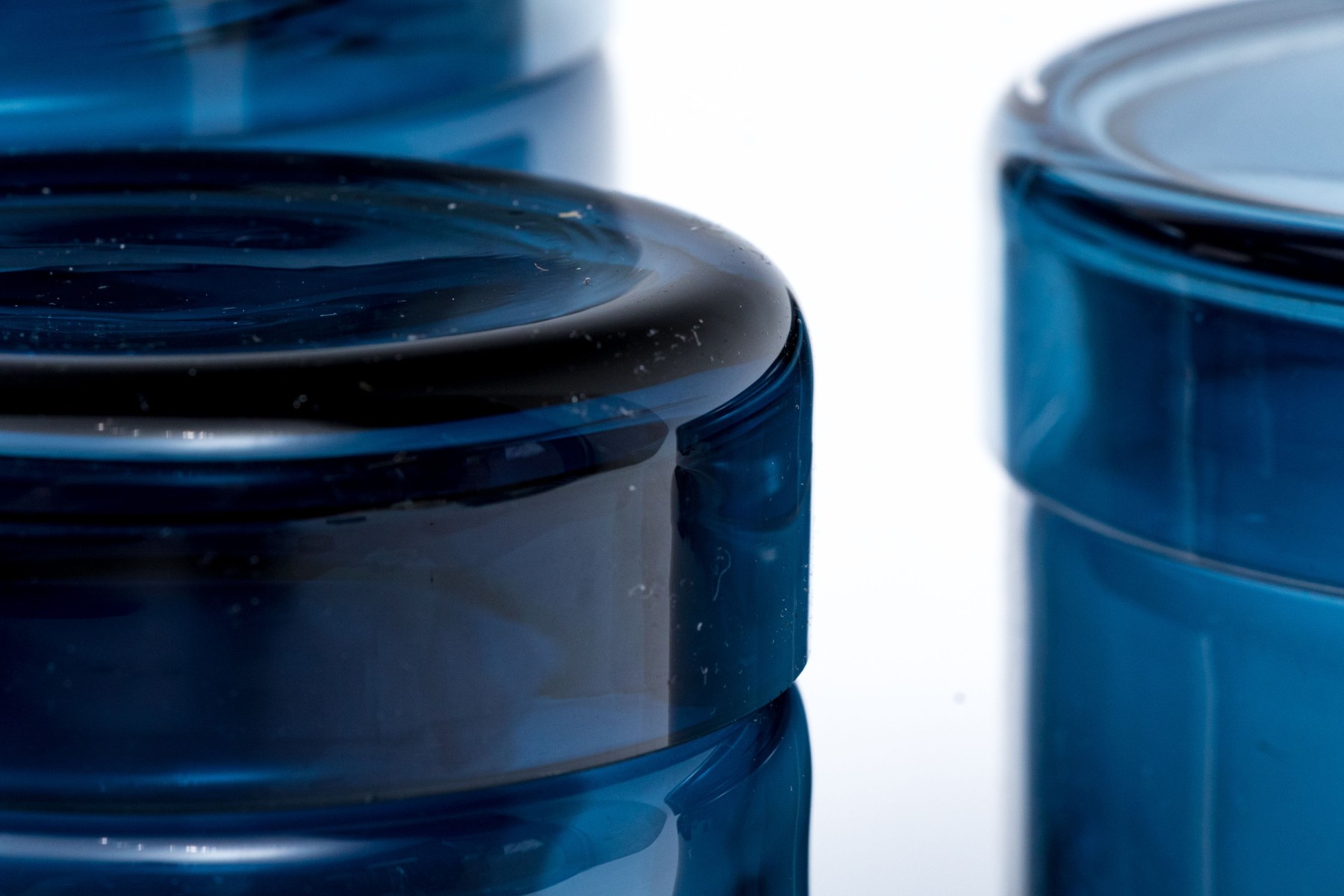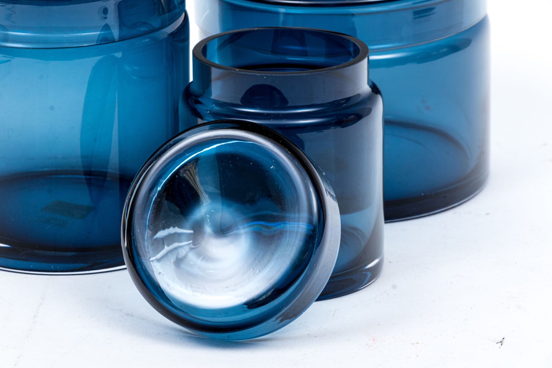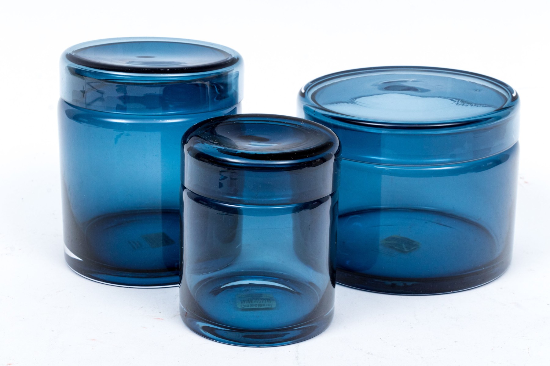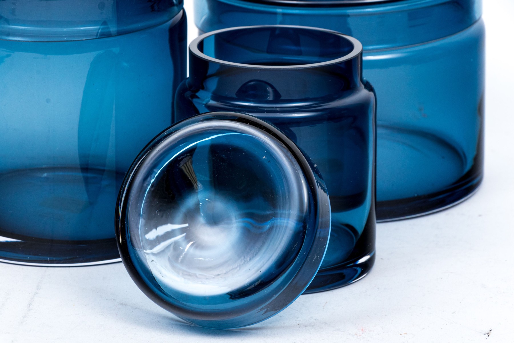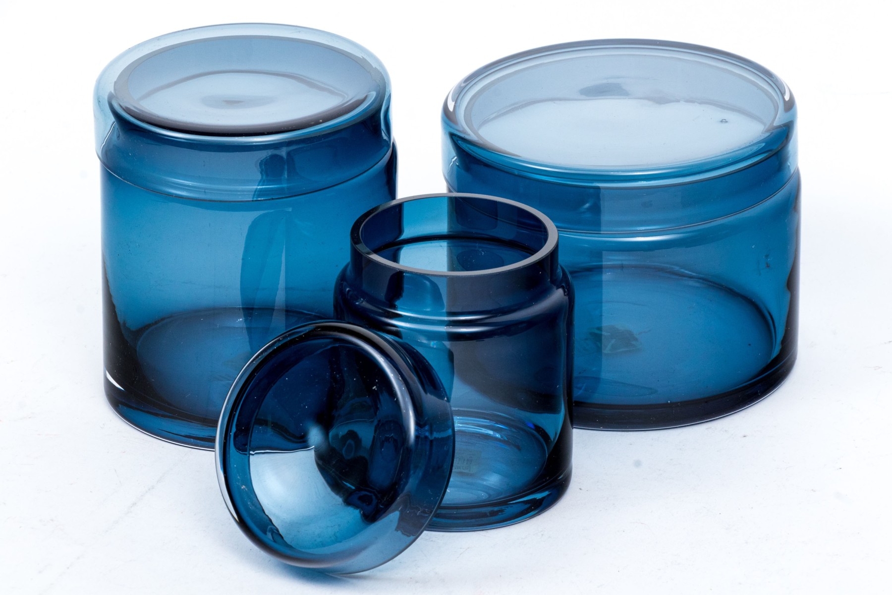 A gorgeous trio of Crate & Barrel Azure glass lidded canisters with sleek cylindrical forms, gently rounded on the edges and adding a vibrant pop of sophisticated blue color.