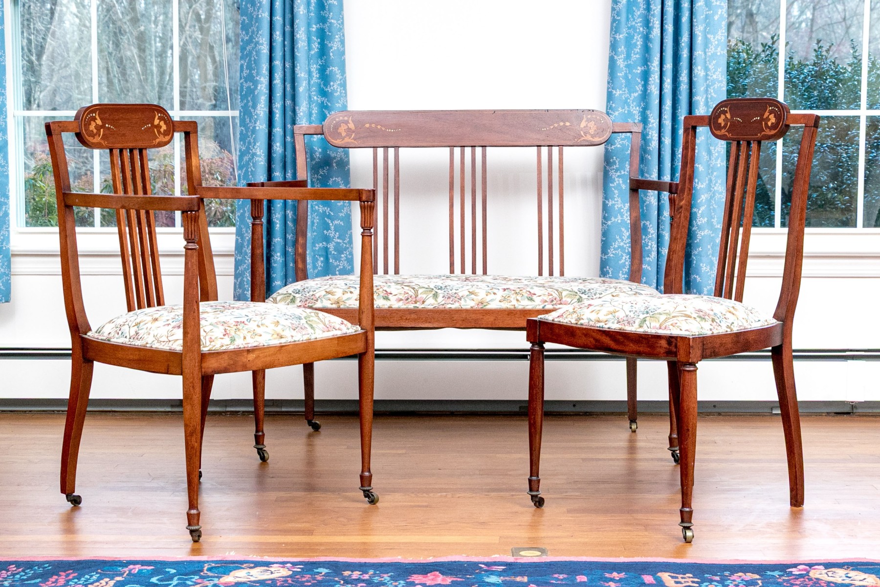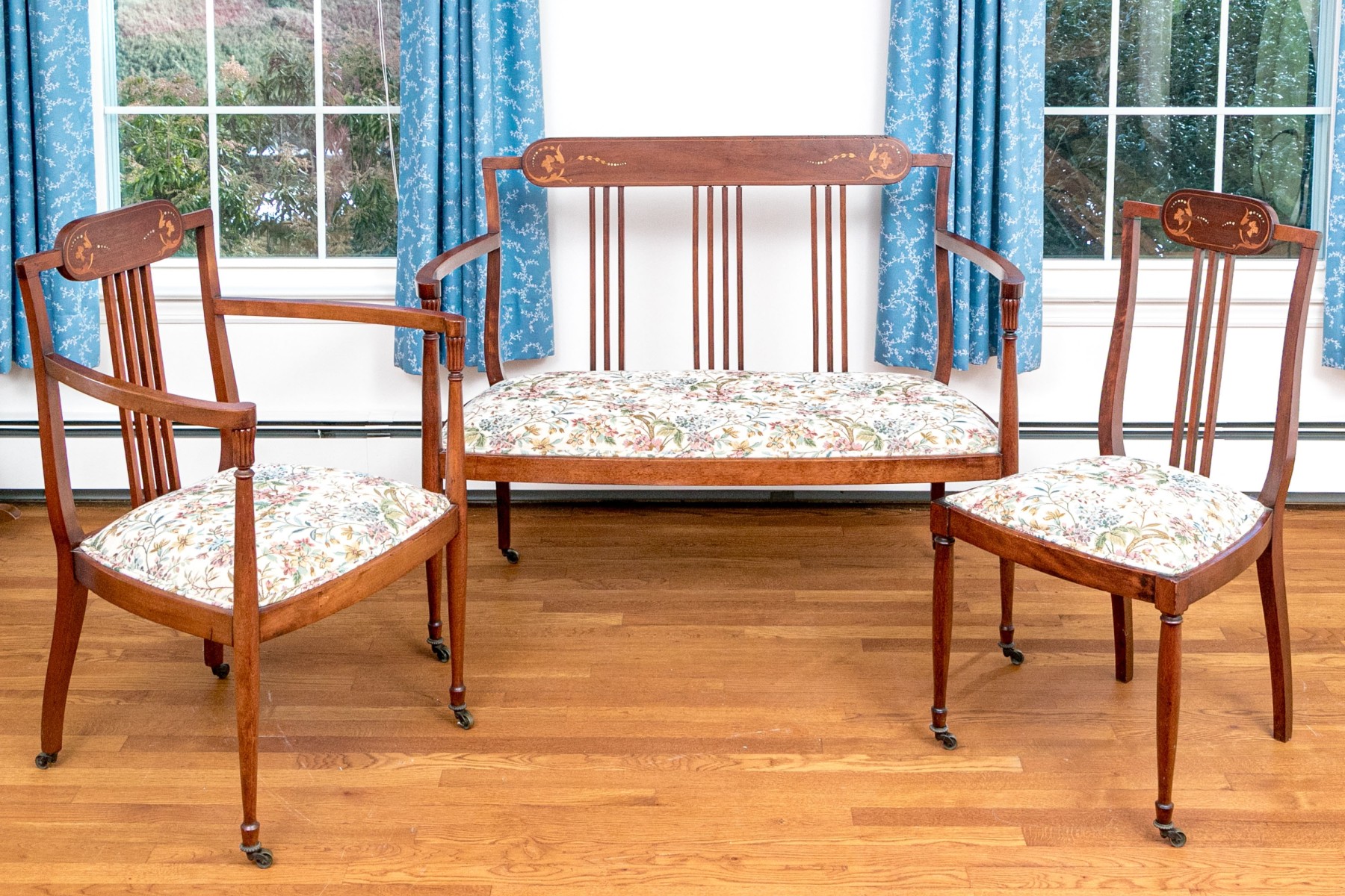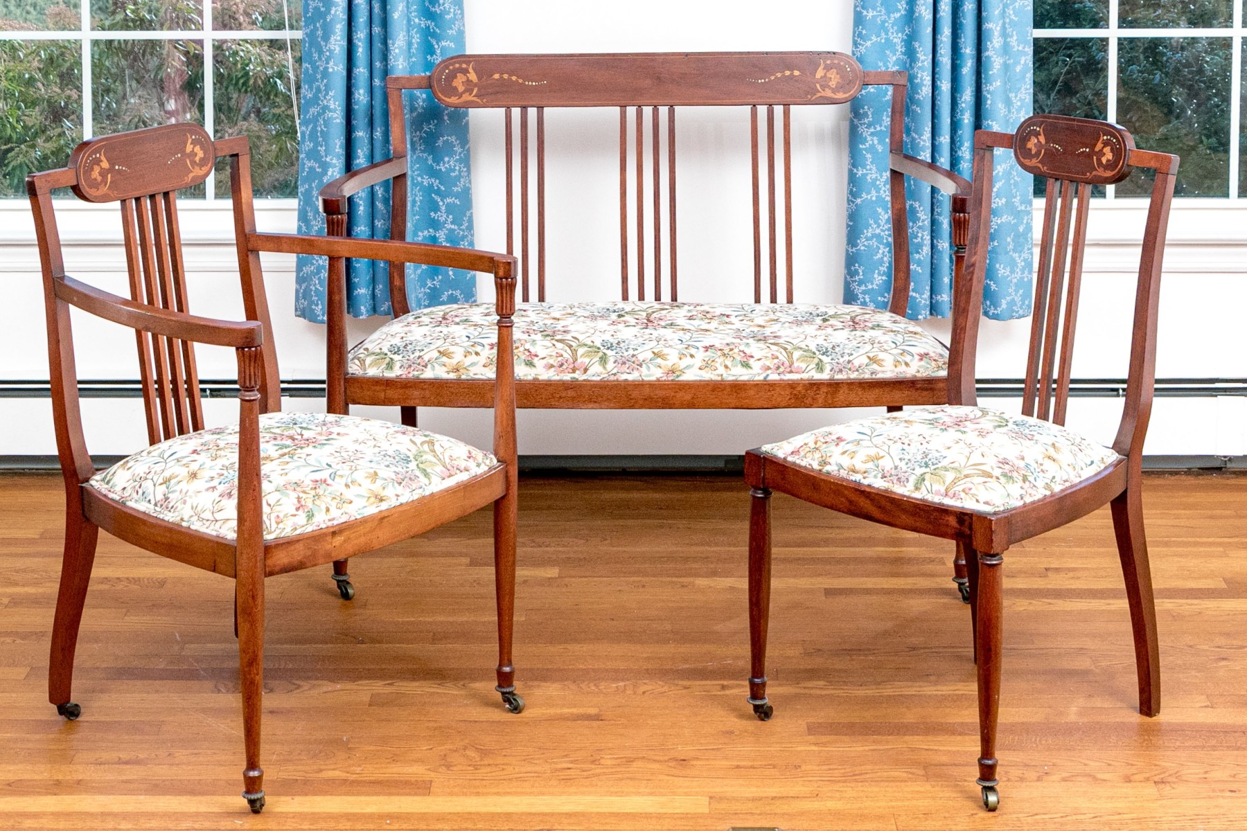 Comprised of a settee, side chair and armchair. All on front cylindrical, tapered legs with casters for mobility. Each with upholstered seat cushions and spindle back splats with oval, marquetry inlaid reserves to the center of the top rails.