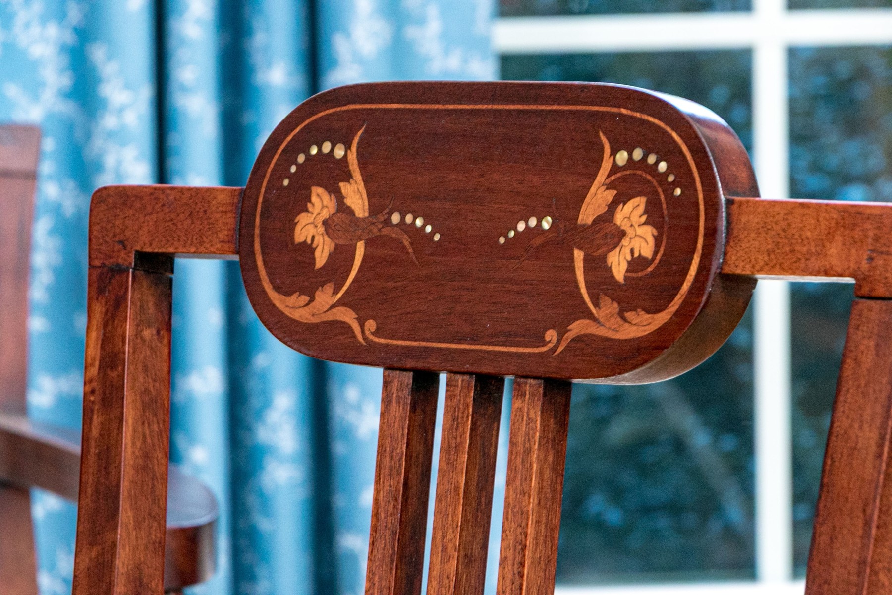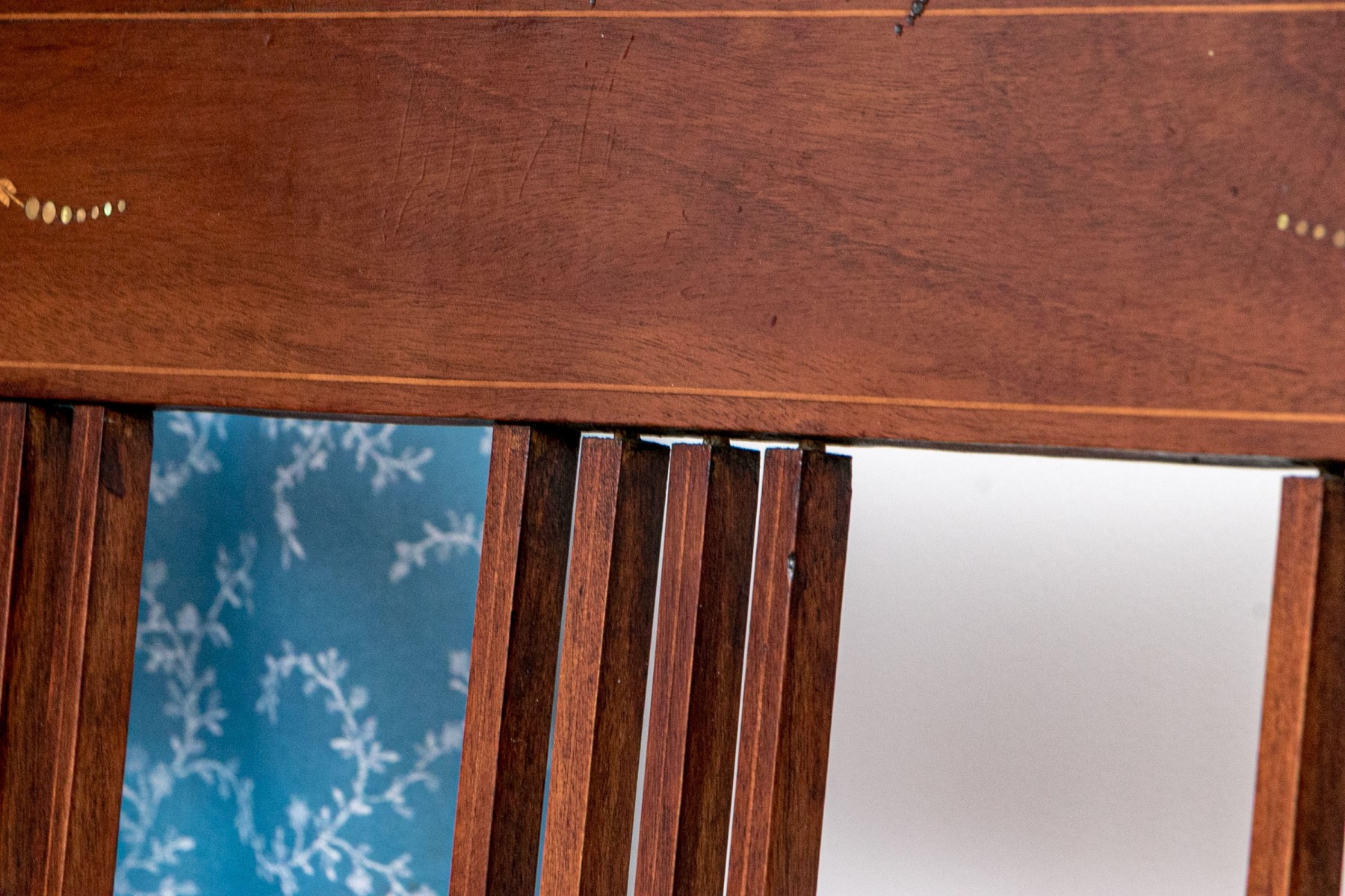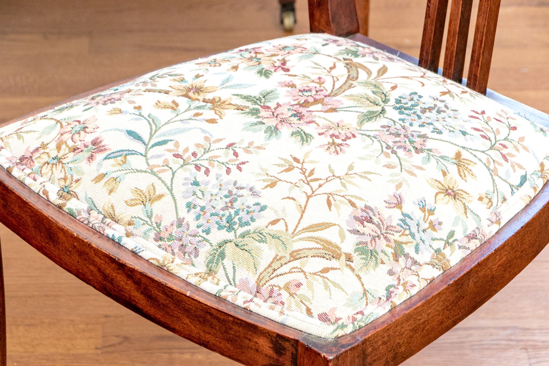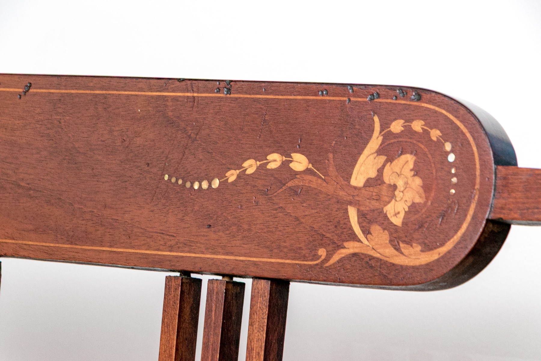 Comprised of a settee, side chair and armchair. All on front cylindrical, tapered legs with casters for mobility. Each with upholstered seat cushions and spindle back splats with oval, marquetry inlaid reserves to the center of the top rails.