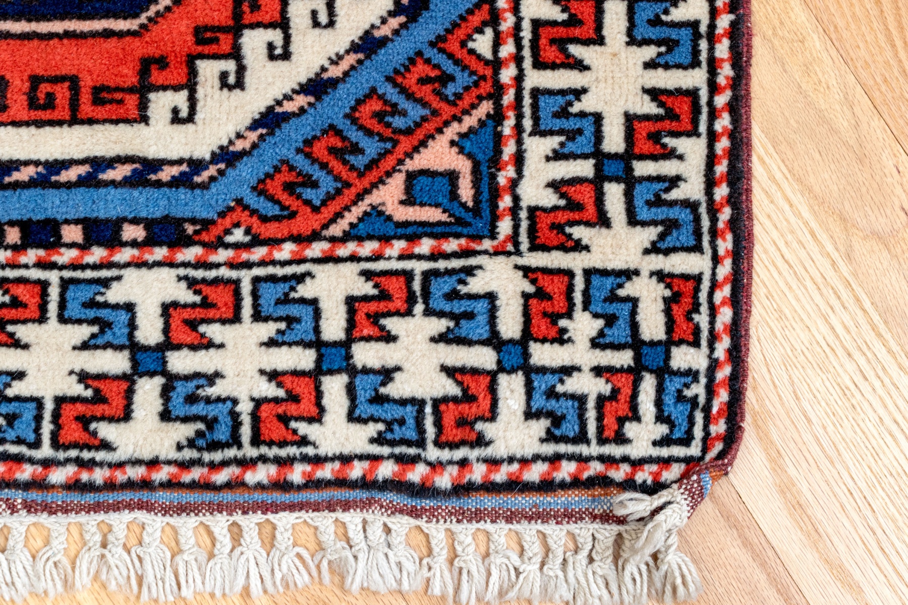 A wonderful Sumer Hall hand-knotted wool Bokhara style accent rug in red, off white and blue and peach hues with central reserve having three octagonal reserves with decorative border guard on light hued ground. Fringe on two ends. Labeled underneath.