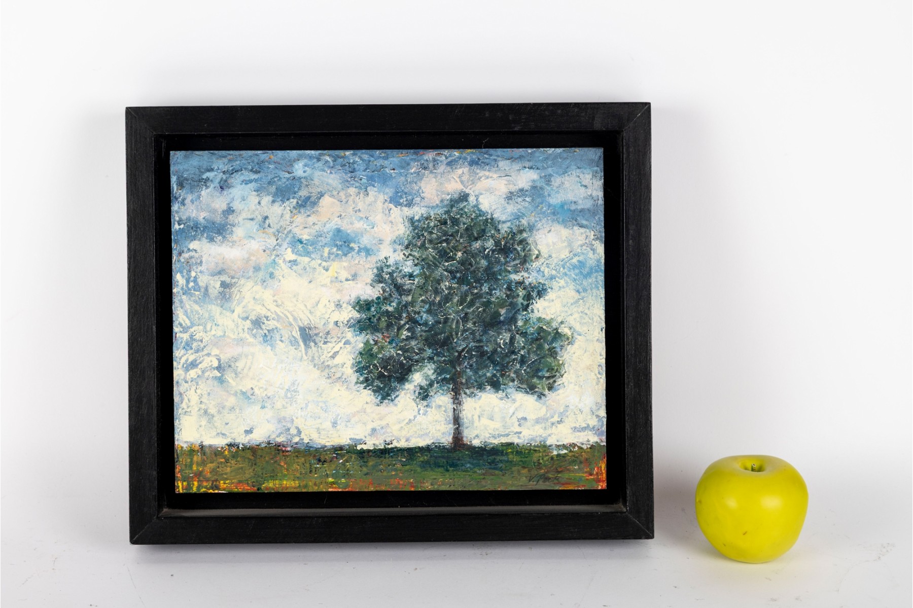 Unsigned oil on board painting executed in a palette knife technique, featuring a richly textured composition titled "Summer Tree". Presented in a simple black shadowbox frame.