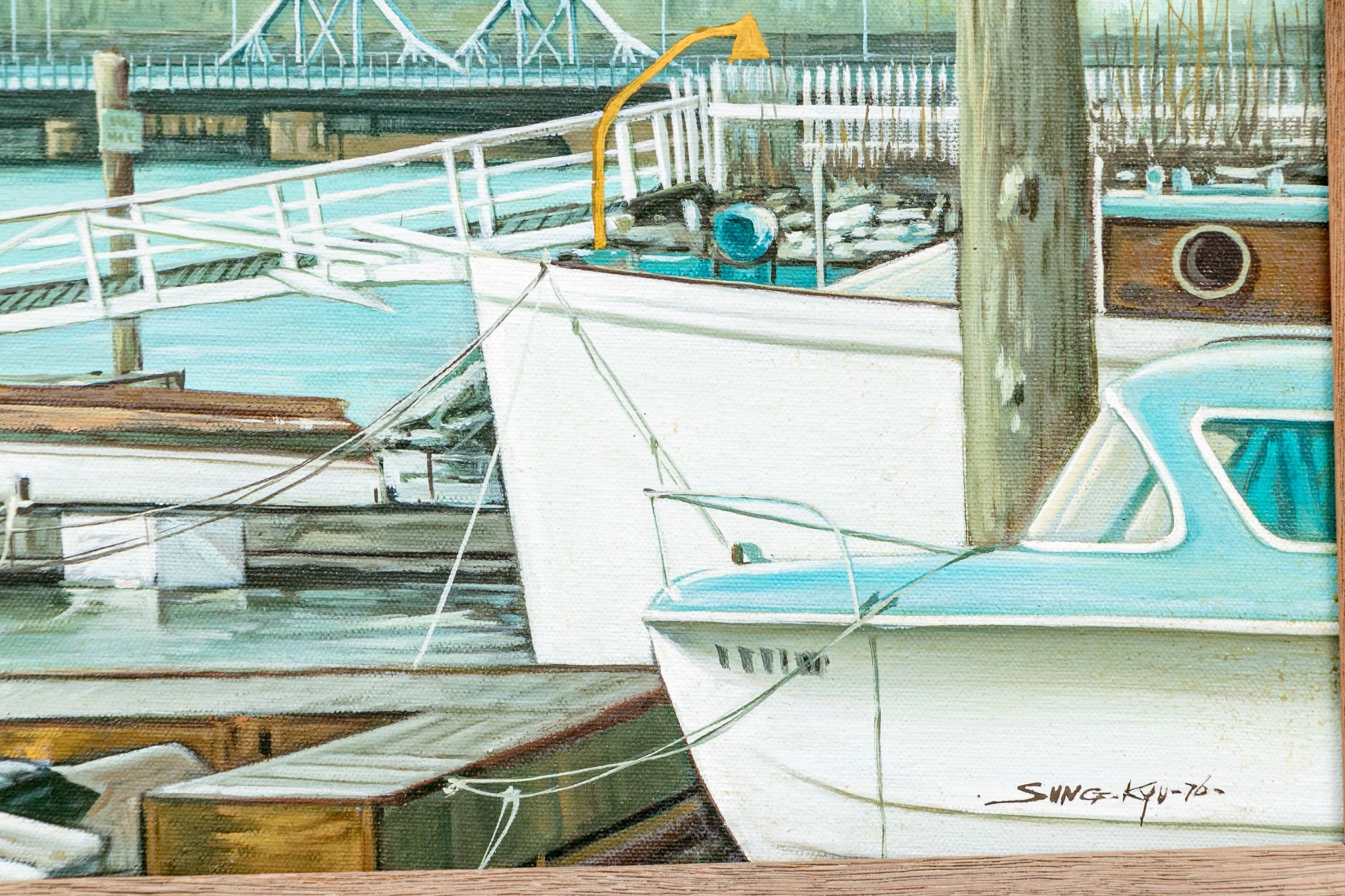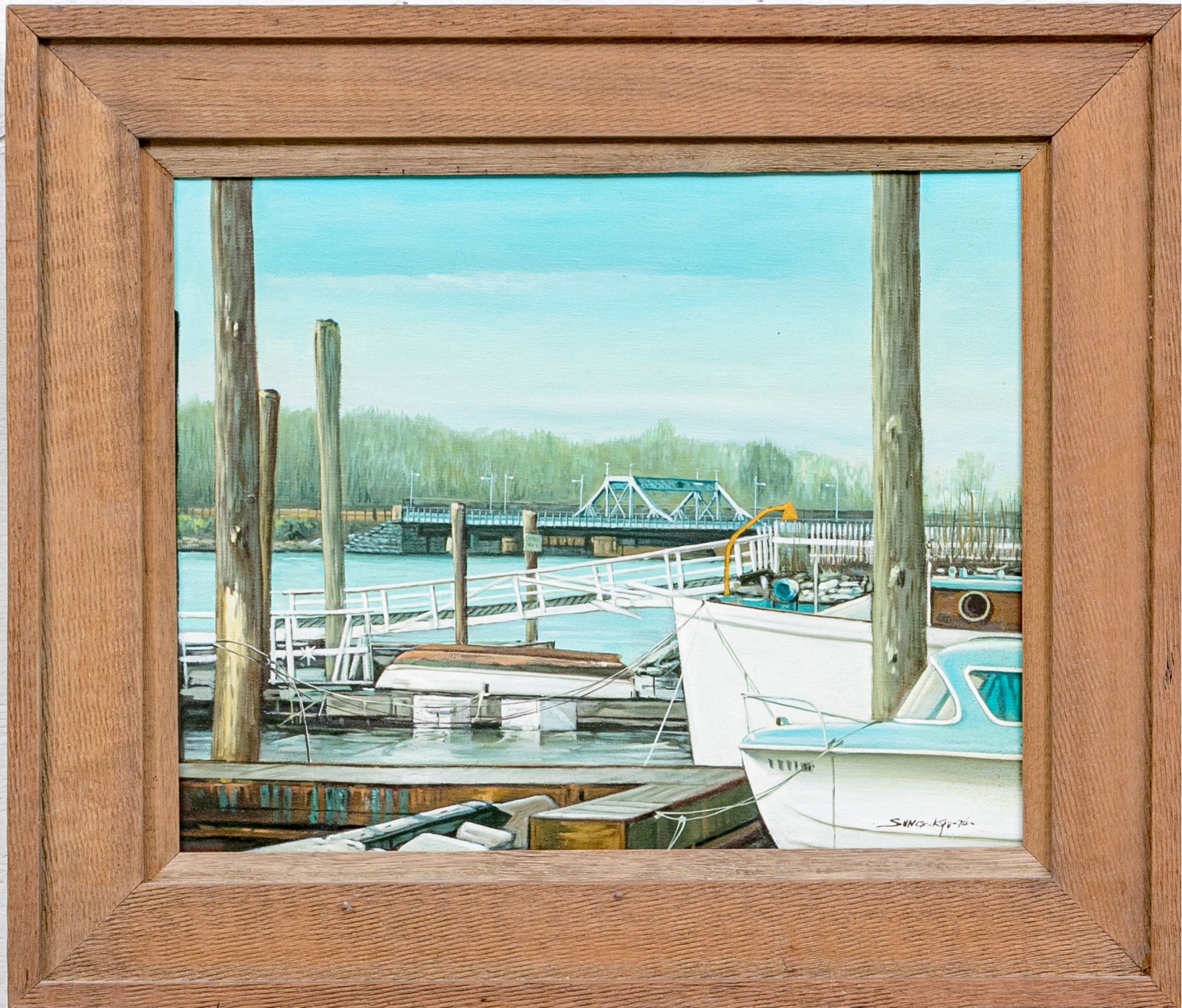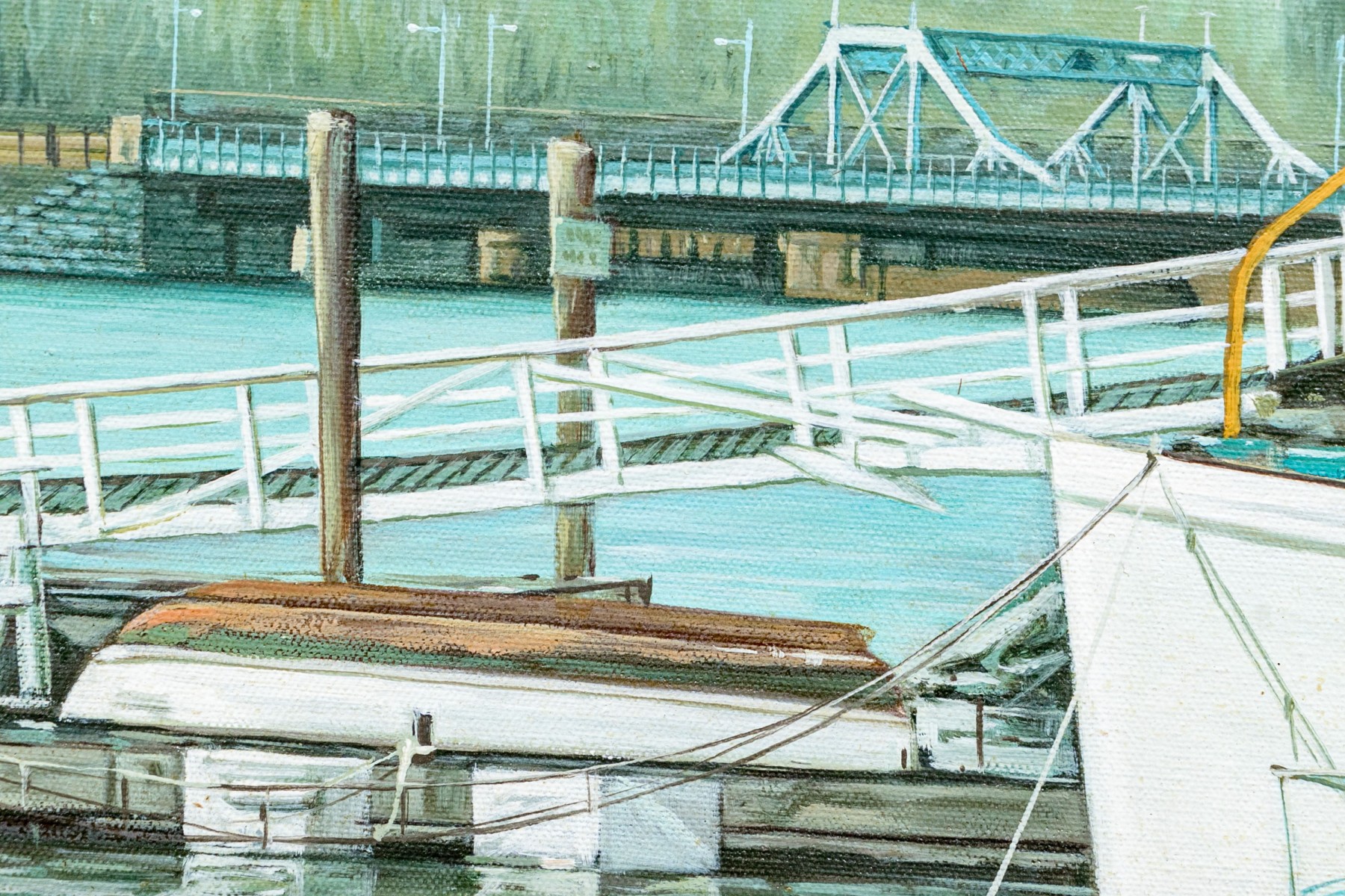 Signed and dated '76 lower right, label on verso. A realist style view of the boat yard near the bridge to the city under an aqua sky. Presented in a wood frame.