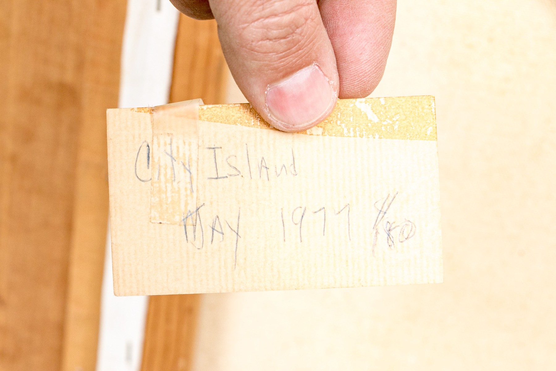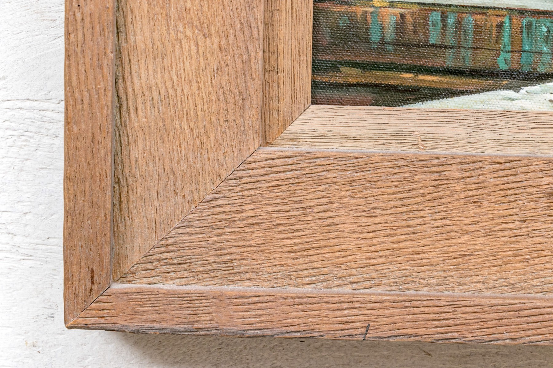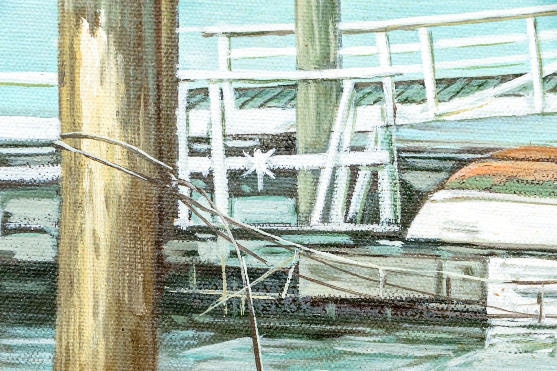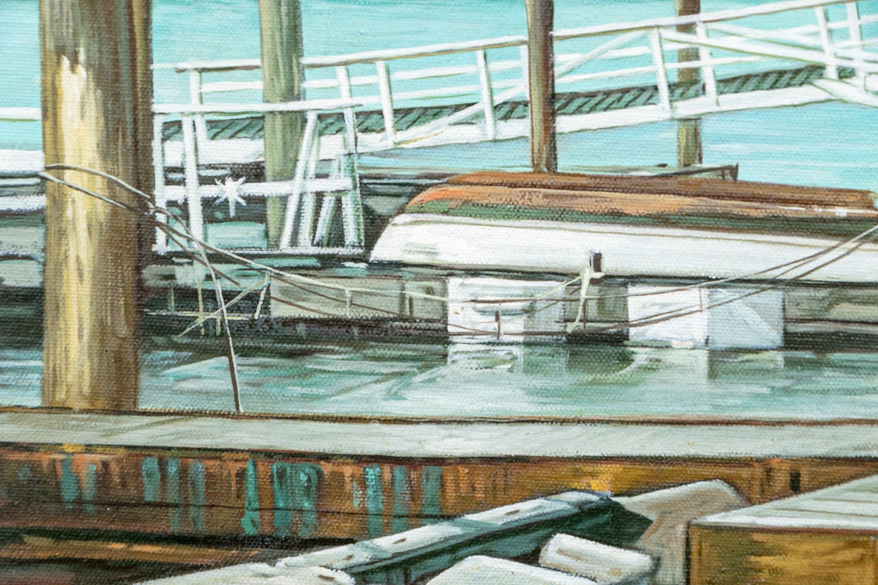 Signed and dated '76 lower right, label on verso. A realist style view of the boat yard near the bridge to the city under an aqua sky. Presented in a wood frame.