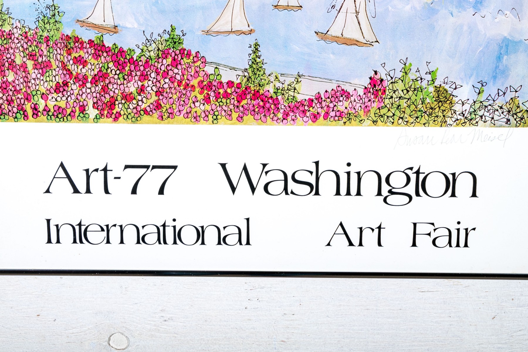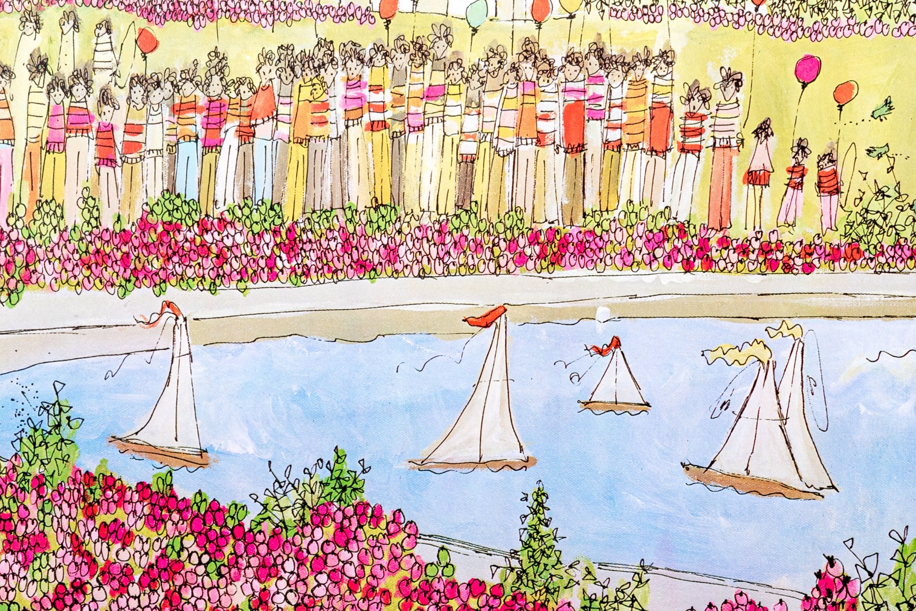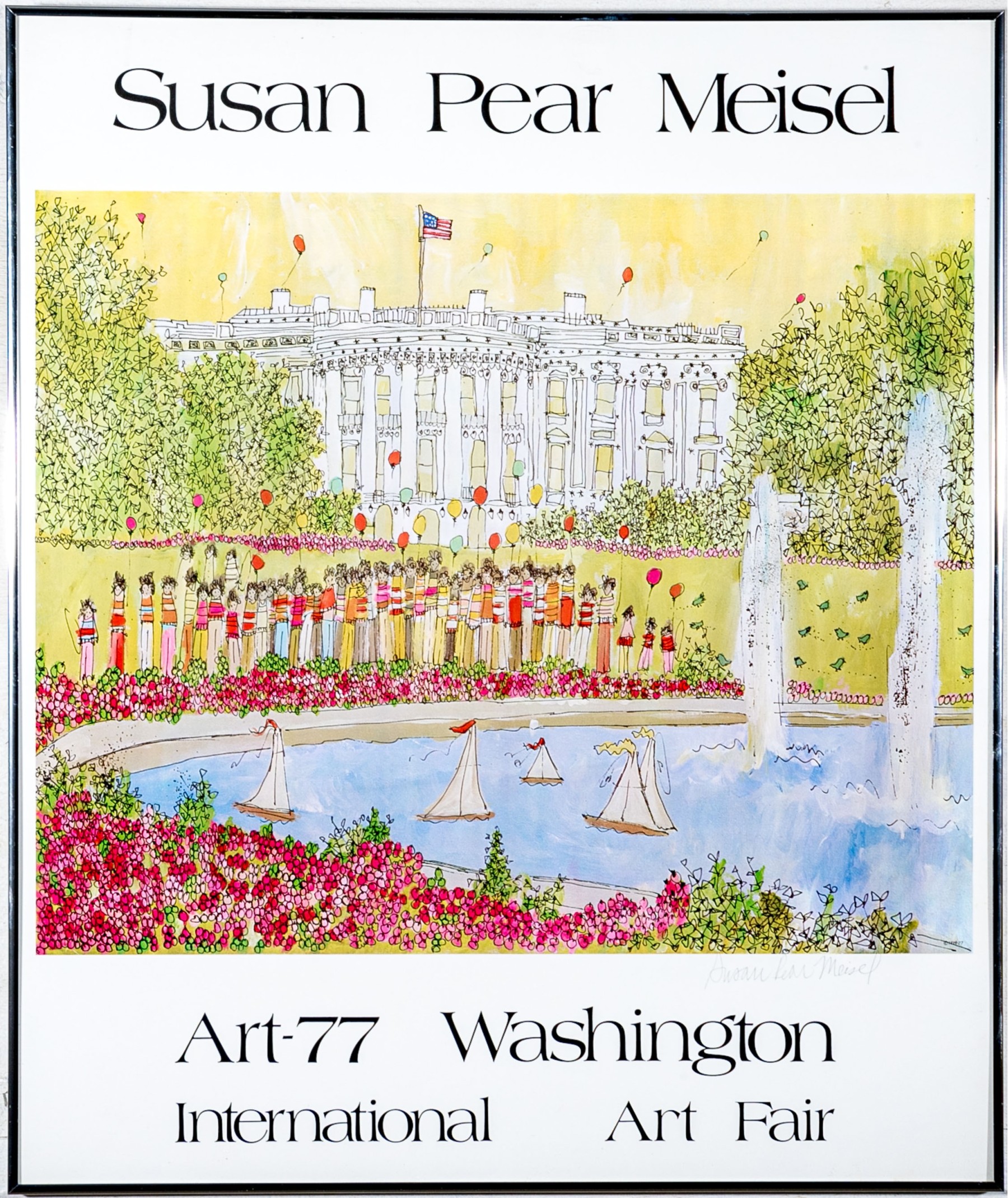 Susan Pear Meisel (American, b.1947). A fun 70's Mod composition with the White House shown in the background with figures with balloons around the flower framed pool with model sailboats. Presented in a metal frame with glass.