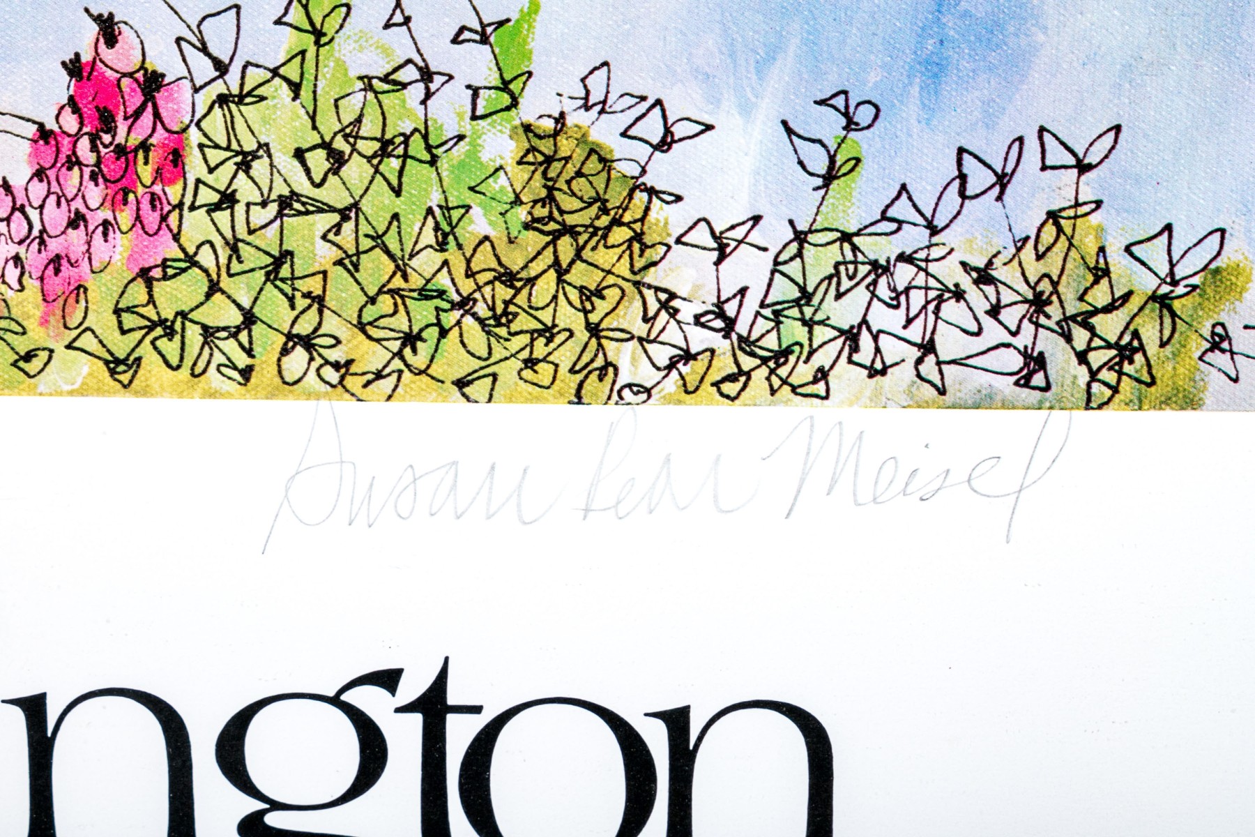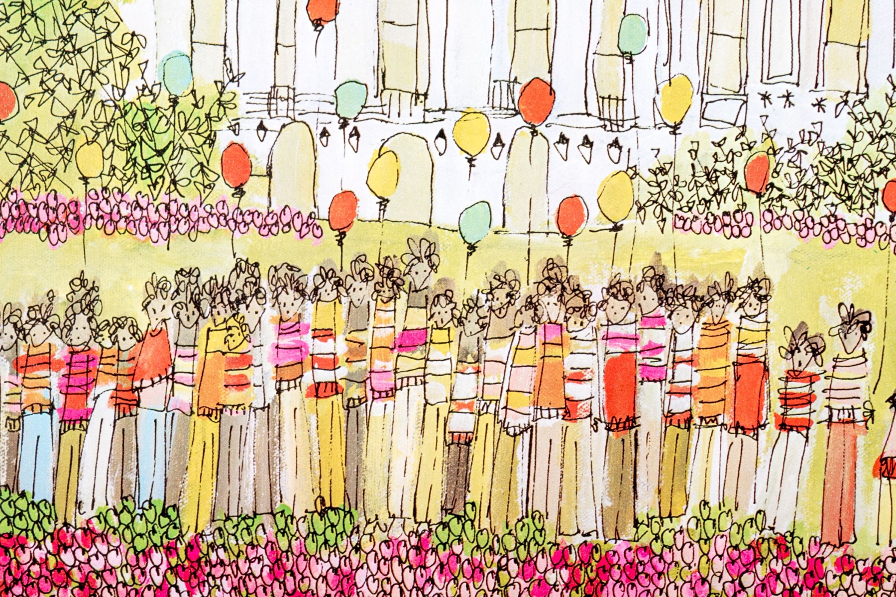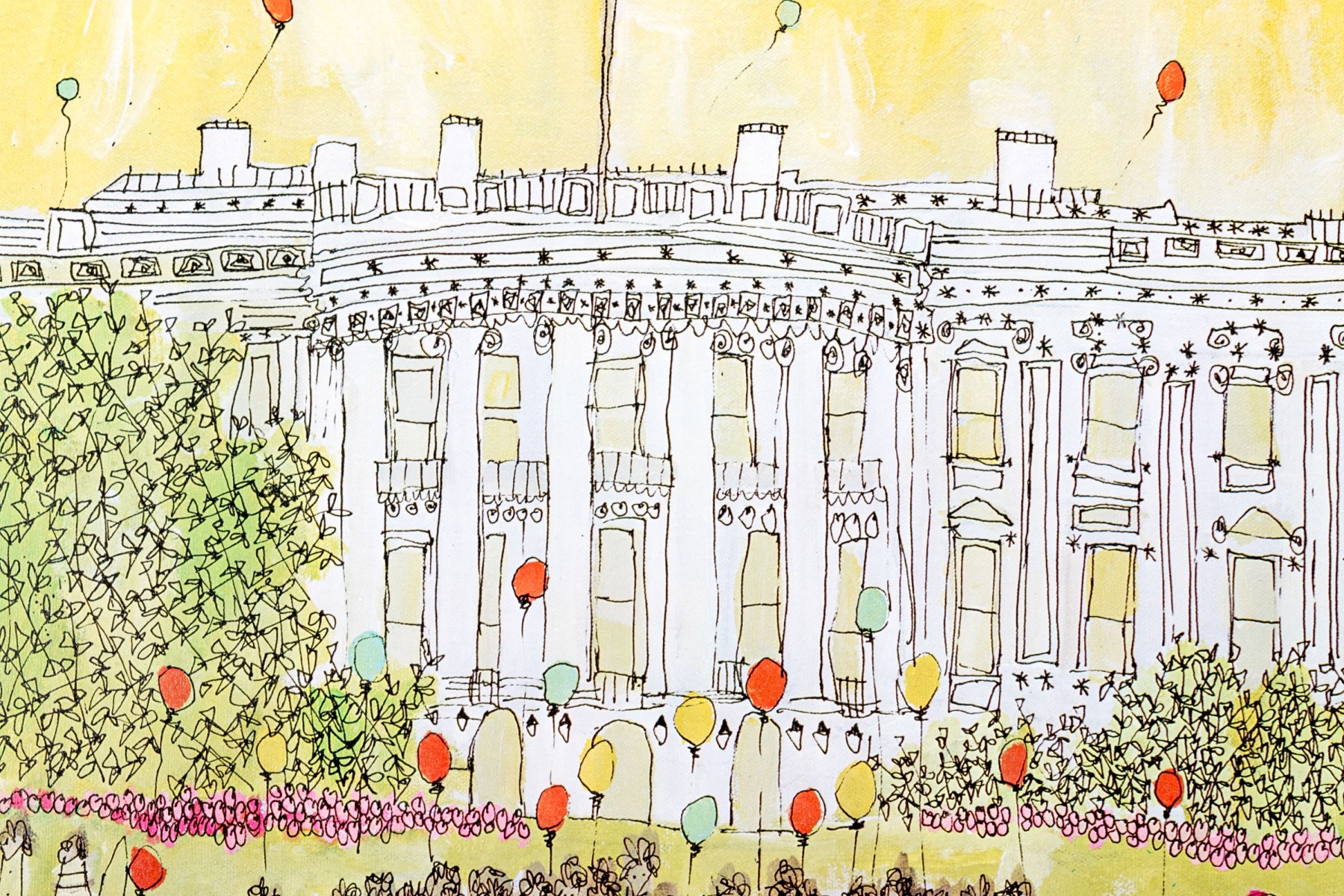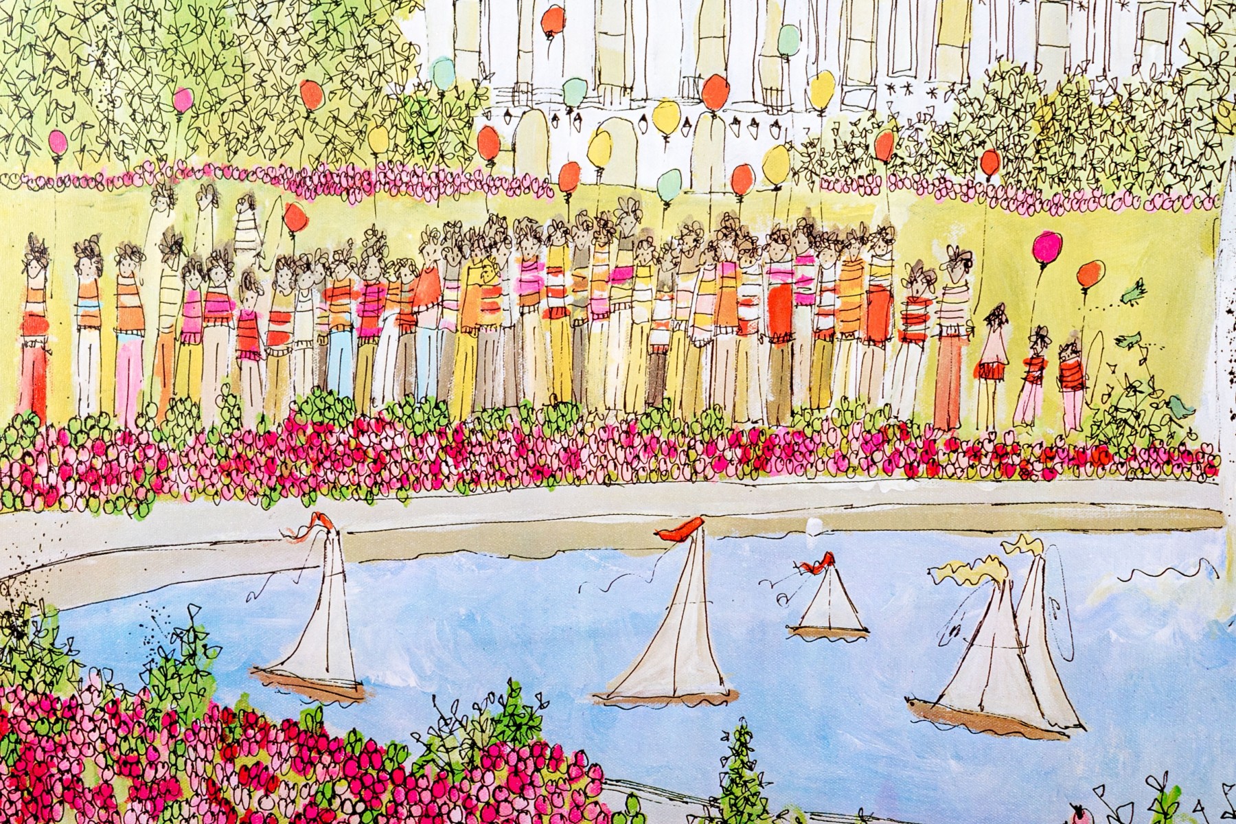 Susan Pear Meisel (American, b.1947). A fun 70's Mod composition with the White House shown in the background with figures with balloons around the flower framed pool with model sailboats. Presented in a metal frame with glass.