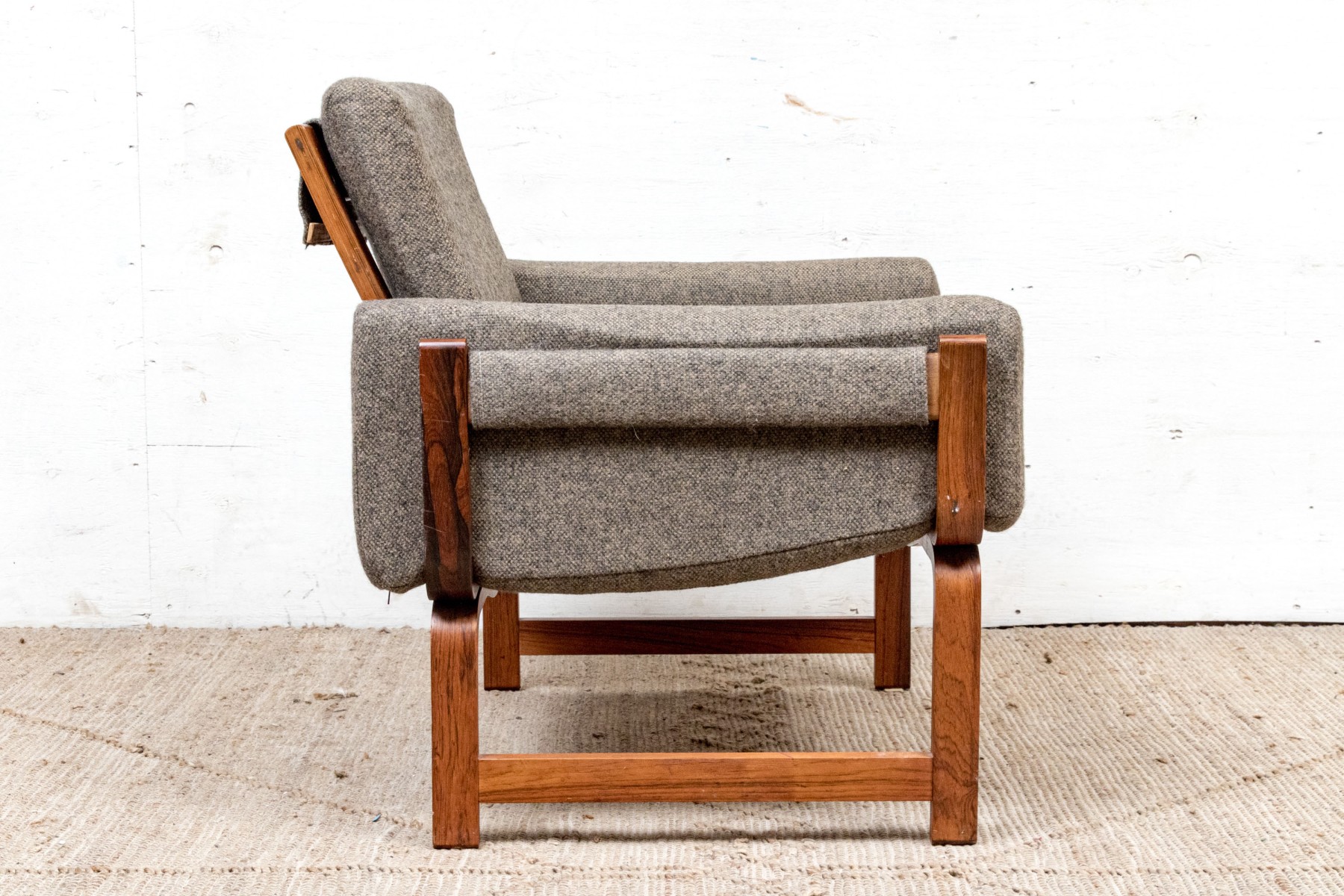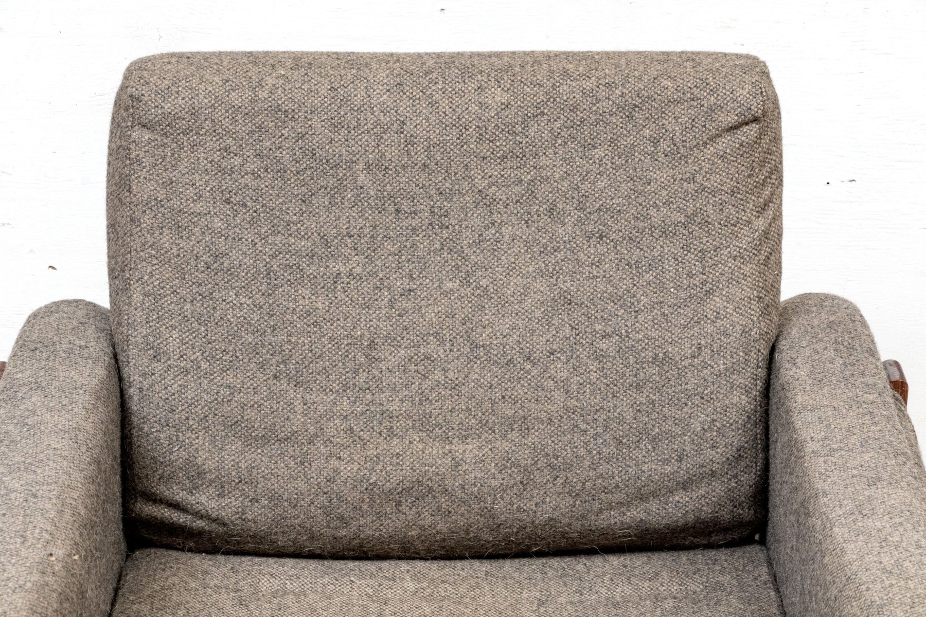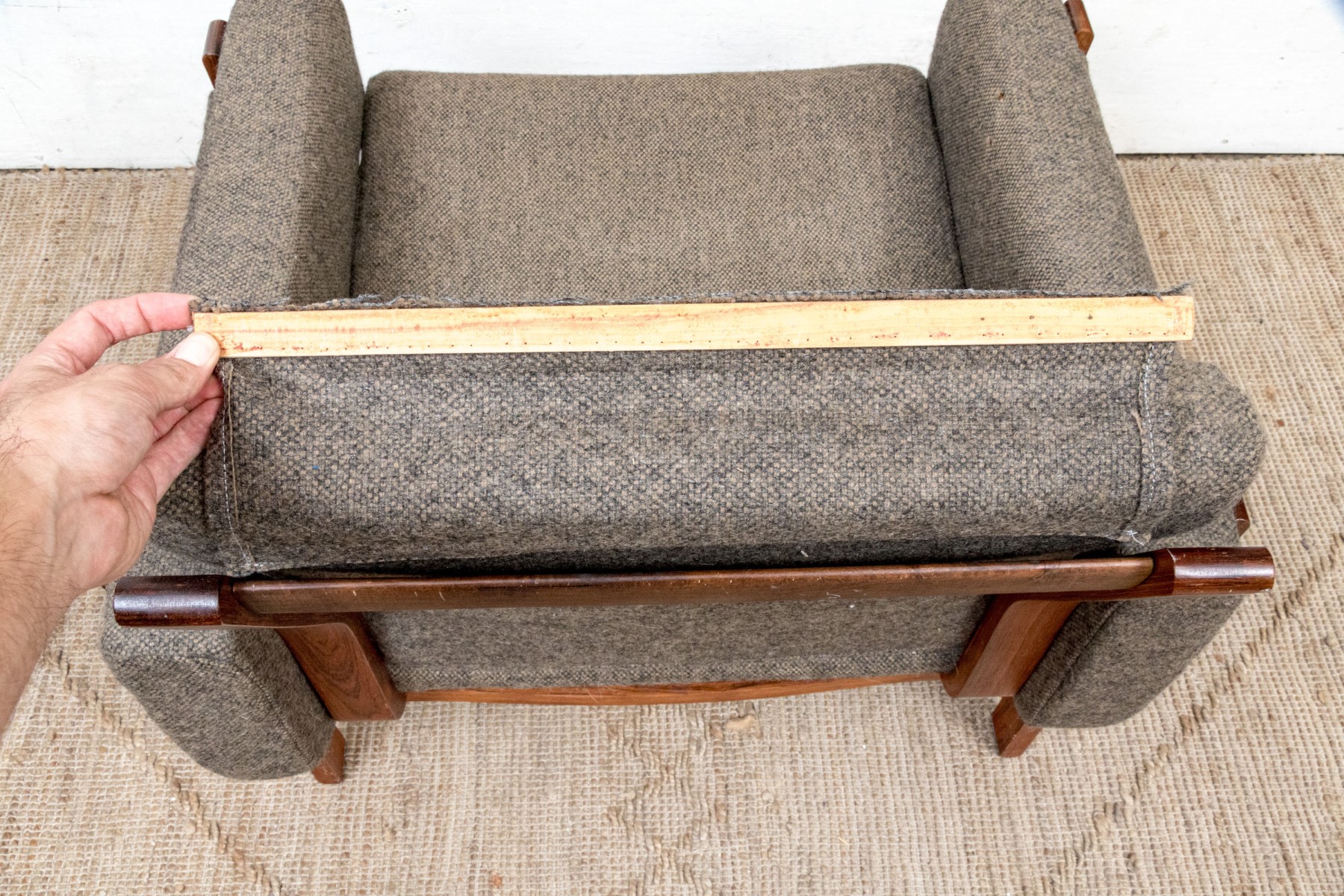 Finely crafted rosewood frame with curvilinear sections for the arms and seat. Upholstered overall in a gray tweed fabric with padded arms. The back and seats slightly sloping.