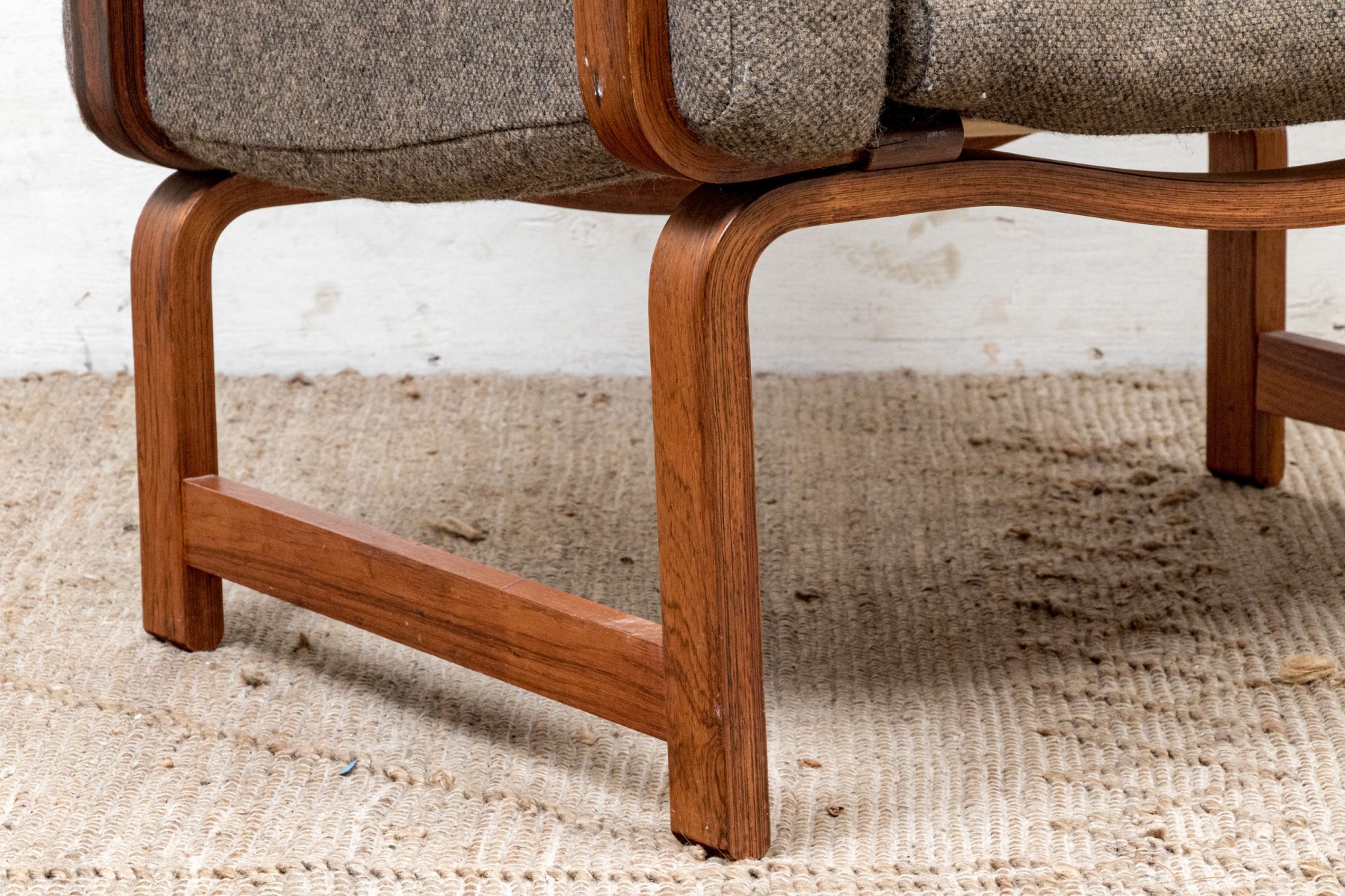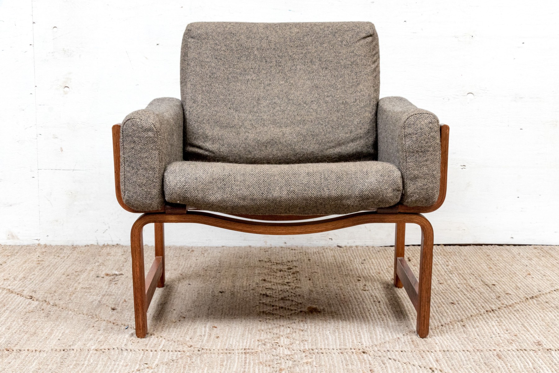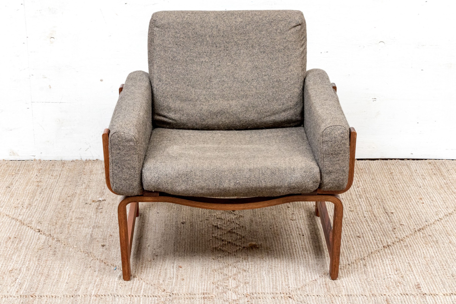 Finely crafted rosewood frame with curvilinear sections for the arms and seat. Upholstered overall in a gray tweed fabric with padded arms. The back and seats slightly sloping.