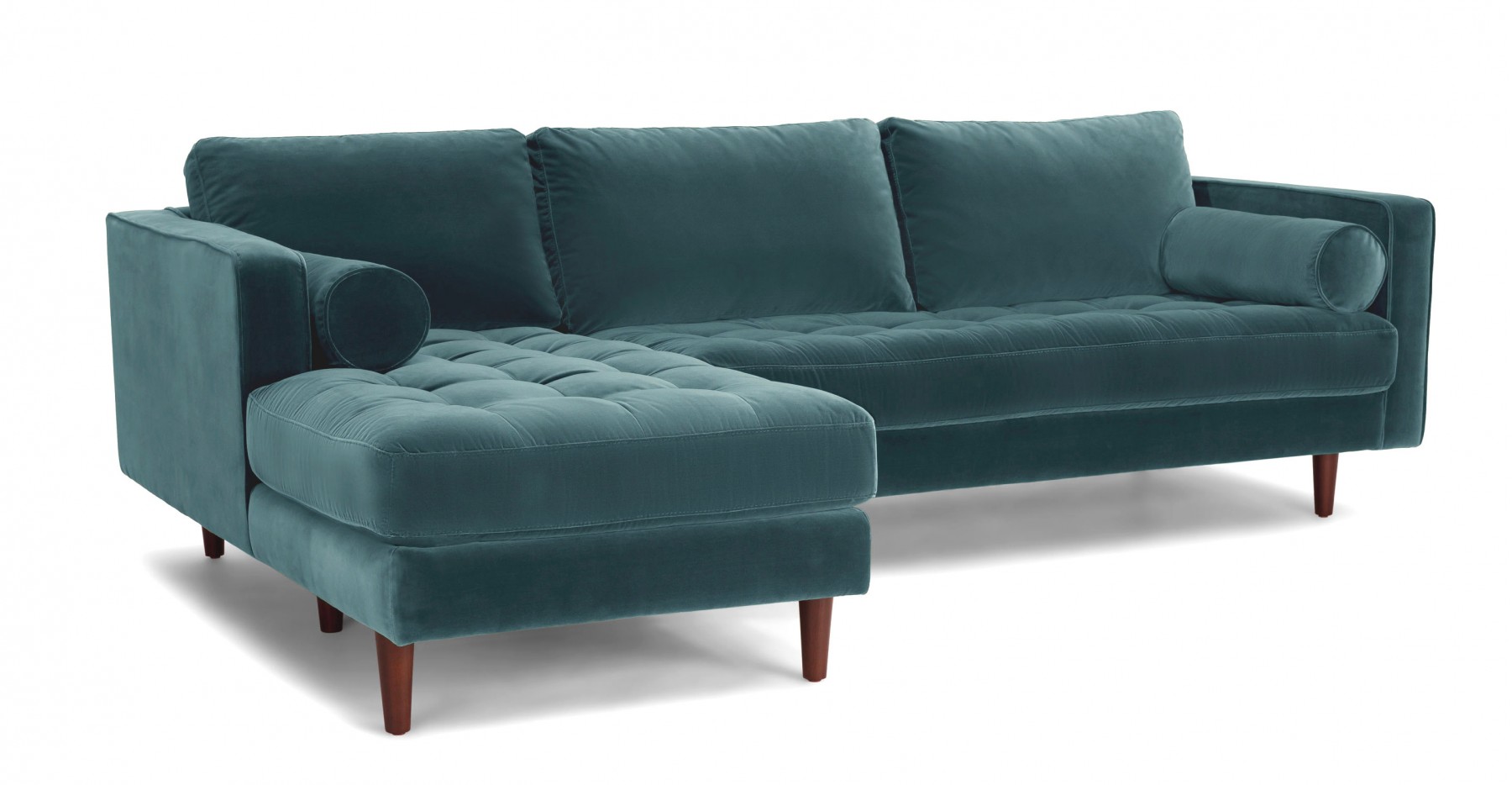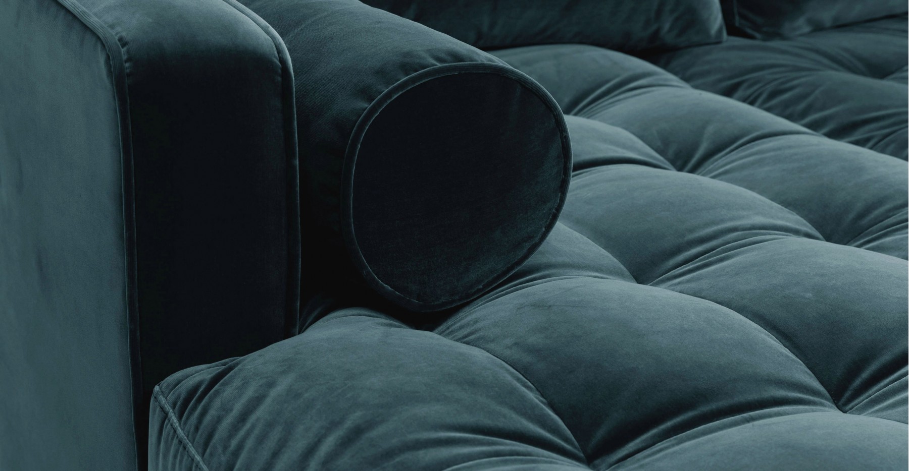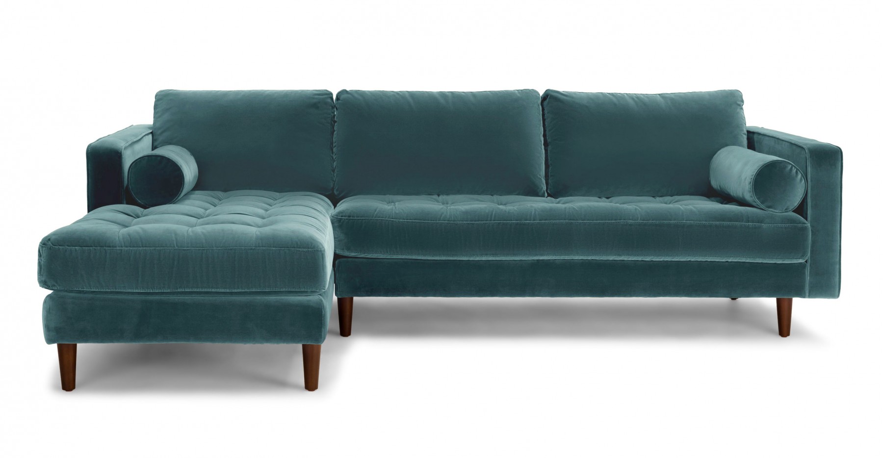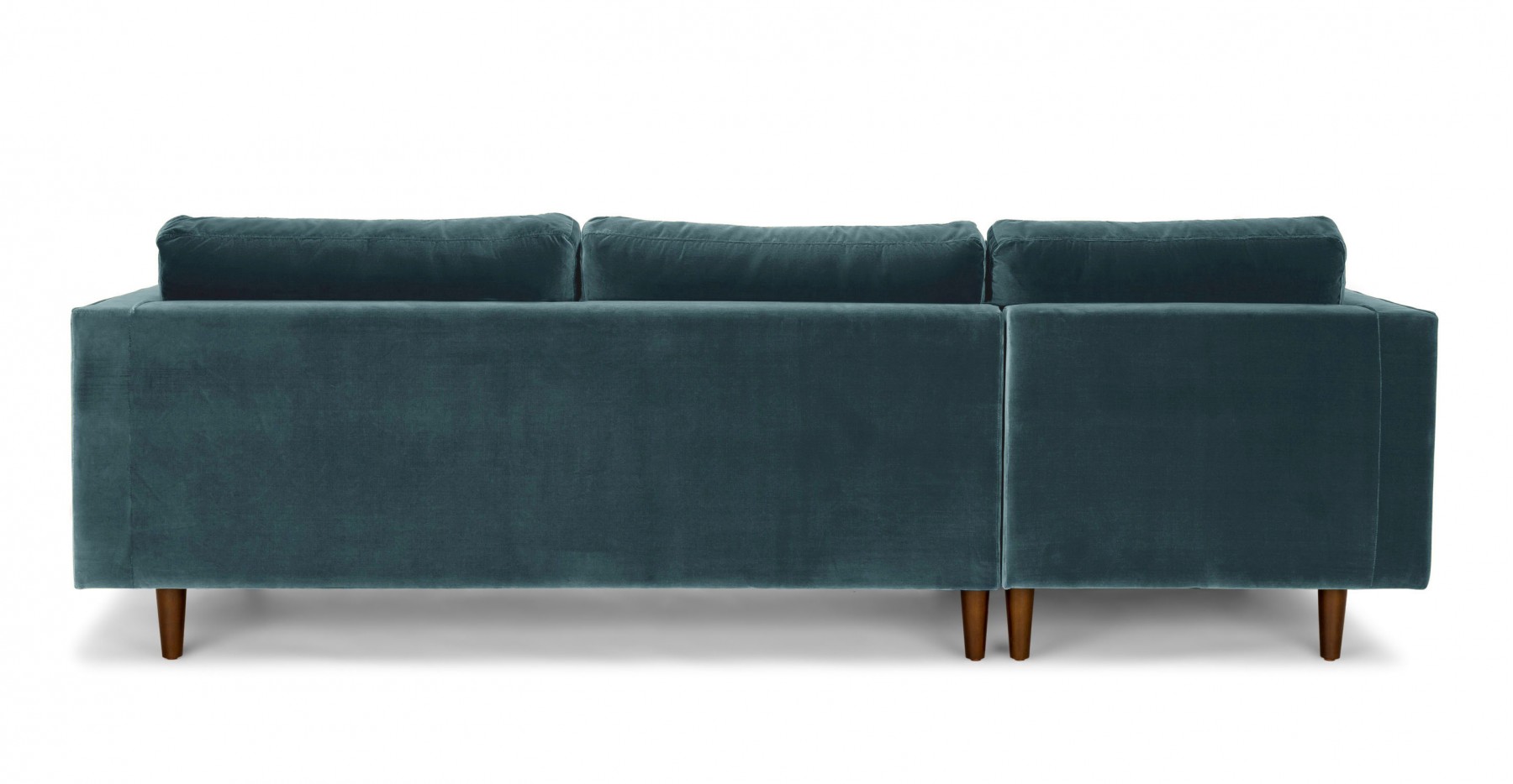 Ocean blues. The Sven sectional sofa in pacific blue brings the charm of the PNW to your living room… but minus the rain. This blue velvet sectional is upholstered in a soft cotton-velvet that adds moody elegance to your living room. A corner blocked wooden frame and slim walnut legs and loose bolsters and back cushions makes for a sturdy and stylish move-watching companion.