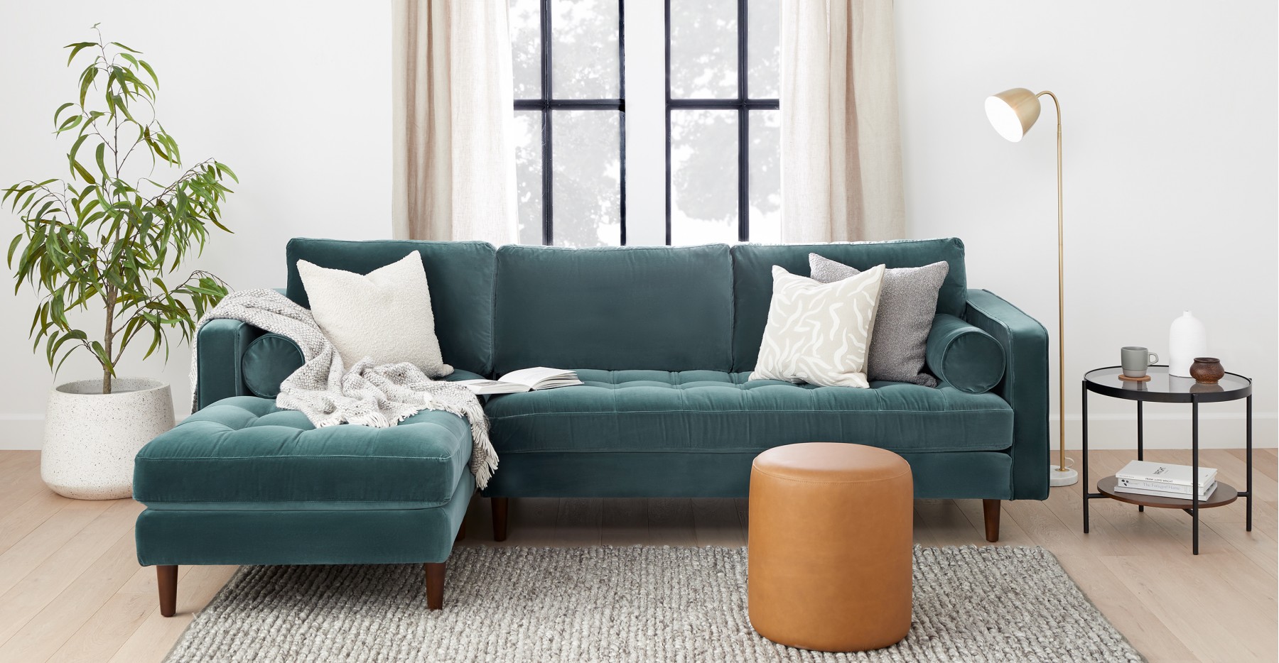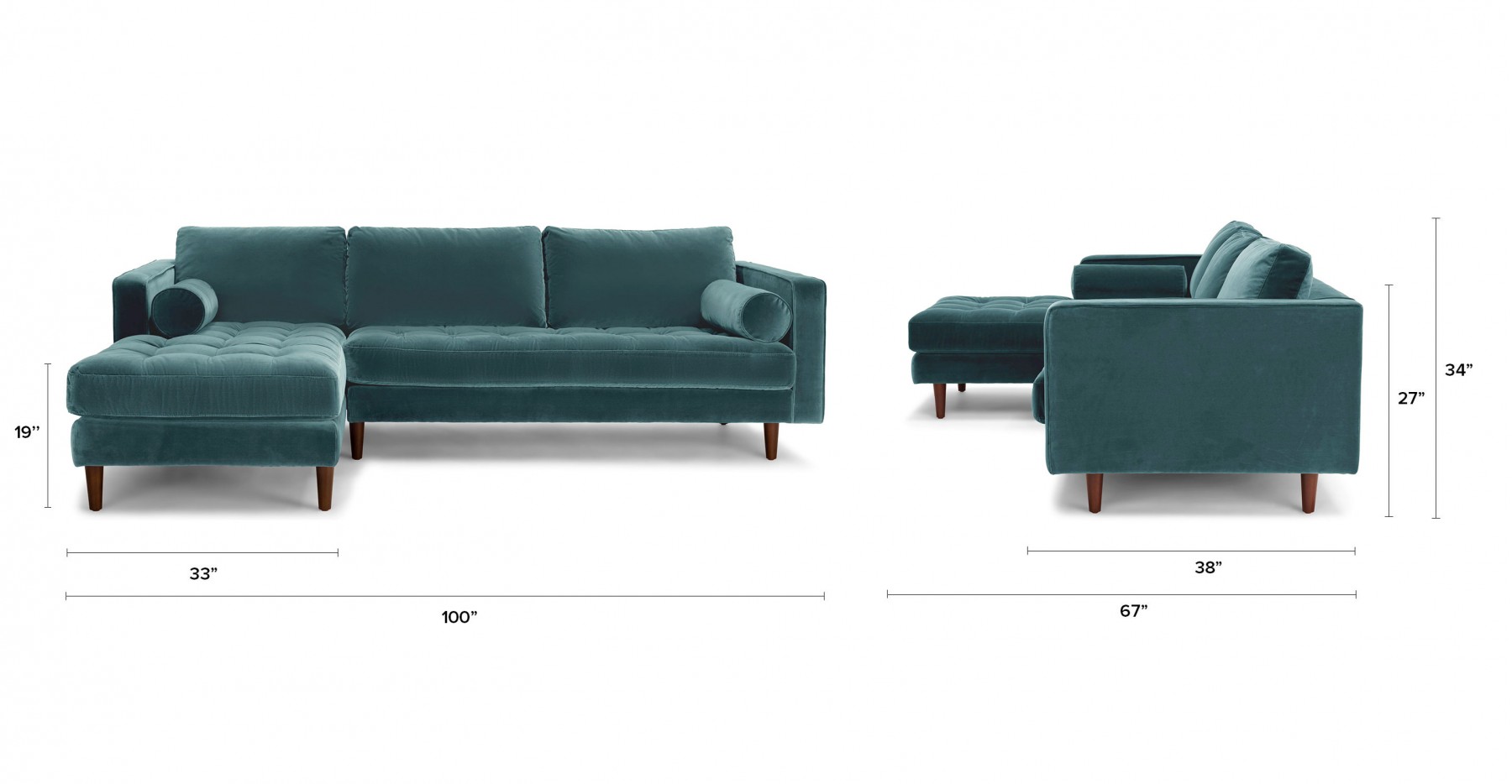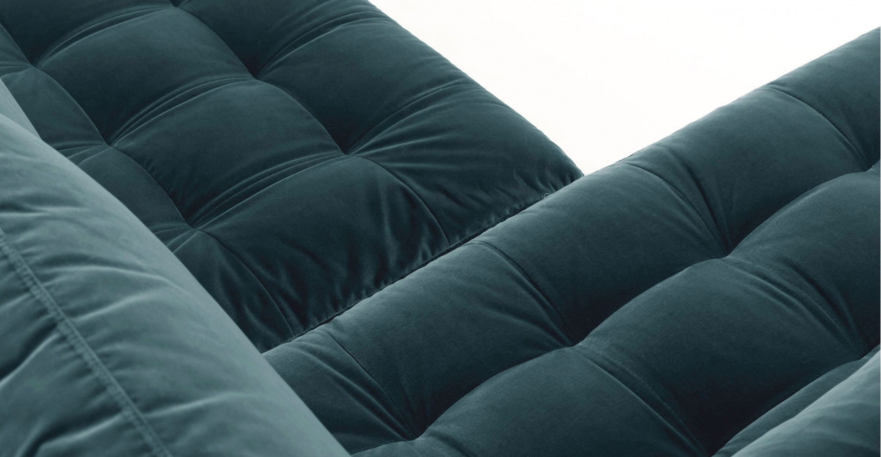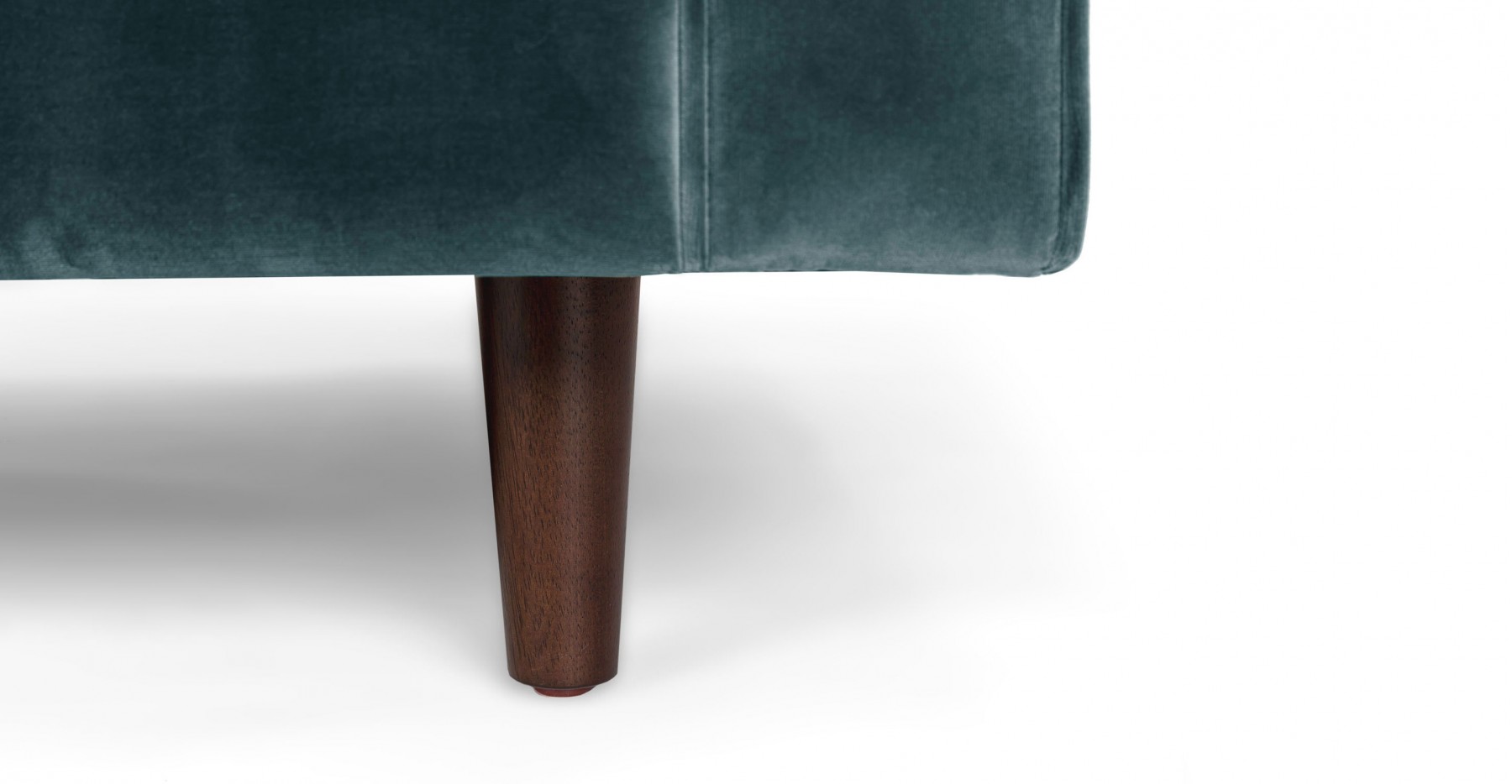 Ocean blues. The Sven sectional sofa in pacific blue brings the charm of the PNW to your living room… but minus the rain. This blue velvet sectional is upholstered in a soft cotton-velvet that adds moody elegance to your living room. A corner blocked wooden frame and slim walnut legs and loose bolsters and back cushions makes for a sturdy and stylish move-watching companion.