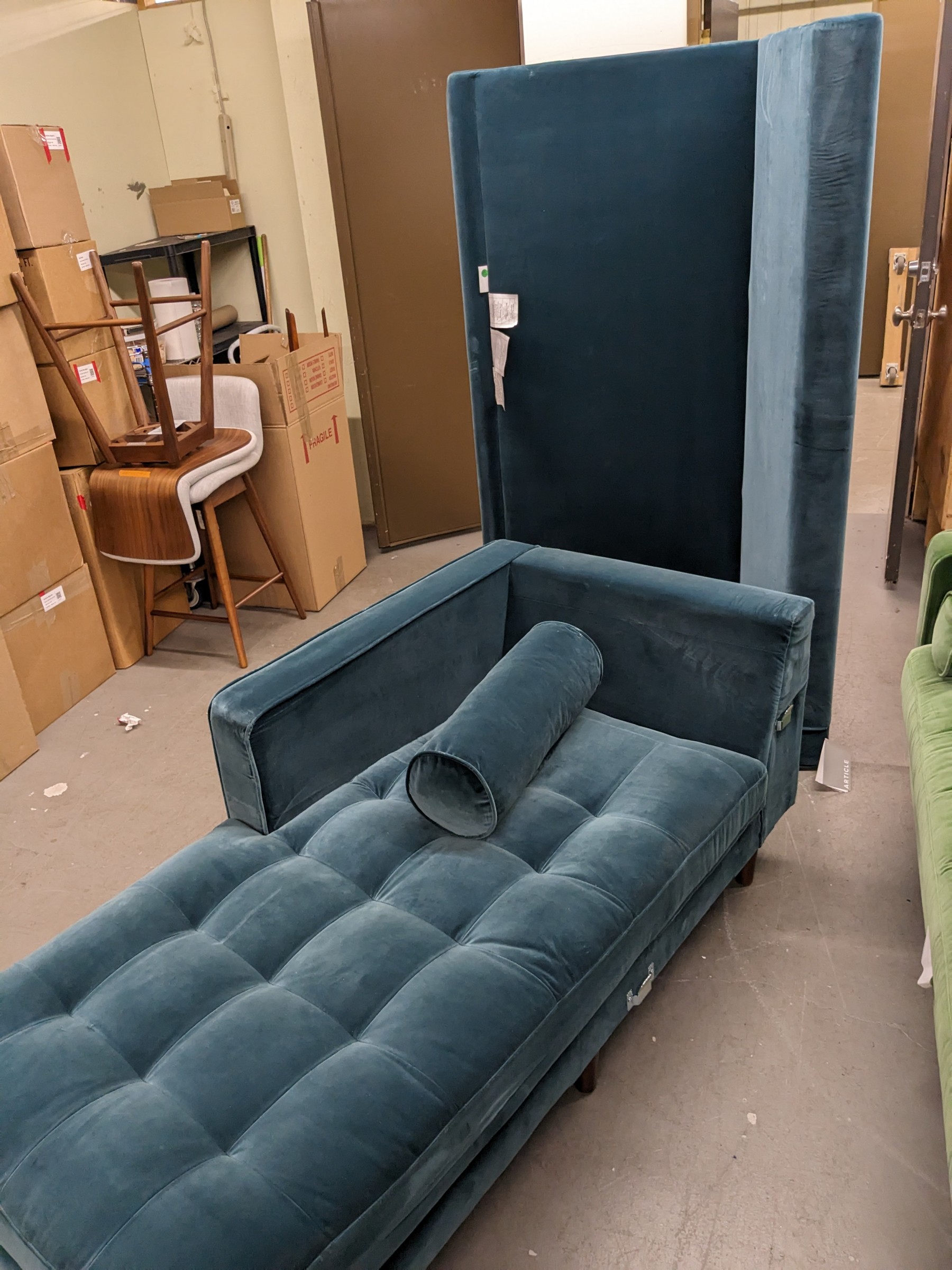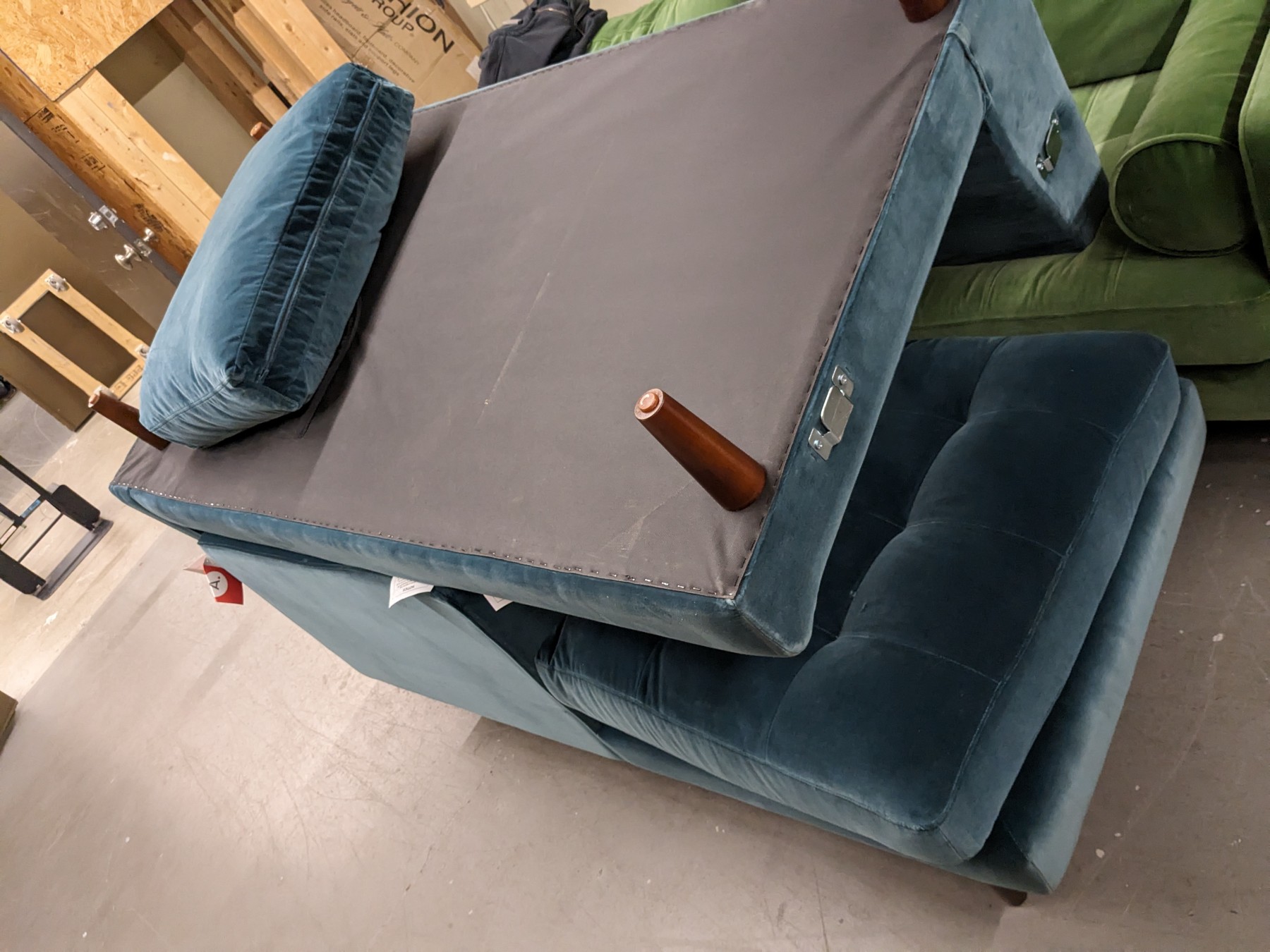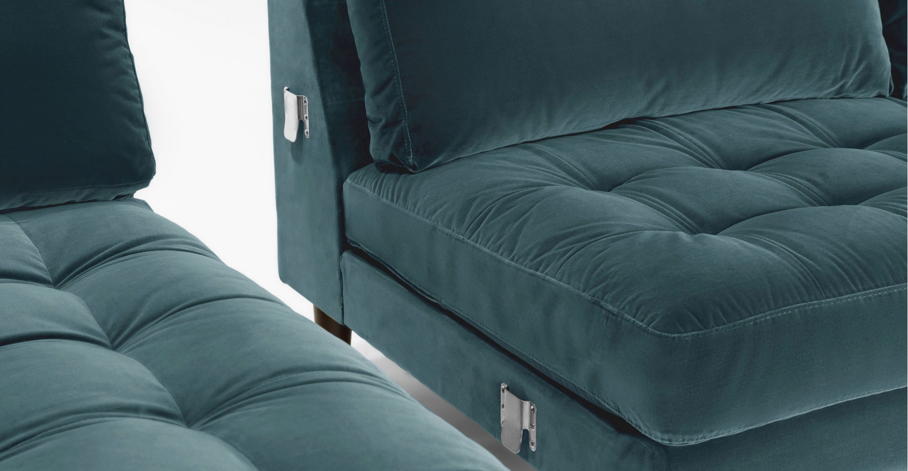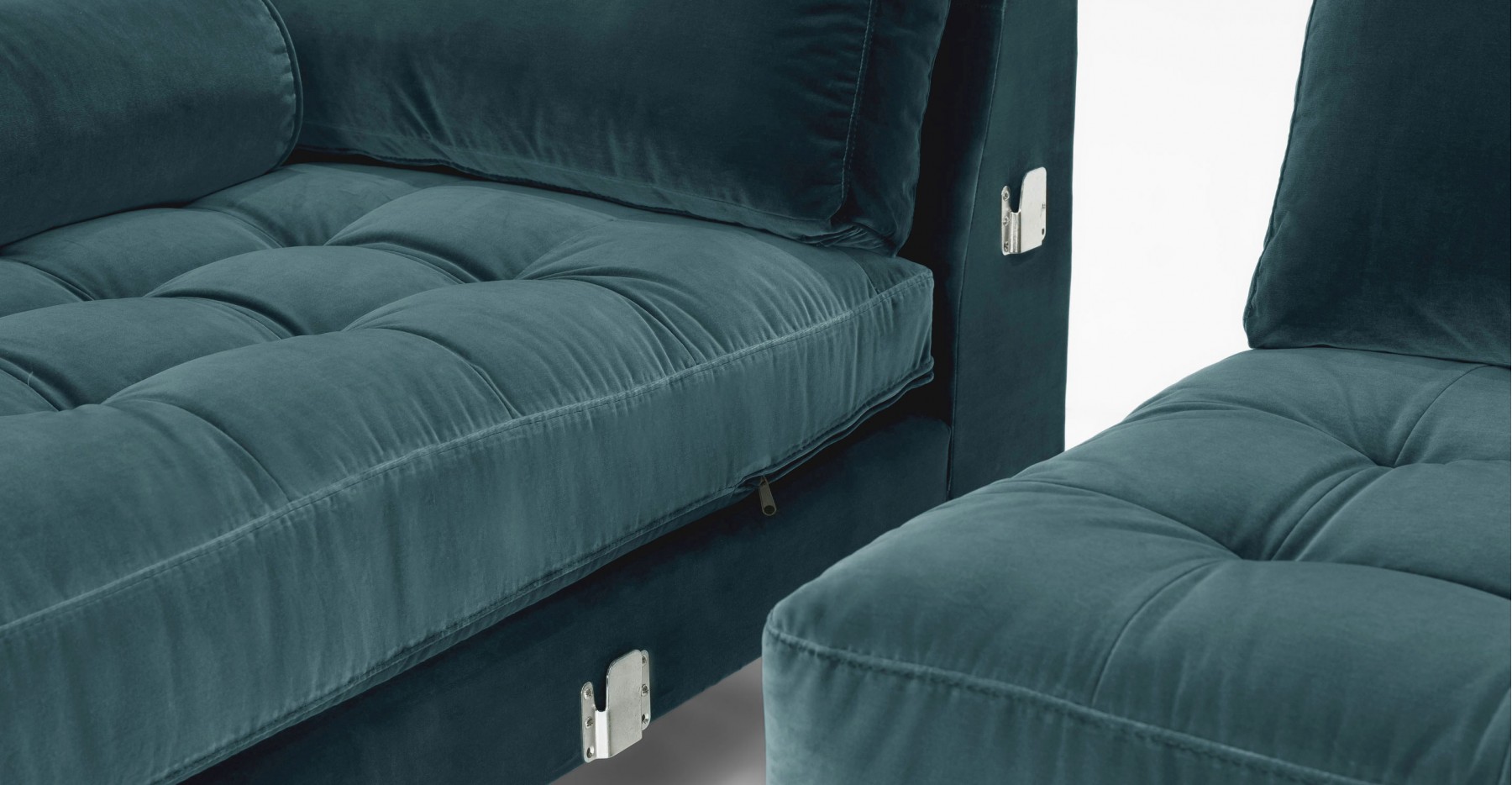 Ocean blues. The Sven sectional sofa in pacific blue brings the charm of the PNW to your living room… but minus the rain. This blue velvet sectional is upholstered in a soft cotton-velvet that adds moody elegance to your living room. A corner blocked wooden frame and slim walnut legs and loose bolsters and back cushions makes for a sturdy and stylish move-watching companion.