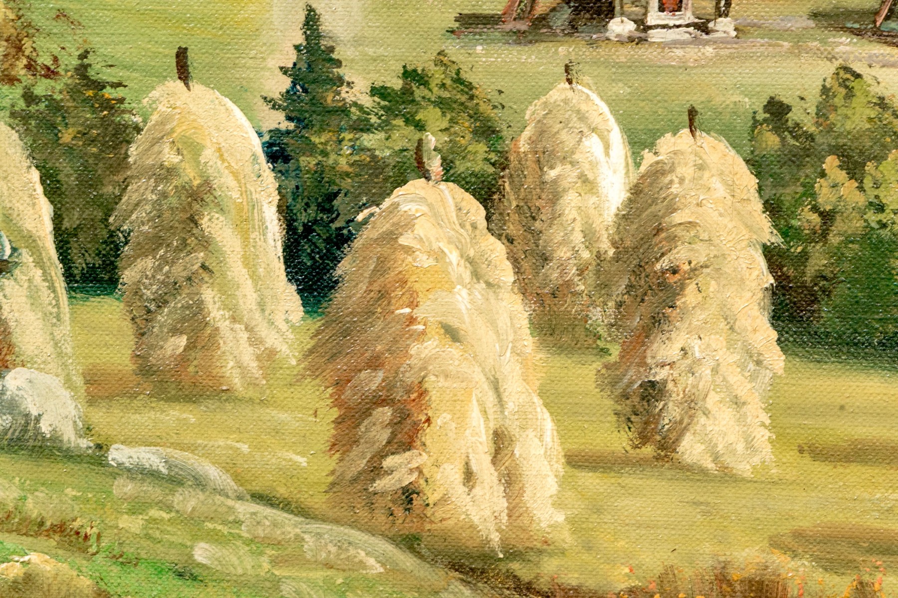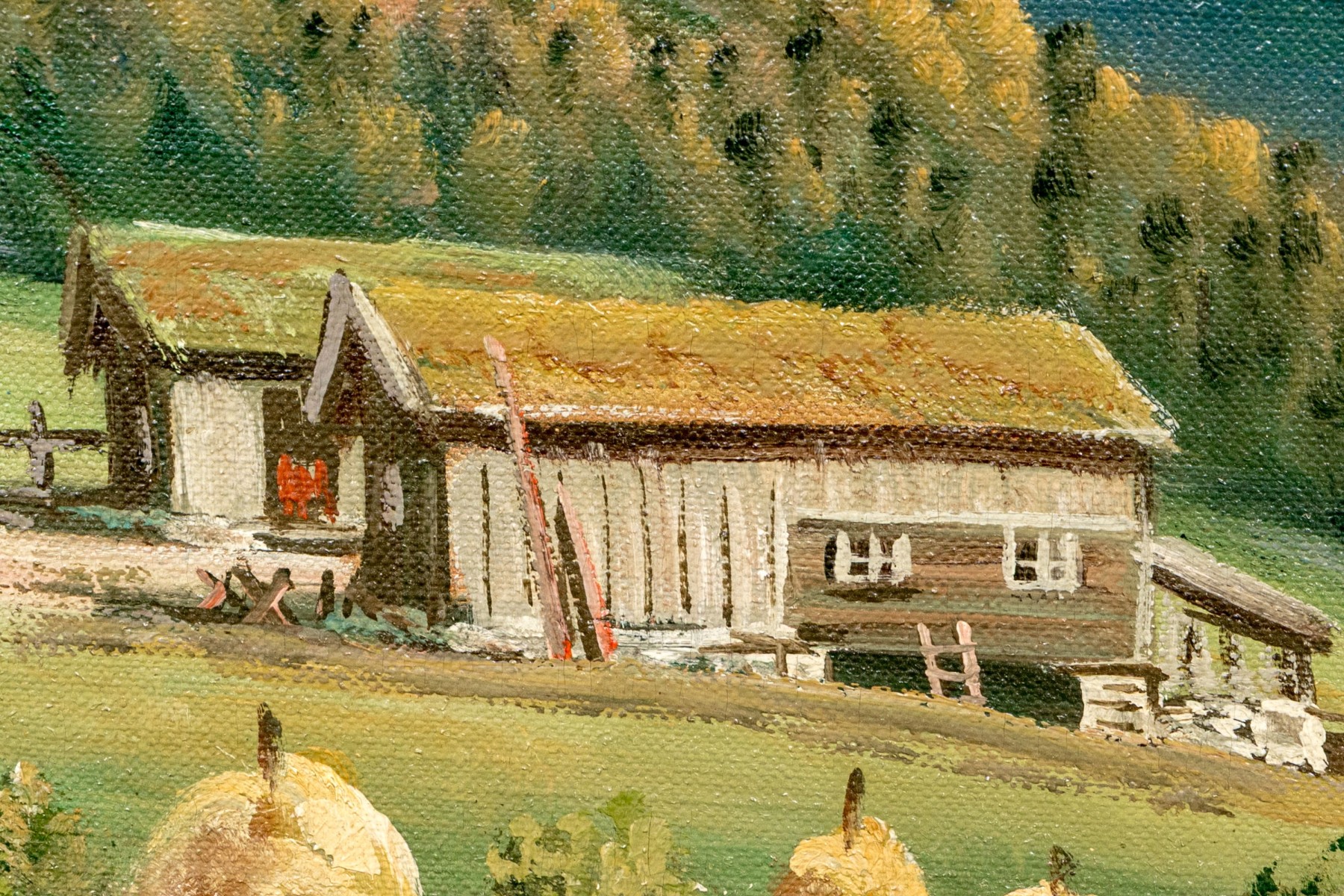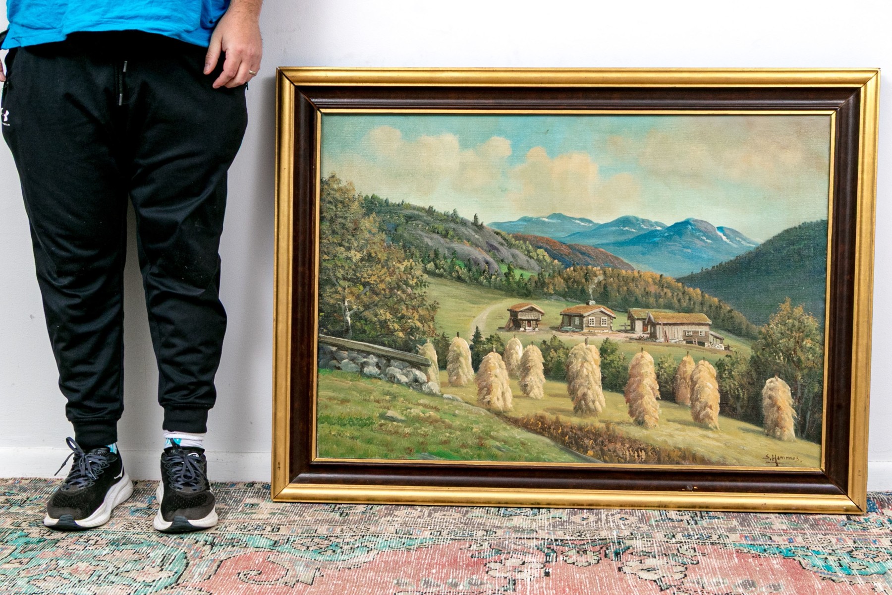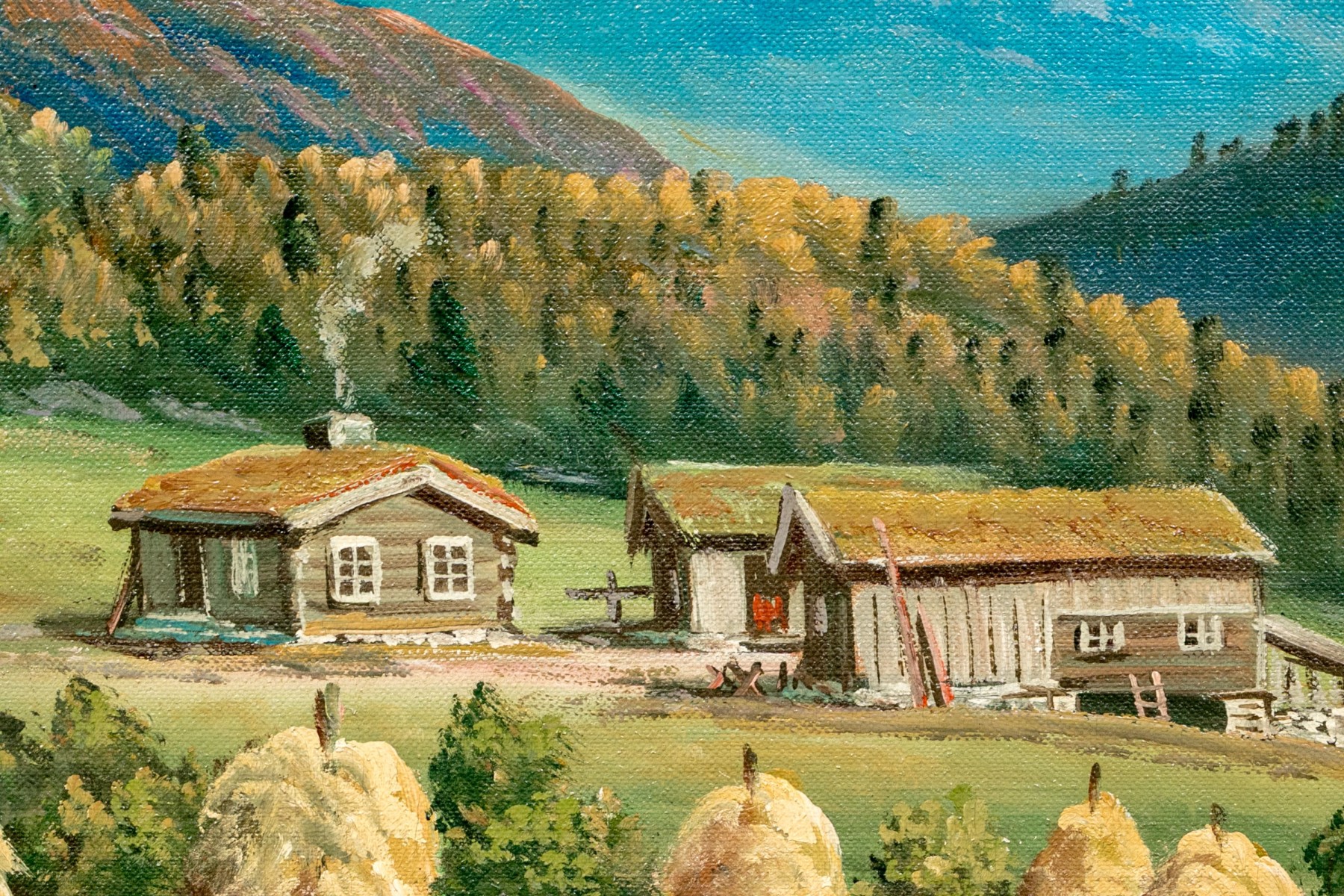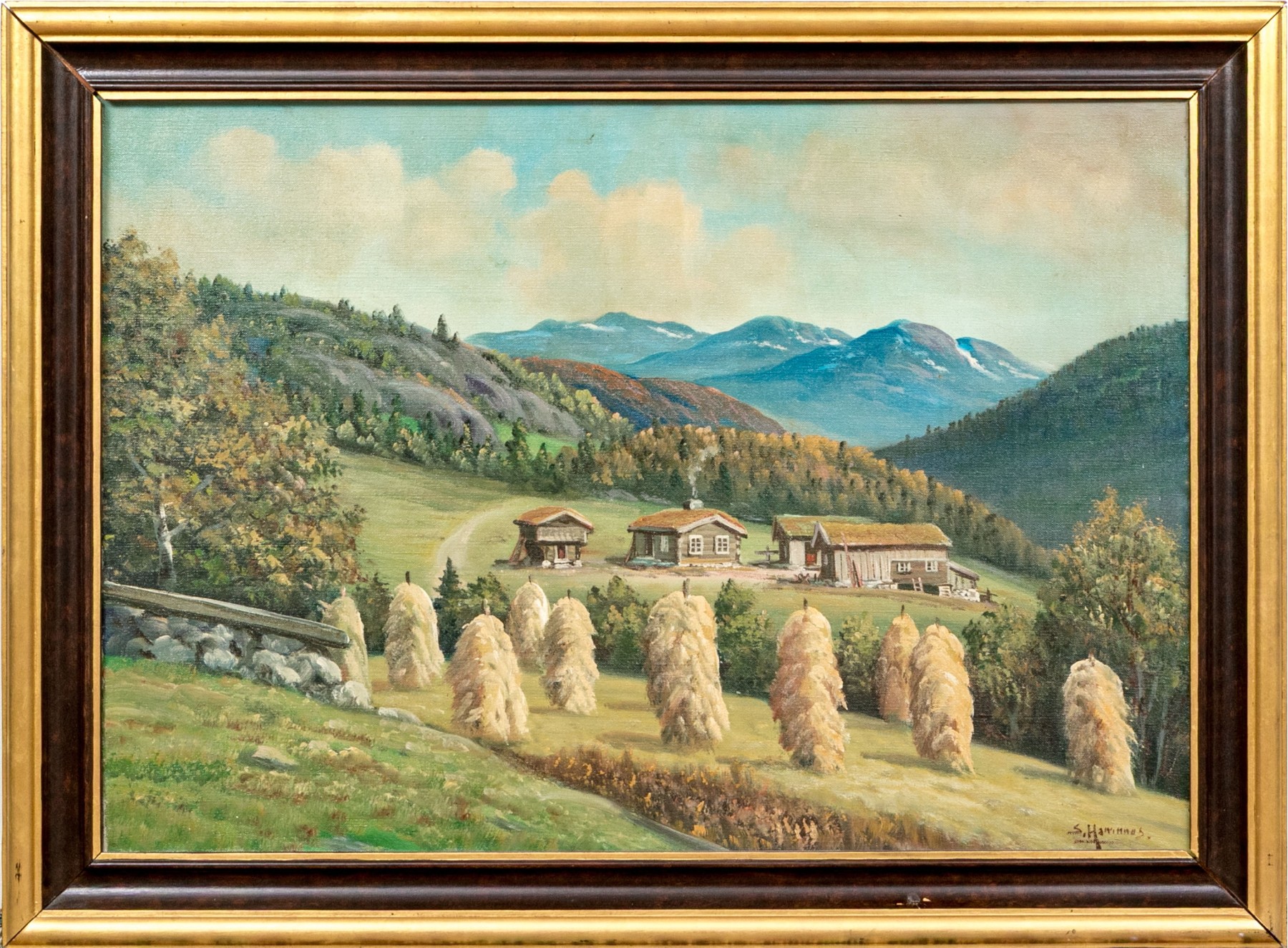 Sverre Hamnnes (Norwegian, a. 1950's) oil painting on canvas depicting a pastoral landscape with hesje racks of hay piled high along a gently sloping hill leading to a view of a homestead with a curving dirt road leading into lush, forested mountains in autumnal hues beneath a clouded blue sky. Signed lower right.