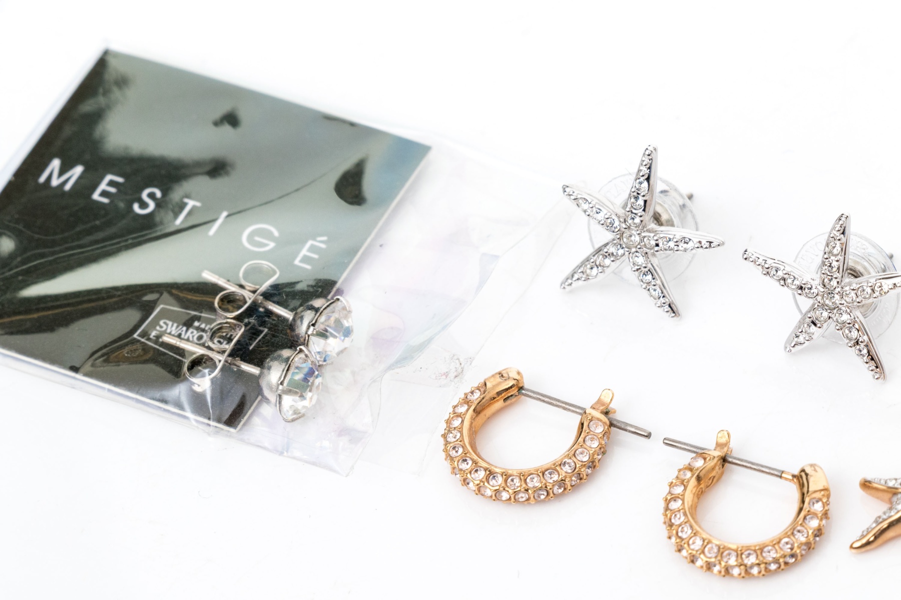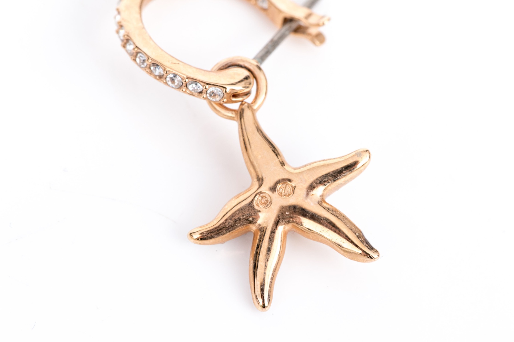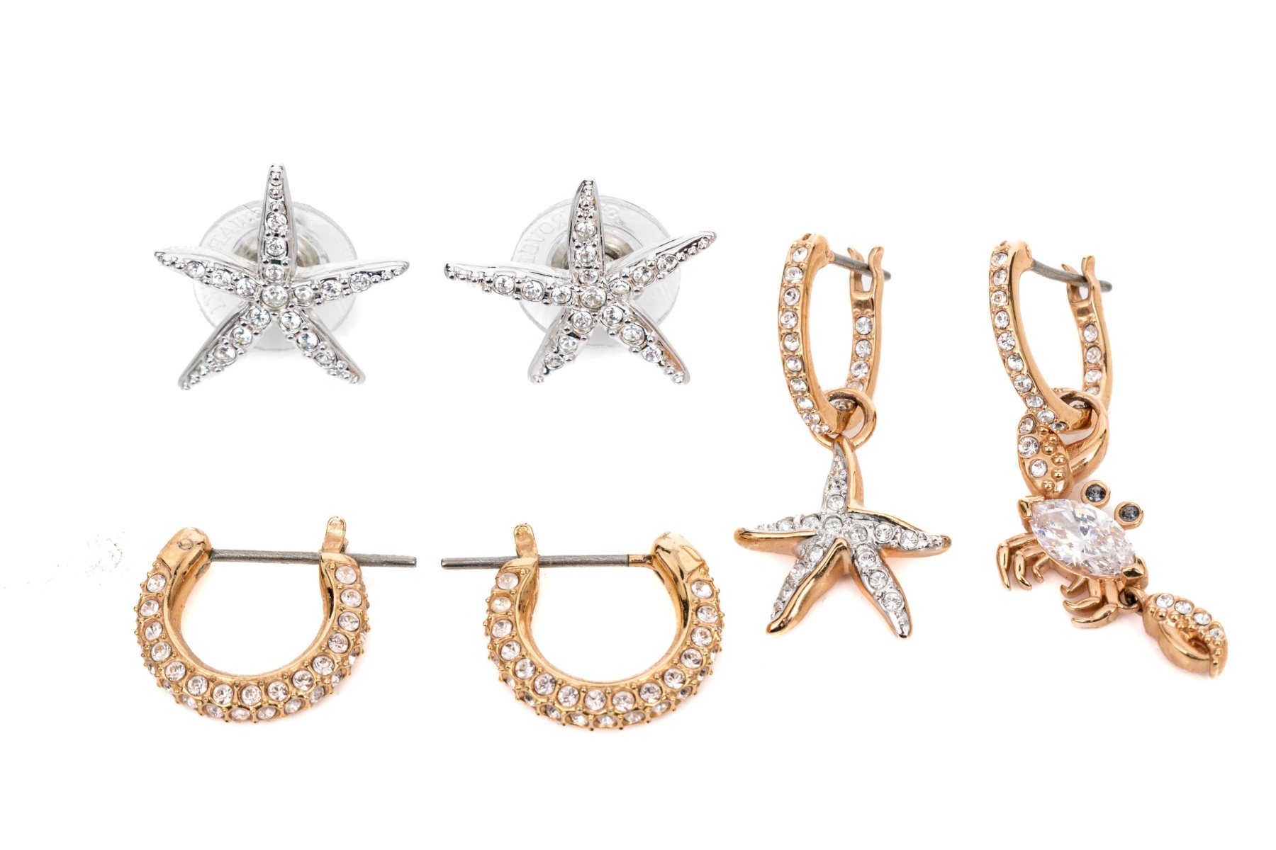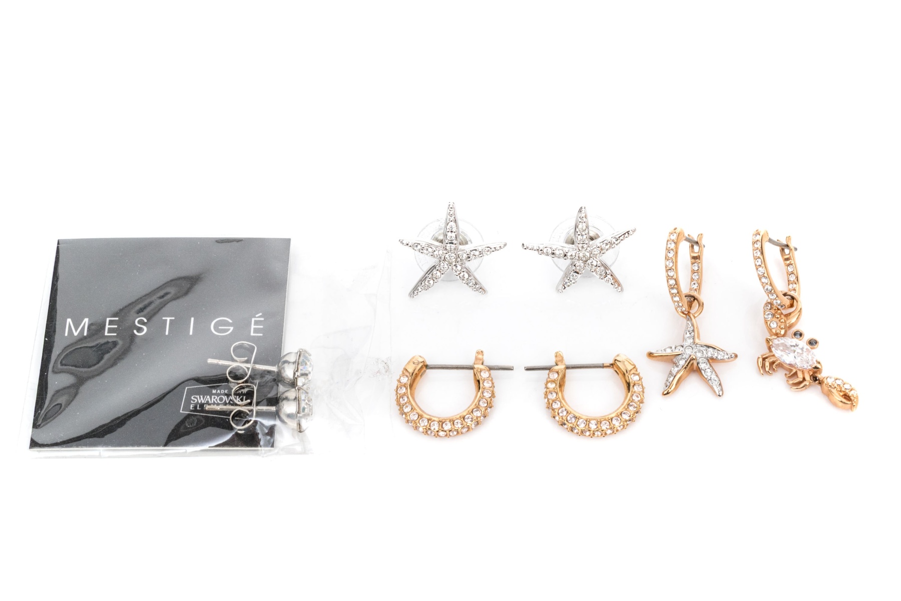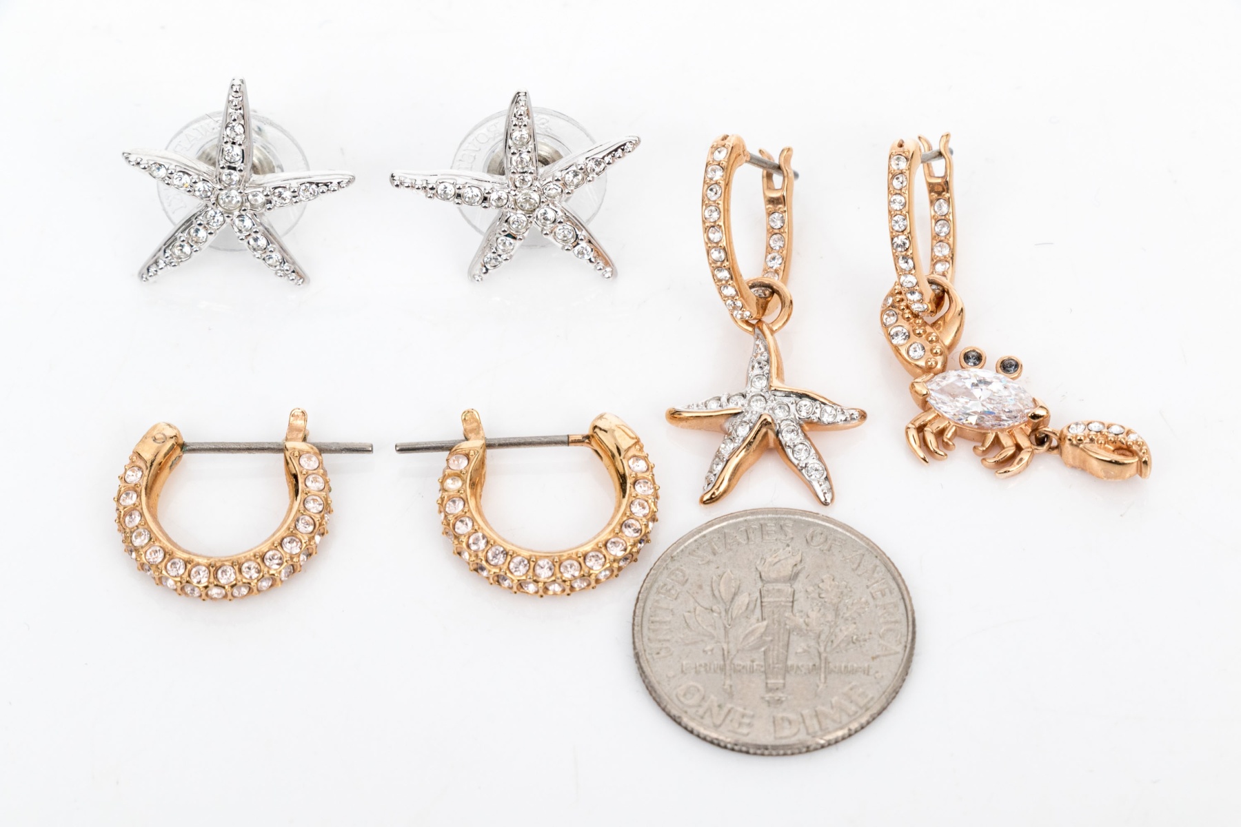 Collection of Swarovski and Swarovski Mestige crystal set earrings, including starfish motif studs, crystal set studs, pave crystal set hoops and crab and starfish decorated hoops; backings include posts with clutches, posts with plastic disc backs, and hinged posts with "u" hook style closures
