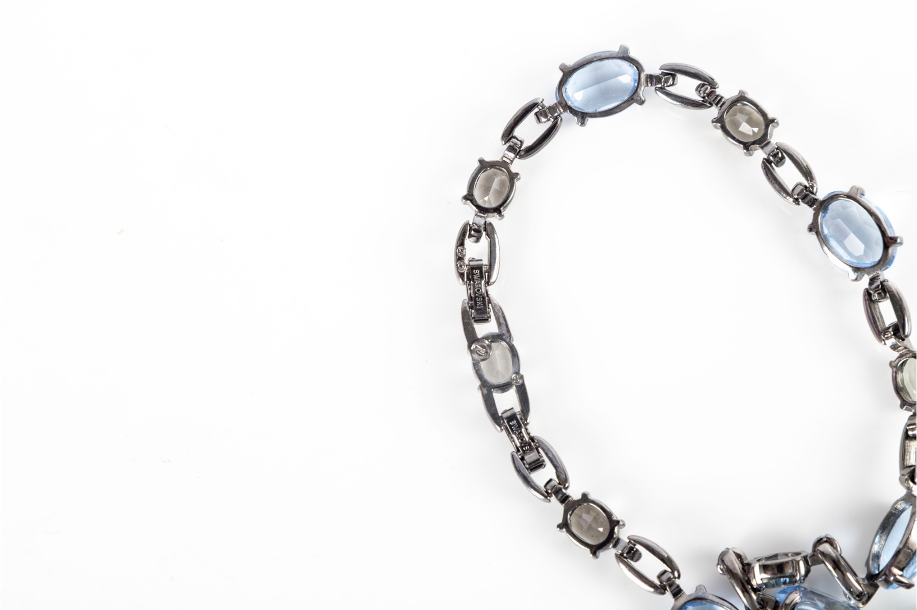 Elegant Swarovski necklace featuring alternating oval-cut blue and clear crystals, each set in polished silver-tone prong settings. The stones are joined by sleek, modern oval links that create a fluid, refined silhouette. Classic Swarovski sparkle with a contemporary design.