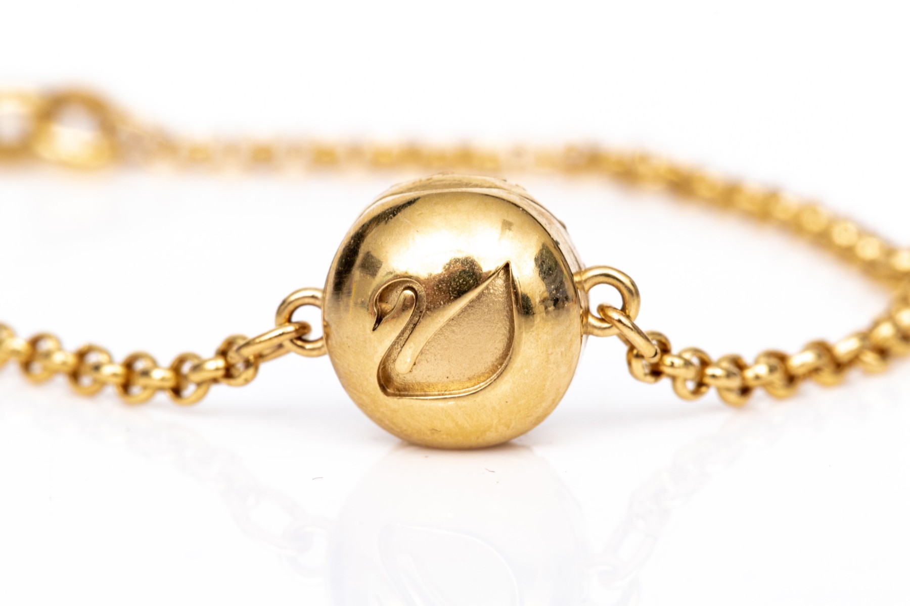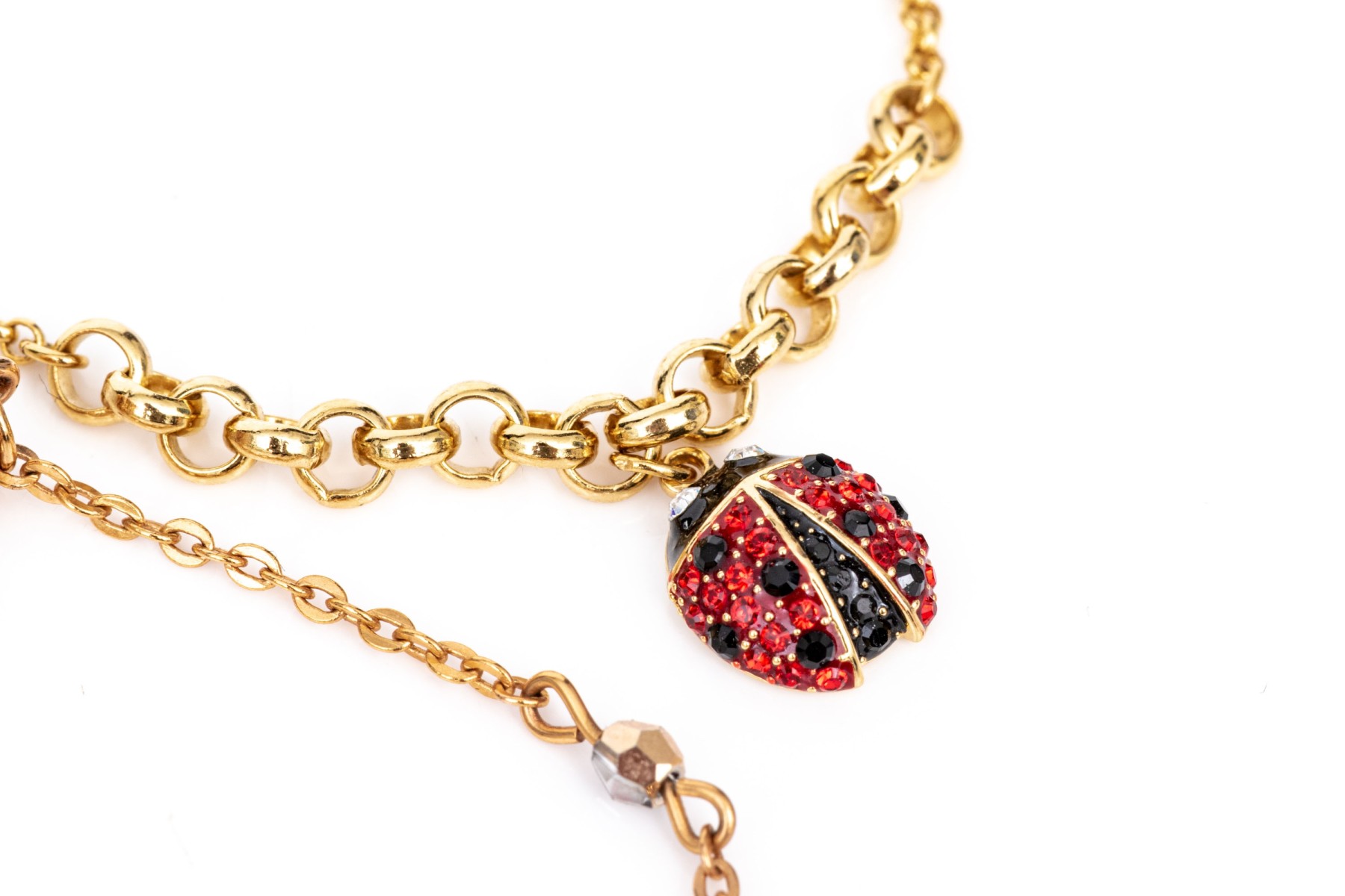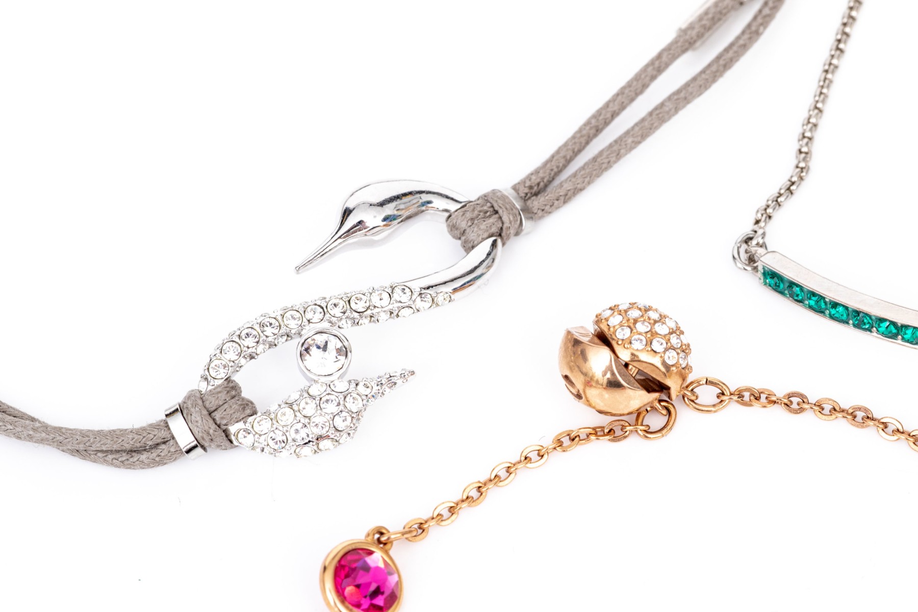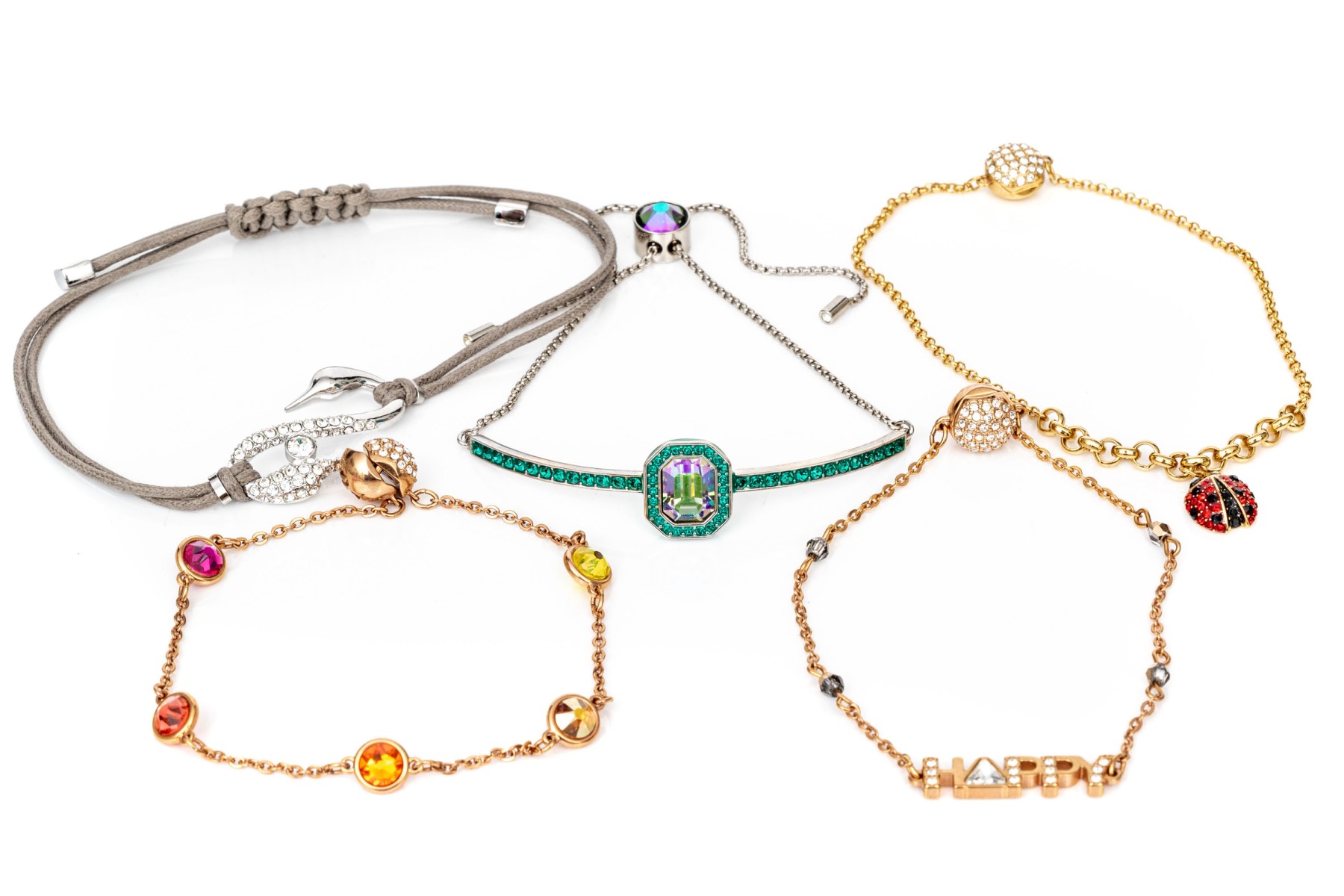 Collection of five Swarovski crystal bracelet. The collection includes two white toned, with adjustable bracelets, both cord and metal; one yellow toned with a ladybug motif; two rose toned, one with a multi color crystals motif and one with a happy motif