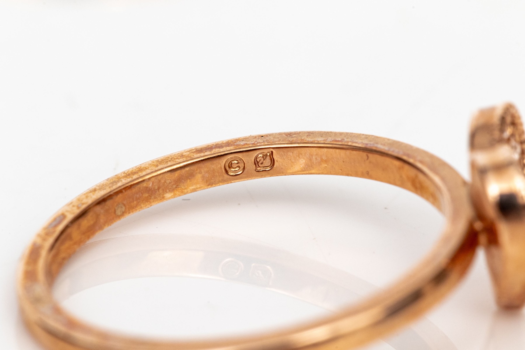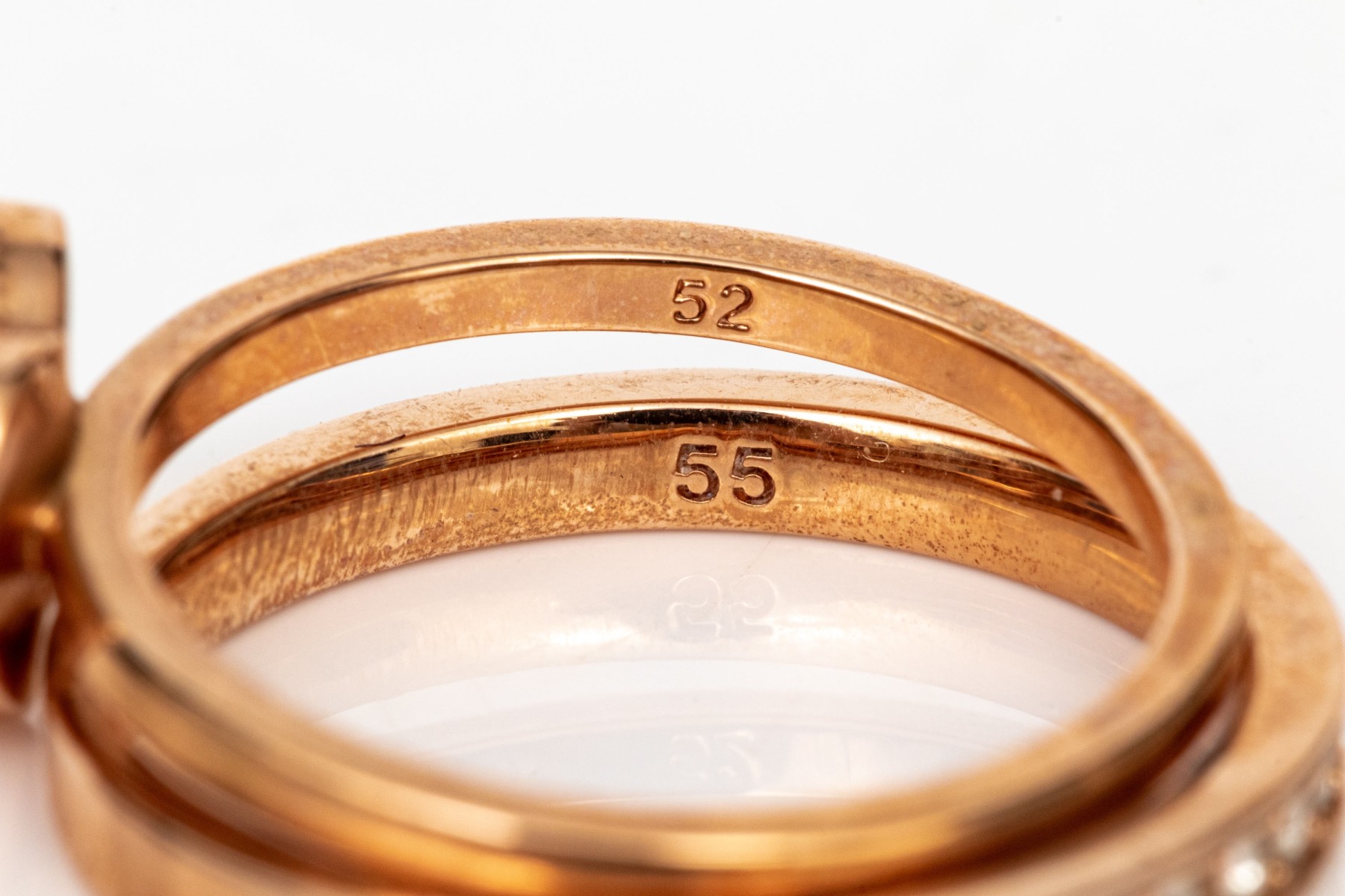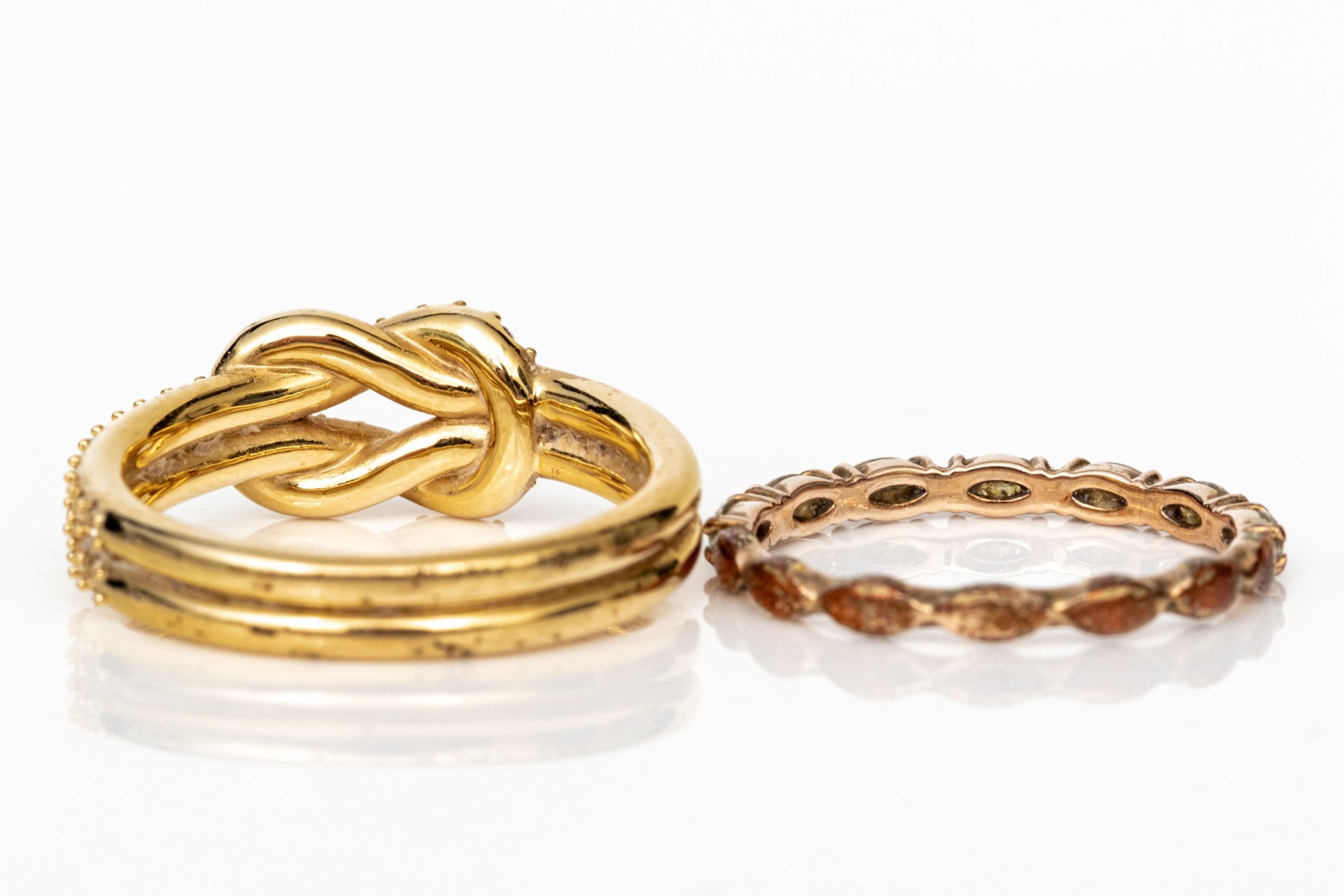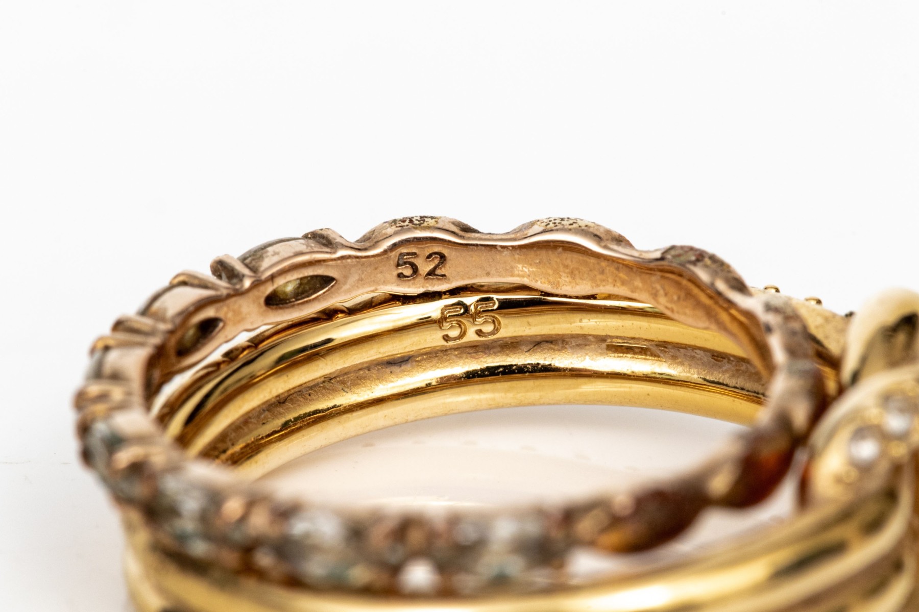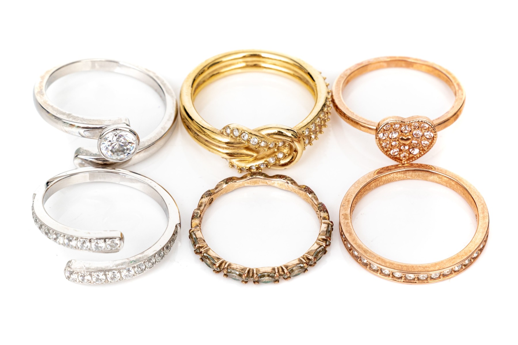 Collection of six Swarovski crystal set rings. The collection includes two silver toned bypass styles which may be stacked, a yellow toned knot style, and three rose toned; sizes 5 3/4 to 7
