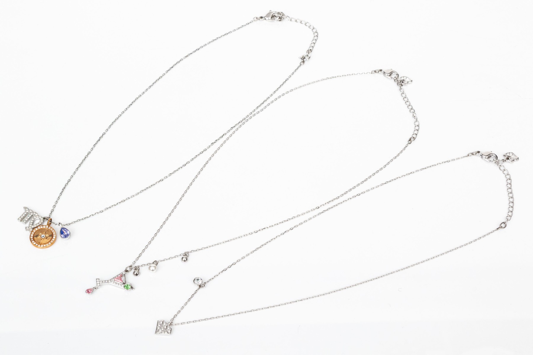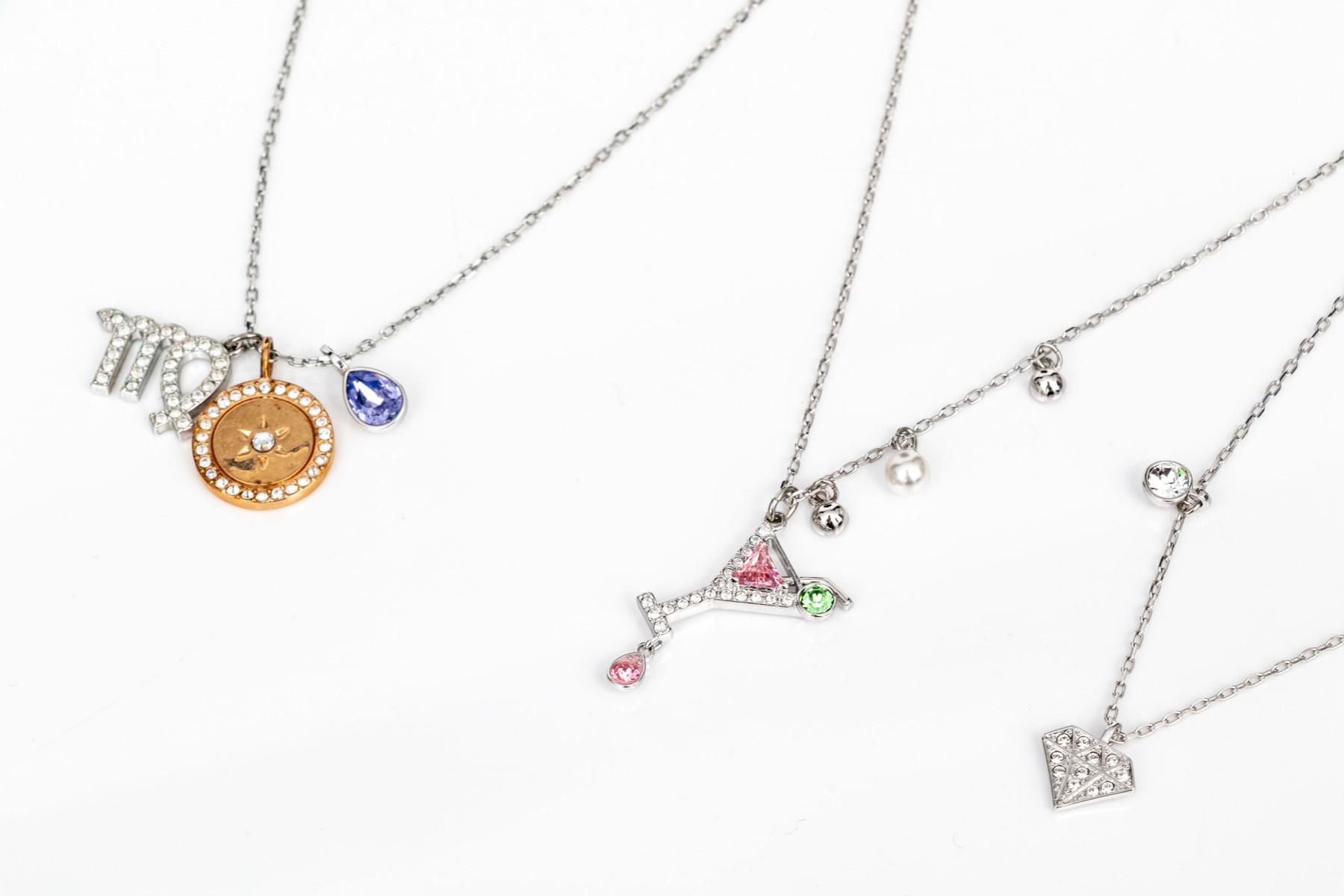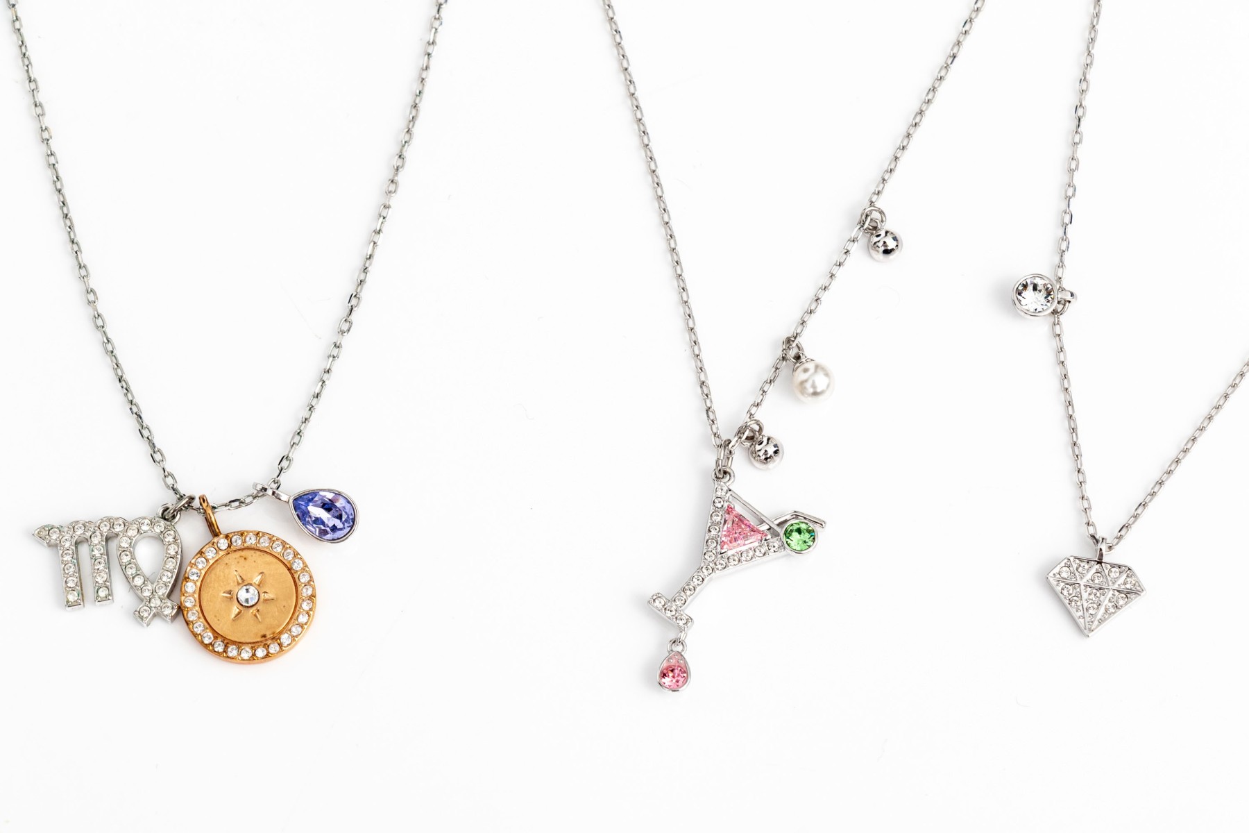 Collection of three silver toned crystal set charm necklaces by Swarovski. The collection includes one with a pave set crystal charm; one with a martini charm; one with a zodiac and rose toned charm. All are finished with lobster claw style clasps.