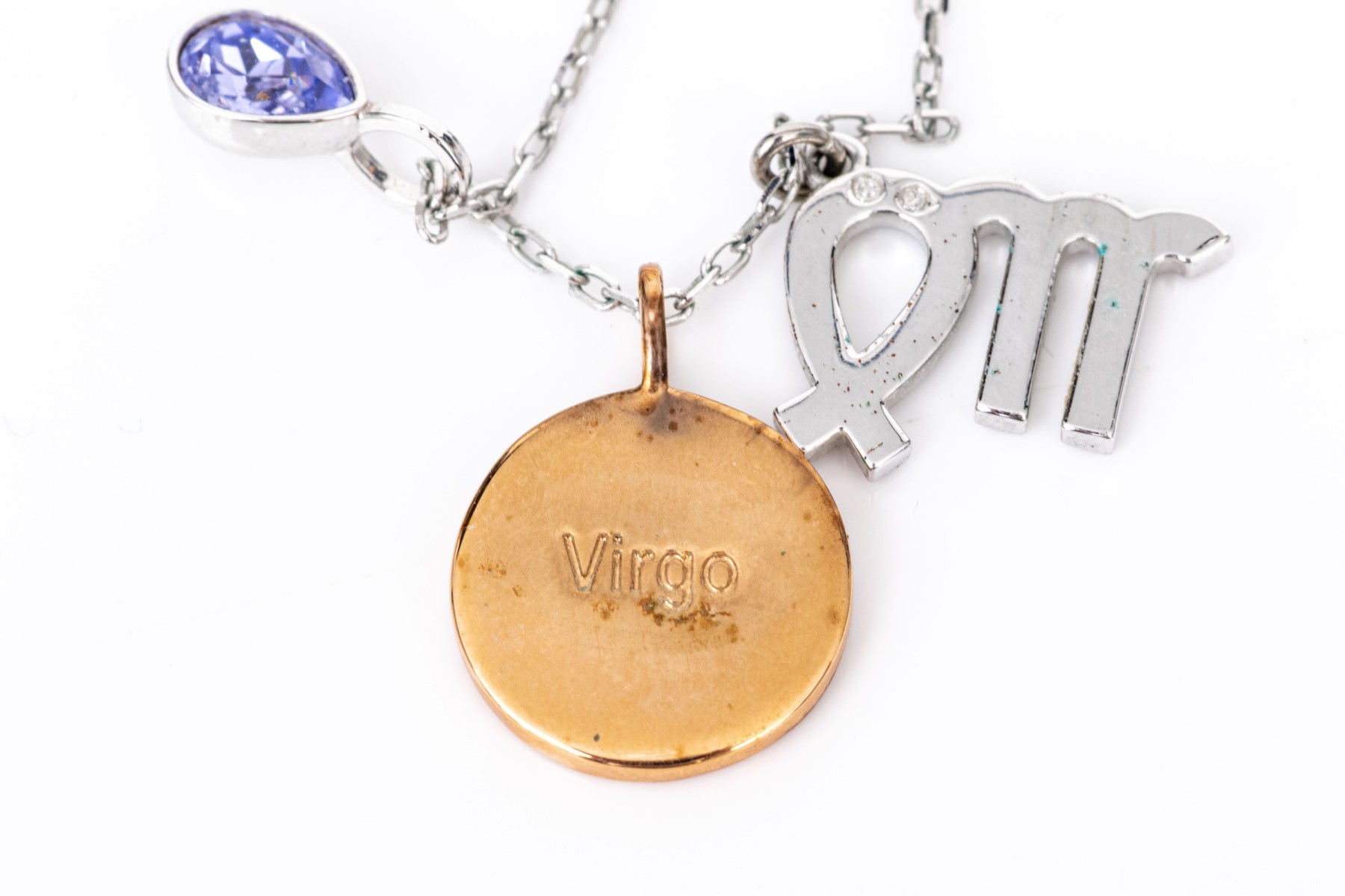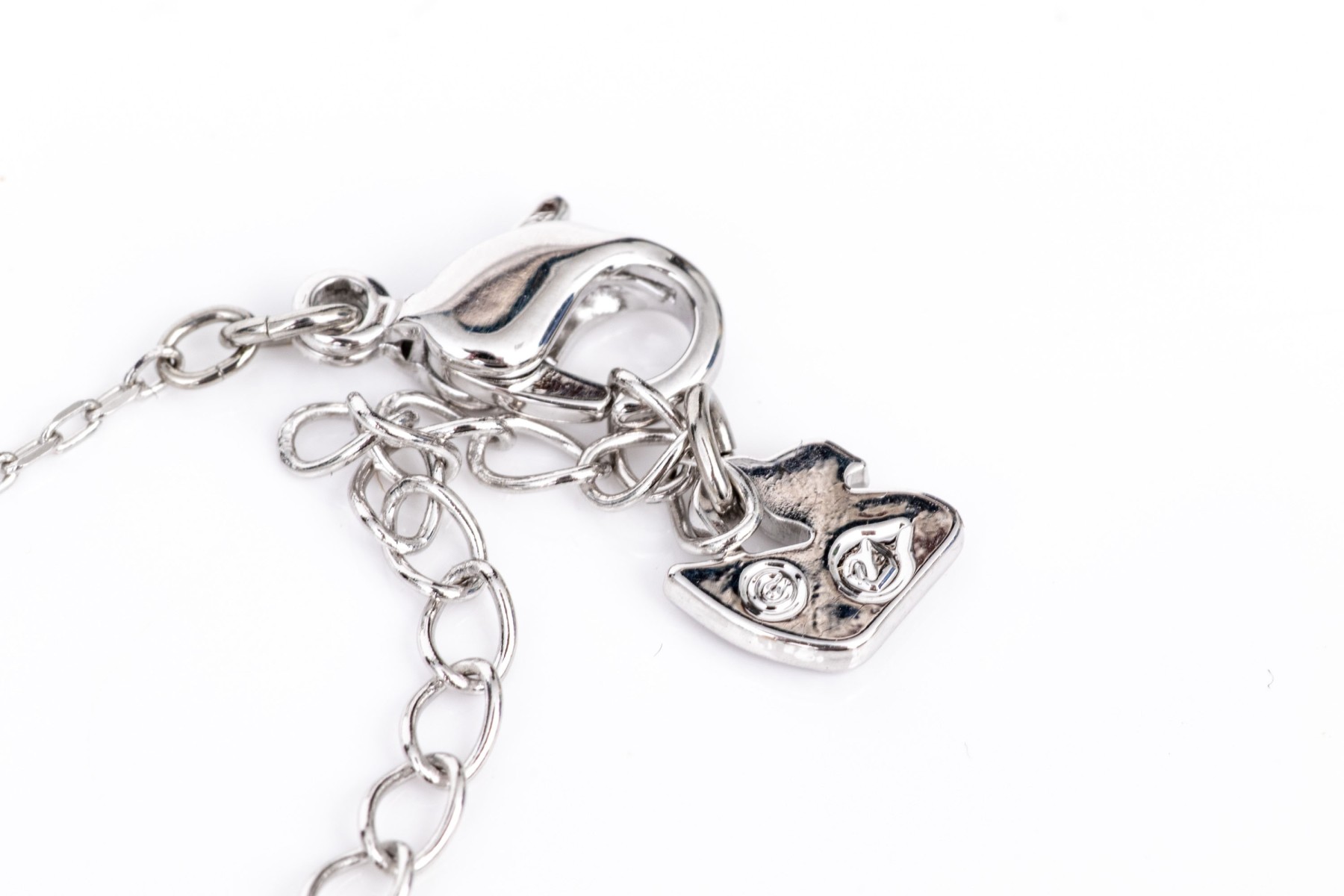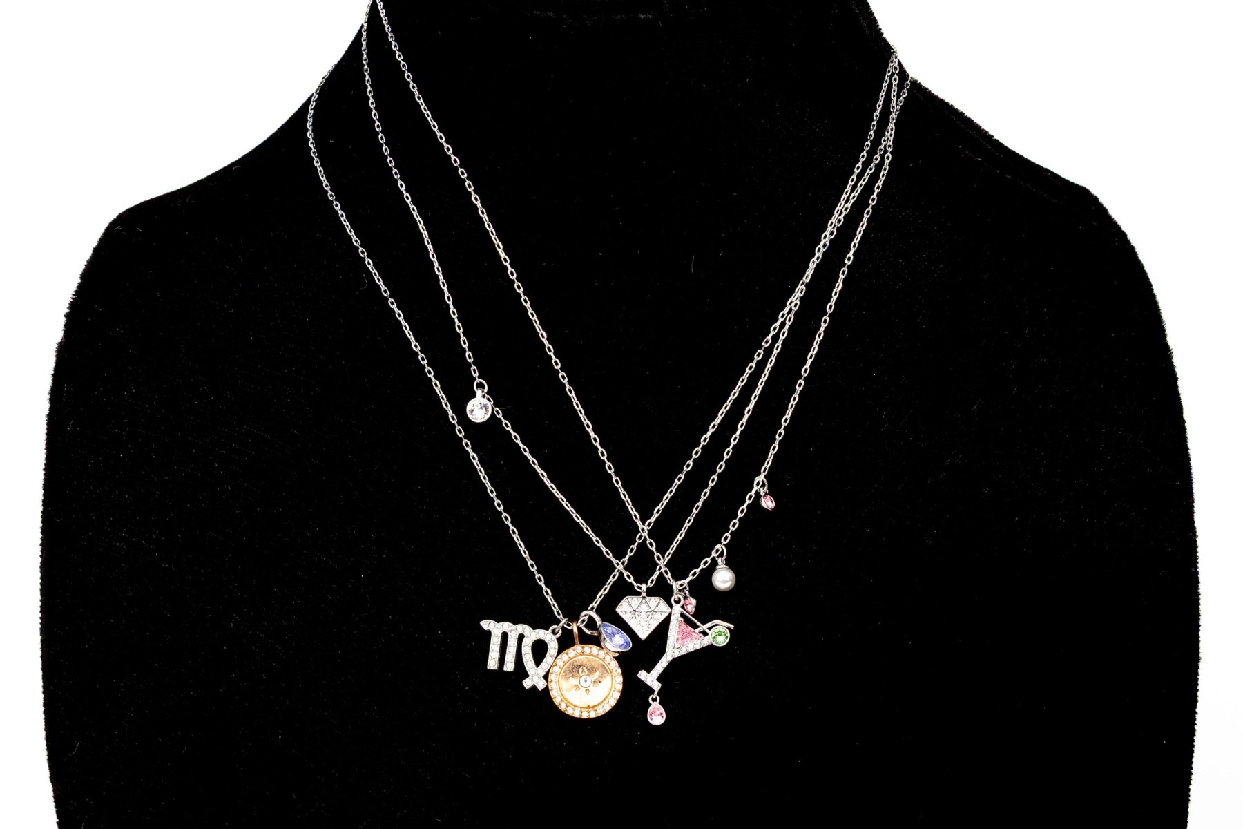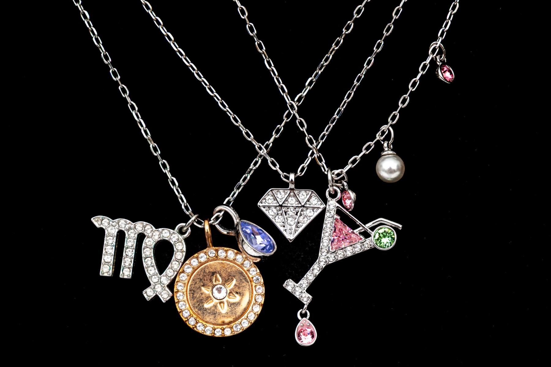 Collection of three silver toned crystal set charm necklaces by Swarovski. The collection includes one with a pave set crystal charm; one with a martini charm; one with a zodiac and rose toned charm. All are finished with lobster claw style clasps.