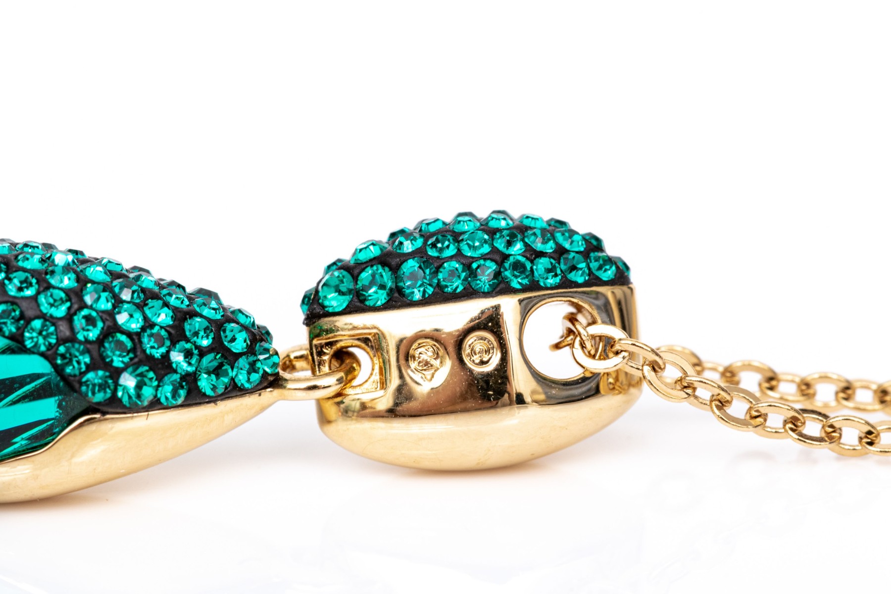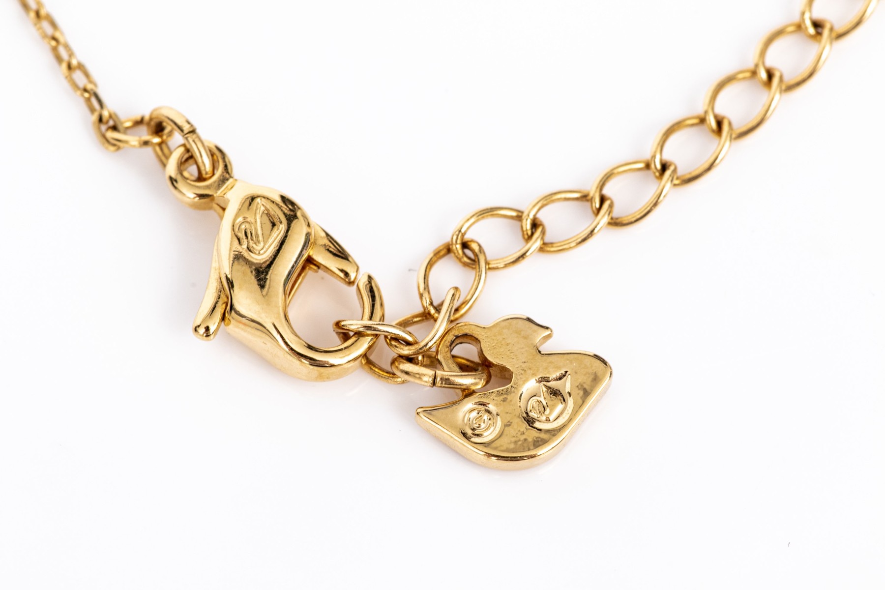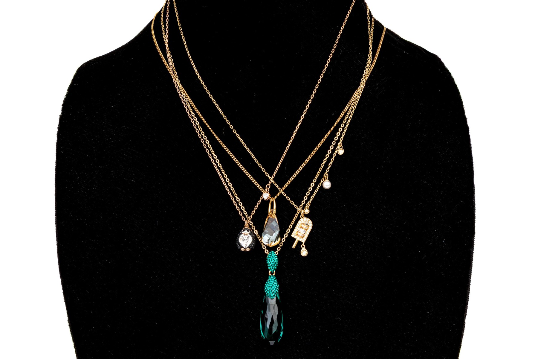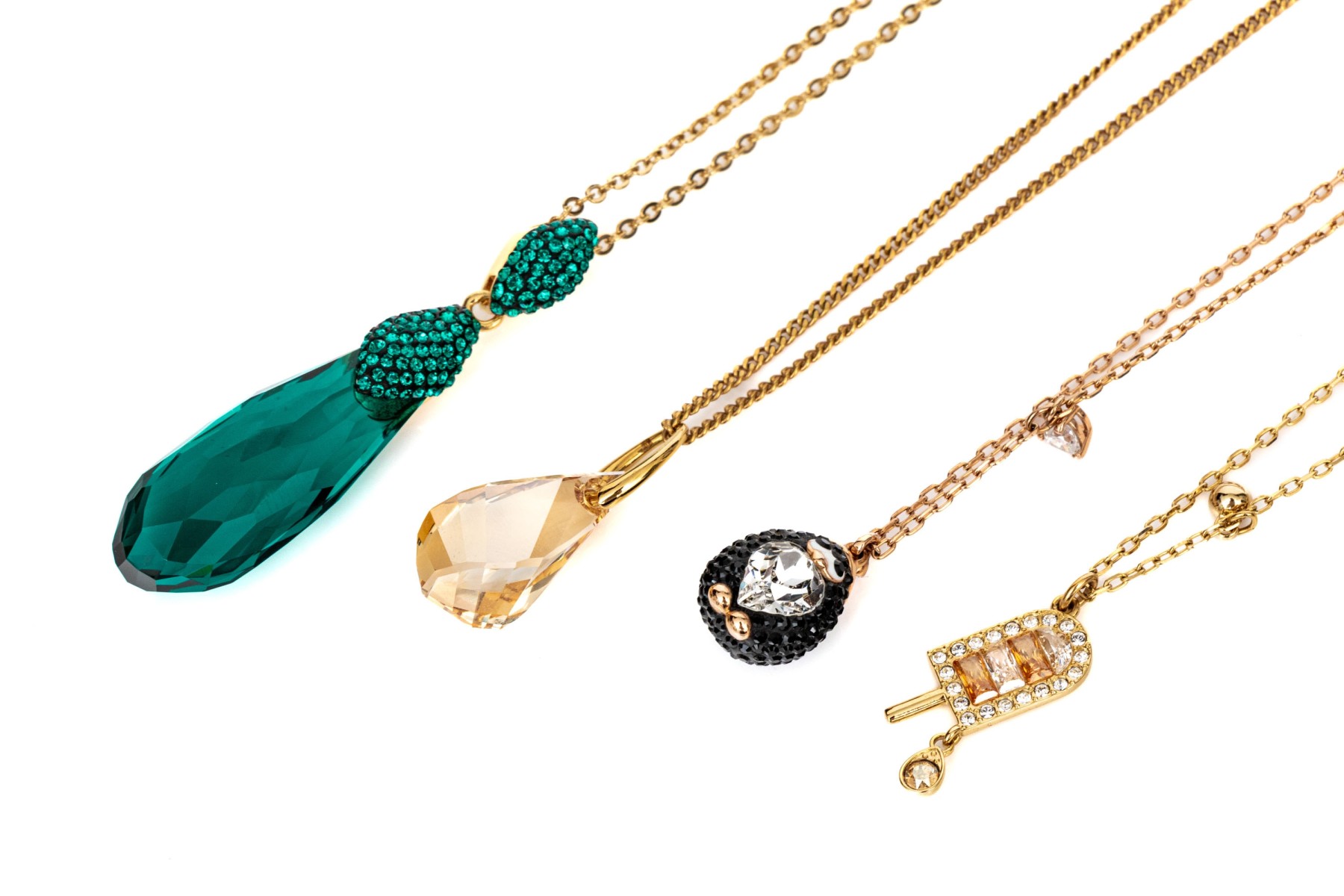 Collection of four yellow and rose toned Swarovski Crystal adjustable necklaces, featuring green, black and white and yellow crystals. All are finished with lobster claw style clasps
