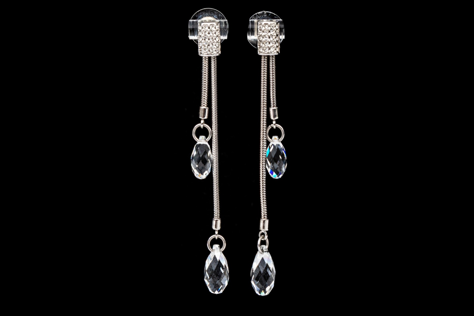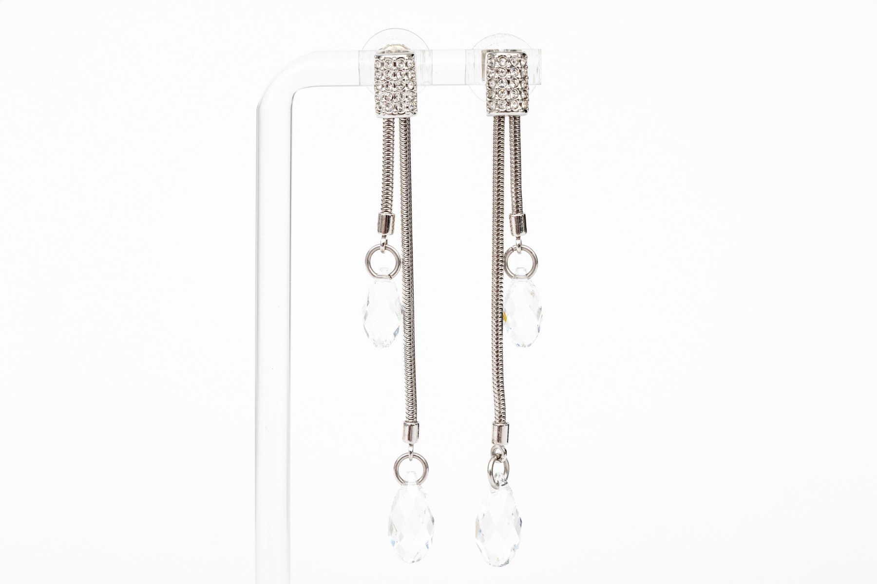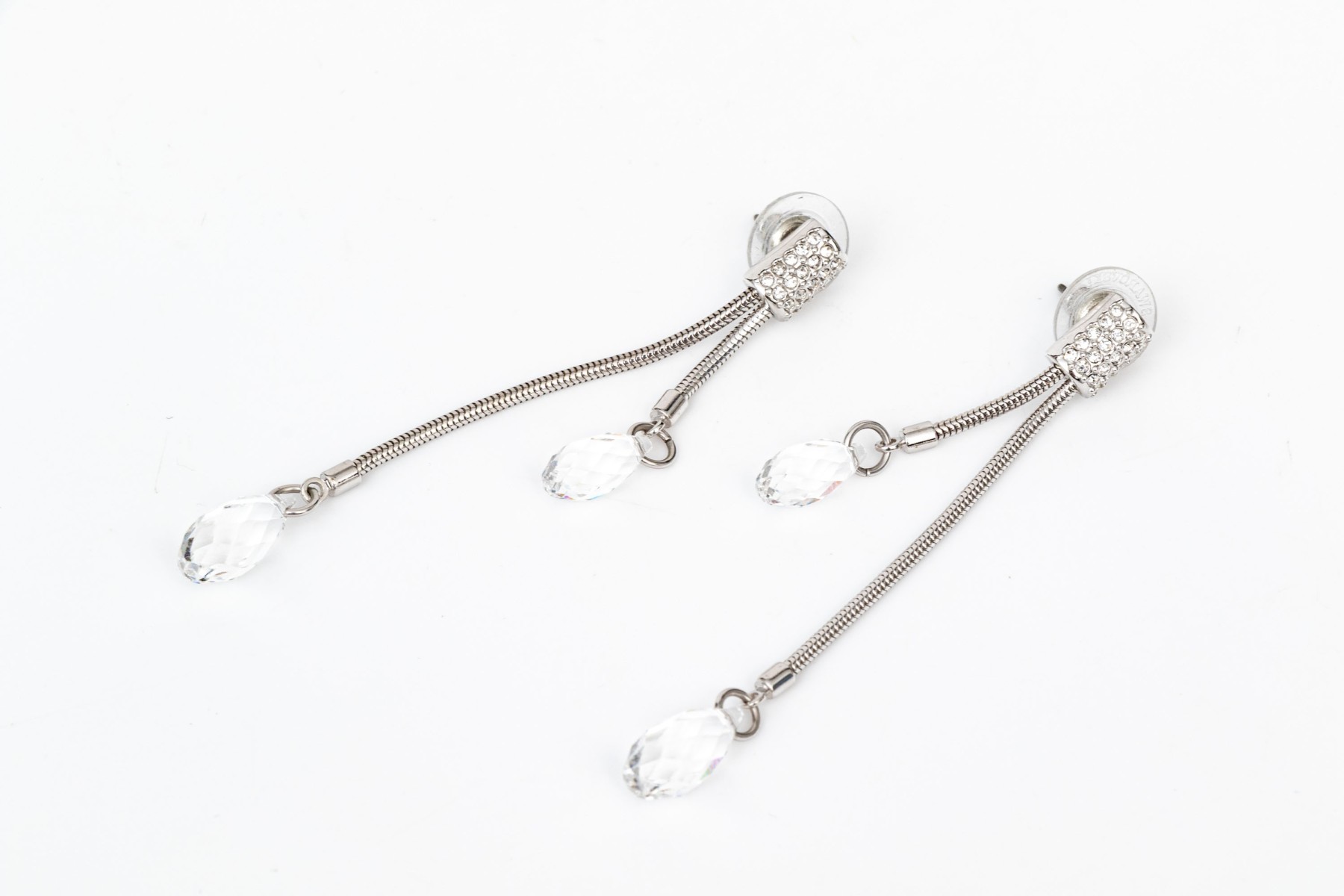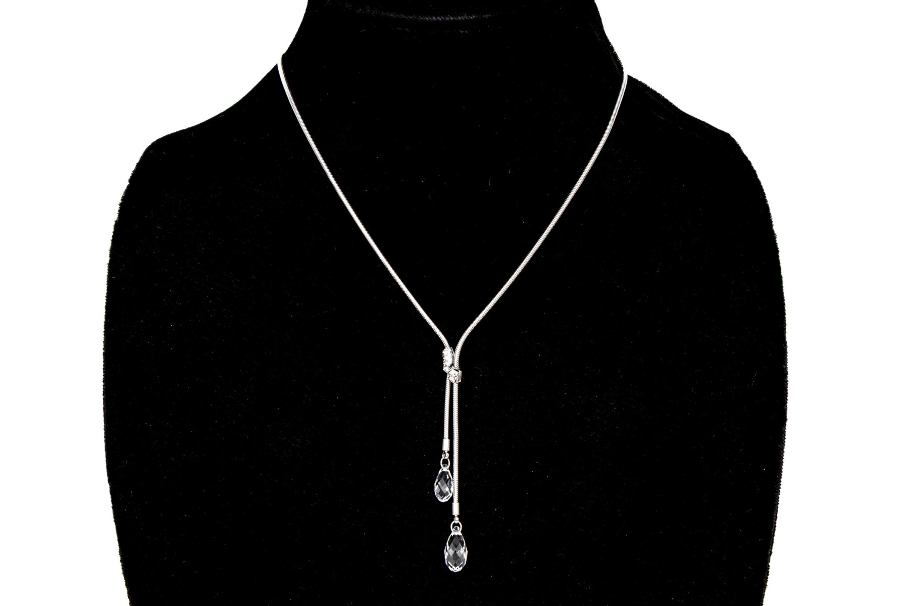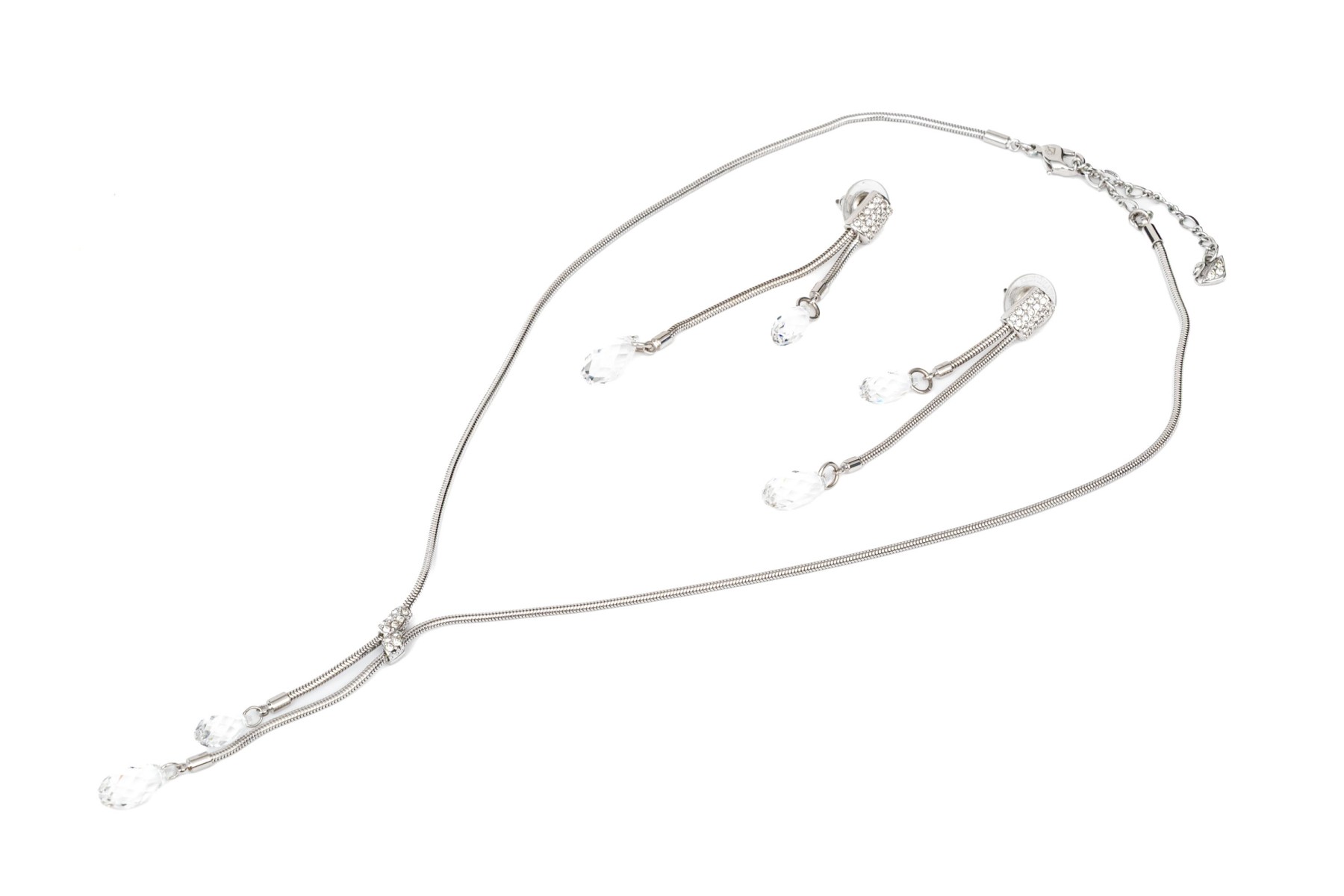 Swarovski Crystal snake chain and briolette crystal set necklace with matching earrings, featuring a twisted style center and drop pendant style earrings, white toned finish, finished with a lobster claw style clasp and the earrings are finished with posts and plastic disc style backs