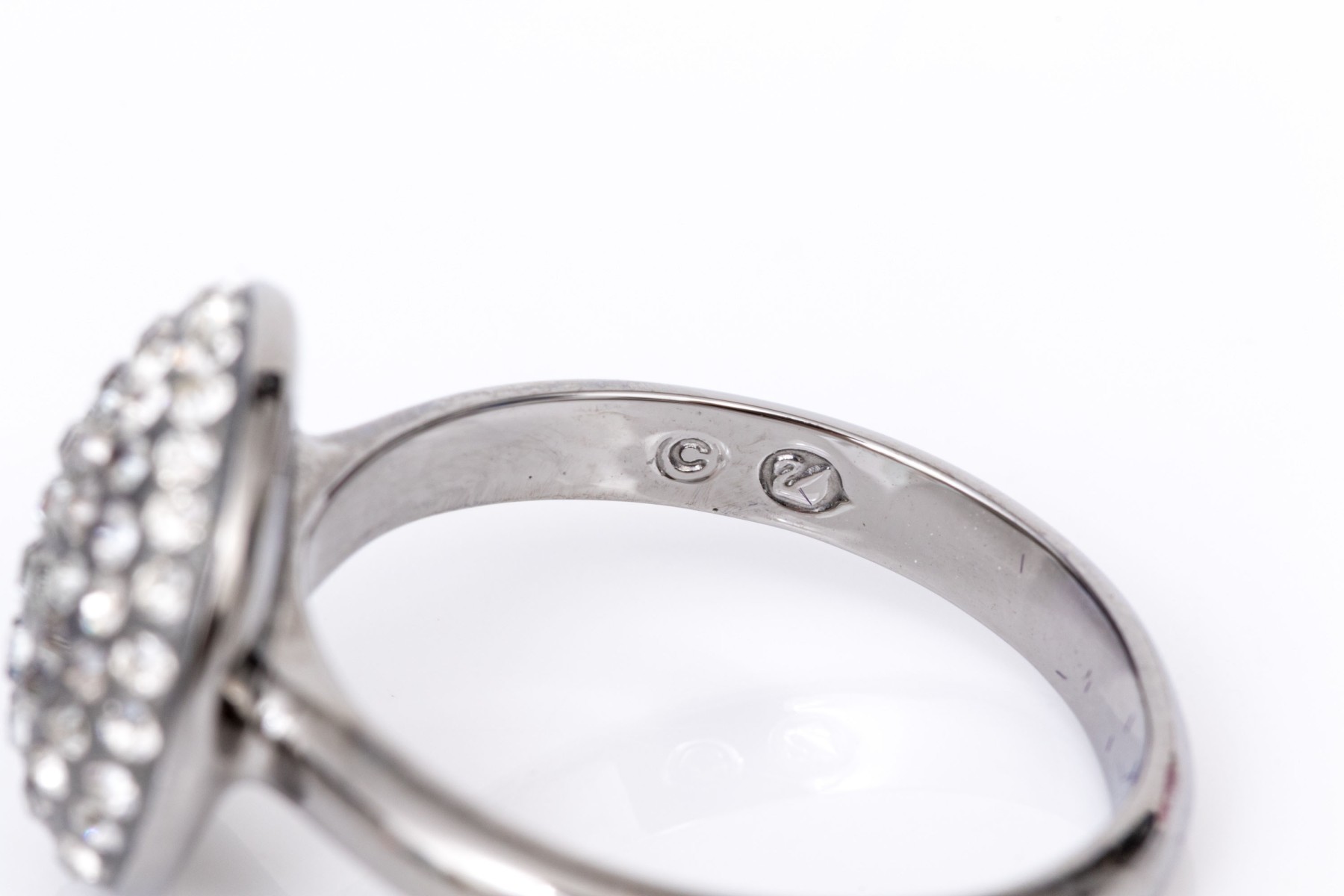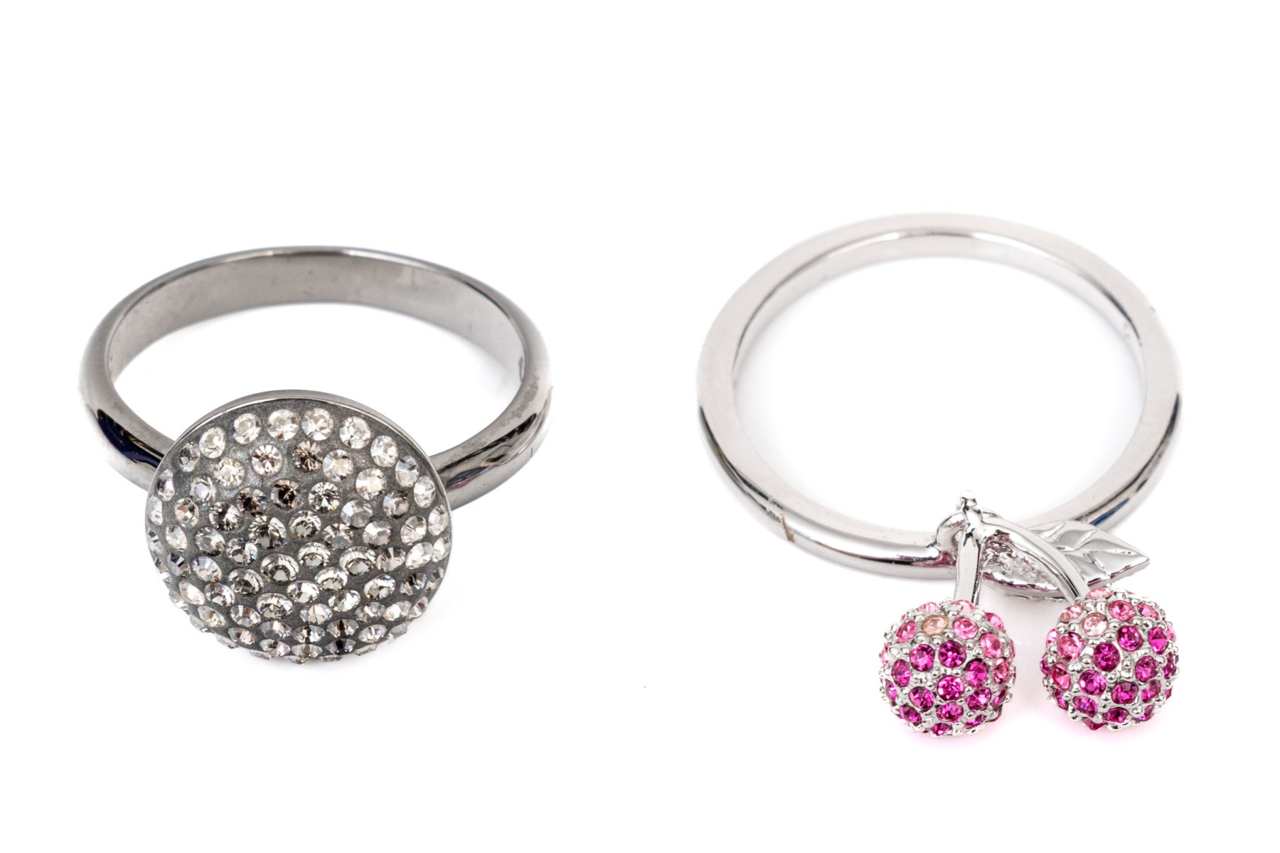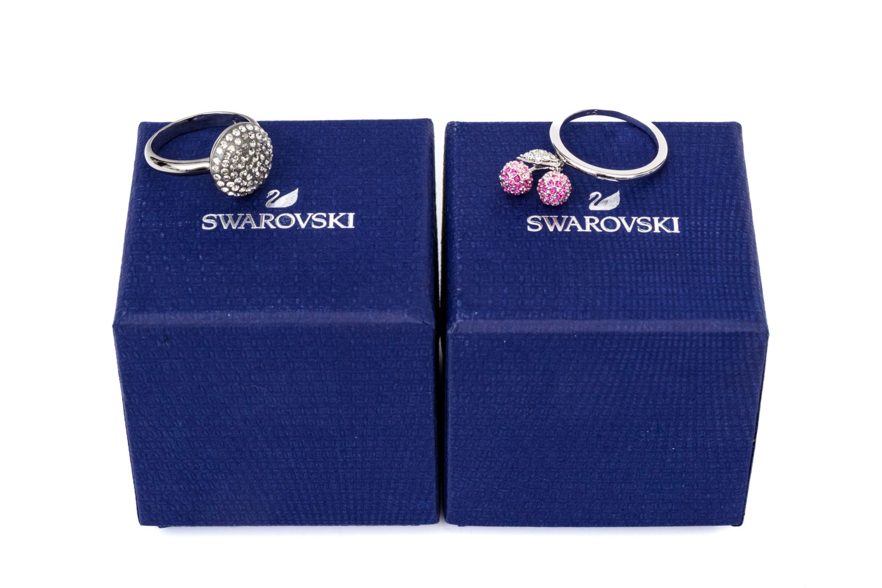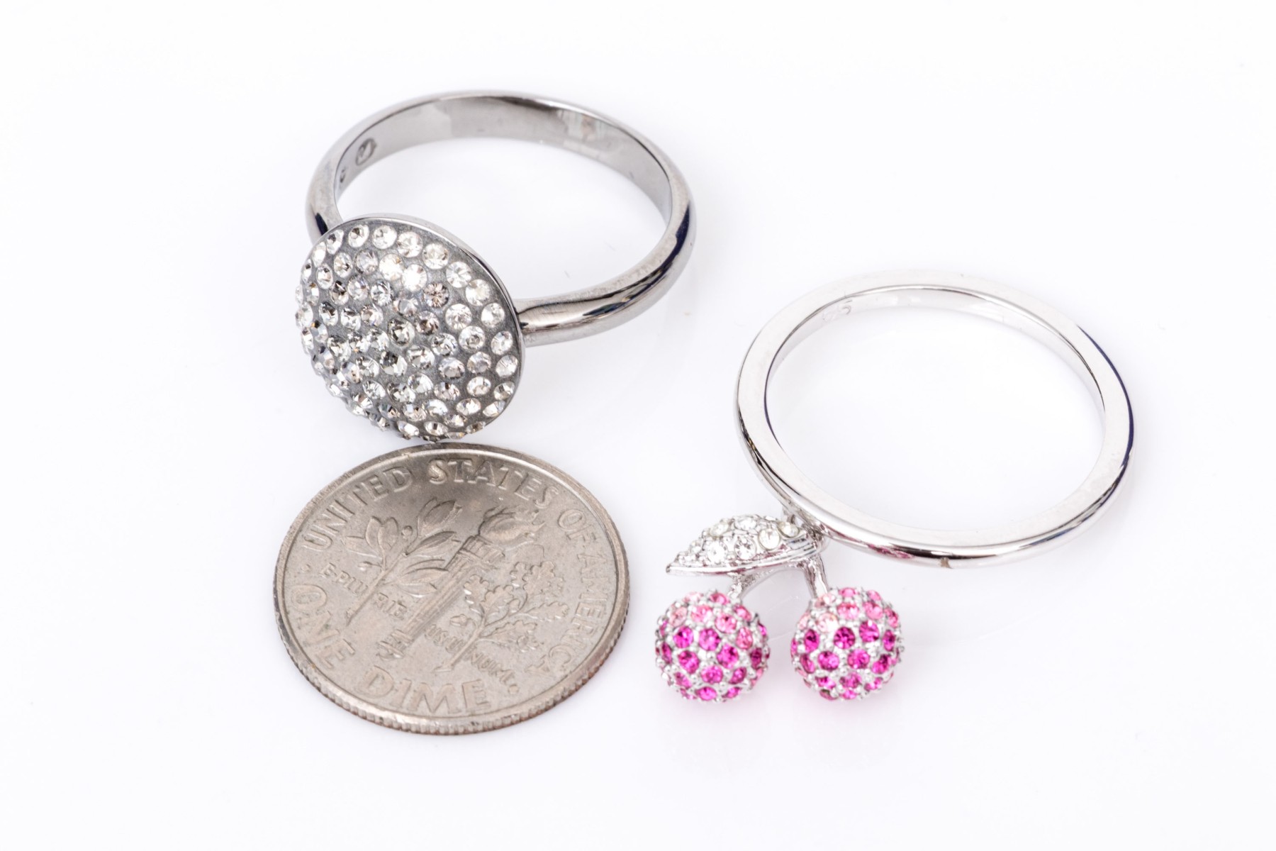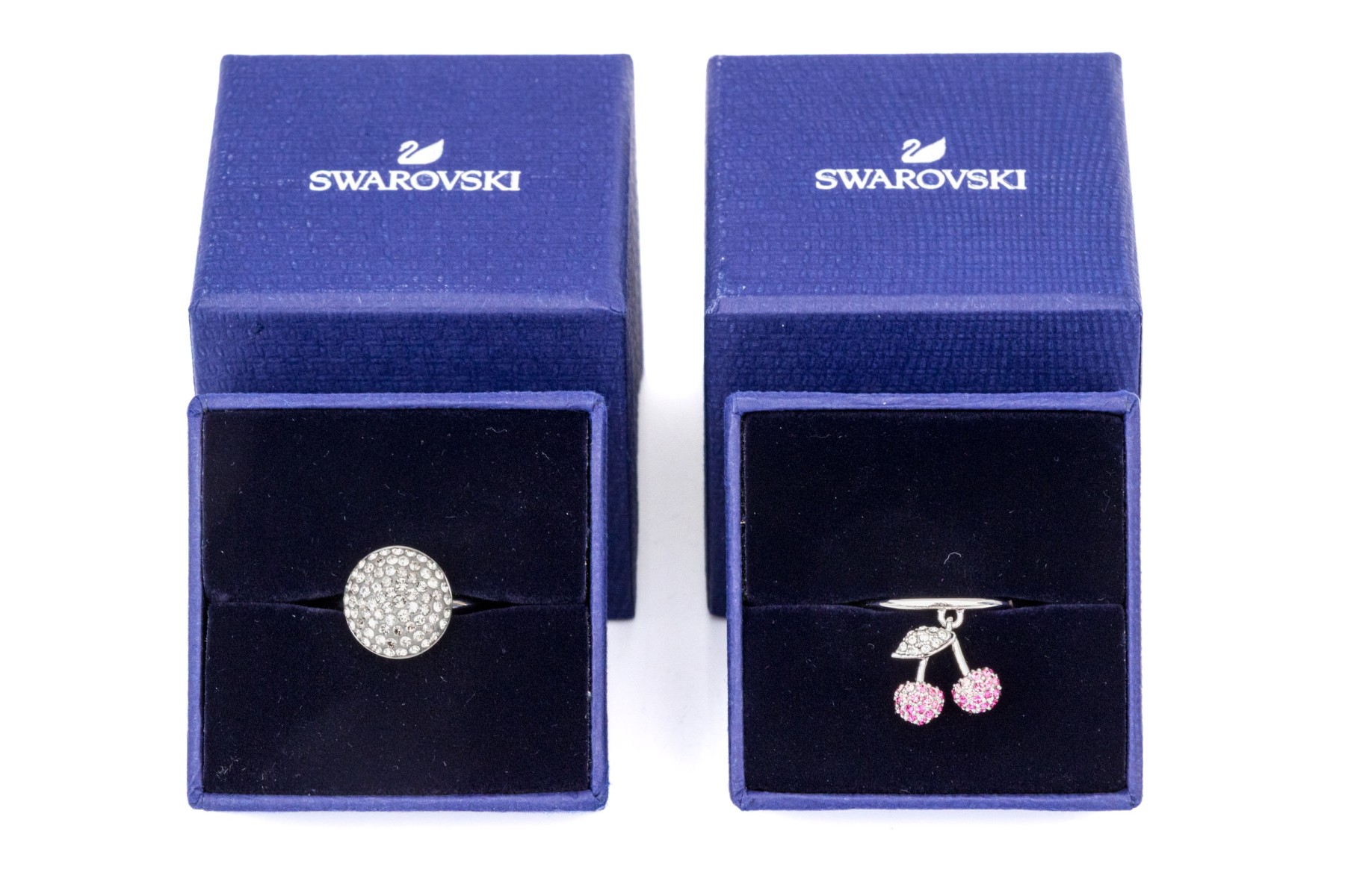 Swarovski collection of two crystal set rings, cherry motif and pave dome styles, sizes 6.75, with boxes
