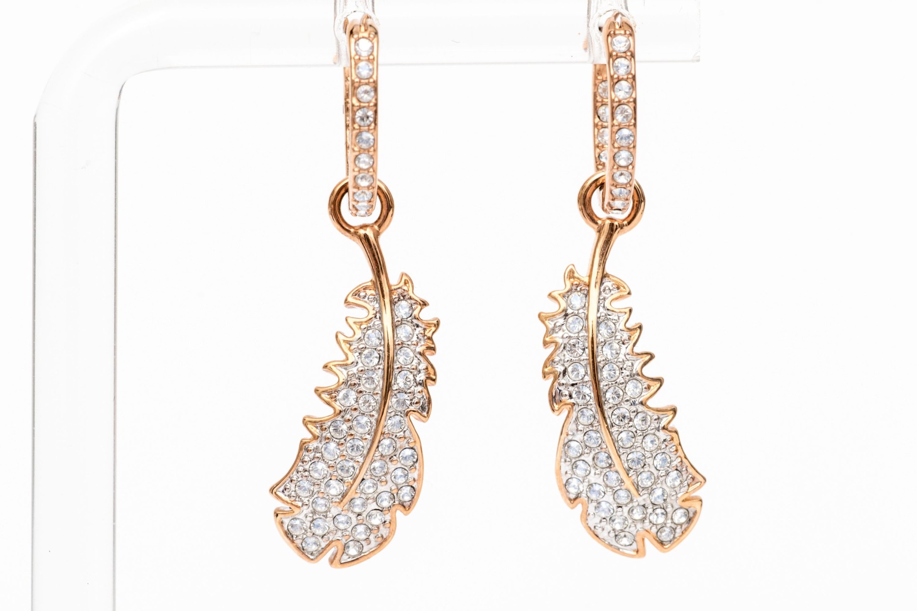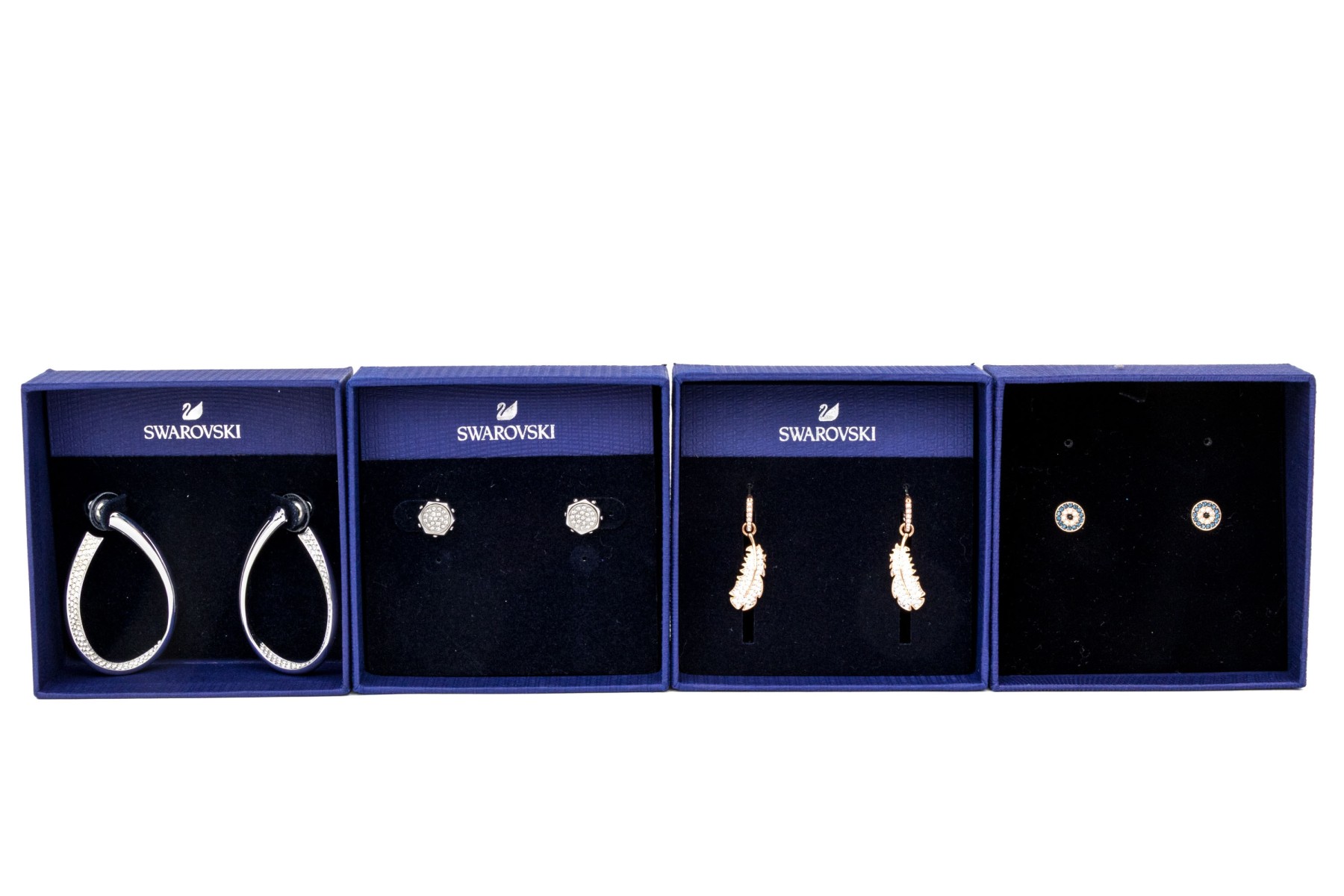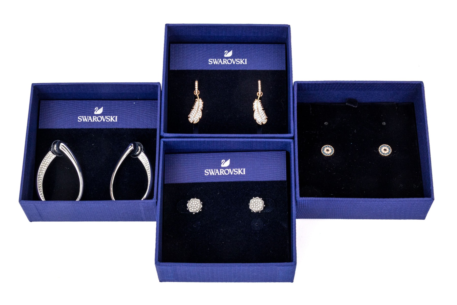 Swarovski collection of four pairs of crystal set earrings, including round pave, evil eye motif, open swirl drops and drop pendant with feather motifs. All of the earrings feature posts with plastic disc style backs with the exception of the feathers, which are posts with "u" hook style backs. All have boxes.