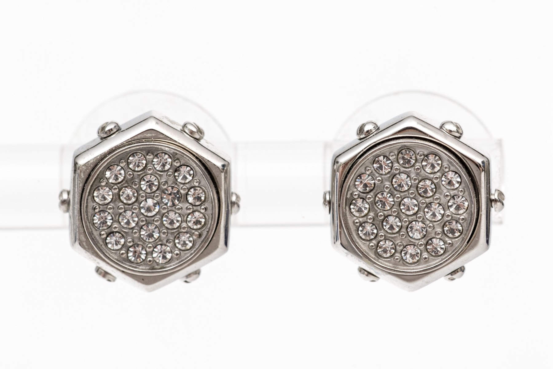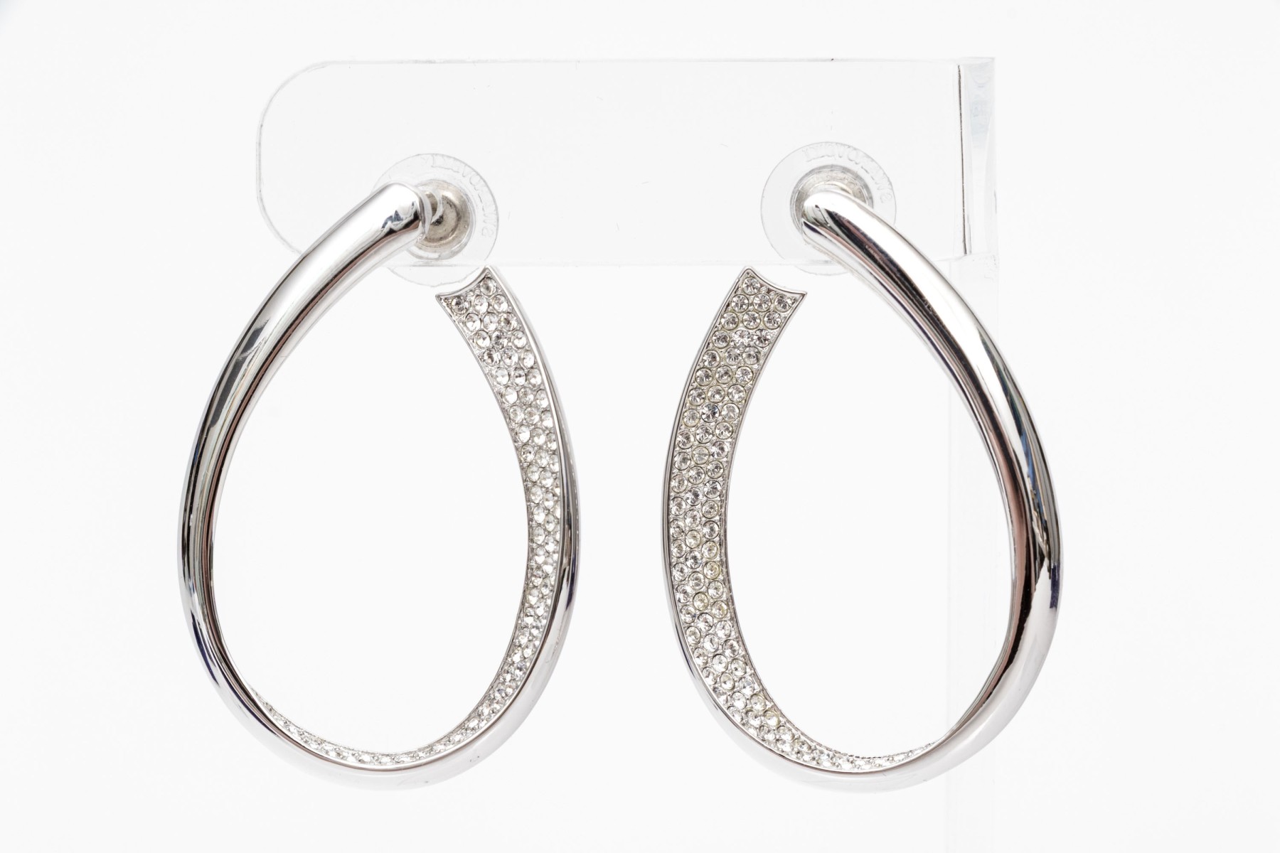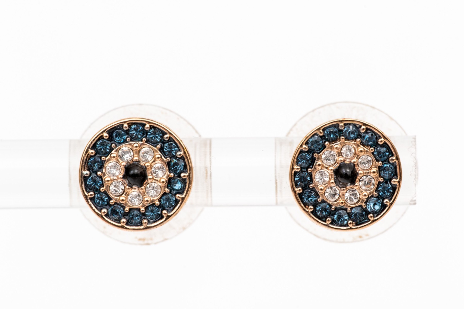 Swarovski collection of four pairs of crystal set earrings, including round pave, evil eye motif, open swirl drops and drop pendant with feather motifs. All of the earrings feature posts with plastic disc style backs with the exception of the feathers, which are posts with "u" hook style backs. All have boxes.