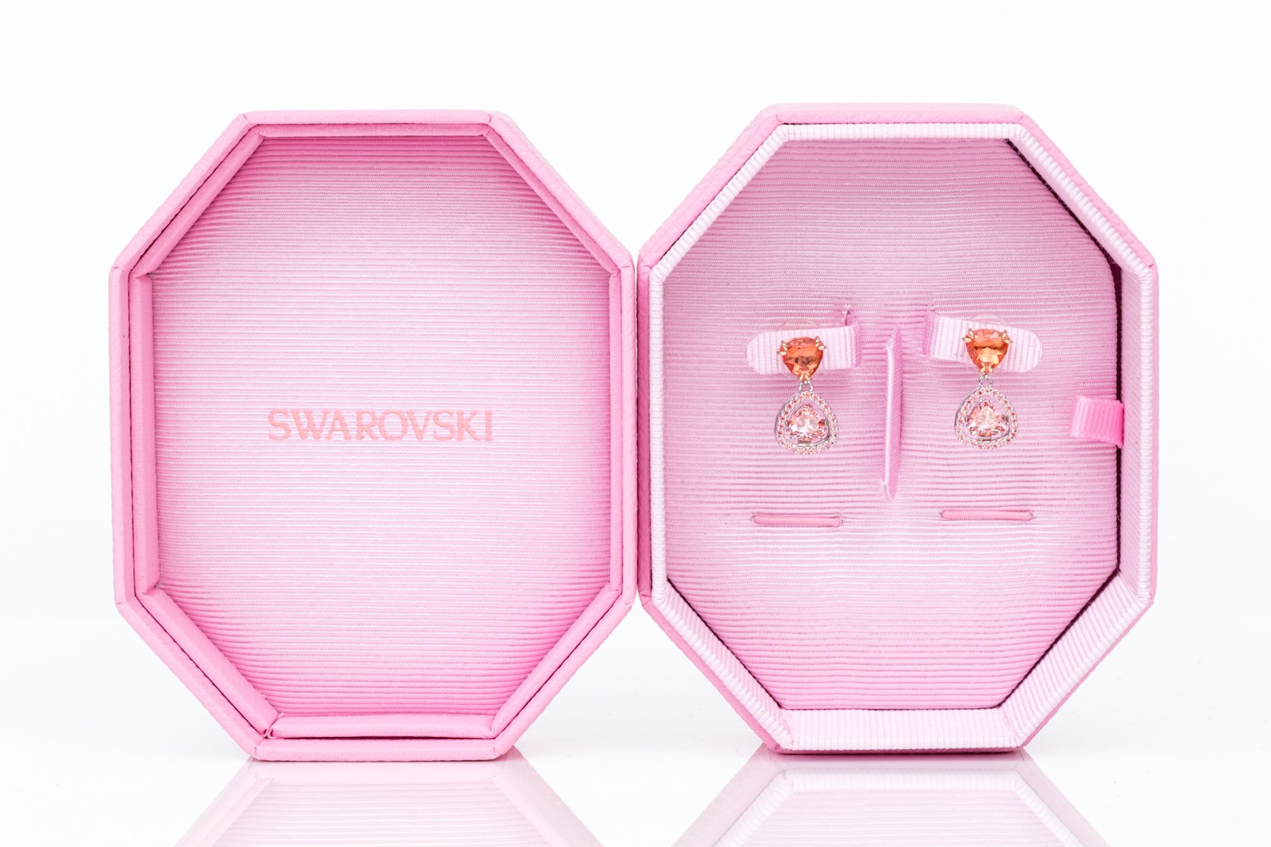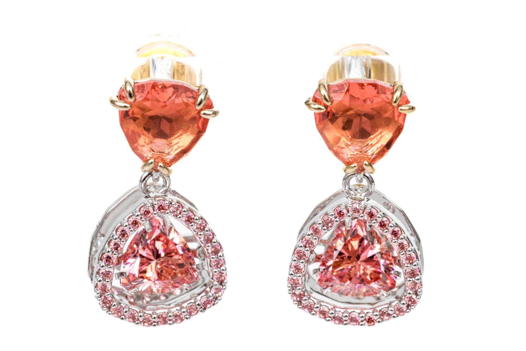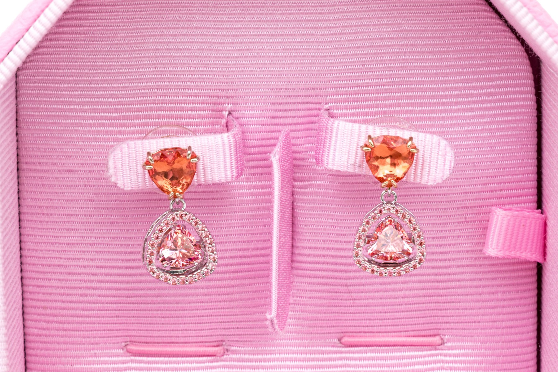 Swarovski orange and pink trillion crystal halo drop pendant earrings, finished with posts and plastic disc style backs, with box