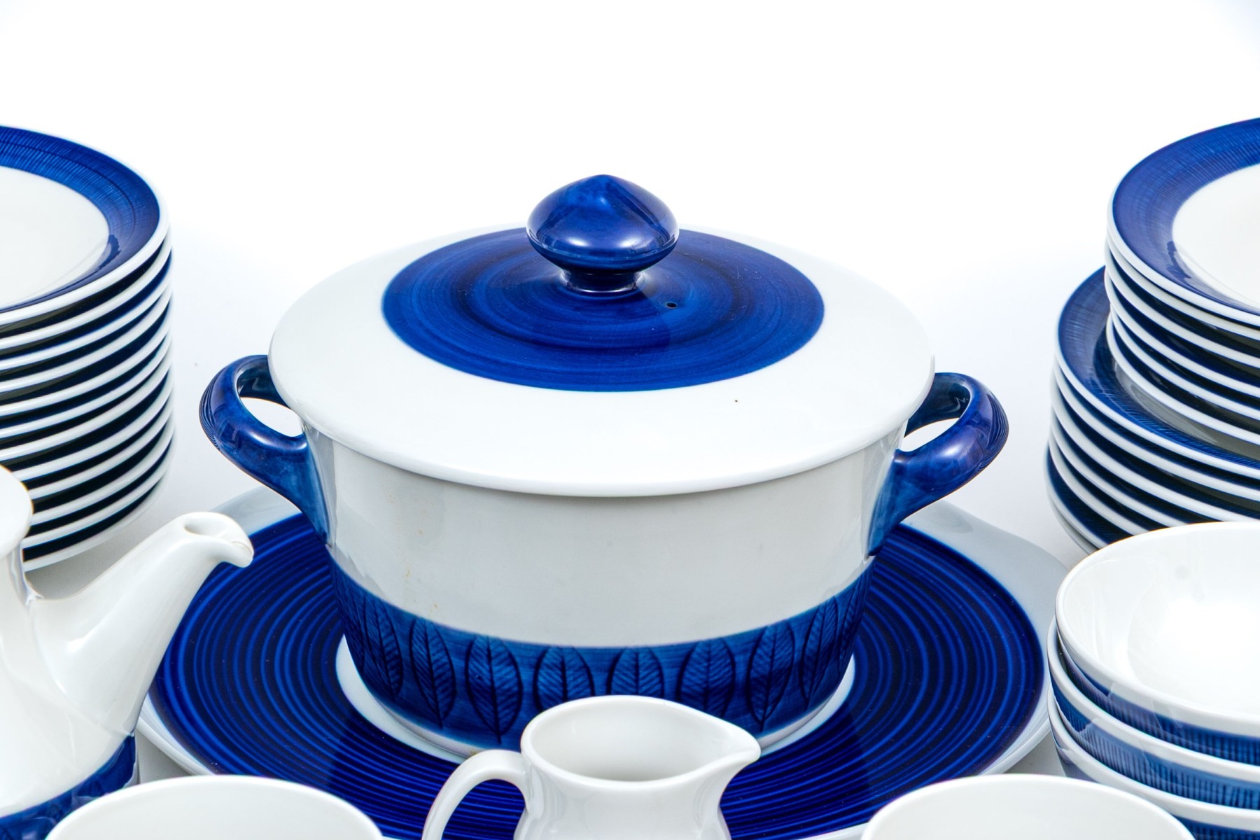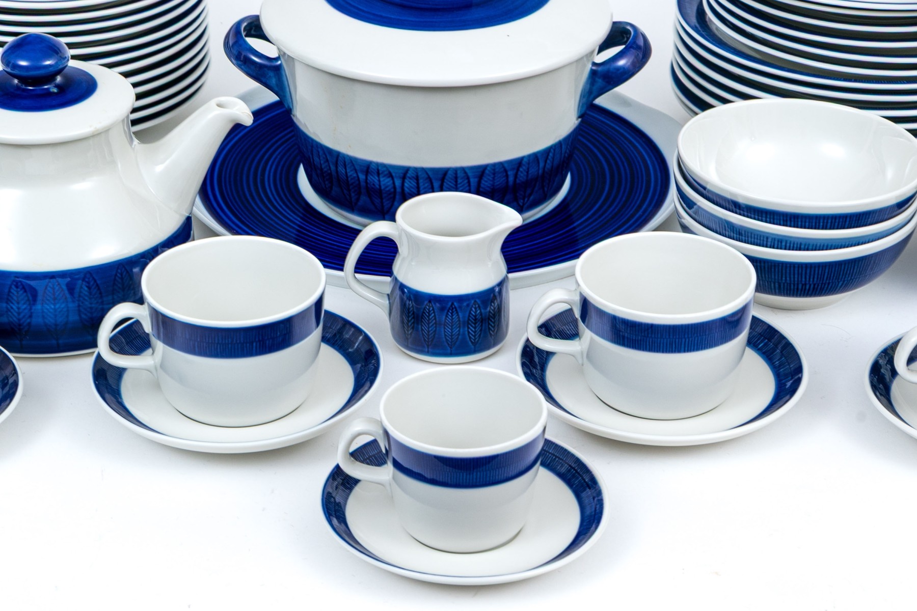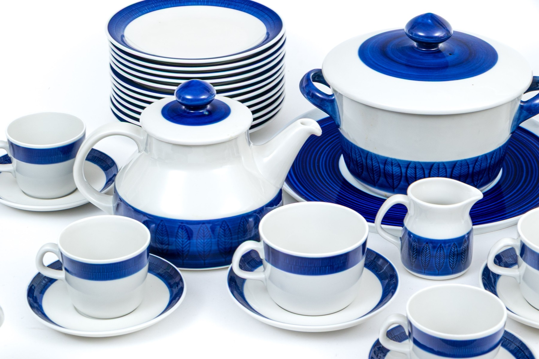 A lovely Hertha Bengtsson for Rörstrand "Koka Blå" ceramic dining service featuring bright white bodies and striking textural blue glazed decoration with oblong leaf motifs.